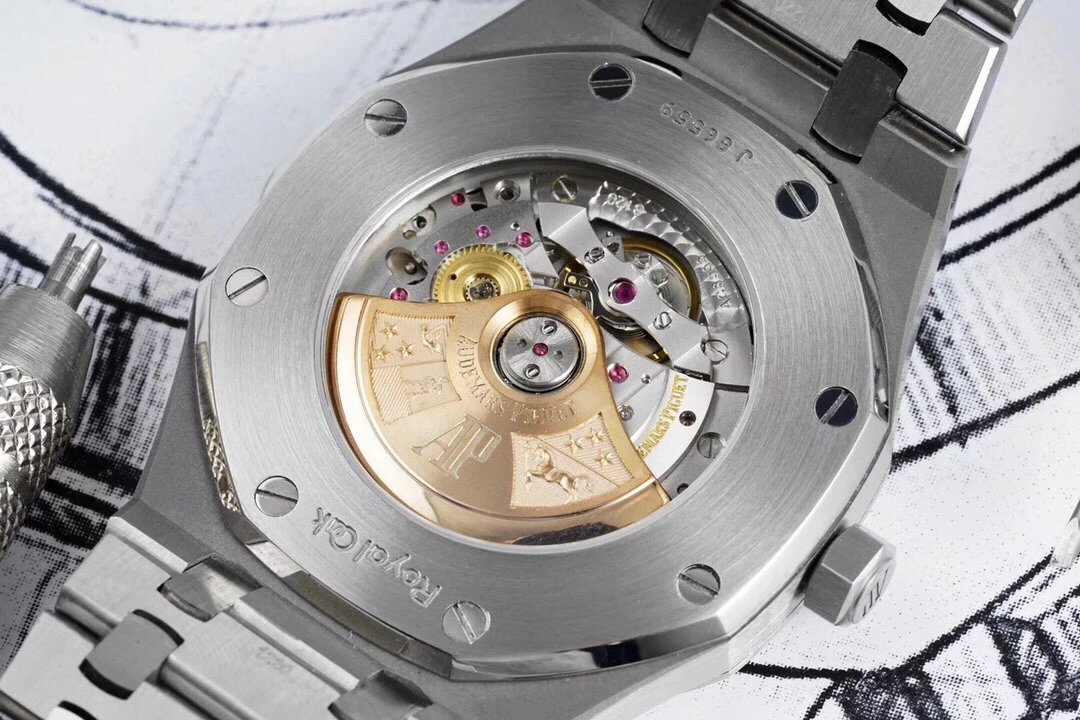 Z+F廠15400底蓋採用通透的藍寶石玻璃,打磨細膩,刻字清晰。機芯3120機芯的一體機芯做到了和正品一致的厚度
