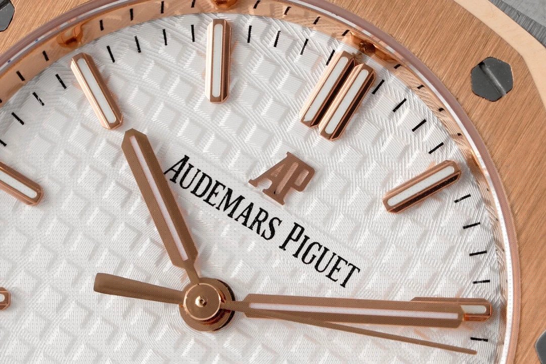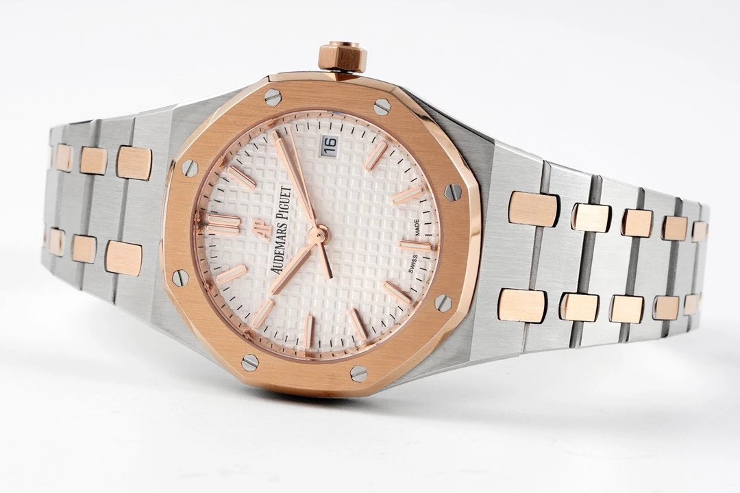 8F新品 直徑34毫米的皇家橡樹系列自動上鏈腕表,以全新表殼尺寸再現這一傳奇系列的前衛風格,並為纖細手腕的佩戴者演繹出別樣的優雅格調。全新腕表均搭載9015改Calibre 5800自動上鏈機芯,採用為該款式特別設計的玫瑰金金自動擺陀。