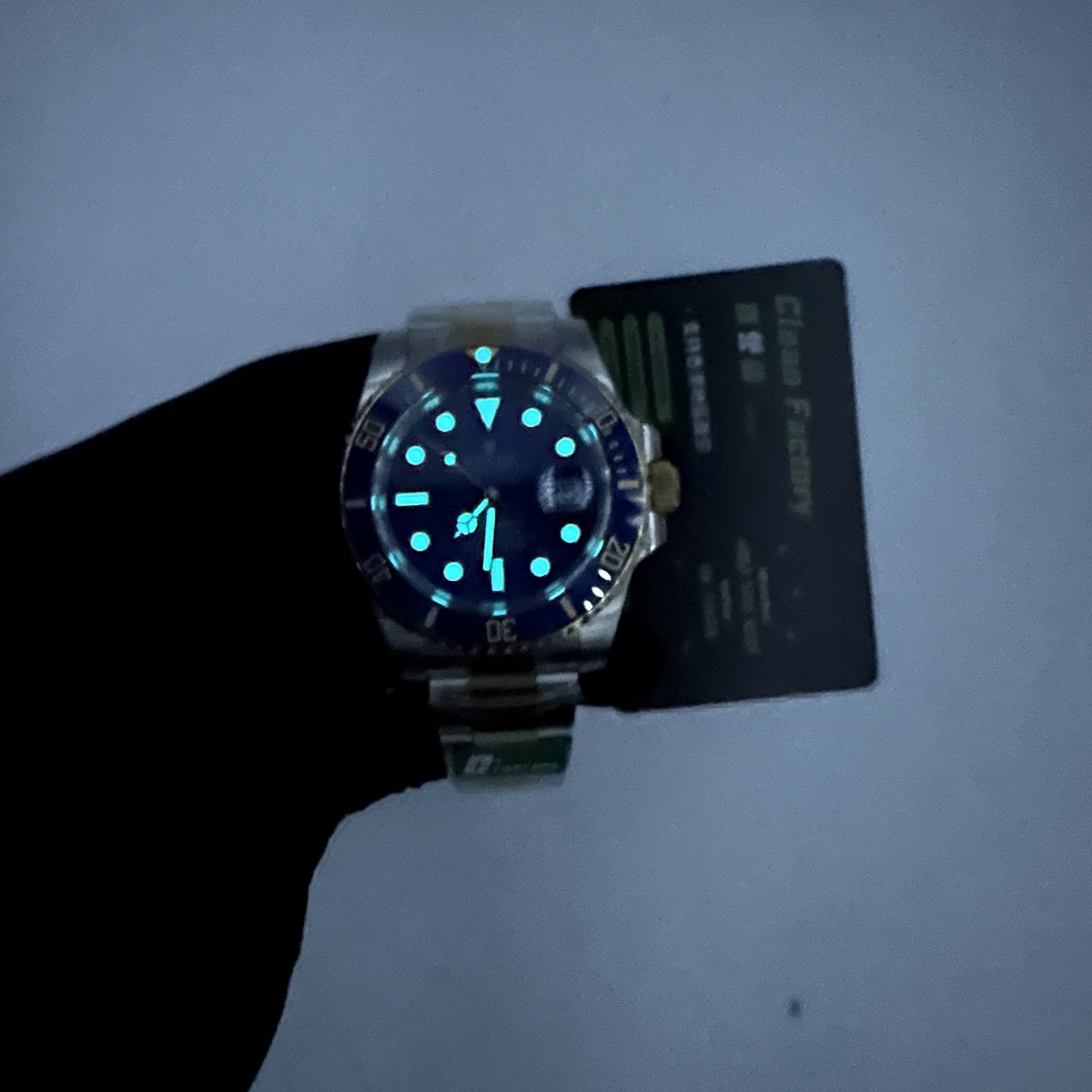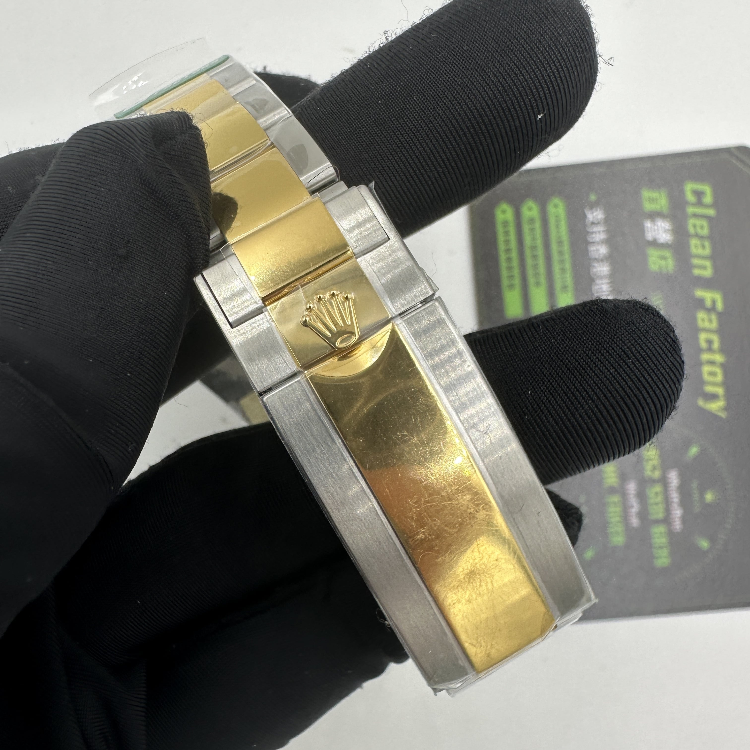 其次是針對此前PVD電鍍工藝存在的色差問題使用18K包金升級,對此無論是從色差還是重量基本可以做到杜絕一眼假.上手的手感厚實,錶殼邊角圓角打磨,精度拋光外觀部分的拉絲跡象非常明顯.獨家研發的陶瓷圈口,夜明珠的色澤同步正品玉色通透無白點.刻度的字面與填油部分飽滿.內部的藍色錶盤無色差,圓點刻度與指針和日曆均為代用級別的配件.搭載一體3235機芯.