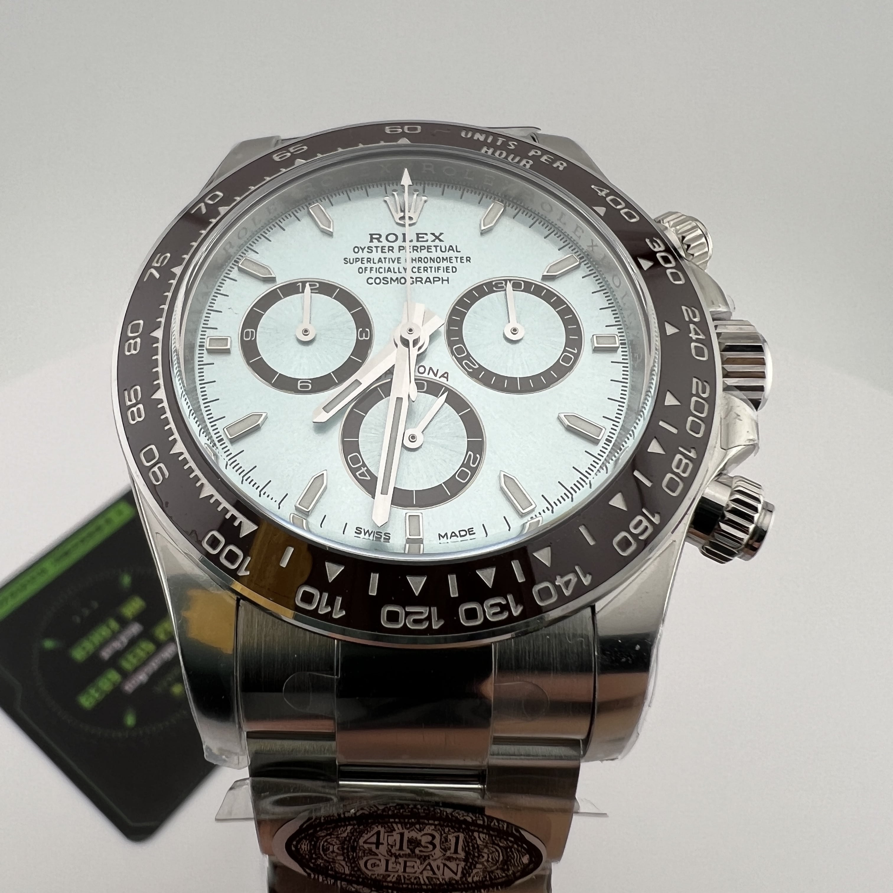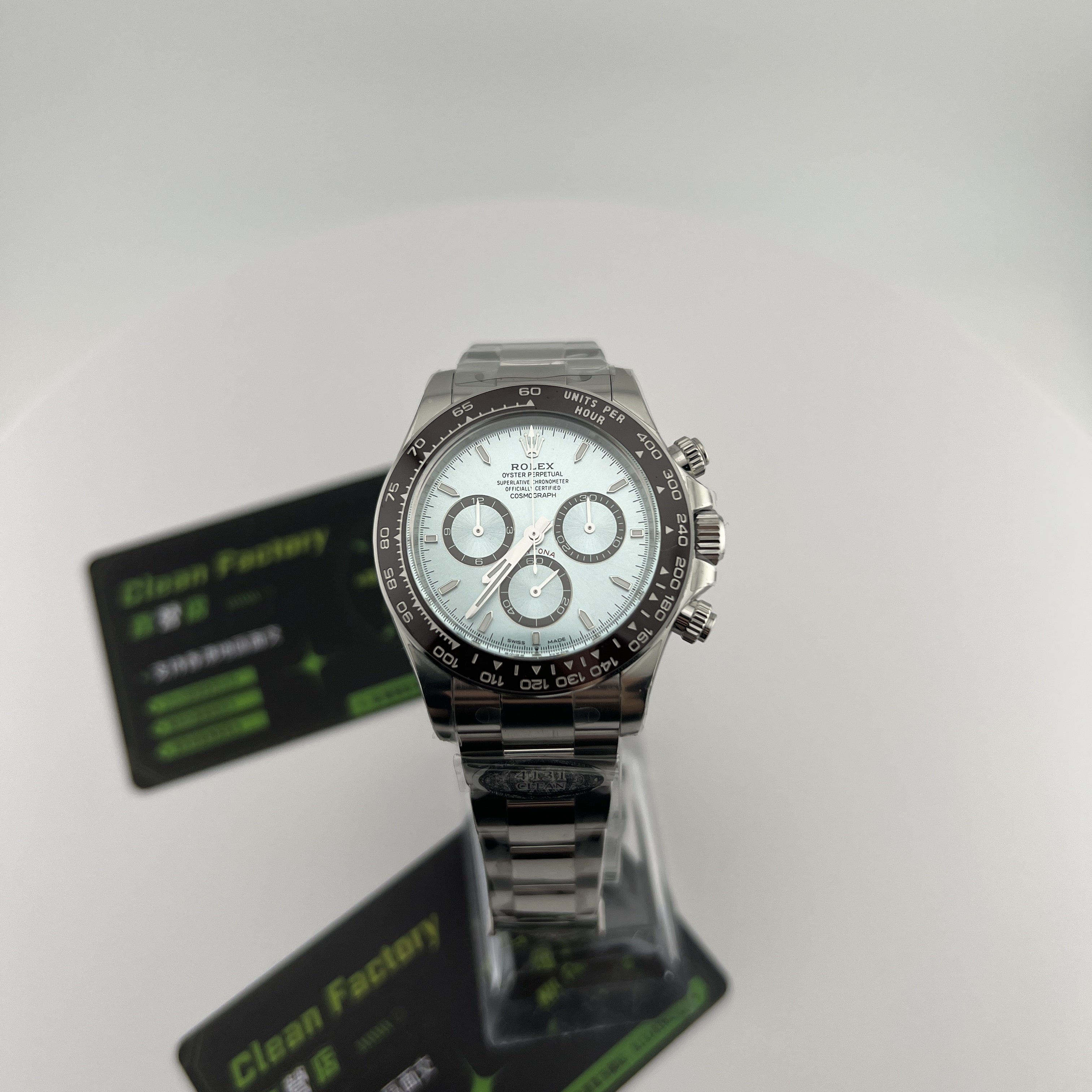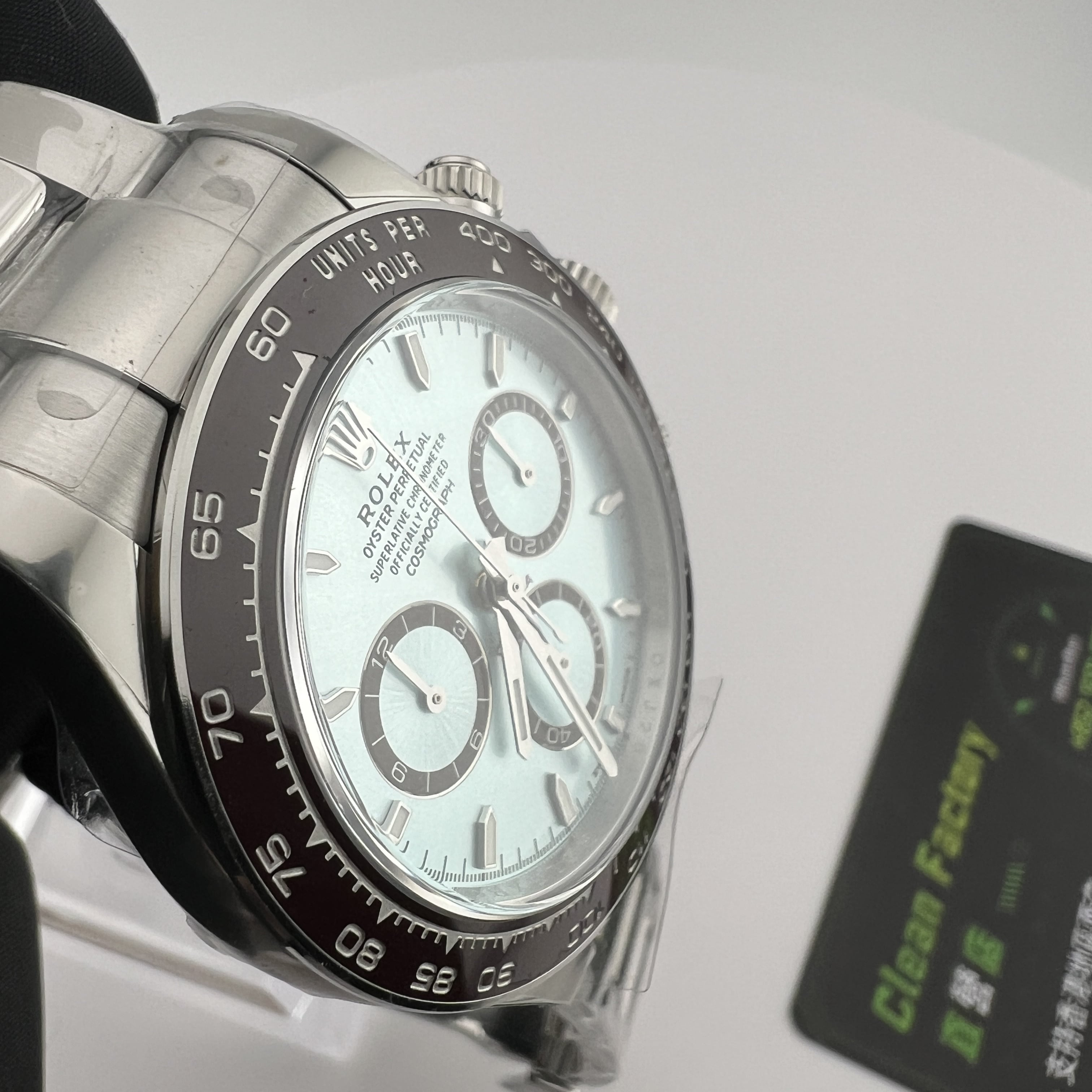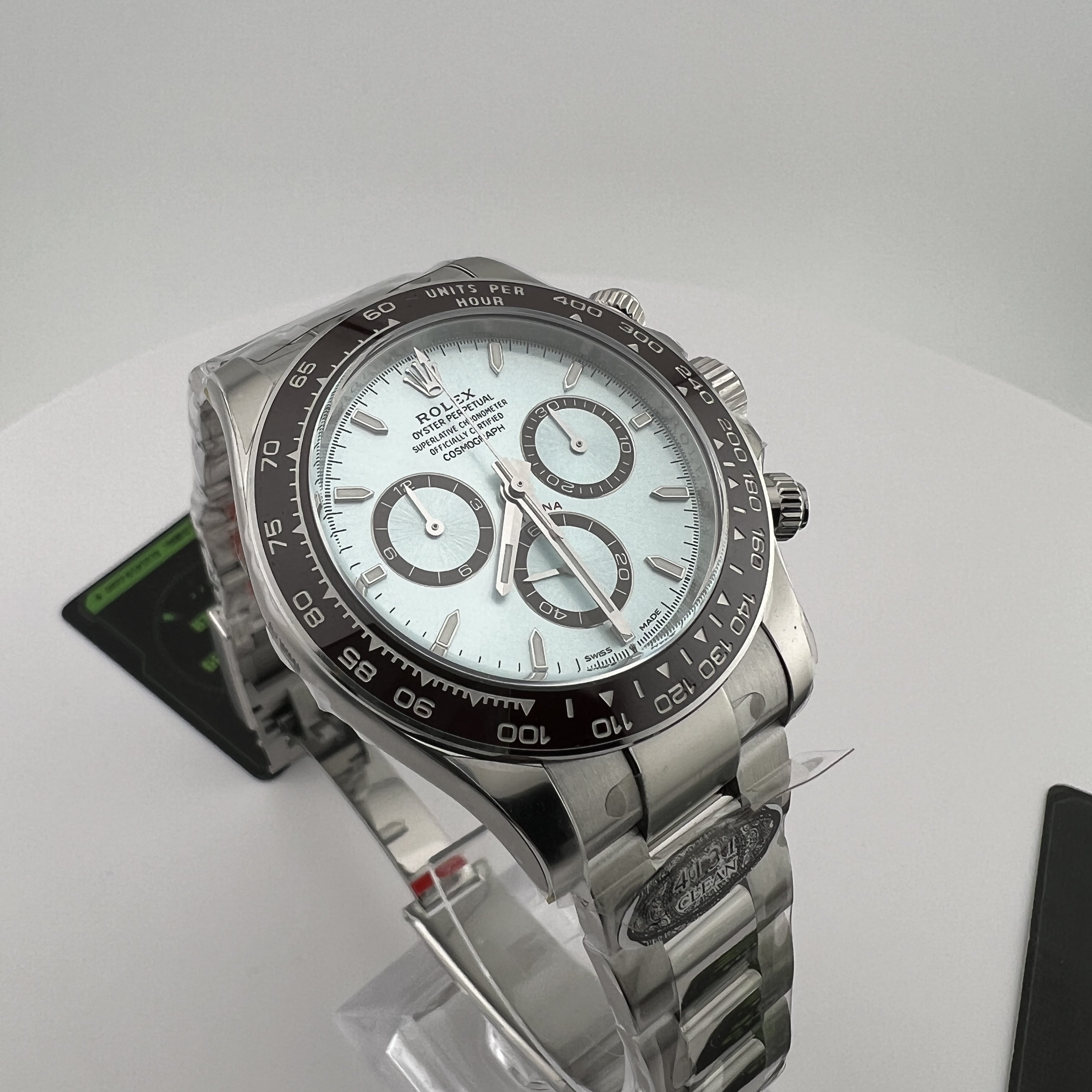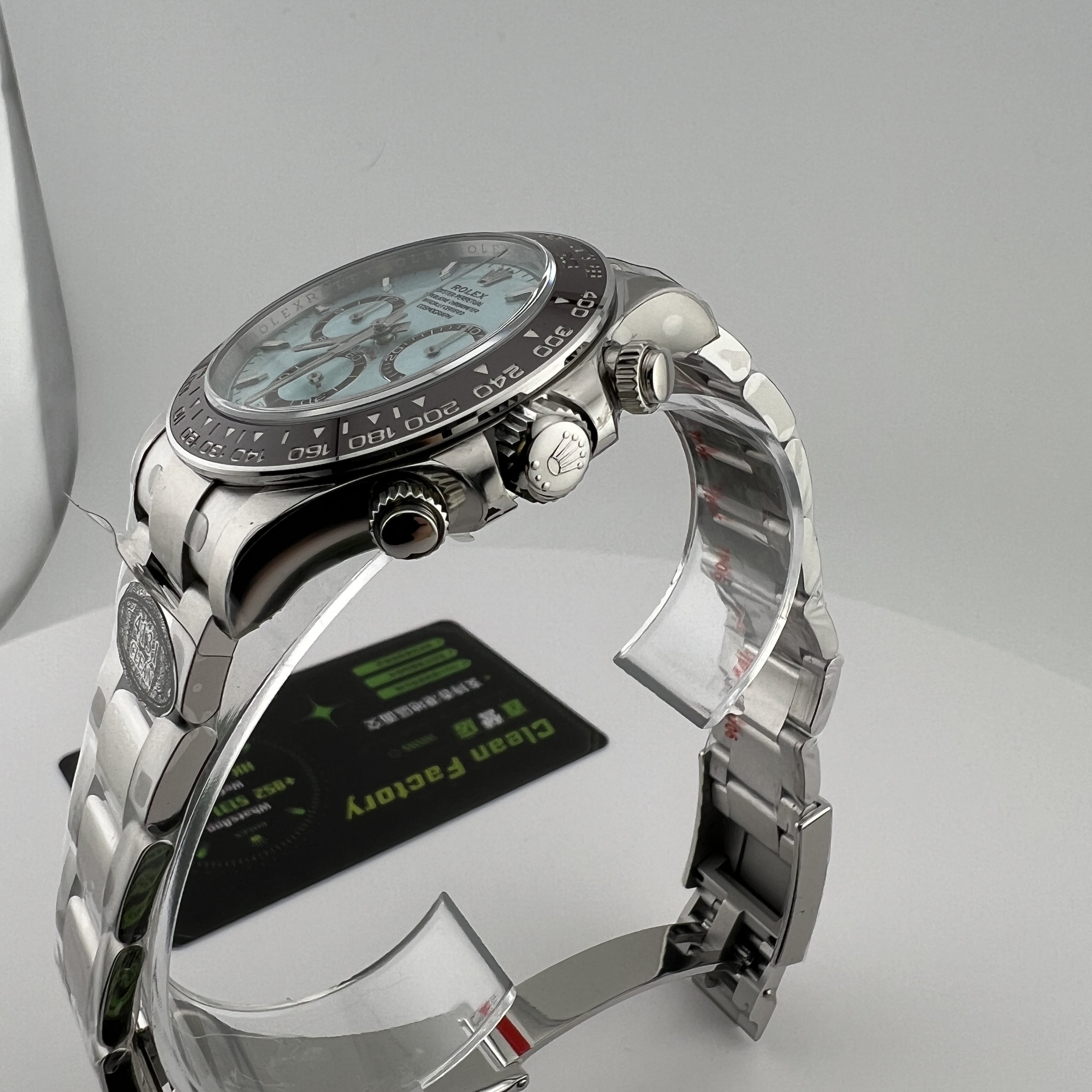Clean廠香港官網全新推出的勞力士地通拿系列m126506-0001背透機芯全新亮相,此次作為全網首發由CleanFactory香港官網直營店獨家實拍,目前Clean廠126506一共推出了0001型號為條丁版本,126506-0002則是鑽刻版本.兩款冰藍地通拿都是以正品勞力士官方在2023年推出的最新款4131機芯地通拿相機1:1復刻而成,也將m116506冰藍地的貴,精,稀的特性完美傳承下來,秉承了出身即是豪門氣質的地通拿.Clean廠冰藍地在對比原裝正品情況下最大的缺陷就是重量差問題,不過這個缺陷是屬於正常現象,不單只針對C廠4131冰藍地,同時是針對高仿市面上所有廠家.在未出品配重版本前提下,高仿Daytona126506以及其他K金錶款都是存在重量差.由於原裝正品是使用到18K鉑金材質打造,而C廠地通拿冰藍款式則是採用904L精鋼外加PVD電鍍工藝完成製作.