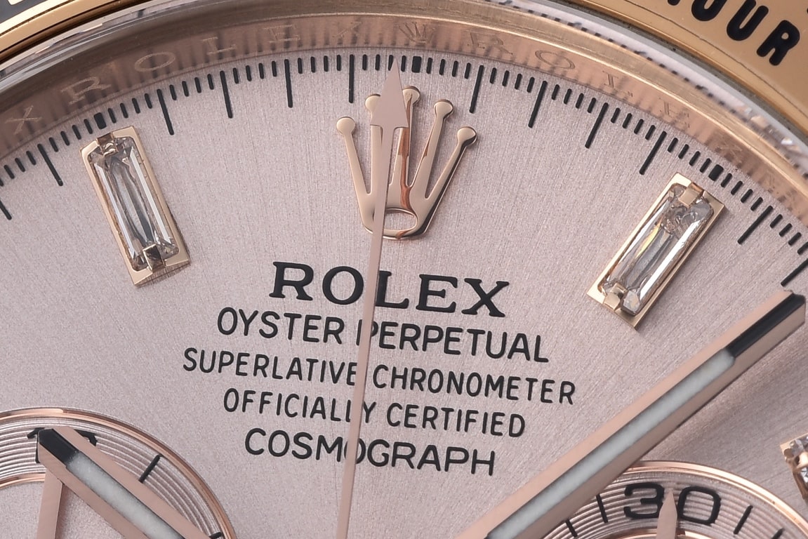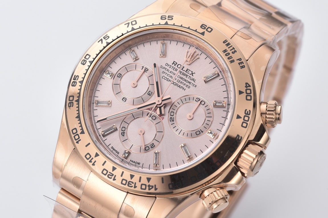 Clean廠勞力士全新推出了新款地通拿系列,同步勞力士官方型號:m116505-0017,玫瑰金鋼帶版本.錶徑40mm,厚度12.2.此款地通拿由於使用了玫瑰金材質和刻度莫桑鑽形成了一種冰清玉潔的狀態,大部分錶友都喜歡稱之為冰糖地通拿.加上由國外知名女星維多利亞經常佩戴後也有錶友叫貝嫂同款地通拿,目前這個Clean廠冰糖地在國外是相當熱門的款式.Clean廠在打造這一款冰糖地所用到的材質是904L精鋼,並且經過PVD電鍍工藝達到與原版一致的玫瑰金色值.從錶帶-錶殼-錶扣等等部分為散件未組裝成腕錶時就進行加工電鍍,是為了能夠完善全方面電鍍並且做到不漏剛的跡象.