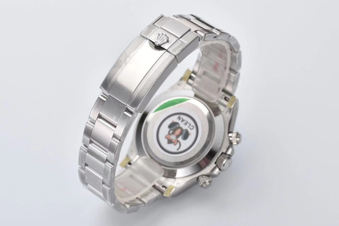 後續則是刻度條丁與指針部分的夜光填充,C廠勞力士是使用瑞士進口熒光劑填充,可以看到條丁和指針部分的夜光效果是呈現介質結晶狀,是和原版一致的.然後是三個計時小圈,金屬包邊,內圈帶有紅色的畫線,可比對其他廠出的版本,紅色的內圈完全是不明顯的,而Clean廠藍貓完全按照了原版去做.那我們如果去辨認紅圈的色值到底對不對版?那我們可以比對一下中軸下面的Daytona紅色印刷字體,在色差方面這兩種紅色是一致的.然後錶殼與錶帶銜接的是三段式分體頭粒,頭粒呈現的凸出是和原版一樣,側面也做了拋光處理.錶帶部分沒有任何問題,拉絲和拋光的工藝都做到位了.然後是錶扣部分,皇冠LOGO做了倒角打磨,開合錶扣的手感,不緊不鬆.內部刻度字體清晰,工整都是同時在線的.而最後的Clean廠地通拿搭載的是丹東4130機芯,機芯的結構與原版一致,穩定走時無誤差,續航動力高達72小時.