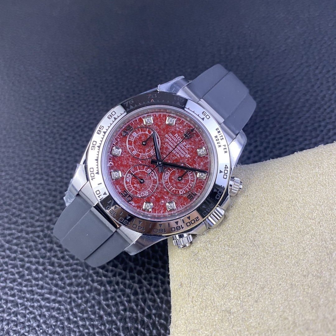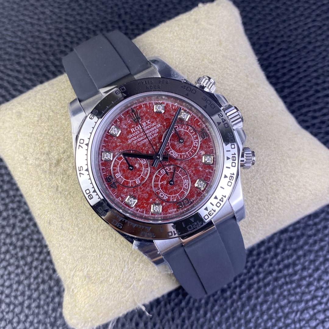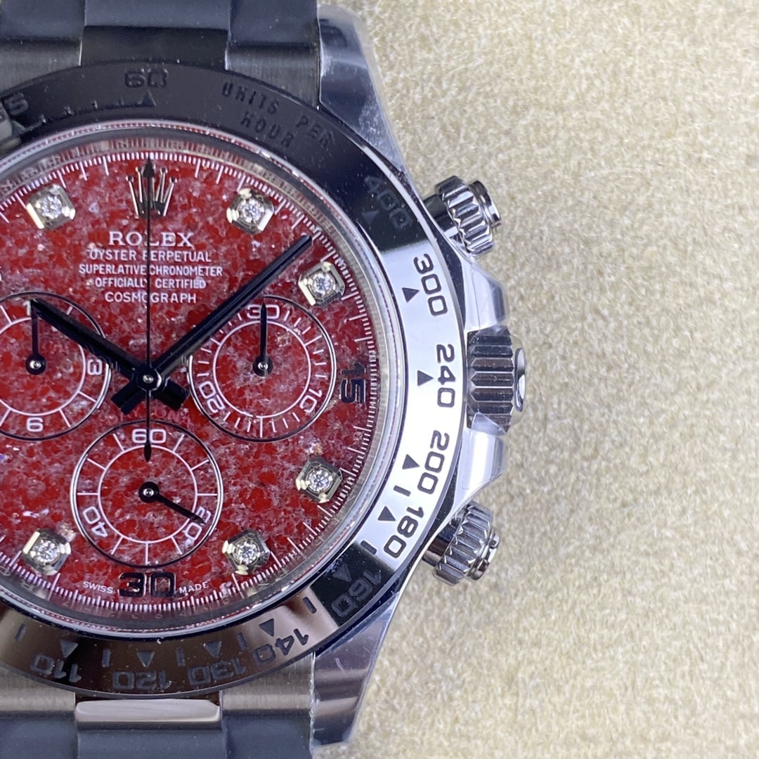 Clean廠勞力士白金地通拿使用了與原裝正品一致的方鈉石材質打造盤面,整個紅色錶盤並且帶有磨砂質感是最附有外觀顏值的代表.同樣方鈉石材質是一種無毒無害又名為藍紋石,被廣泛作為裝飾用的寶石材質.通常有藍色和紅色,而被用於在腕錶上也屬於是正常的操作,類似Clean廠遊艇鷹眼石材質差不多.整個錶盤所呈現的色值和質感突出了一種高端,晶面而又是磨砂質感變化無窮的感覺才是令人心曠神怡.而時間刻度條丁為鑽石鑲嵌,Clean廠方鈉石是使用的莫桑鑽,並非是鋯石材質,通常頂級復刻錶都是使用到莫桑鑽材質,從總體的切割面和亮度完全是接近原版的狀態.