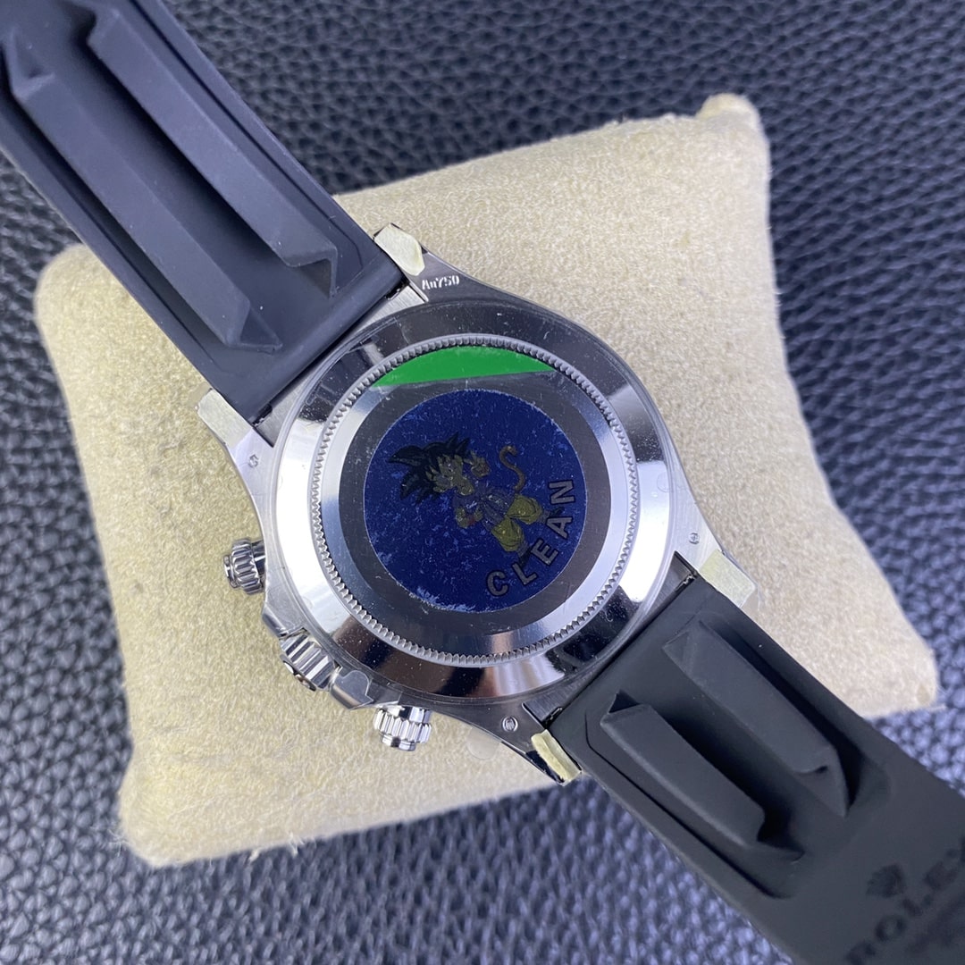 指針部分呈現黑色狀態,與普通版本不一樣,使用的是三色一體指針並且帶有夜光填充.這一隻C廠方鈉石整隻錶是沒有任何夜光顯示鮮果,整體看上去雖然是高端為主,但由於沒有夜光效果,在晚上查看時間還是比較麻煩的,具體就看個人如何使用了,畢竟原裝正品屬於是隱藏款,需要超級VIP級別才能夠私人訂製,Clean廠地通拿也是根據原版去復刻.錶帶是進口橡膠材質打造,Clean廠更新了和正品一致的內置記憶鋼片膠帶,整錶的弧度和舒適度都是完美極致.機芯方面C廠搭載的是丹東4130機芯,續航動力72小時,計時功能完全可以使用.