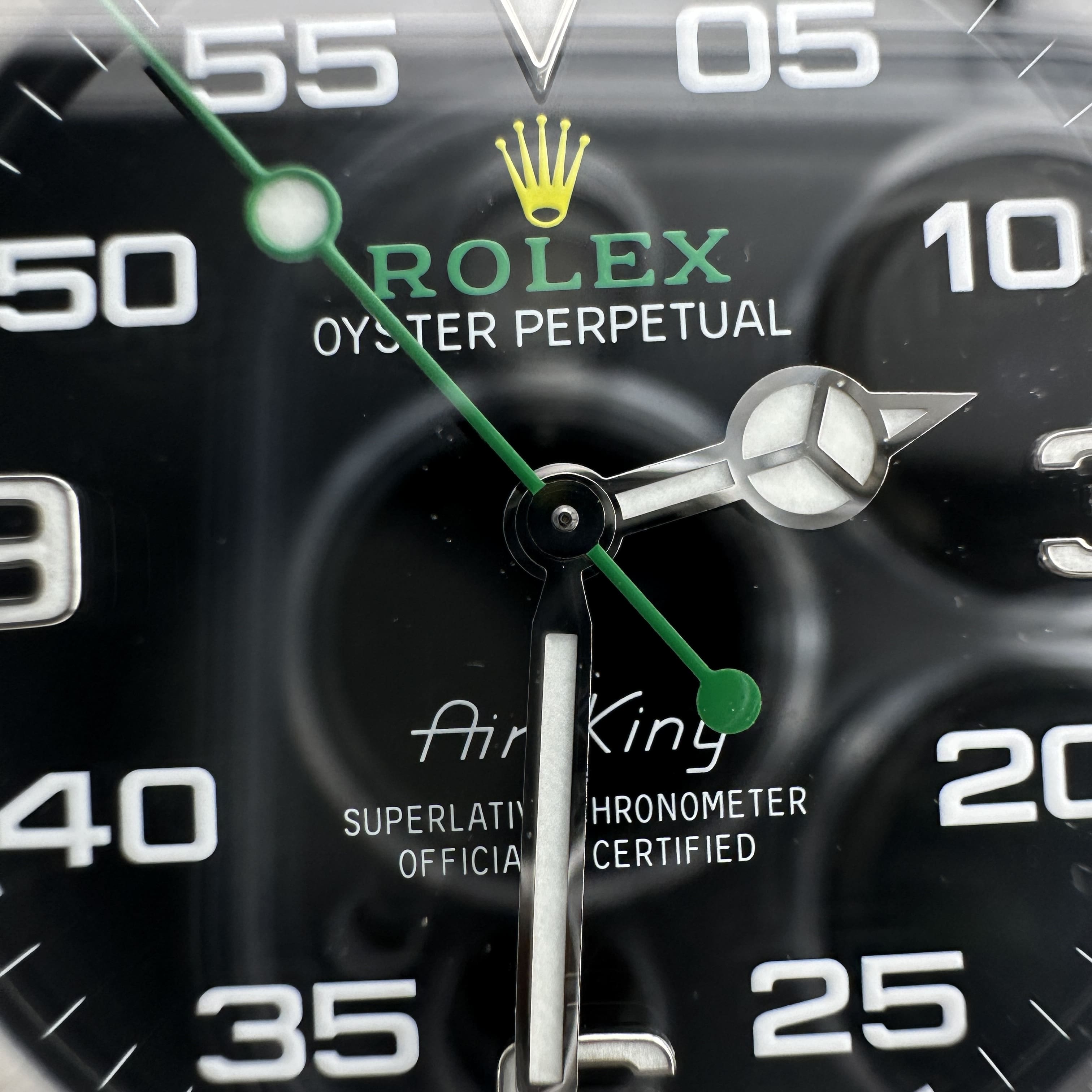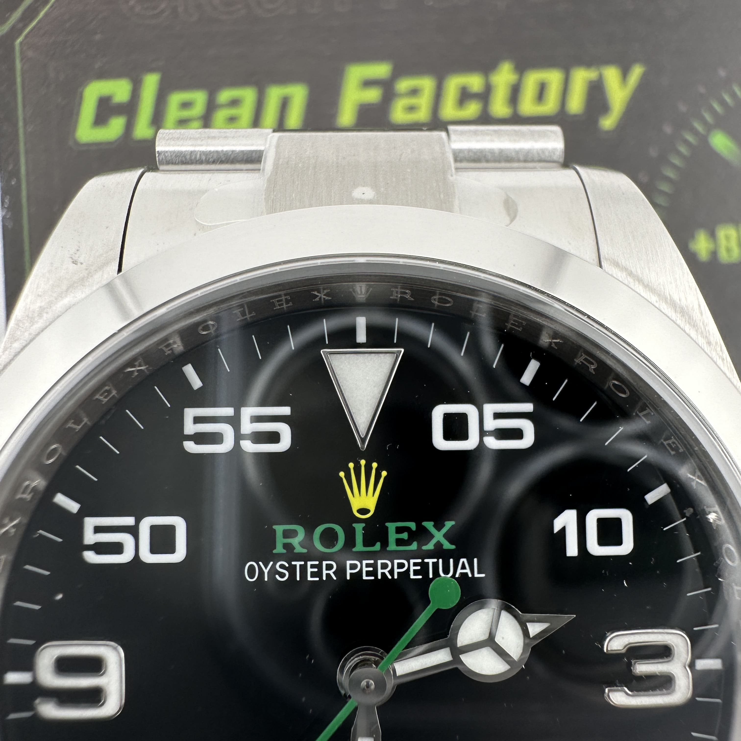 黑色盤面以阿拉伯數字面做了時間顯示刻度,同時由倒三角與369大字體刻度作為夜光填充,雙字面並非是印刷字面,是帶有一種質感並且呈現立體狀態.由一點鐘位置也可以辨別新款與來款之分,舊版本是5刻度,新版本是05刻度.空霸另外的叫法369就是由此得來.Clean廠空霸完全是按照原版復刻.指針部分與中軸使用實心材質.夜光部分統一使用瑞士進口第三方加工填充.印刷的字面分為三種色值,其中帶有神態的Air-King字面細節處理非常完善,沒有毛邊毛刺.機芯部分C廠空霸是搭載了最新款3230機芯,目前按照勞力士官方發佈粉新款都統一搭載了32系機芯,可以看到6點鐘下面刻度有皇冠小LOGO,那就證明了這一款腕錶搭載的是3230-3235或者是3285機芯.