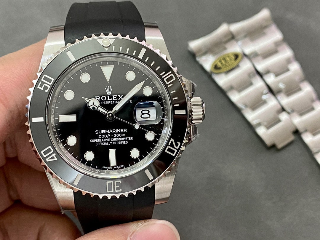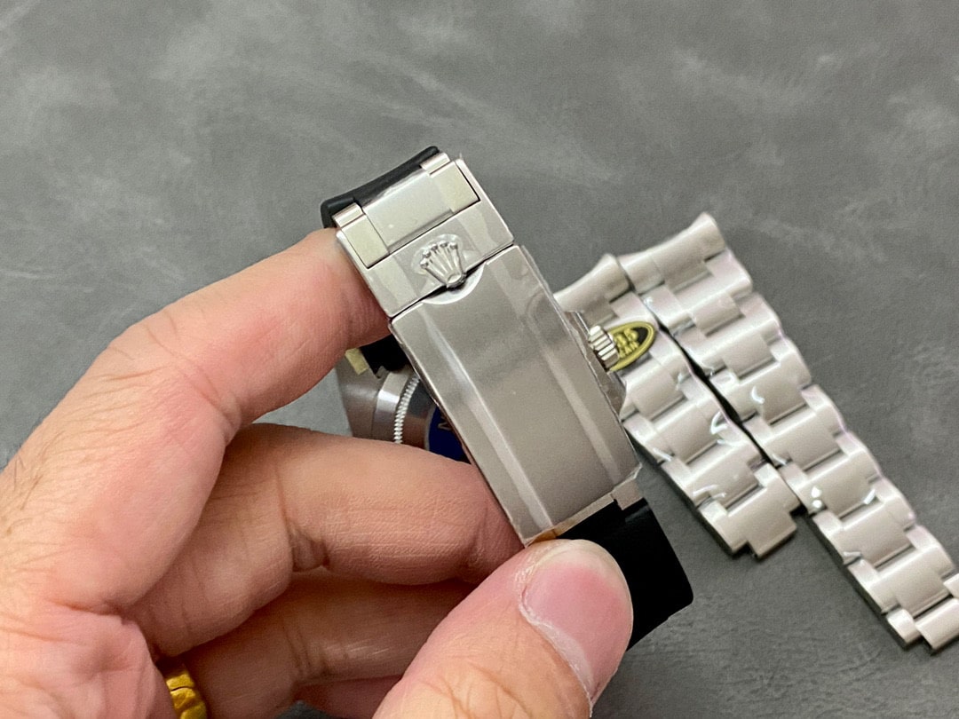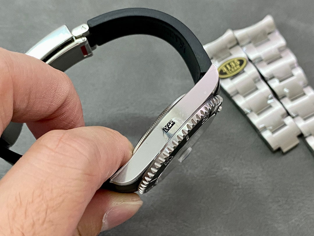 C廠勞力士黑水鬼二代40mm版本,原廠復刻由904L精鋼材質打造的鋼帶,可制定個性化膠帶款式.這種改裝已經是非常普遍的升級案例了.主要突出個性化為主,再者市面上佩戴真真假假的黑水鬼比較,為了防止撞款或者個人喜歡都是可以後期進行換裝一副橡膠錶帶.類似配戴了白金遊艇是一致的效果.對於鋼帶改裝膠帶也是非常簡單的操作,不需要很麻煩的步驟也不會碰到機芯內部,完全就是可以自己拆卸,自己完成組成.而在選擇一隻頂級版本黑水鬼進行改裝也是非常關鍵.首選Clean廠黑水鬼是目前最好的選擇,V5版本同時也是最接近原版.