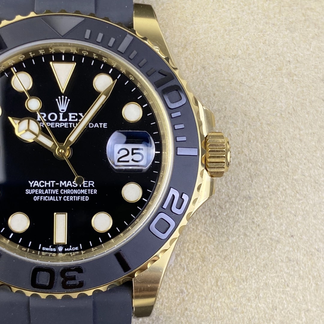 Clean廠勞力士全新推出的遊艇名仕系列m226658-0001黃金遊艇,整錶直徑42mm尺寸.是由勞力士官方在2022年發佈的最新款K金遊艇款式.原裝是使用純18K金打造錶殼-錶圈-錶扣,由於是膠帶款式在重量克數方面是沒有鋼帶款遊艇重的.而對於C廠黃金遊艇所使用的材質是904L精鋼,根據原版開模一比一還原復刻.所呈現的K金色值是使用PVD電鍍工藝,達到與原版一致的K金色值.在對比色差方面接近百分之98左右.基本上是無色差的狀態.特別是調教把頭部分,存在縫隙,C廠遊艇針對邊緣部分是需要拆卸為散件進行電鍍,是為了達到更好的完整電鍍,做到百分百不漏鋼.