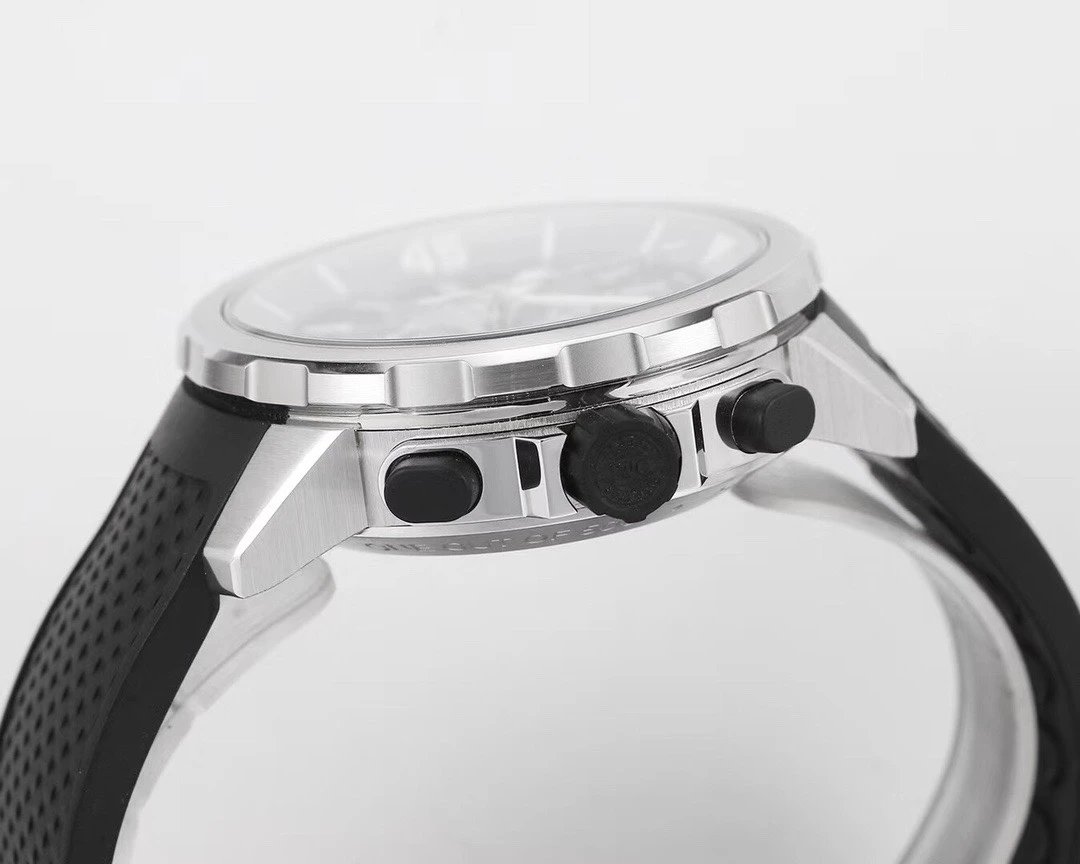 萬國海洋時計鯊魚特別版腕表側面的拉絲工藝處理,橡膠原料打造的表觀及計時按鈕,調理表冠手感十分舒適。表冠以精鋼打造,旁邊面選用拉絲規劃,雕有齒輪狀凹槽,呈現出健康的機械氣質。表冠的全體規劃較為寬大使得上鏈手感十分舒適,表冠的頂端雕有萬國的IWC符號,標誌著其品牌身份!