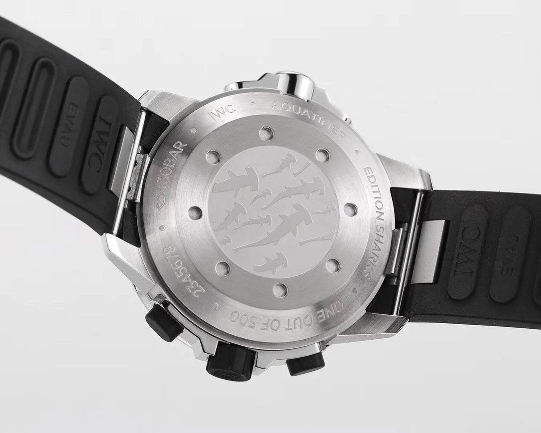 萬國海洋時計系列鯊魚特別版別的一大亮點,來源於底蓋雙鬢鯊圖畫的雕琢,底色為磨砂處理,雙鬢鯊圖畫為拋光處理,繪聲繪色。別的底蓋的刻字及圖畫也是雕琢的十分細緻,不大不小,立體清晰。機芯選用的7750計時機芯,密底規劃,功用完全,讓腕表的全體類似度提高不少。