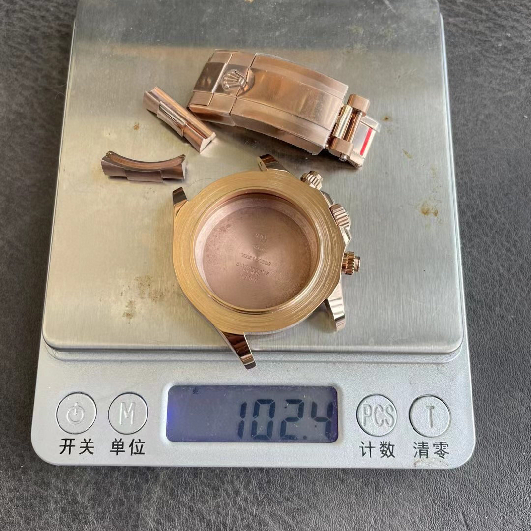 自從出現新鎢鋼材質在復刻錶上能夠發揮配重和對版色值的作用,大部分錶友都會選擇鎢鋼配重.目前也已經有了新的案例,如適用於Clean廠地通拿m116505或者是m116508.而選擇Clean廠素錶最大的特點是整體的細節處理和搭載了丹東4130機芯,機芯方面同步正品計時功能和72小時續航動力.當然也是可以BT廠地通拿,兩家廠都是丹東4130機芯.經過磨具復刻出一比一鎢鋼金屬套件,純手工打磨拋光.外觀的18K金色值對比正品完全達到百分之98以上.重量未組成之前就已經達到102克.通過組裝錶盤-機芯其他零零碎碎的配件之後,打造了154克,接近原版克重百分之90.而Clean廠地通拿未經過鎢鋼配重之前對比正品是相差百分之40左右.可想而知目前高仿手錶鎢鋼配重的重要性.