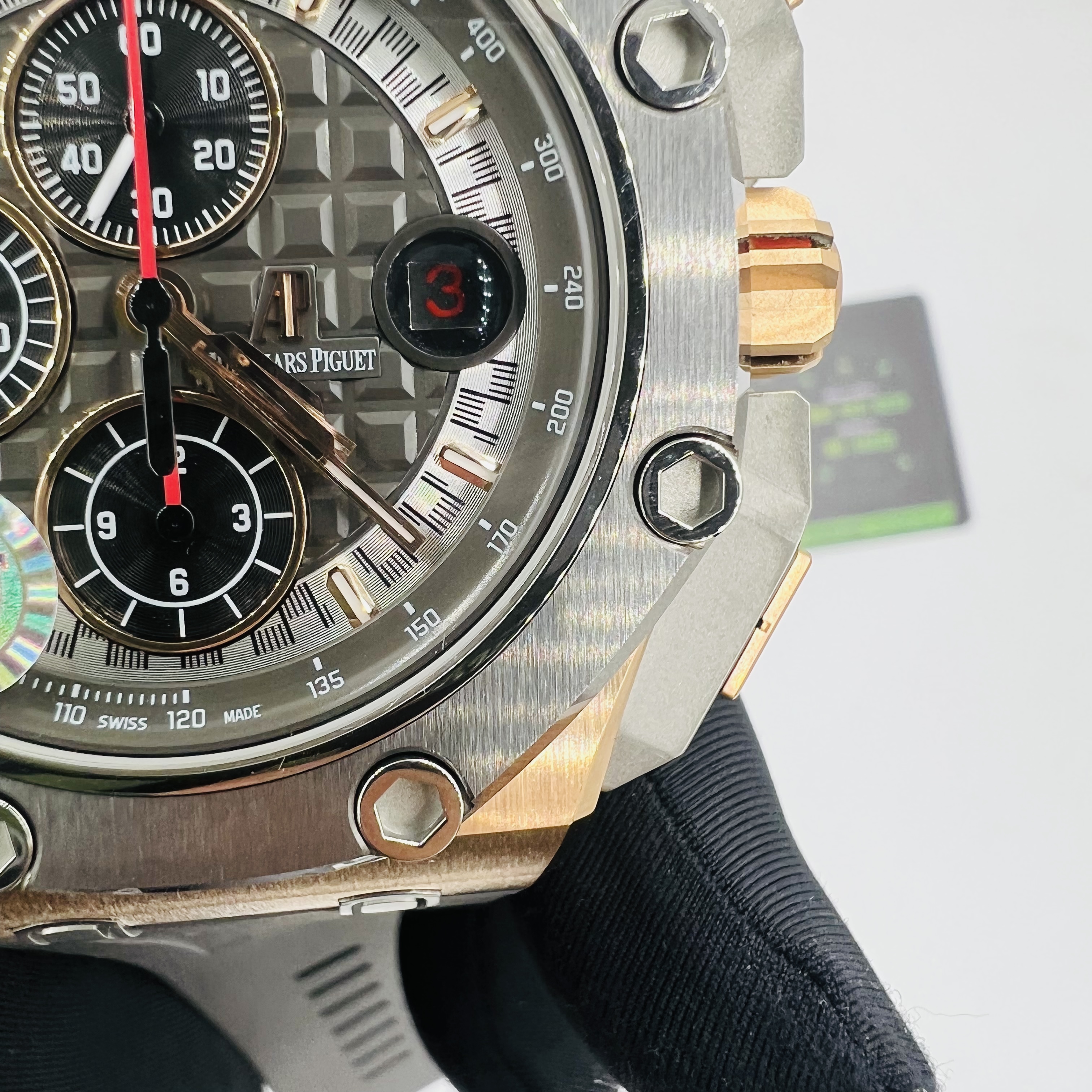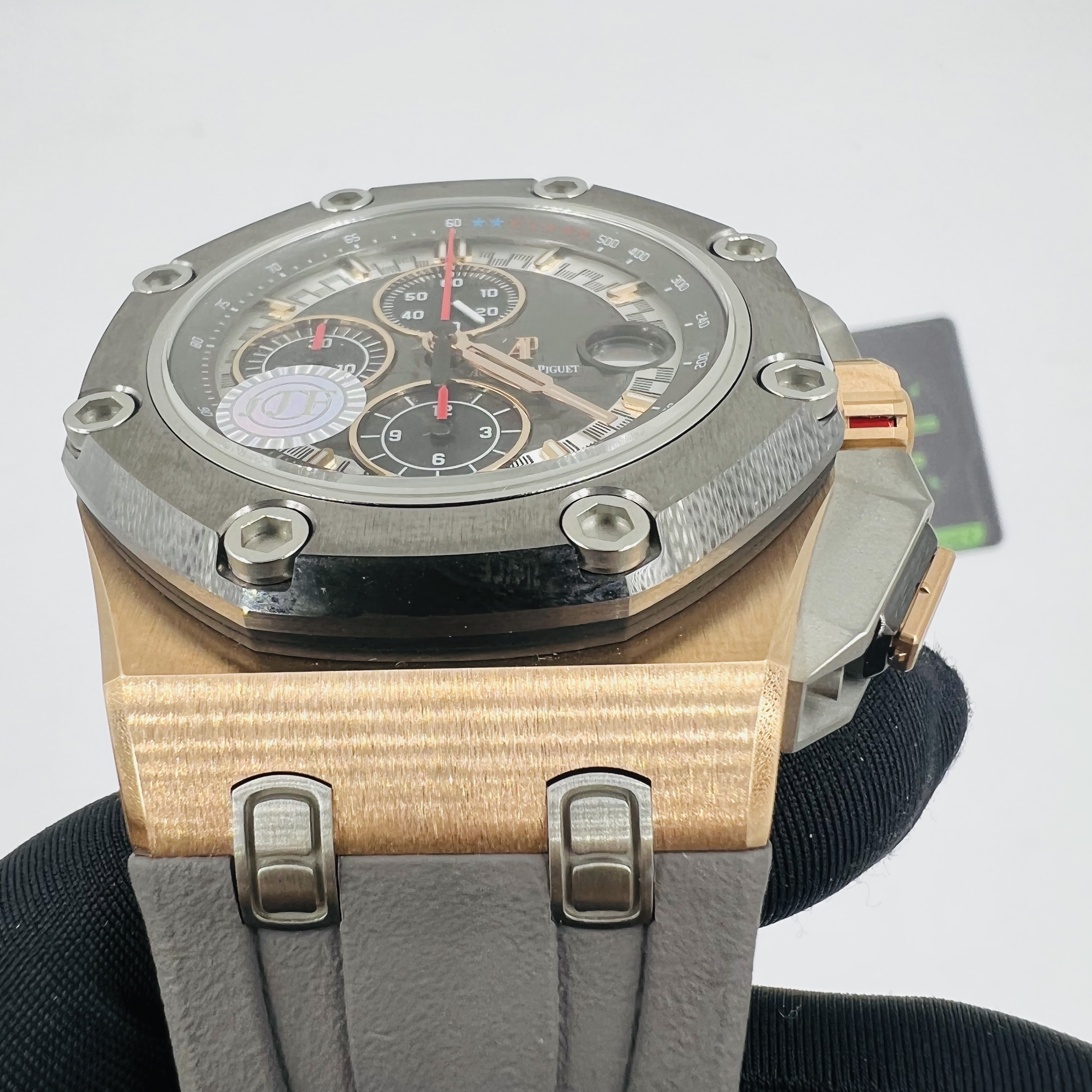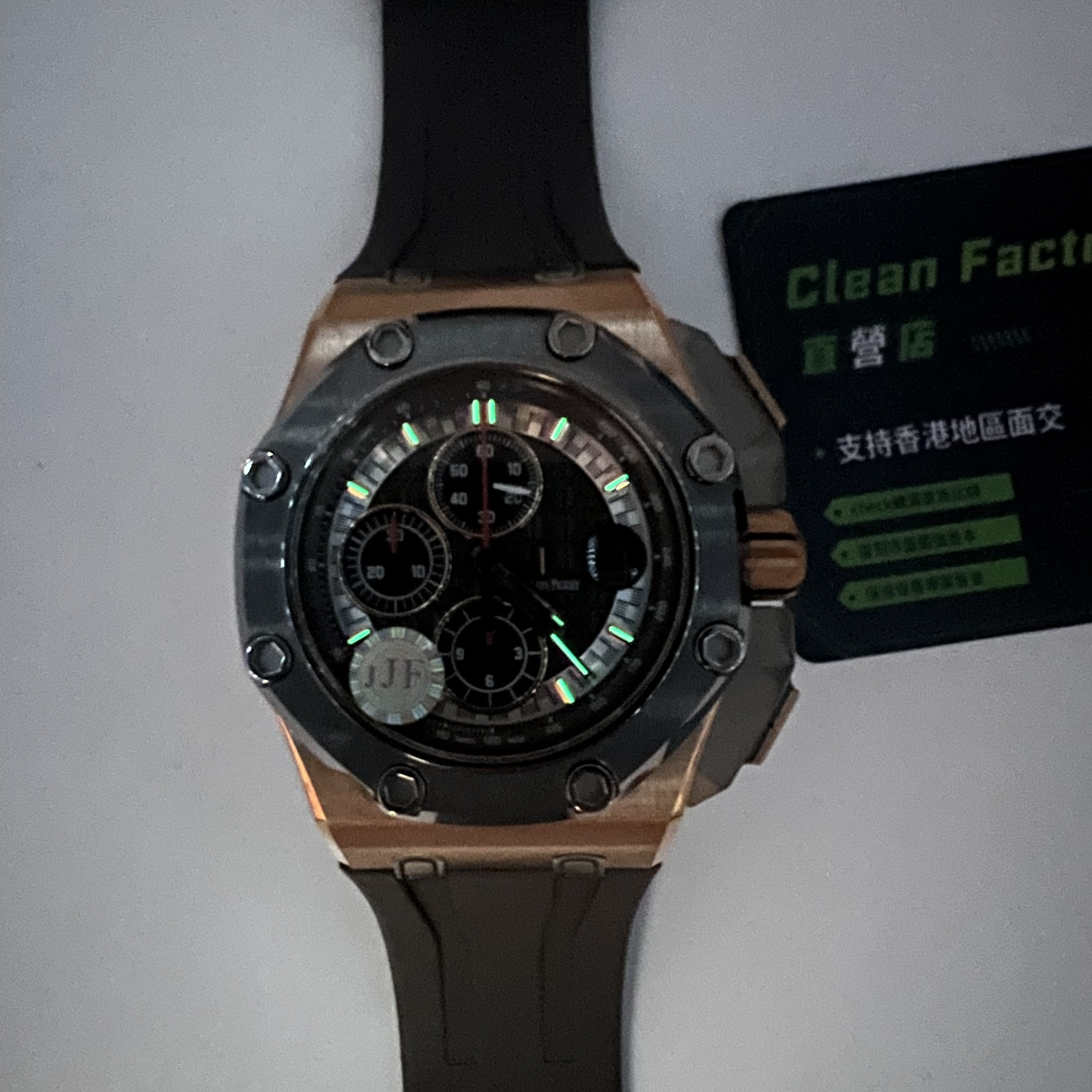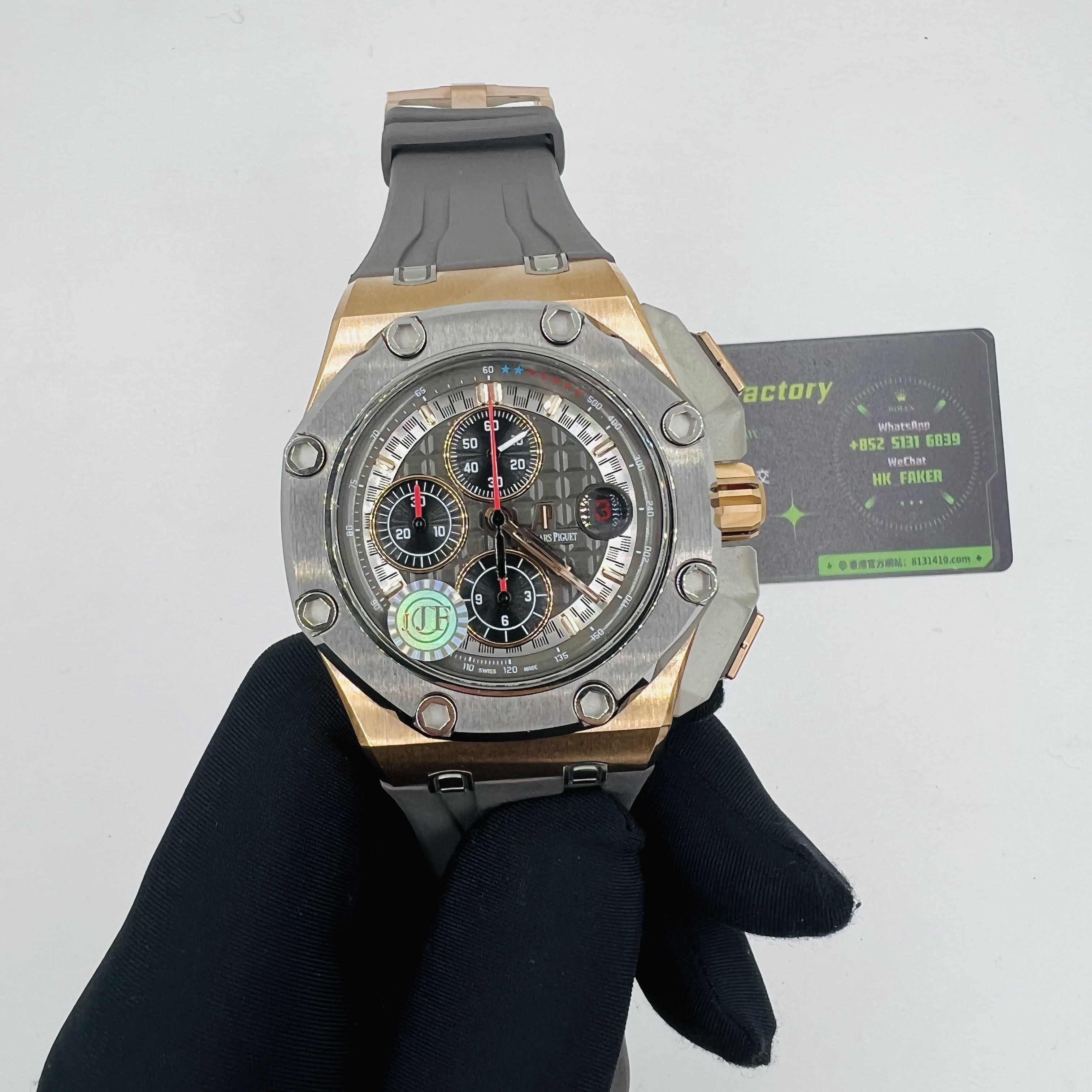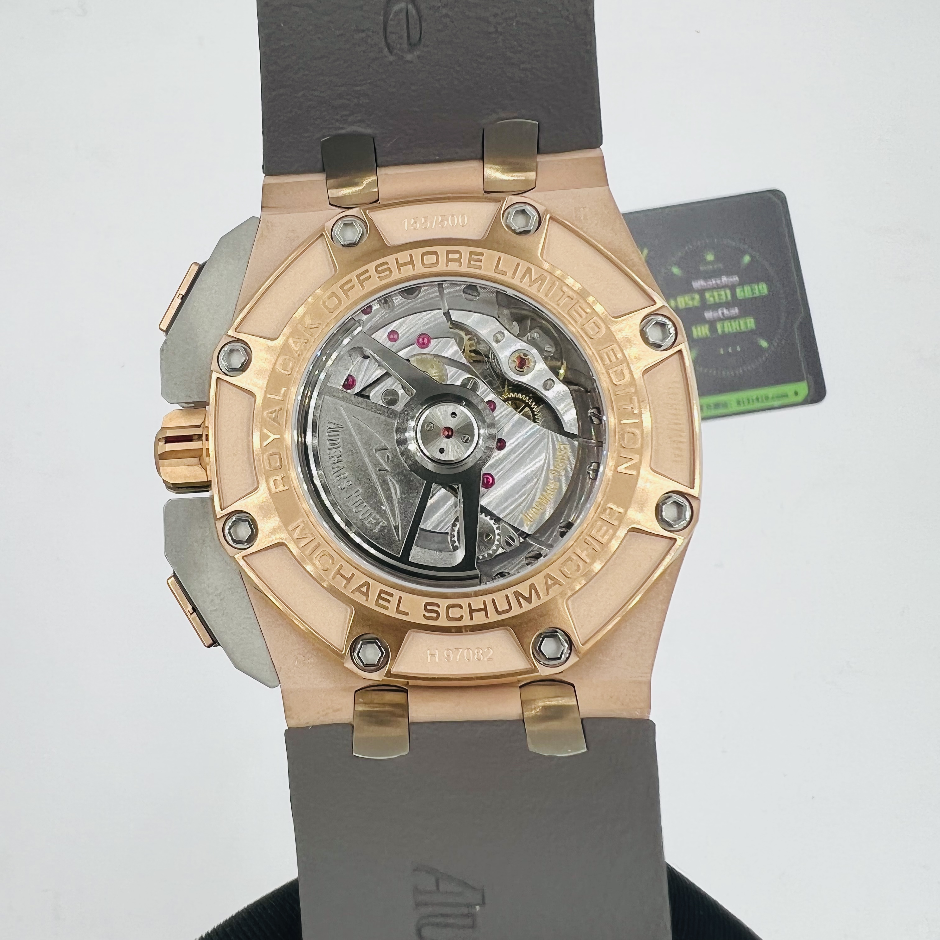 這一隻客訂愛彼皇家橡樹-舒馬赫聯名款式限量款式,對於原裝正品舒馬赫同款的話,價格是一路飆升的. 可以說是超a級別的高仿手錶. 在高仿手錶市面上是很難見到這一隻AP復刻錶的.首先是沒有那麼多廠家去復刻,第二個原因這隻錶在市面上沒有這麼熱門. 說實話都知道是舒馬赫同款,但不一定知道這一隻AP的型號.型號是:MICHAEL SCHUMACHER 26568OM.OO.A004CA.01. 出自JF廠AP頂級復刻,JF廠也是一家老廠,專門復刻愛彼皇家橡樹的老款腕錶,不得不說這一隻舒馬赫同在工藝方面,已經是頂級的存在.