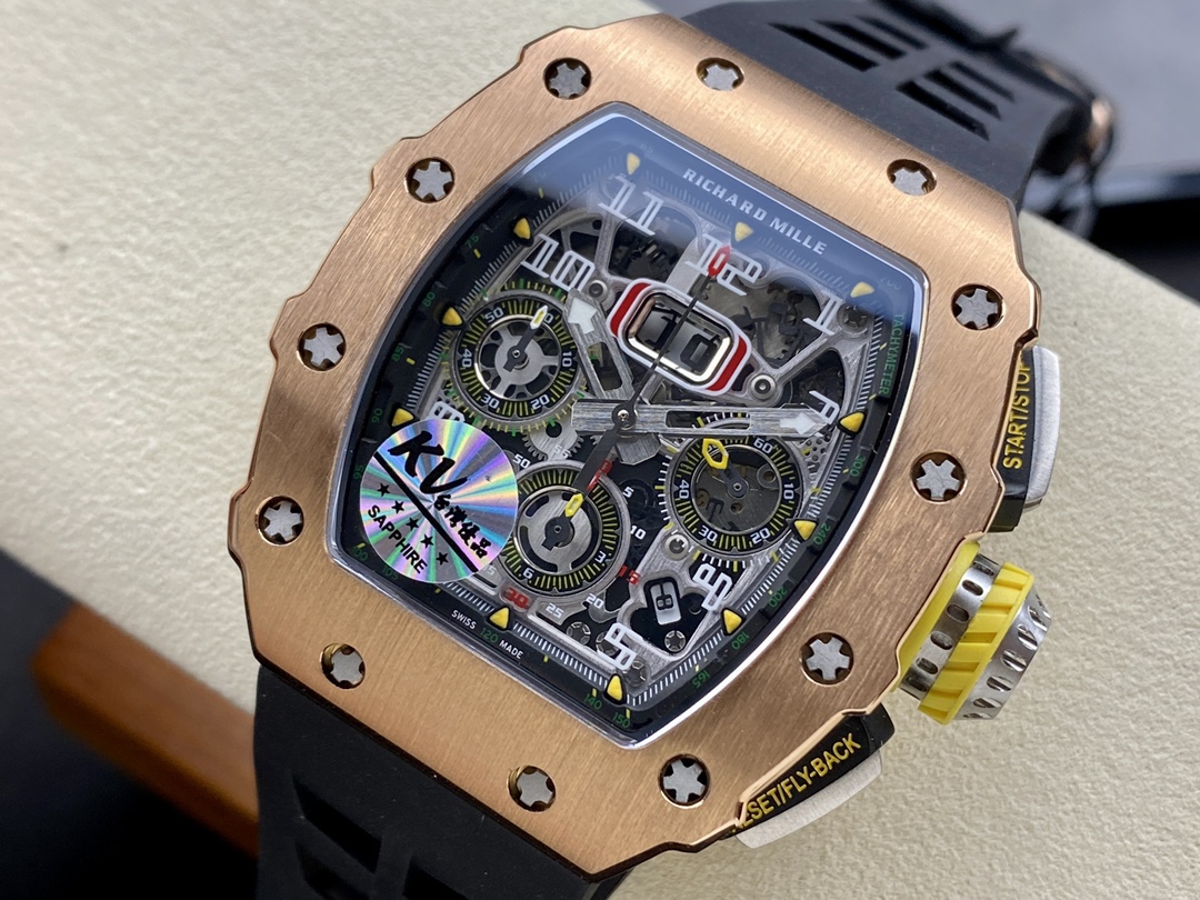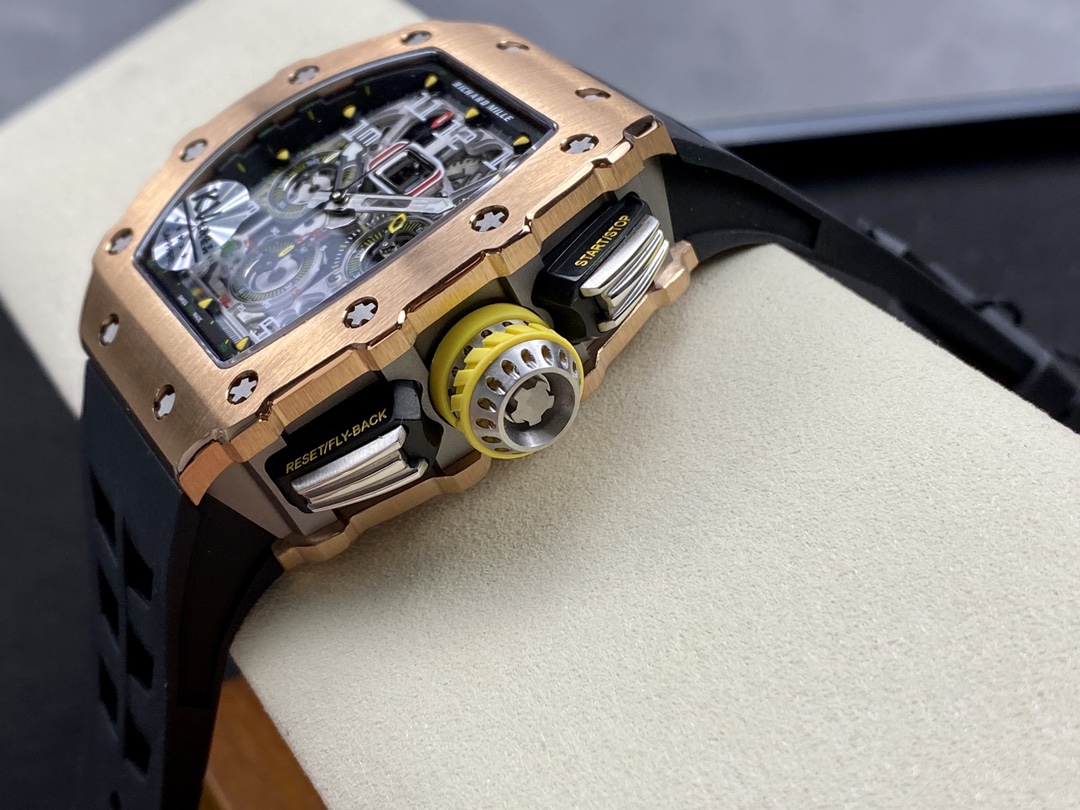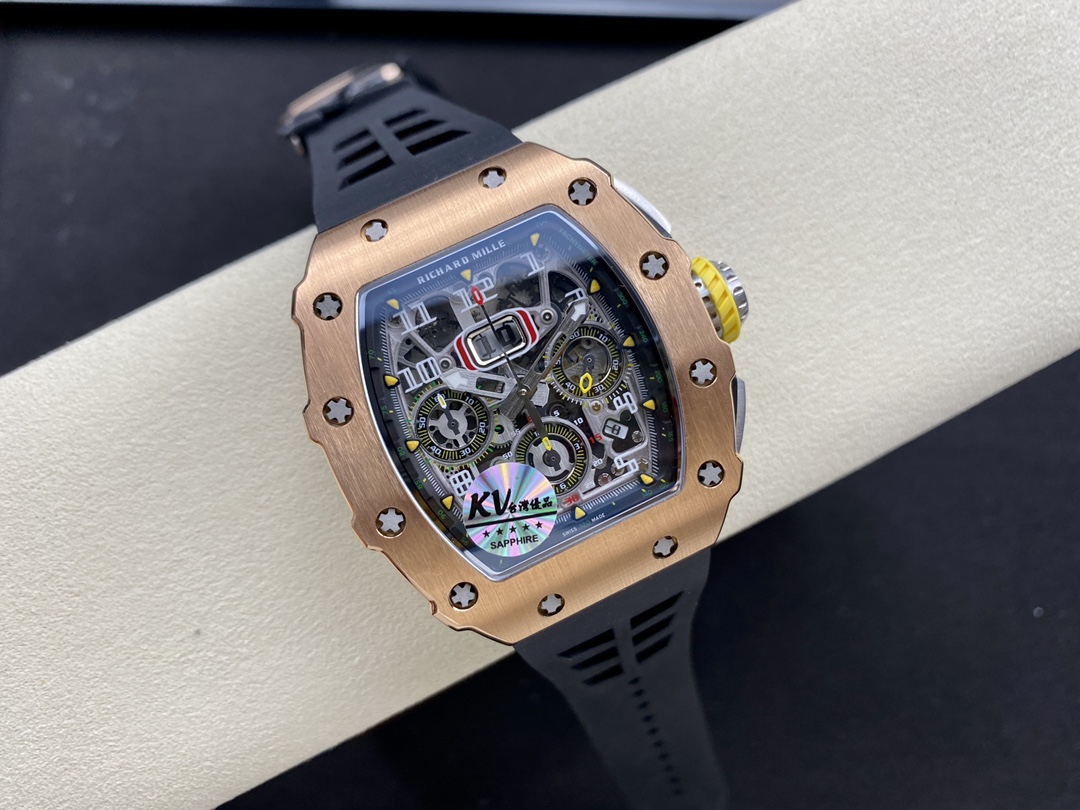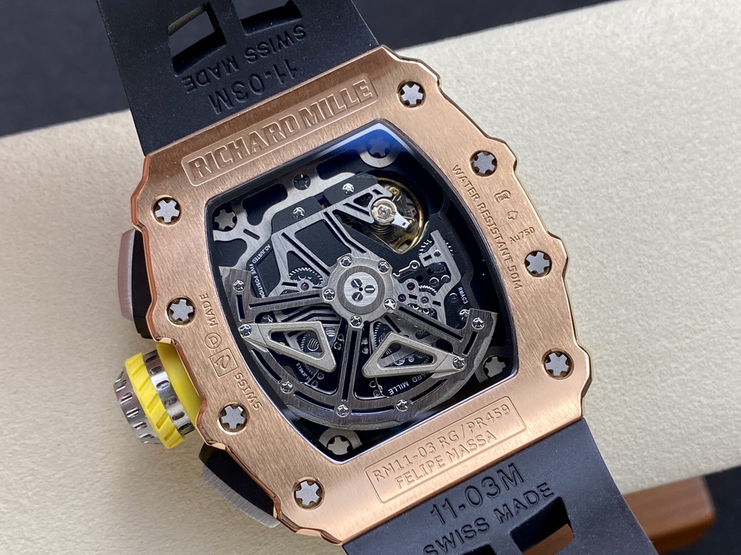 KV廠理查德米爾RM11-03系列完美的人體工程學設計相吻合的追求完美的品牌的標誌性建築。 RM011的每一個組成部分,都是其功能的審美表達。 RM 11-03腕表保留了最易於辨識的標誌性外形,但其所使用的工藝仍然遠超以往。 錶殼為鈦鋼材質,它們都有著做工細膩的拉絲表面,與拋光倒角搭配,展現出了鮮明的對比。 計時按鈕,清晰的標有功能字體(Start/Stop和Reset/Fly-back),它的設計靈感源自於F1賽車中的踏板所有的這些優化改動,都讓這款RM011-03飛返計時自動腕表要比之前的款式新增了更多的運動與新潮的氣息。