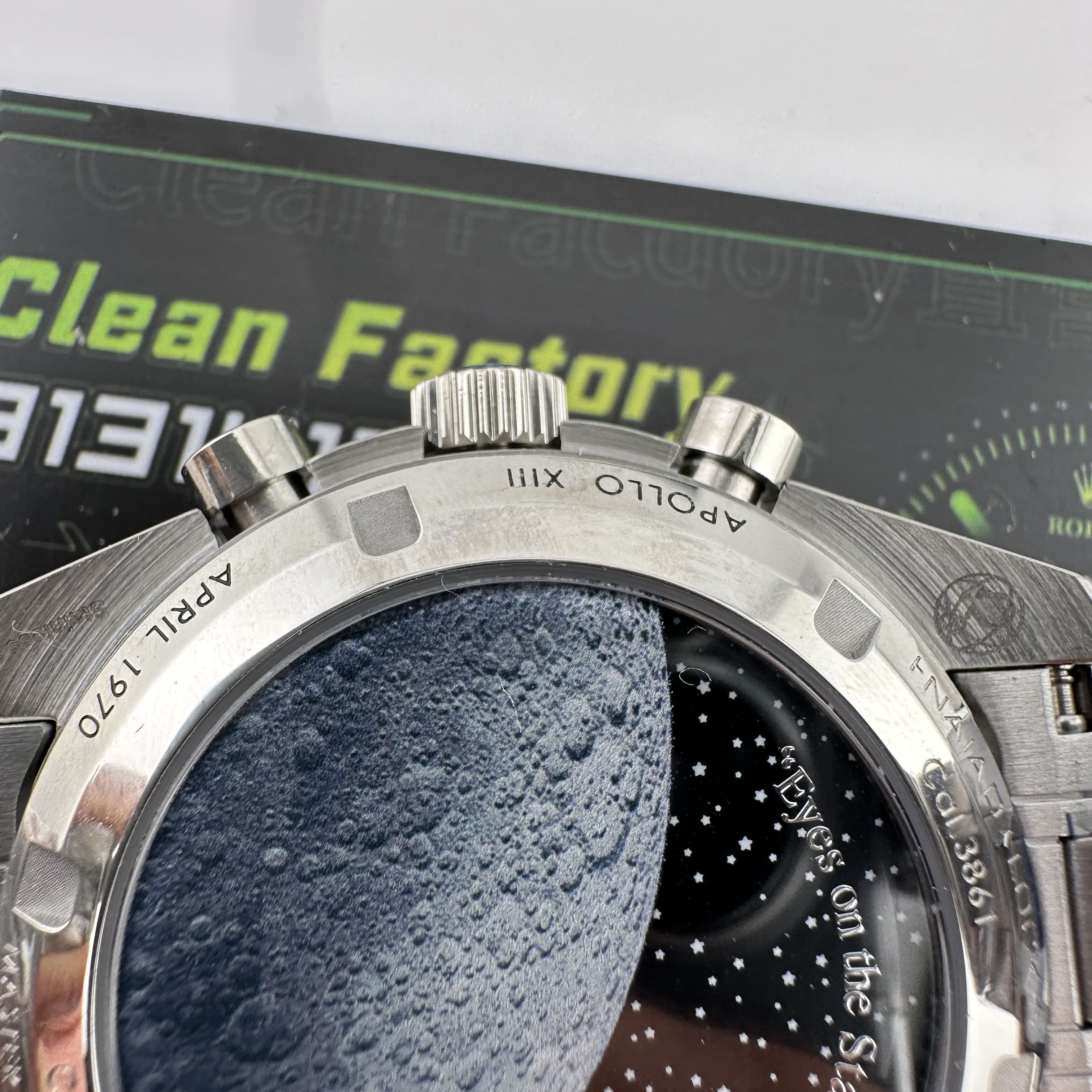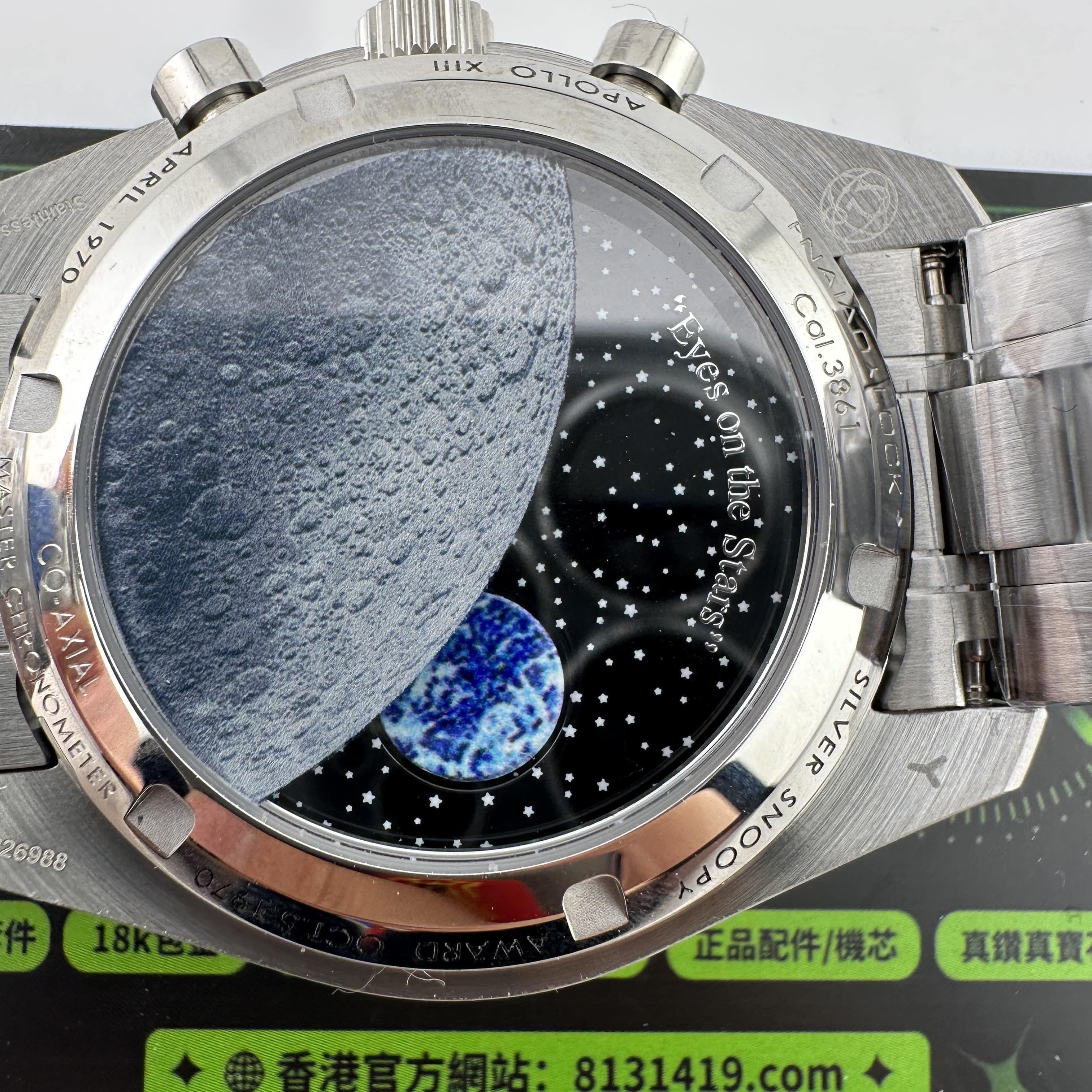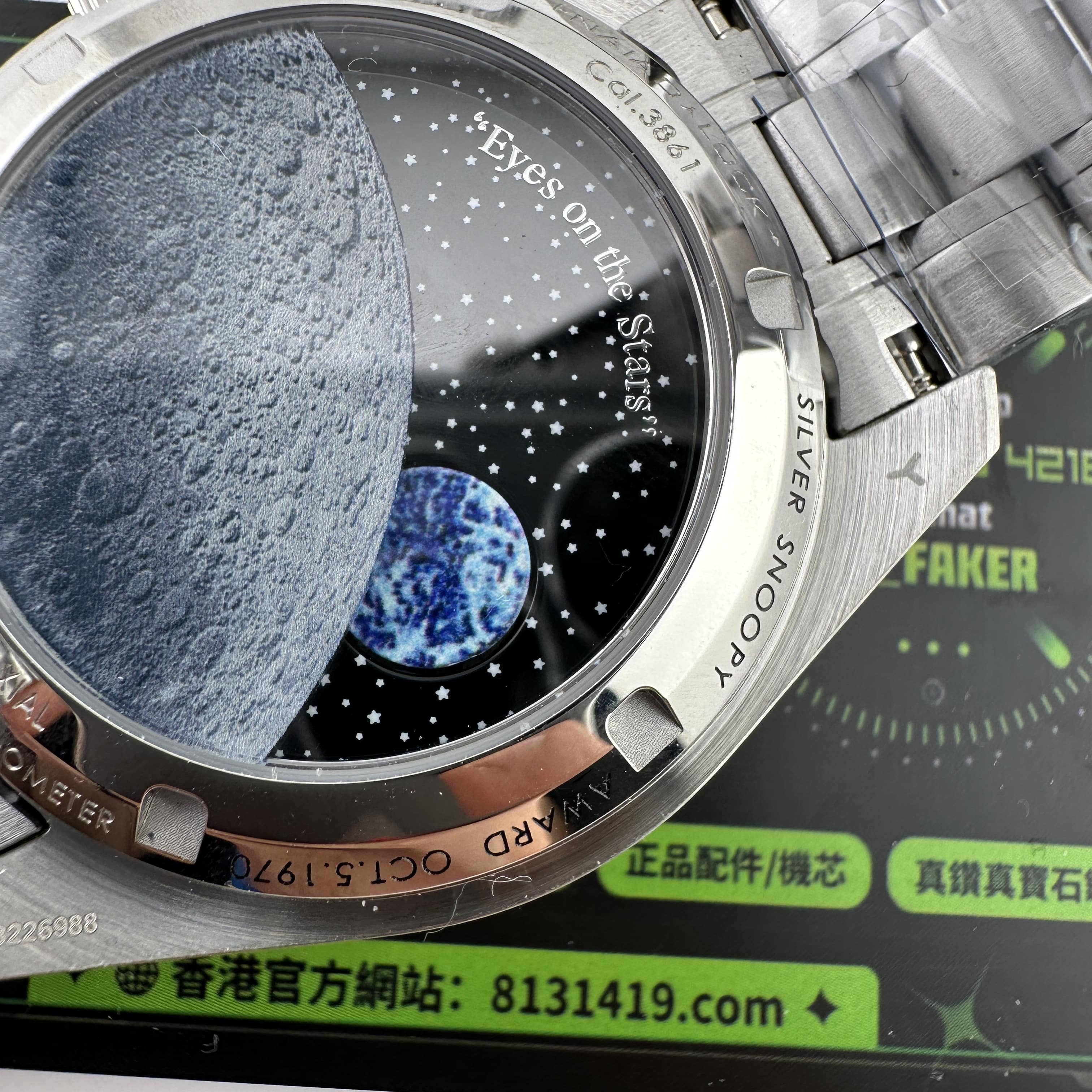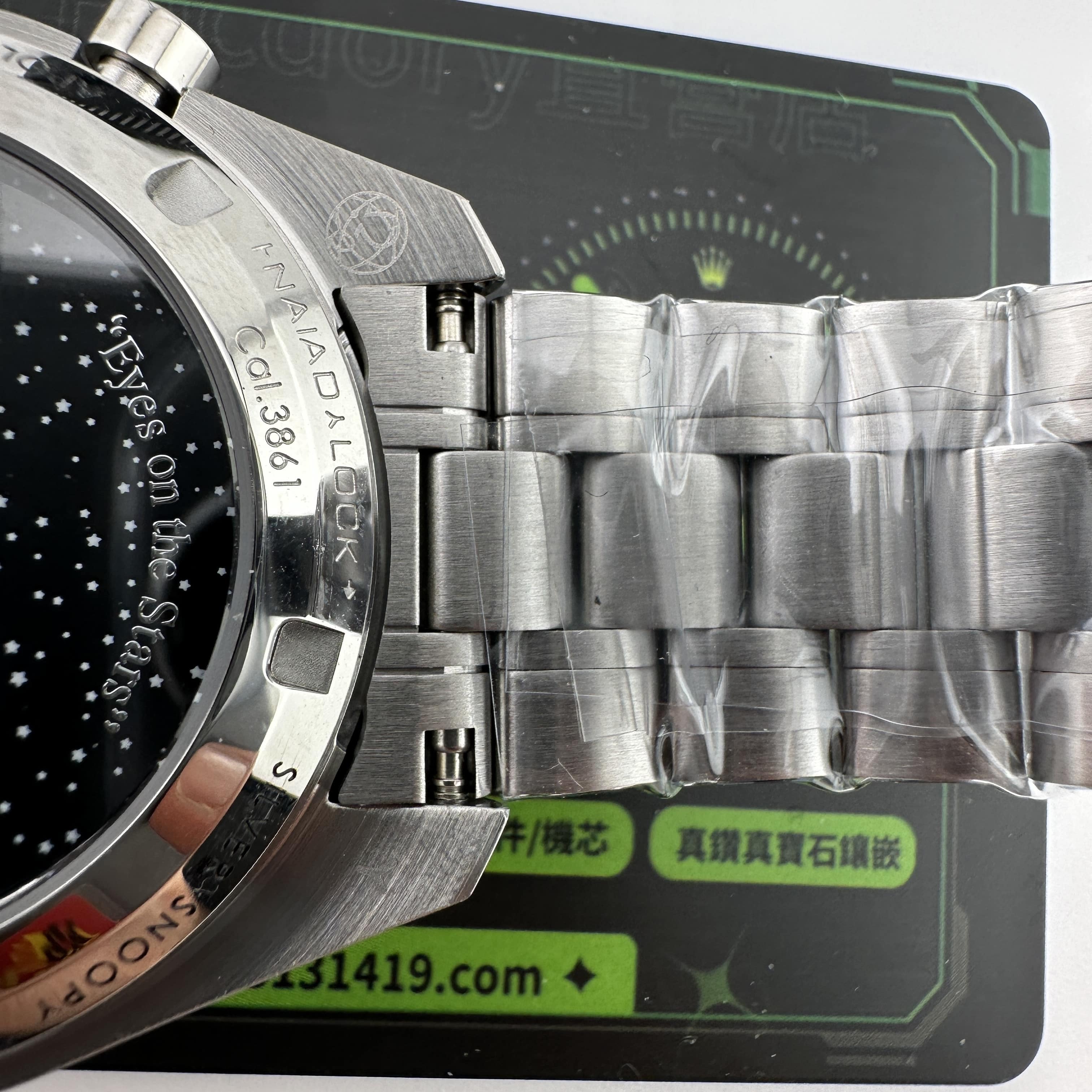 同時N1廠歐米茄Snoopy腕錶推出了針織布帶以及鋼帶款式,高仿歐米茄Snoopy針對鋼帶款式是按照原版1:1開模打造而成,真正做到了對版狀態.錶盤內部設計到Snoopy圖案以及計時功能顯示,百分百還原功能.而背部則是超霸系列最具有辨識度的浩瀚月球星空,月球土壤的凹陷3D視覺感,詮釋了N1廠在製作工藝方面達到的頂級復刻.機芯配置是搭載了3861手動上鏈機芯,與專櫃版本是一致.