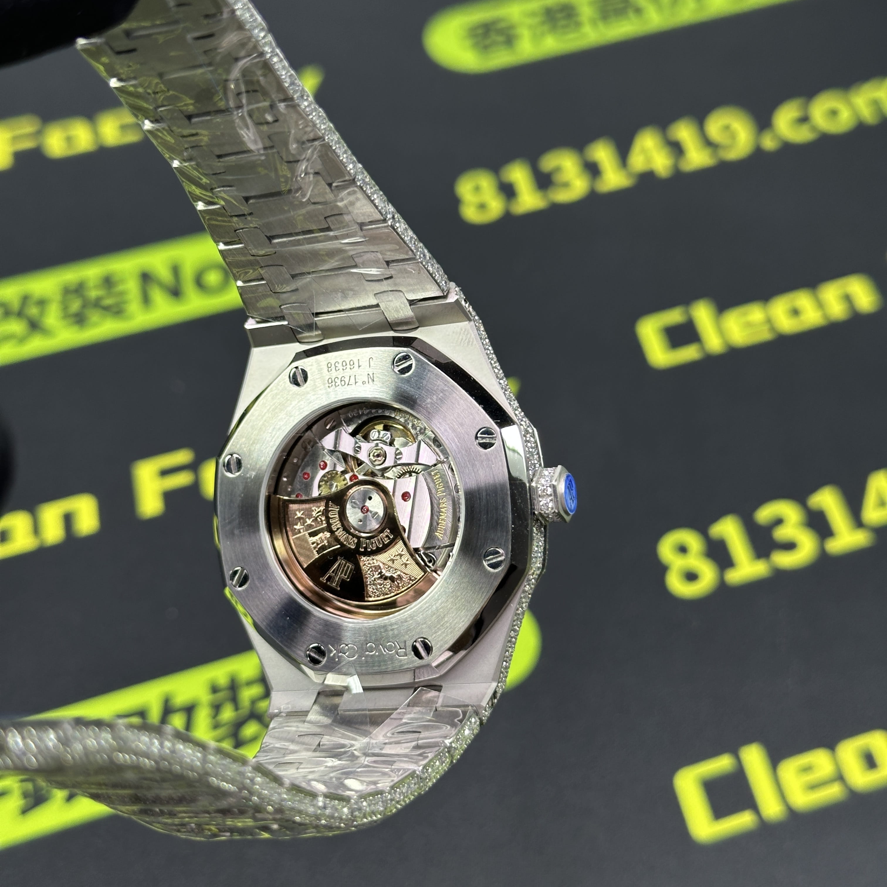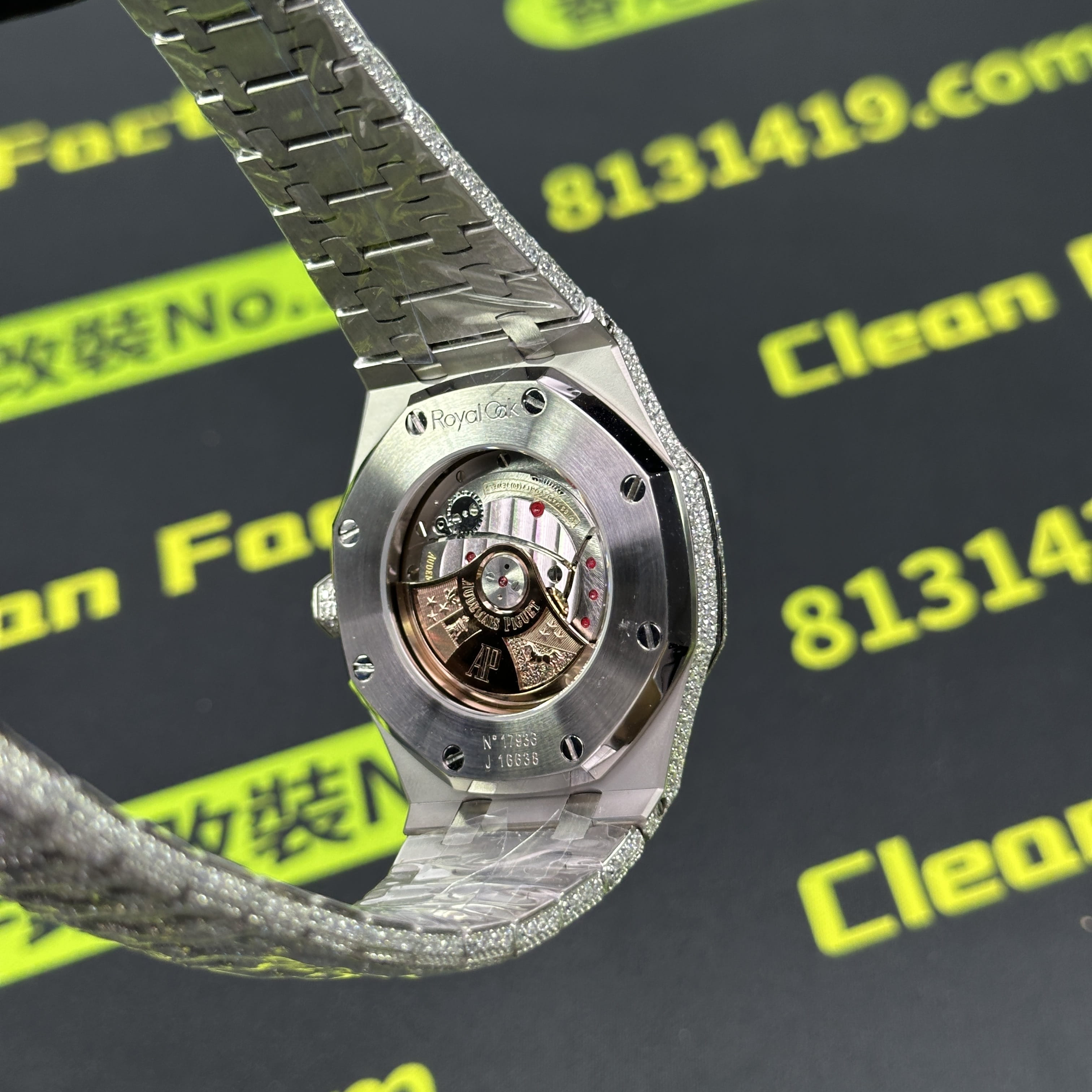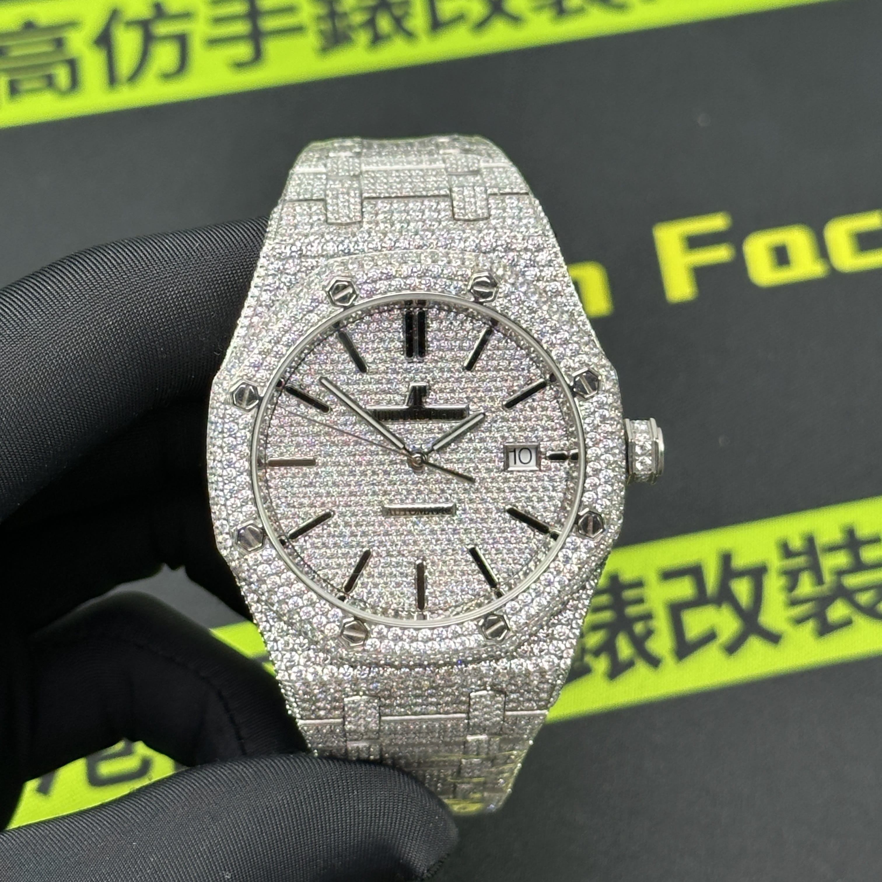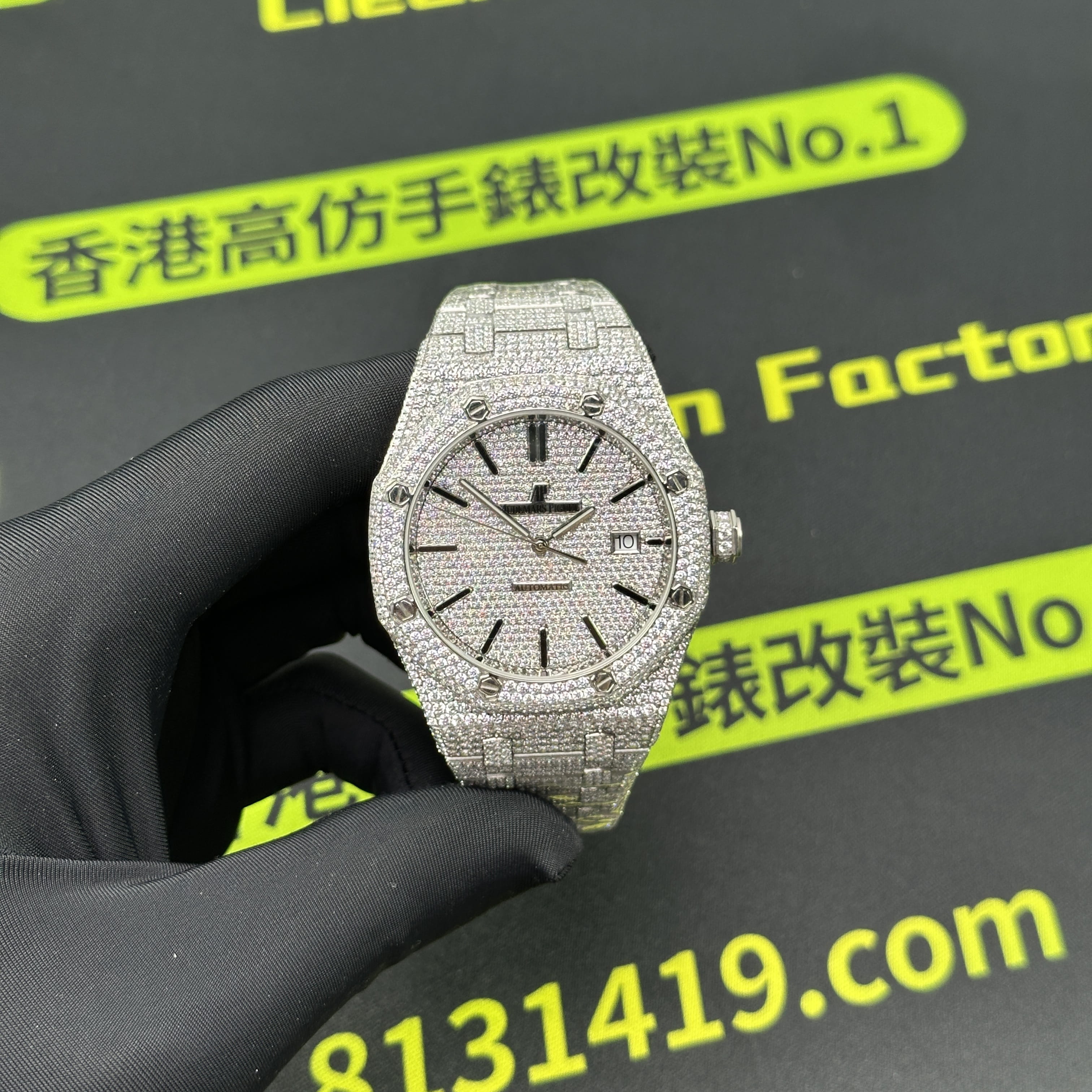 原有的基礎錶錶款我們可以根據預算去選擇,可以選擇ZF廠,APS廠,IP廠,等等廠家!例如選擇APS廠作為私人訂製基礎錶款式基於APS廠擁有良好的復刻條件,將錶殼尺寸,規格,厚薄度都可以達到量身訂做的需求.其次是APS廠本身也是大廠級別,對於機芯配置方面也是使用一體機芯構造,再者是小編認為對於高仿AP鑲鑽改裝以及私人訂製一些代用盤面的升級都建議選擇大廠工藝,穩定性是其一,畢竟改裝升級的需求是基礎好.