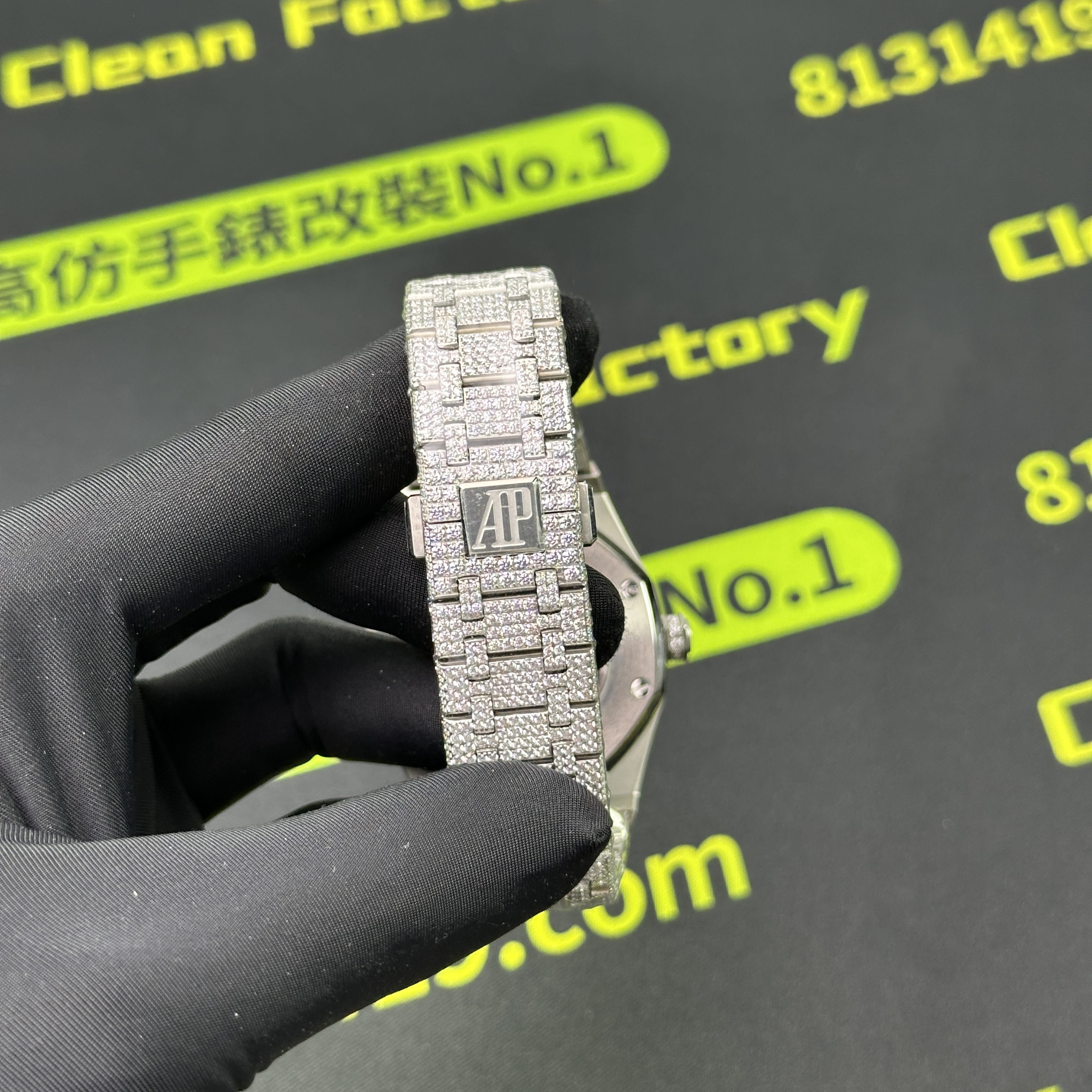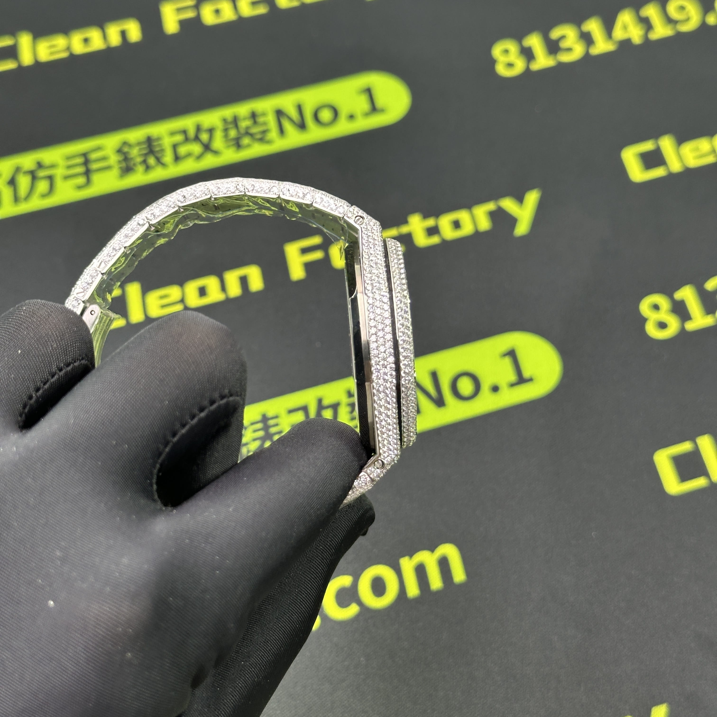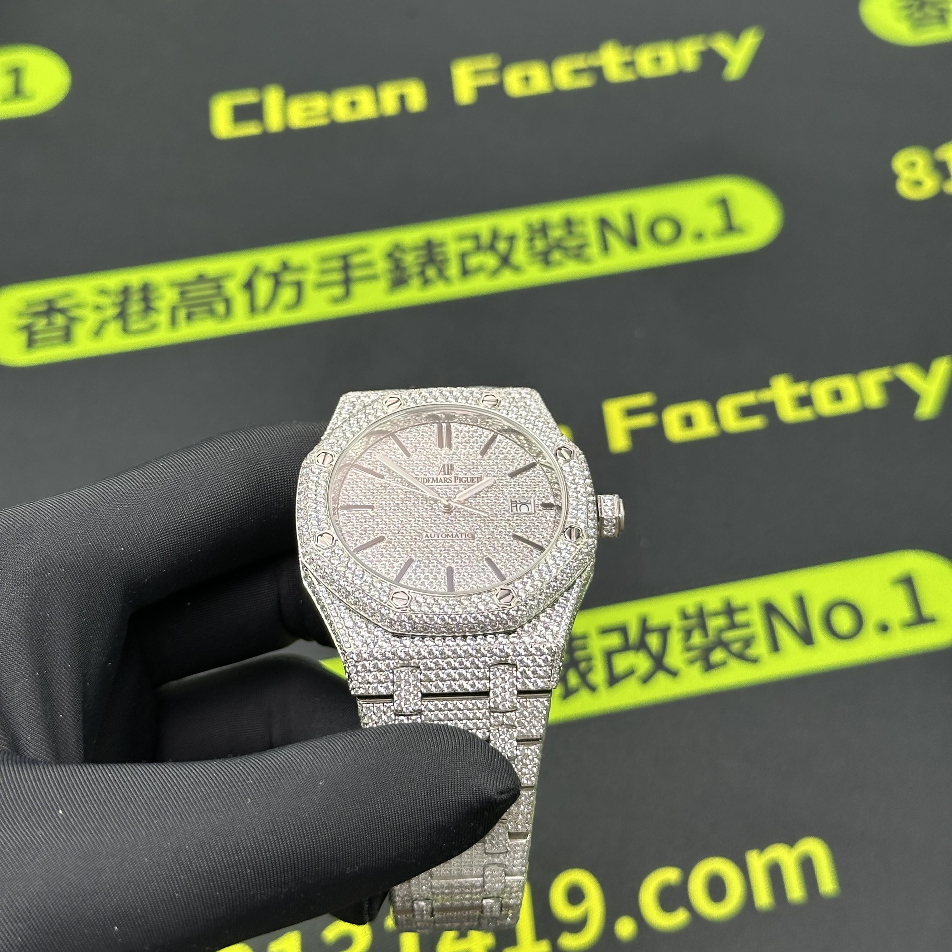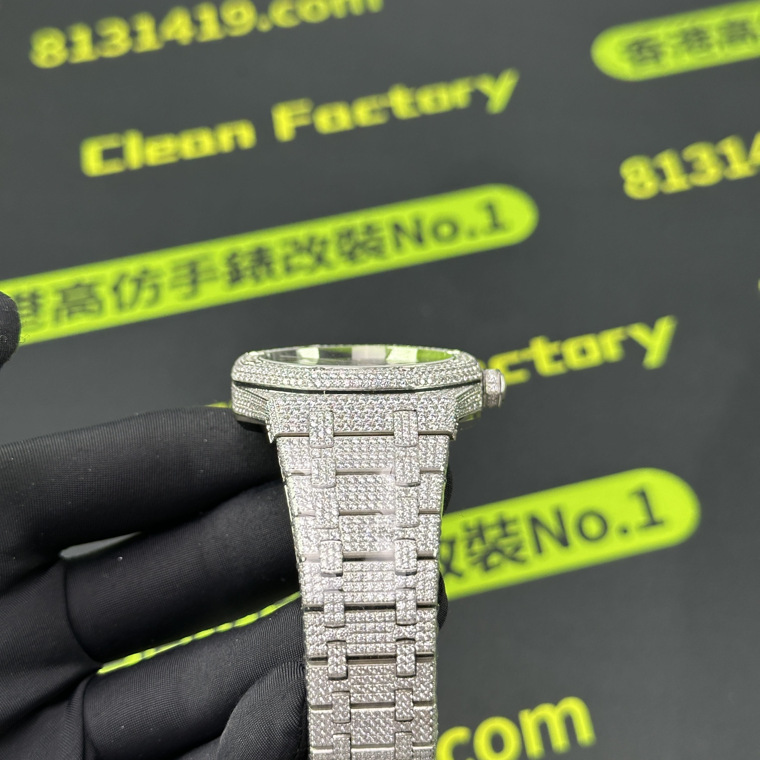 原有的基礎錶錶款我們可以根據預算去選擇,可以選擇ZF廠,APS廠,IP廠,等等廠家!例如選擇APS廠作為私人訂製基礎錶款式基於APS廠擁有良好的復刻條件,將錶殼尺寸,規格,厚薄度都可以達到量身訂做的需求.其次是APS廠本身也是大廠級別,對於機芯配置方面也是使用一體機芯構造,再者是小編認為對於高仿AP鑲鑽改裝以及私人訂製一些代用盤面的升級都建議選擇大廠工藝,穩定性是其一,畢竟改裝升級的需求是基礎好.