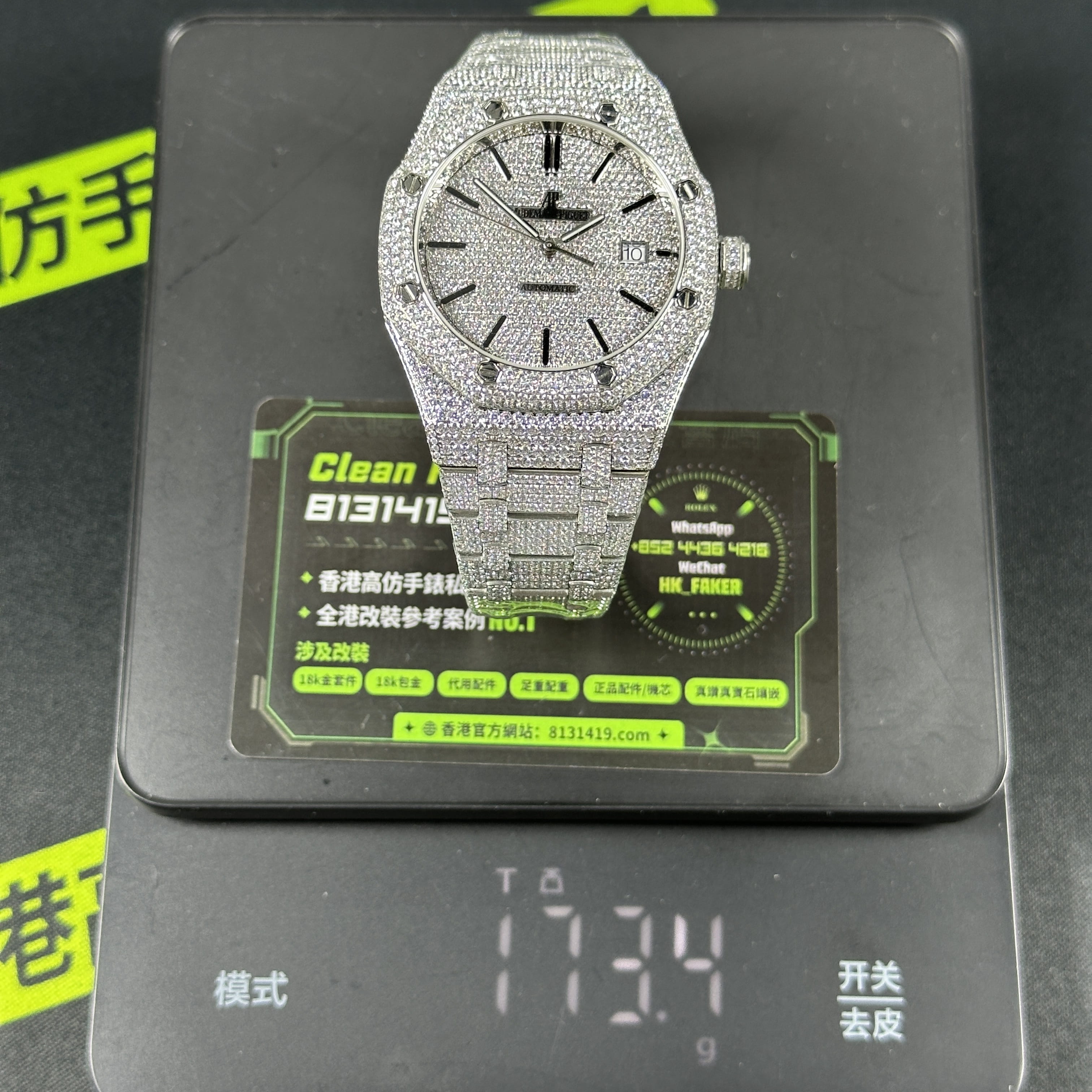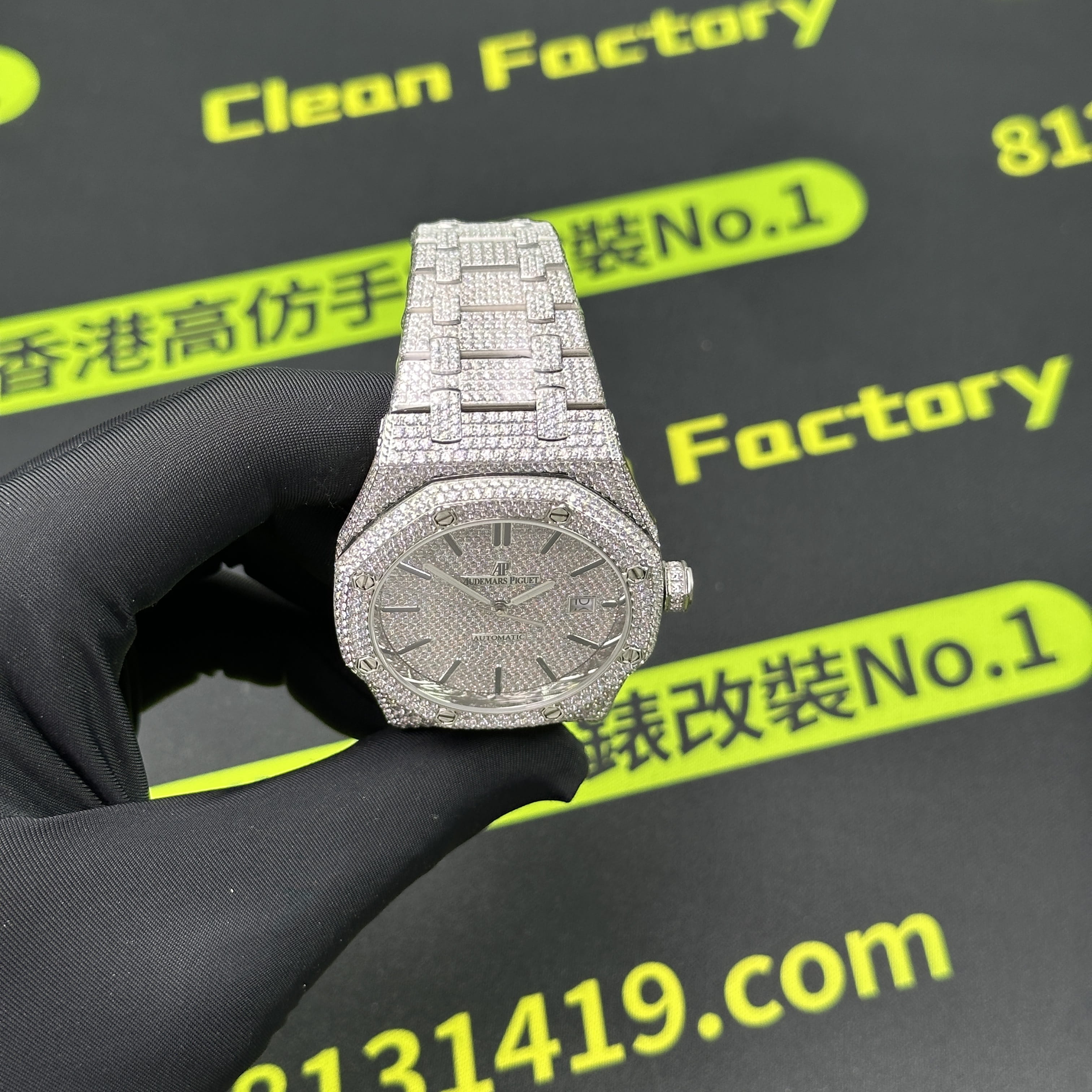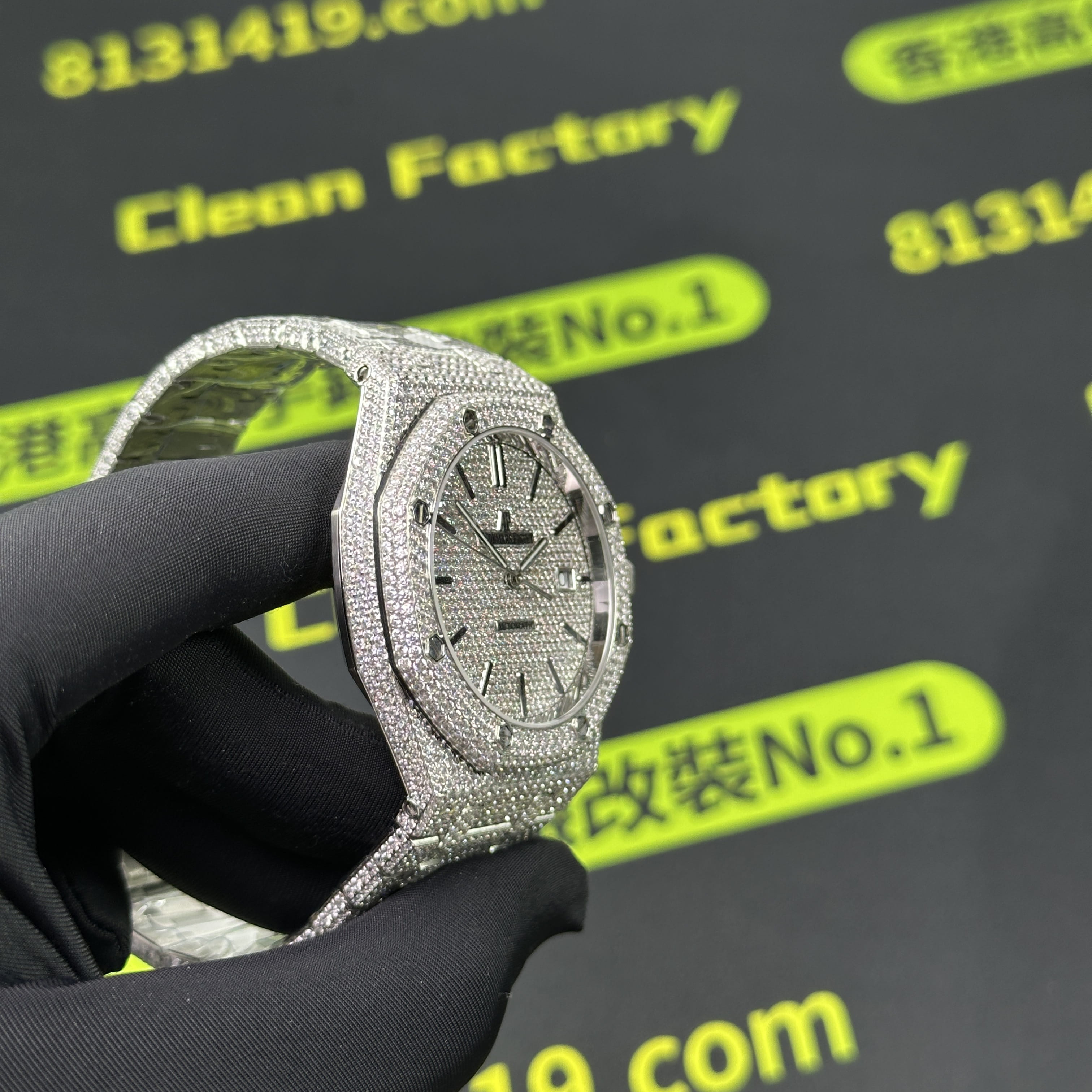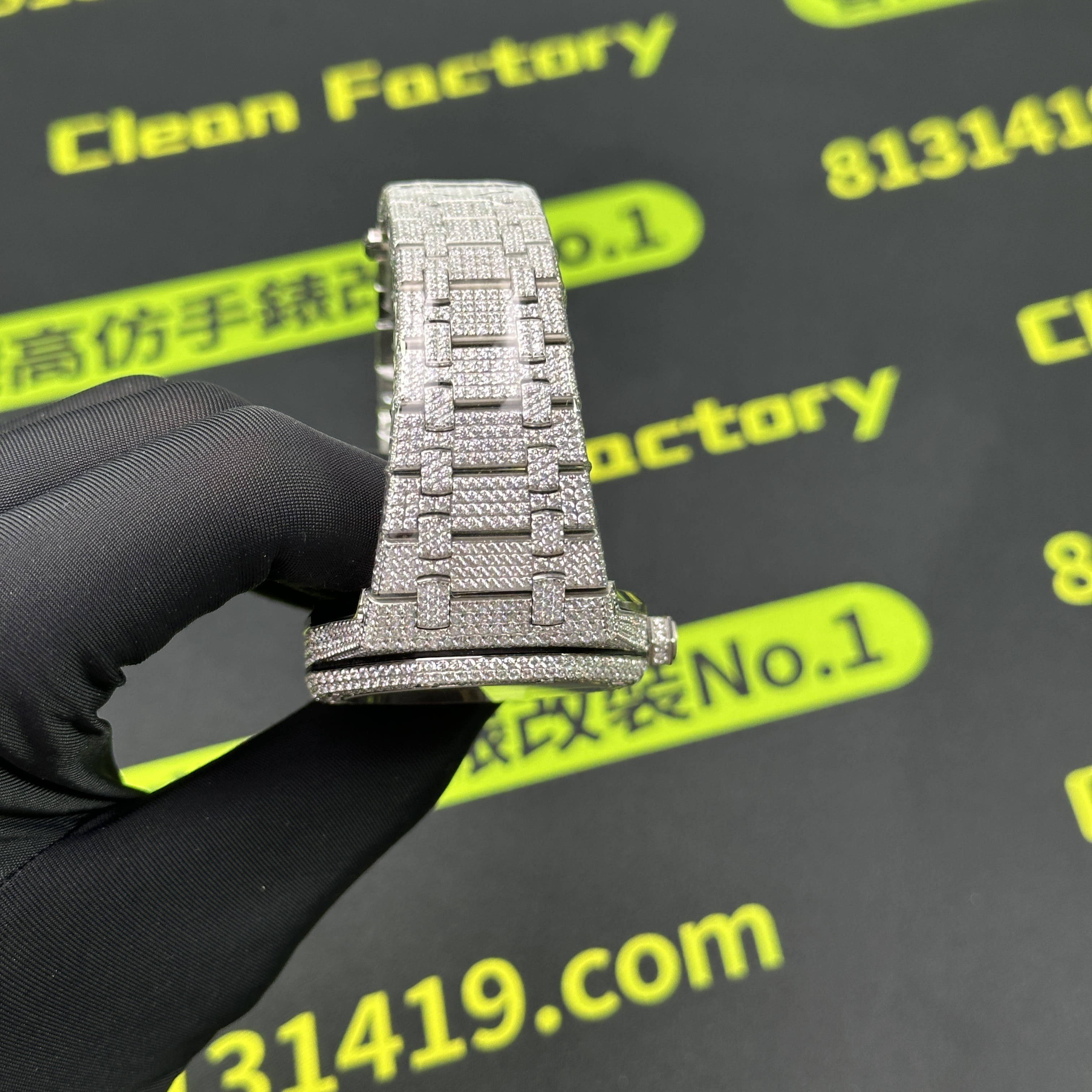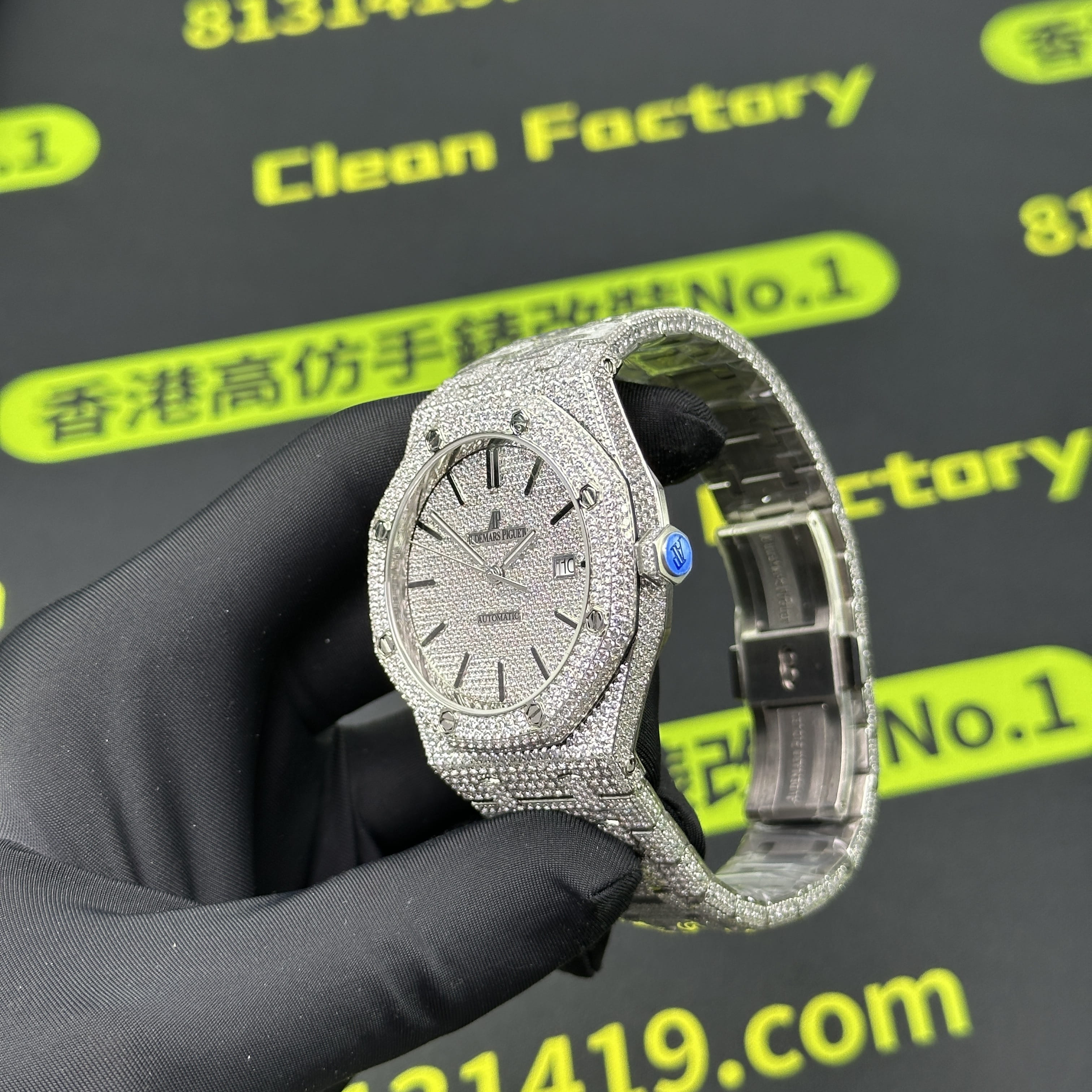 原有的基礎錶錶款我們可以根據預算去選擇,可以選擇ZF廠,APS廠,IP廠,等等廠家!例如選擇APS廠作為私人訂製基礎錶款式基於APS廠擁有良好的復刻條件,將錶殼尺寸,規格,厚薄度都可以達到量身訂做的需求.其次是APS廠本身也是大廠級別,對於機芯配置方面也是使用一體機芯構造,再者是小編認為對於高仿AP鑲鑽改裝以及私人訂製一些代用盤面的升級都建議選擇大廠工藝,穩定性是其一,畢竟改裝升級的需求是基礎好.