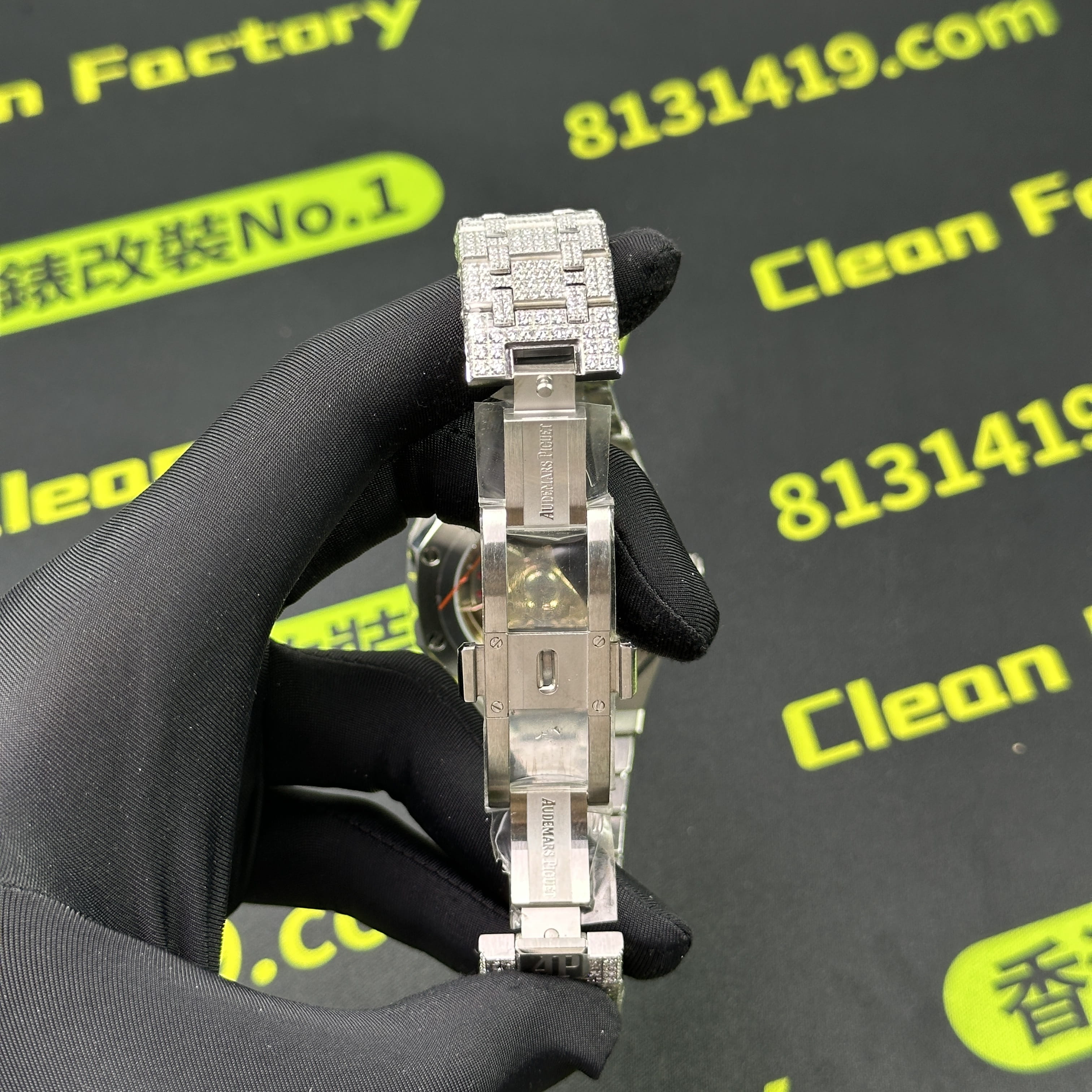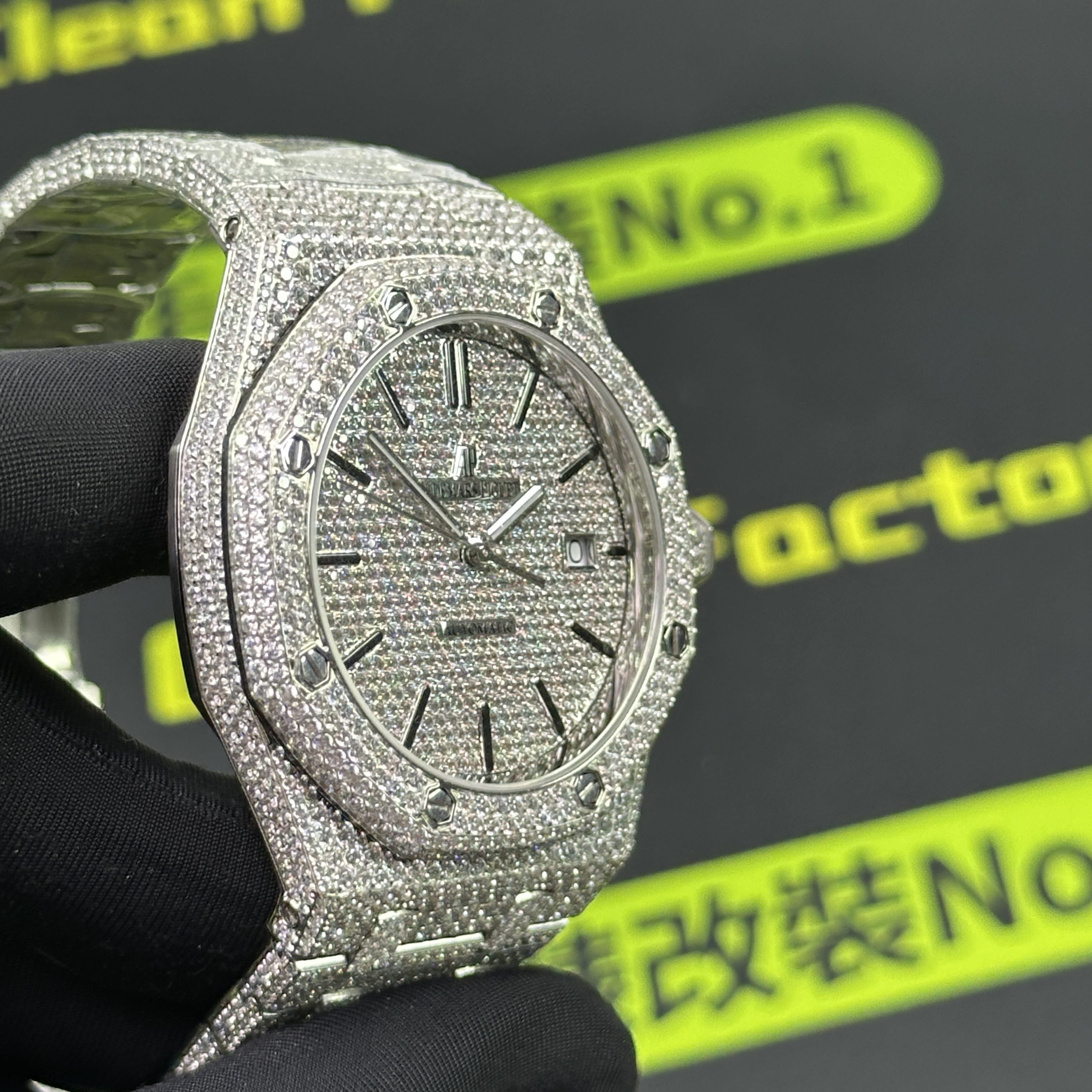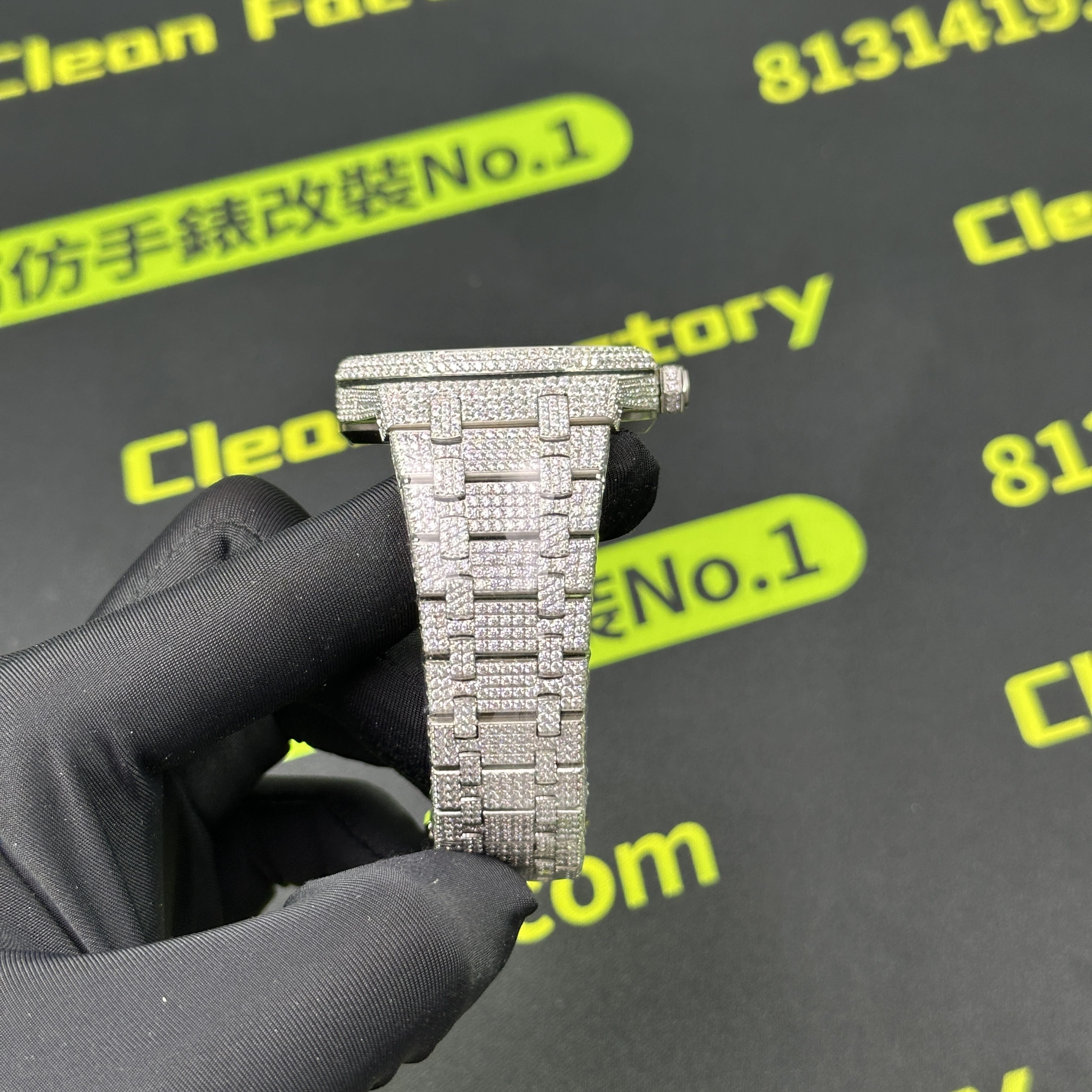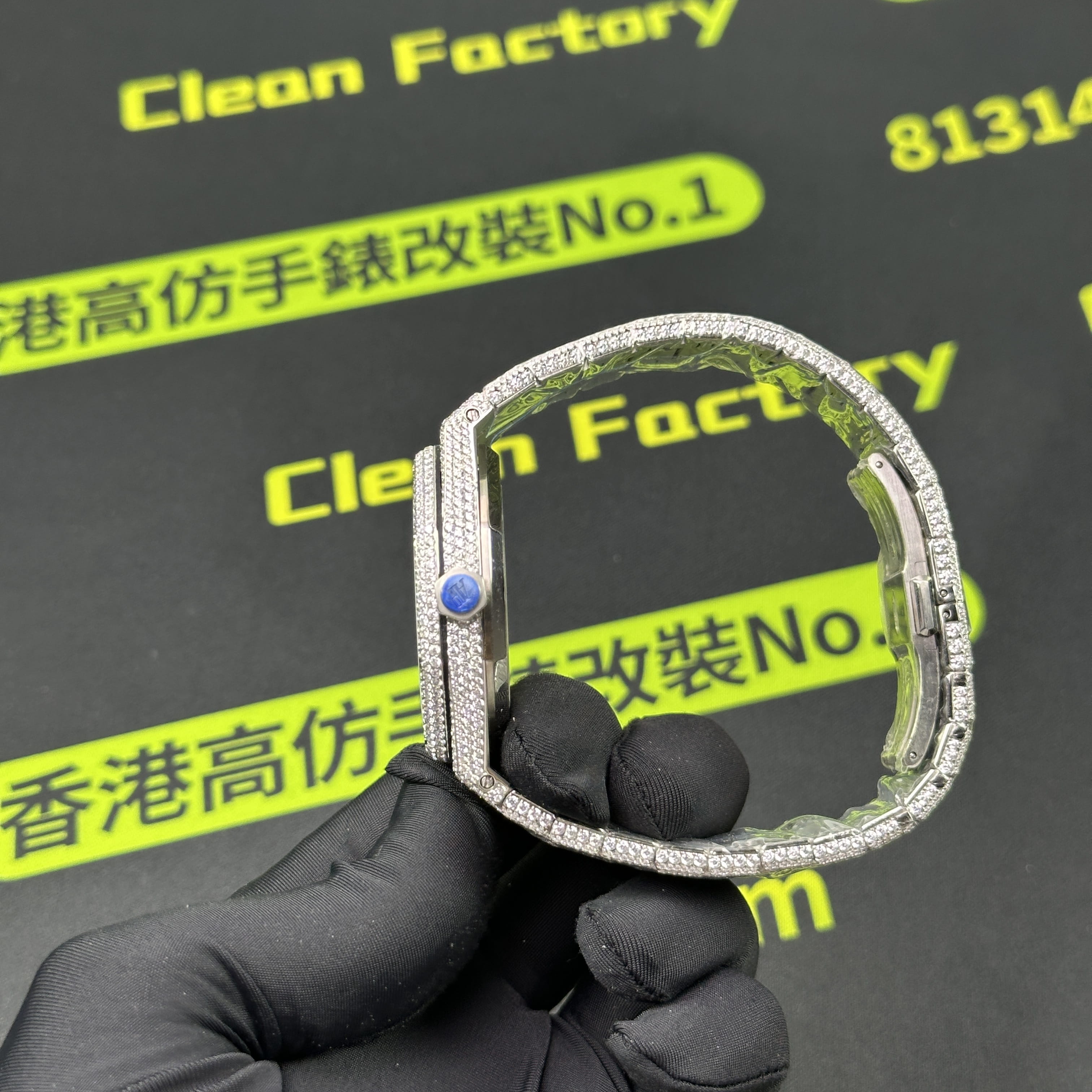 原有的基礎錶錶款我們可以根據預算去選擇,可以選擇ZF廠,APS廠,IP廠,等等廠家!例如選擇APS廠作為私人訂製基礎錶款式基於APS廠擁有良好的復刻條件,將錶殼尺寸,規格,厚薄度都可以達到量身訂做的需求.其次是APS廠本身也是大廠級別,對於機芯配置方面也是使用一體機芯構造,再者是小編認為對於高仿AP鑲鑽改裝以及私人訂製一些代用盤面的升級都建議選擇大廠工藝,穩定性是其一,畢竟改裝升級的需求是基礎好.