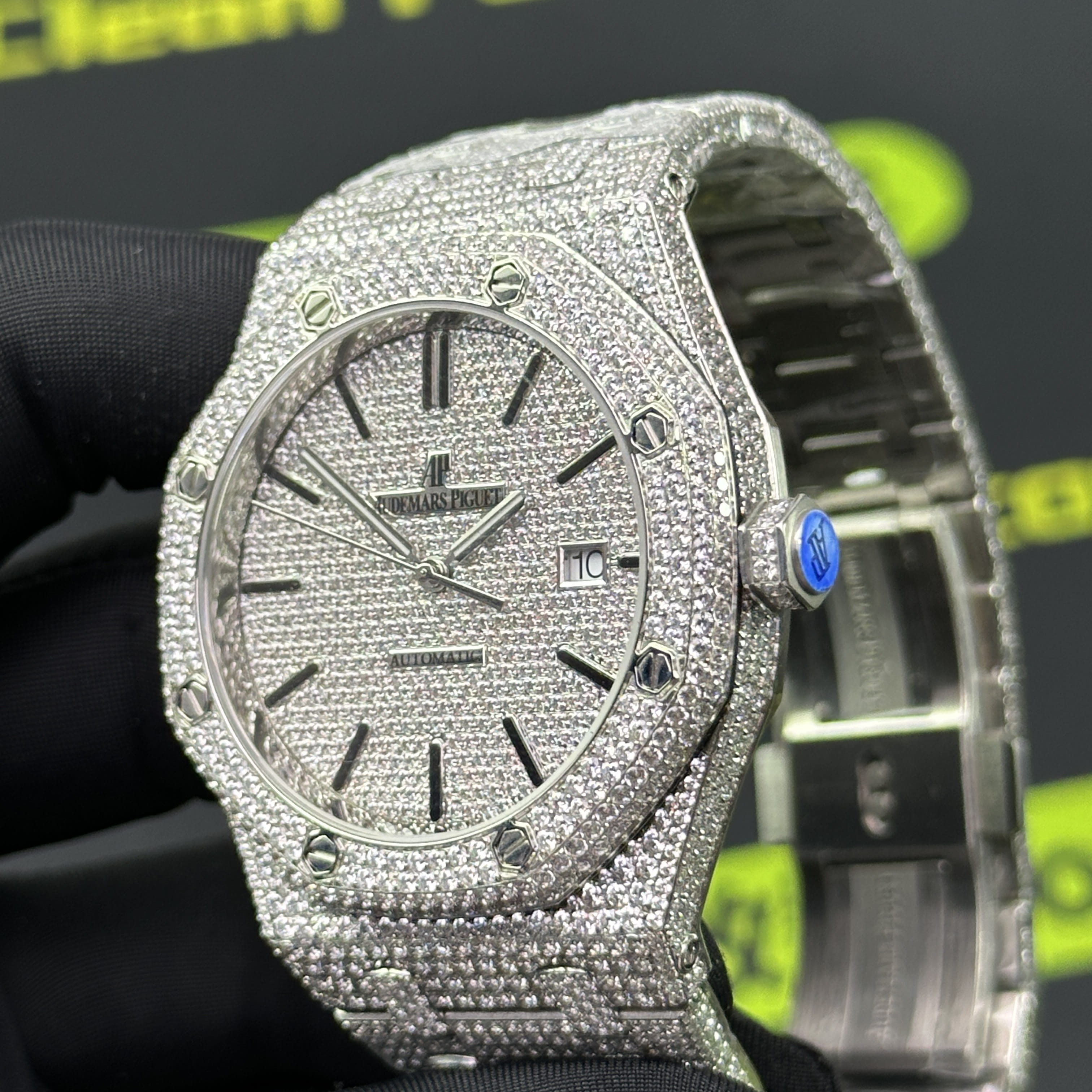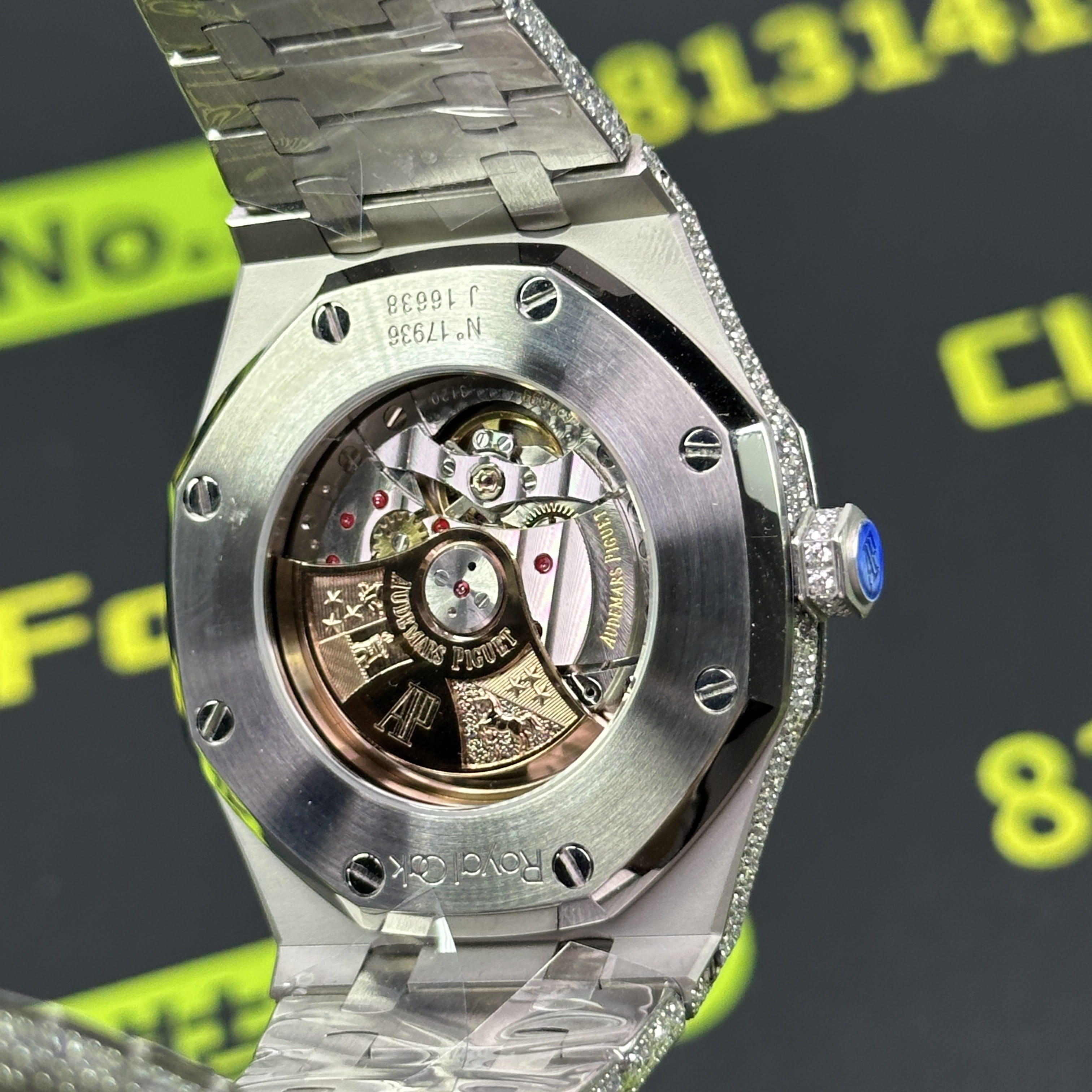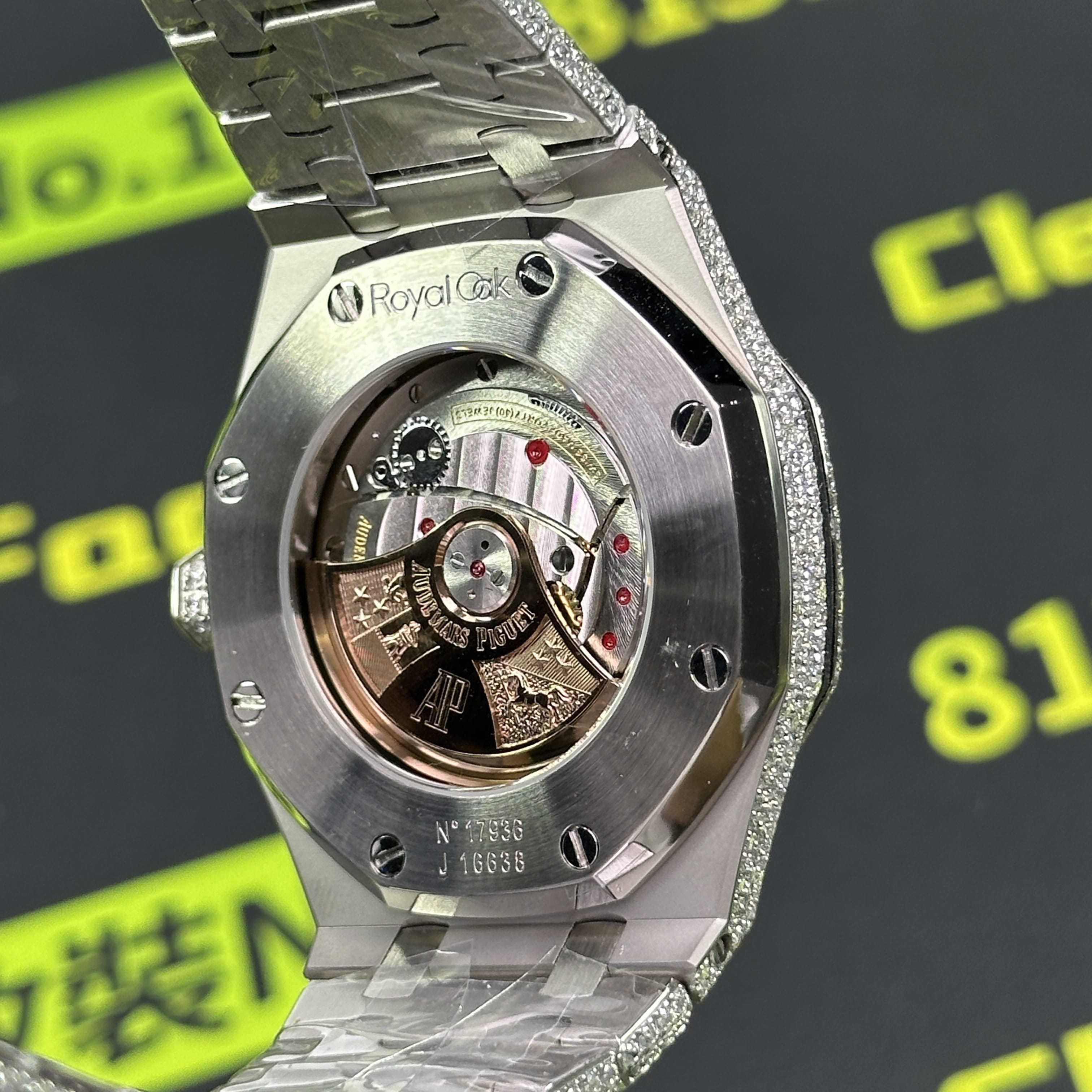 私人訂製高仿愛彼皇家橡樹AP15400滿天星,尺寸方面是41mm,外觀部分涉及到滿鑽的狀態,從圈口,錶冠,到錶帶,錶扣,側面部分均是採用了鑲鑽改裝升級進行改造.整體的視覺感非常飽滿,甚至毫不誇張的說,看時間已經不重要了,滿天星的盤面已經無法正常閱讀時間!常規AP八邊形圈口依舊保留,高仿AP改裝升級只不過是在原有的15400基礎錶款上進行純手工鑲嵌鑲鑽工藝,做到從外到內均是滿鑽.而私人訂製的需求是根據預算和要求進行訂製,沒有任何強制消費.