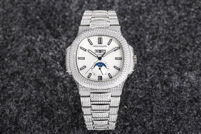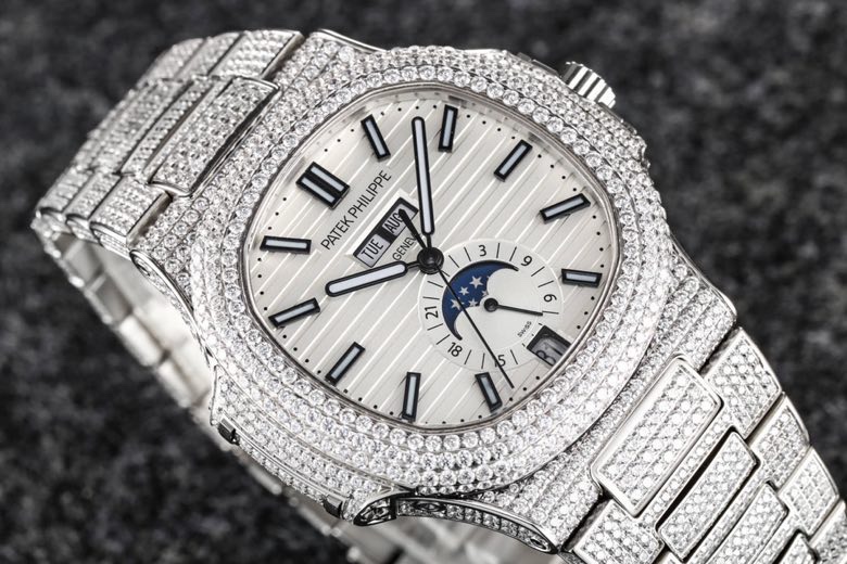 R8 Patek Philippe百達翡麗運動優雅滿天星系列5726/1A-014腕表(鸚鵡螺)316L精鋼鑲鑽錶鏈錶殼,將璀璨的鑽石鑲嵌入腕間時計,勾人心魂,給陽剛硬朗的運動風格新增了璀璨奪目的光芒,指針、時標刻度覆超强夜光在黑夜為您指引方向,錶盤鑲嵌施華洛世奇美鑽,附月相、日期顯示為你呈現滿天繁星, 搭載定制324 S QA LU 24H/303自動機械(背透機芯),為您的時間保駕護航,尺寸:40.5毫米。