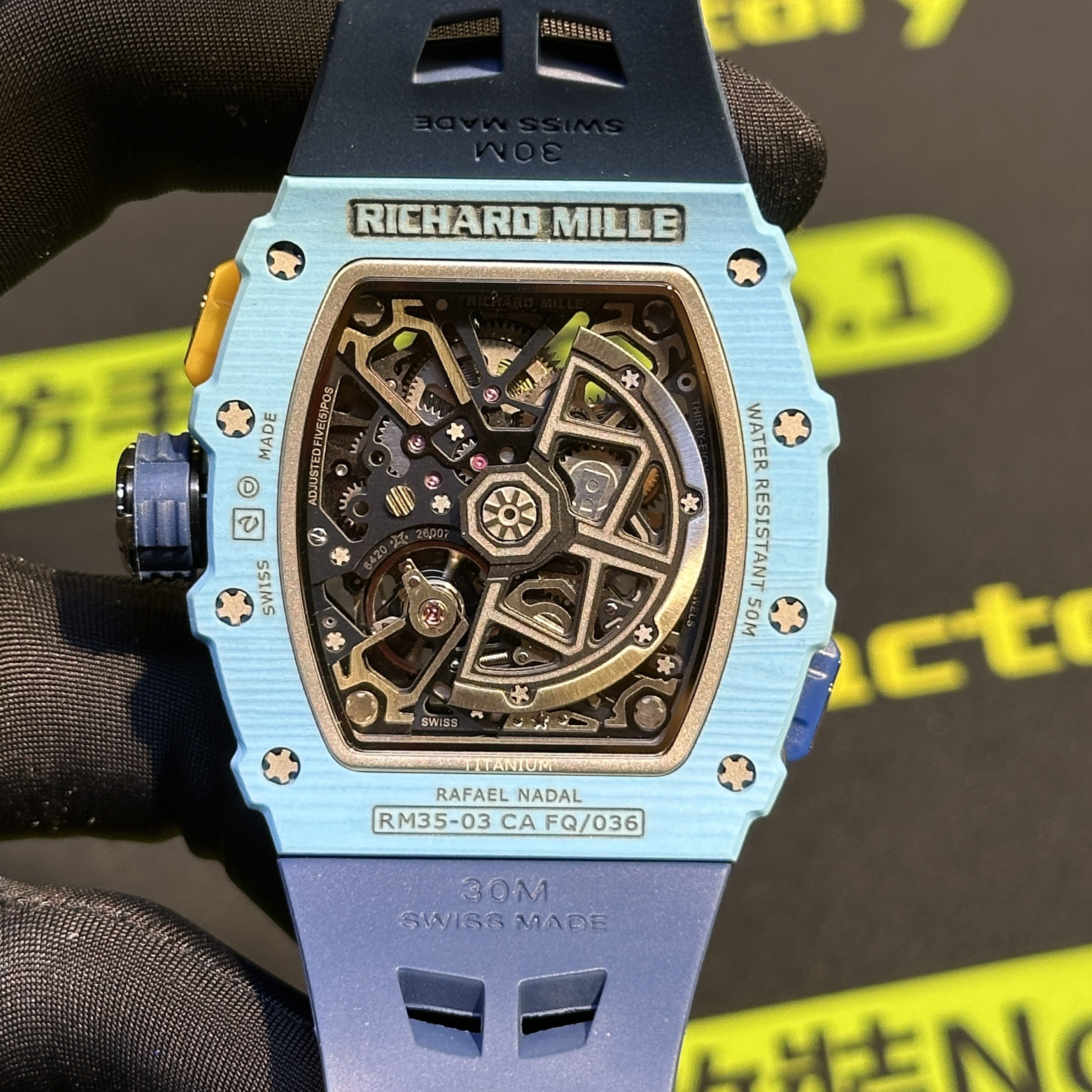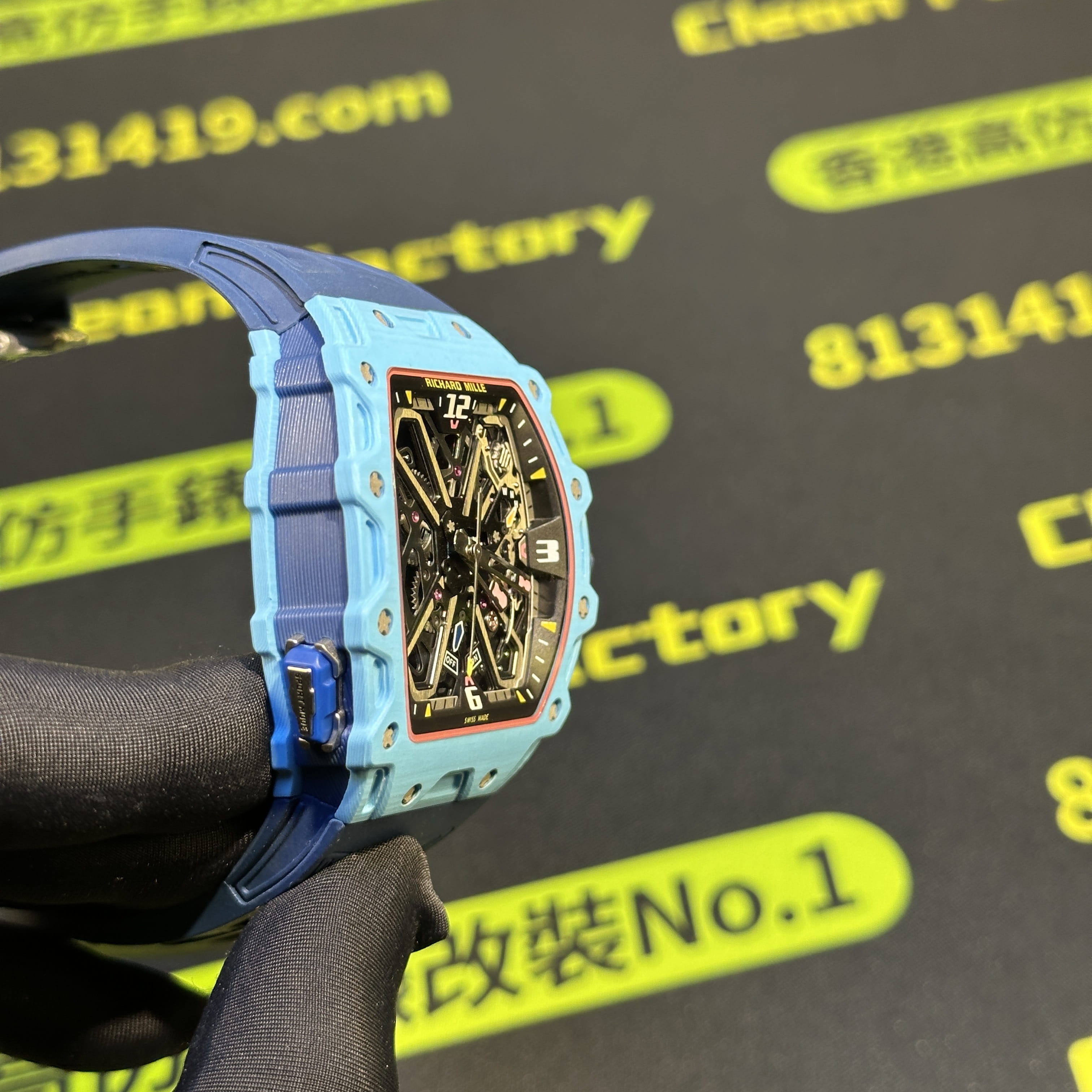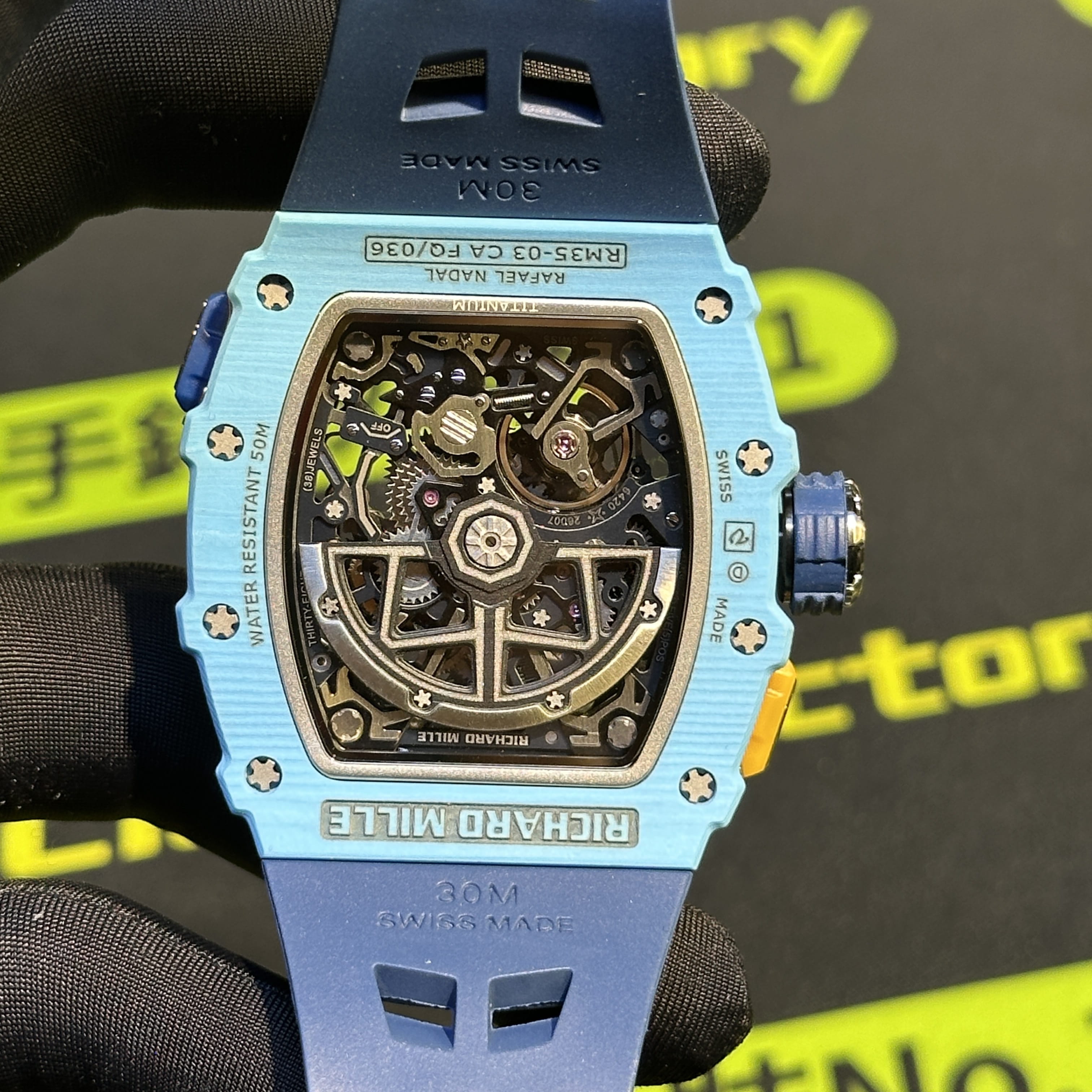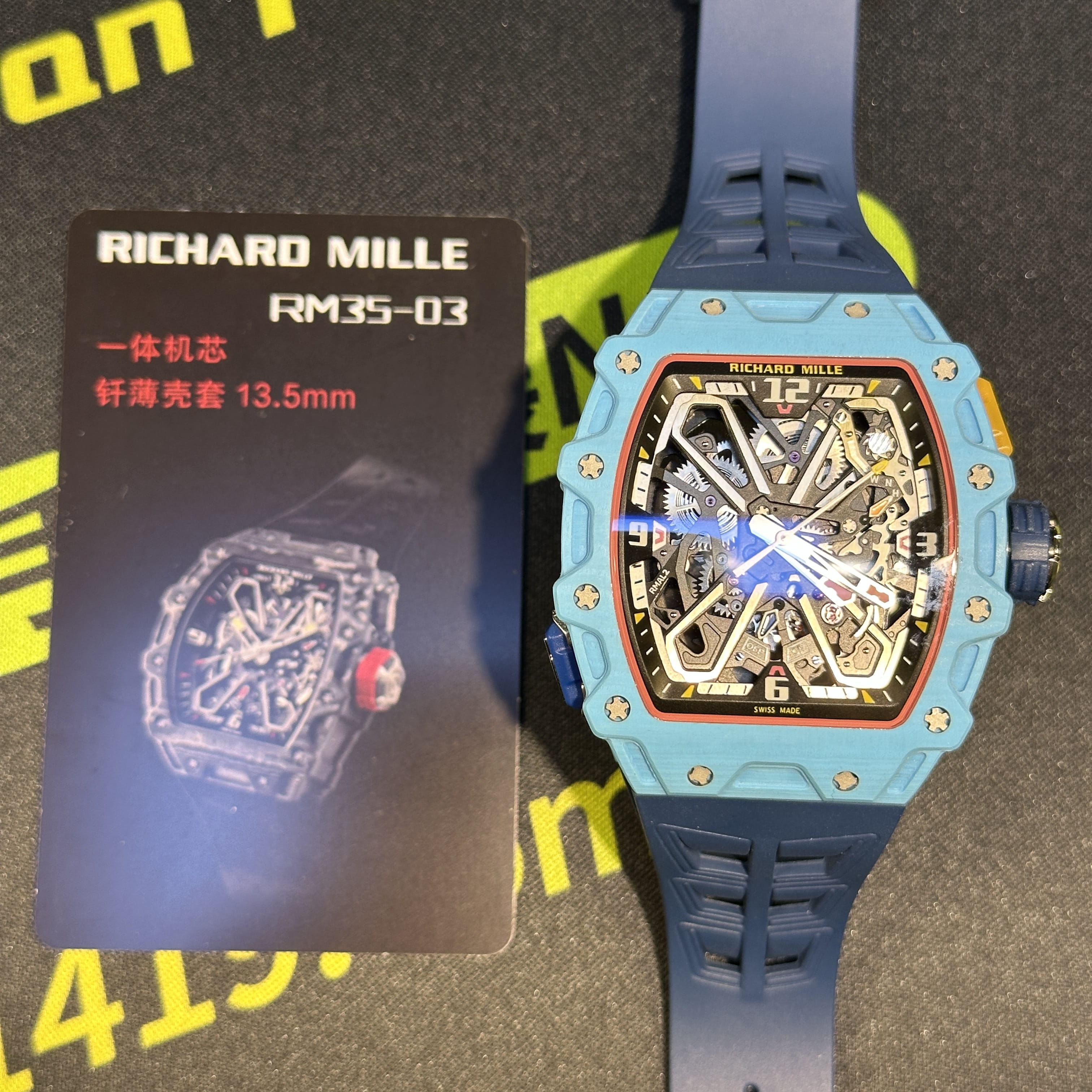 私人訂製高仿Richard Mille男士腕錶系列RM35-03蒂芙尼藍碳纖維款全新推出改裝升級版本,整錶尺寸49.95mm X 43.15mm.是Richard Mille官方在2025年發佈的最新款RM腕錶.目前在正版二級市場上的售價是高達600萬港幣左右.而針對高仿Richard Mille私人訂製版本的售價也是比較貴,主要是以改裝升級版本為例,使用的材質,機芯,配置,細節處理都是可以做到接近原版品質!當然對於一款以百萬港幣計算的高仿RM35-03而言,像真度達到90%以上已經是非常超A級別的品質.