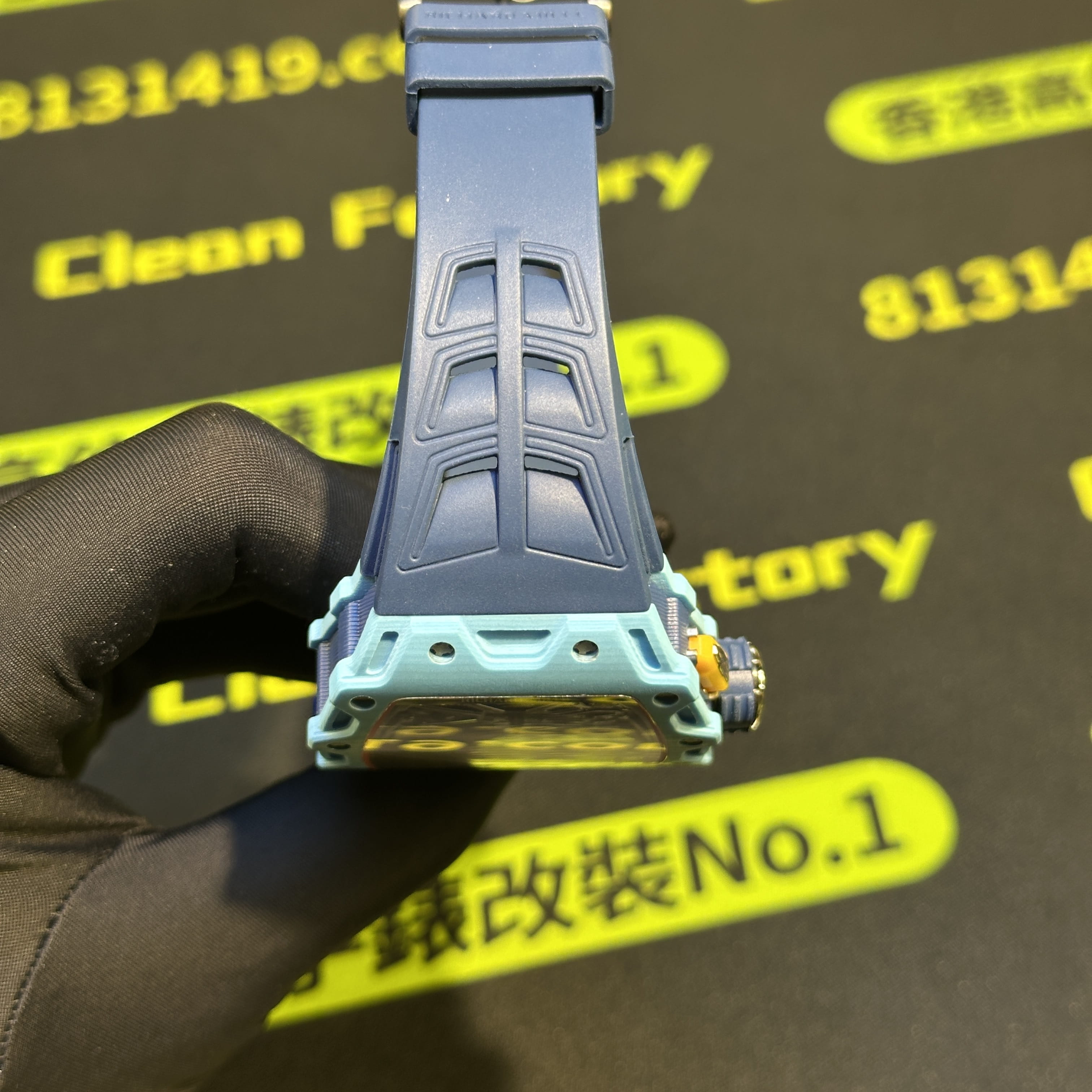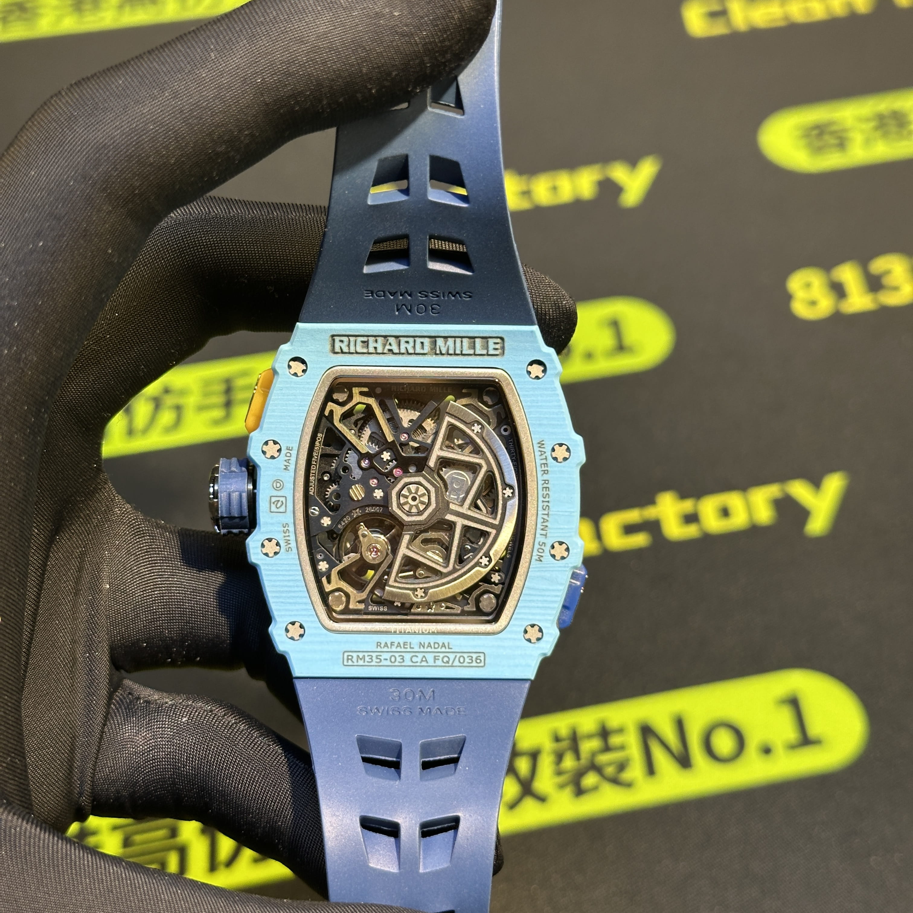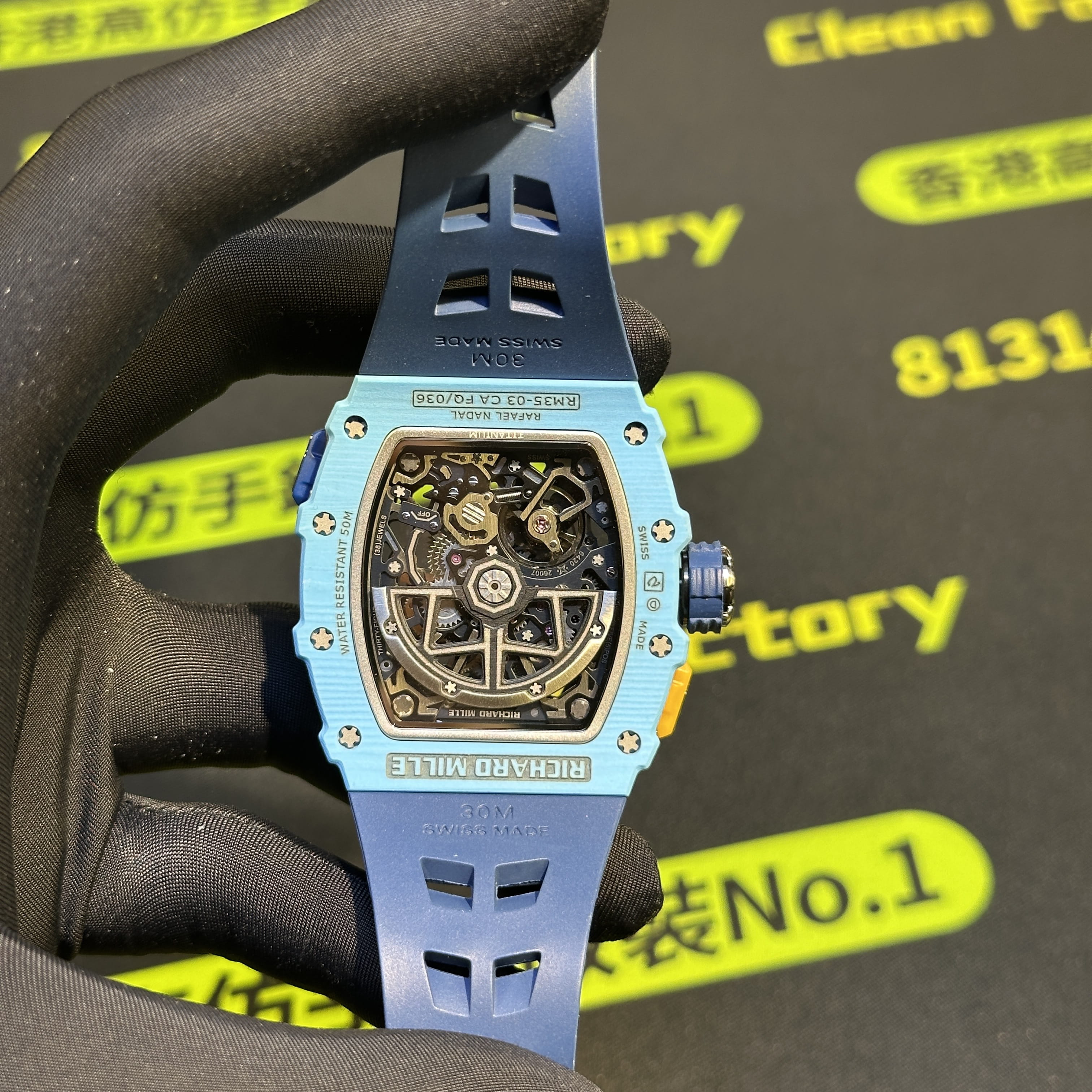 整錶克重96克,材質構造方面高仿RM私人訂製版本同步原裝正品一致使用碳纖維材質打造,蒂芙尼藍的錶盤外觀塑造出幾乎無色差的錶殼,搭配馬來西亞進口的純橡膠錶帶,刻度定型,尺寸,款式,長短均是達到原版品質需求.機芯配置方面是匹配了一體飛輪機械機械第三版本,錶盤內部的結構非常複雜,也導致了高仿RM35-03私人訂製改裝升級版本貴的主要原因,玻璃鏡片是使用了藍水晶高透玻璃,背透視覺感以及盤面機械運作動能效果非常飽滿.