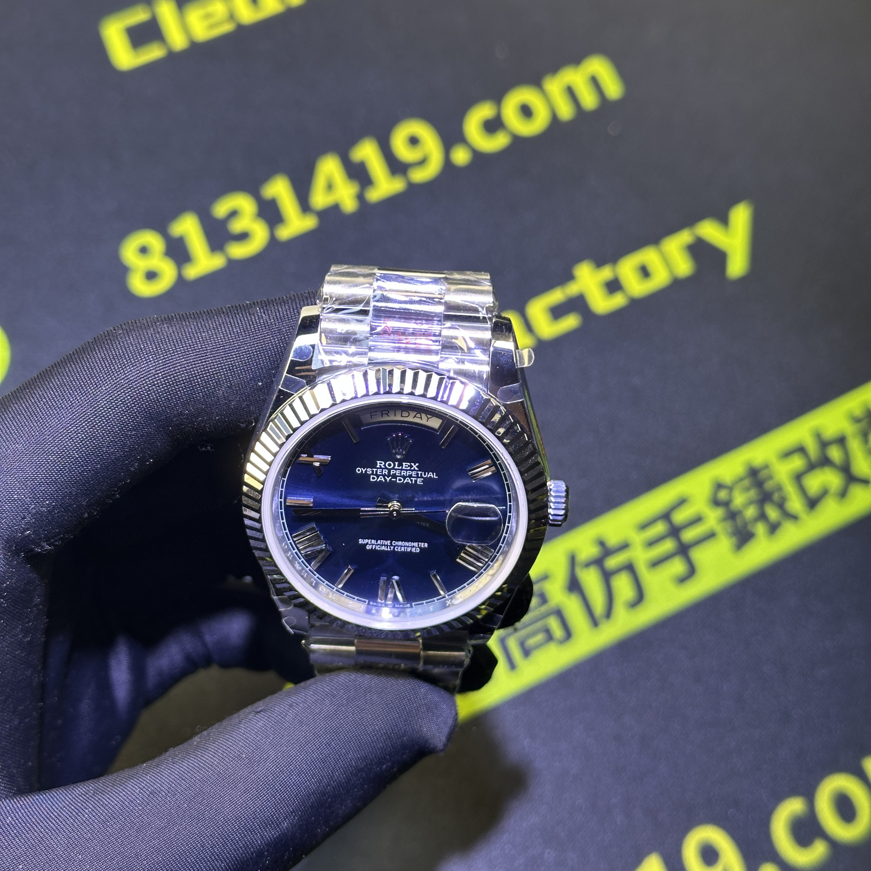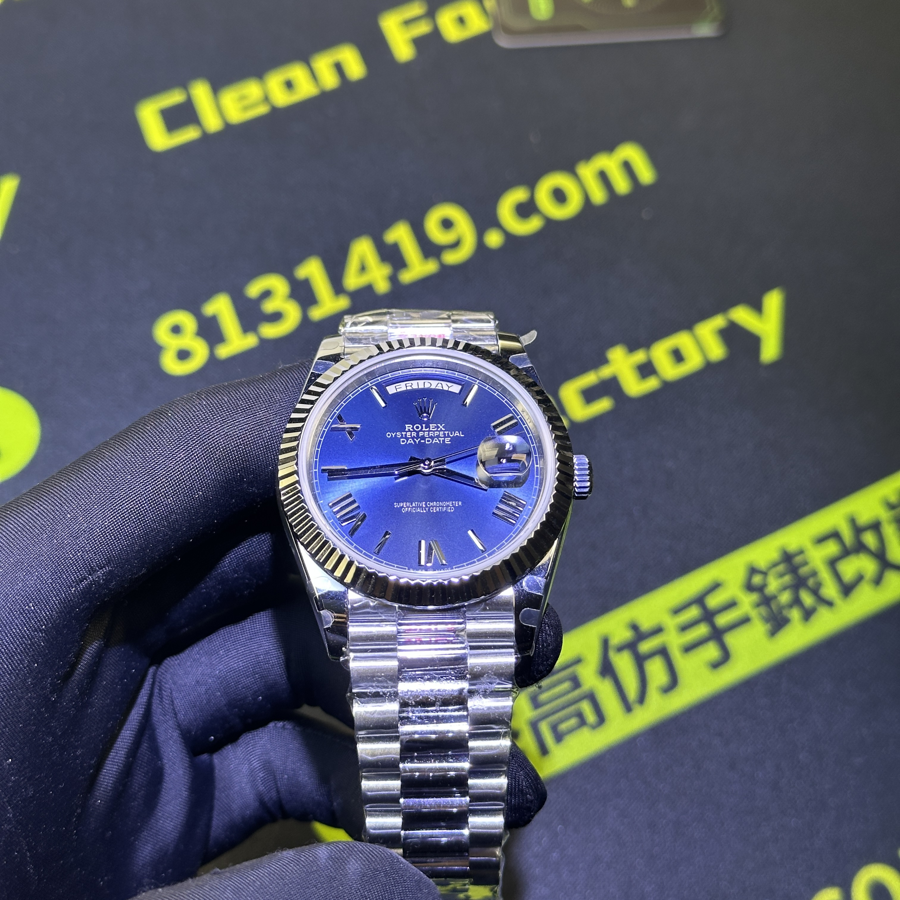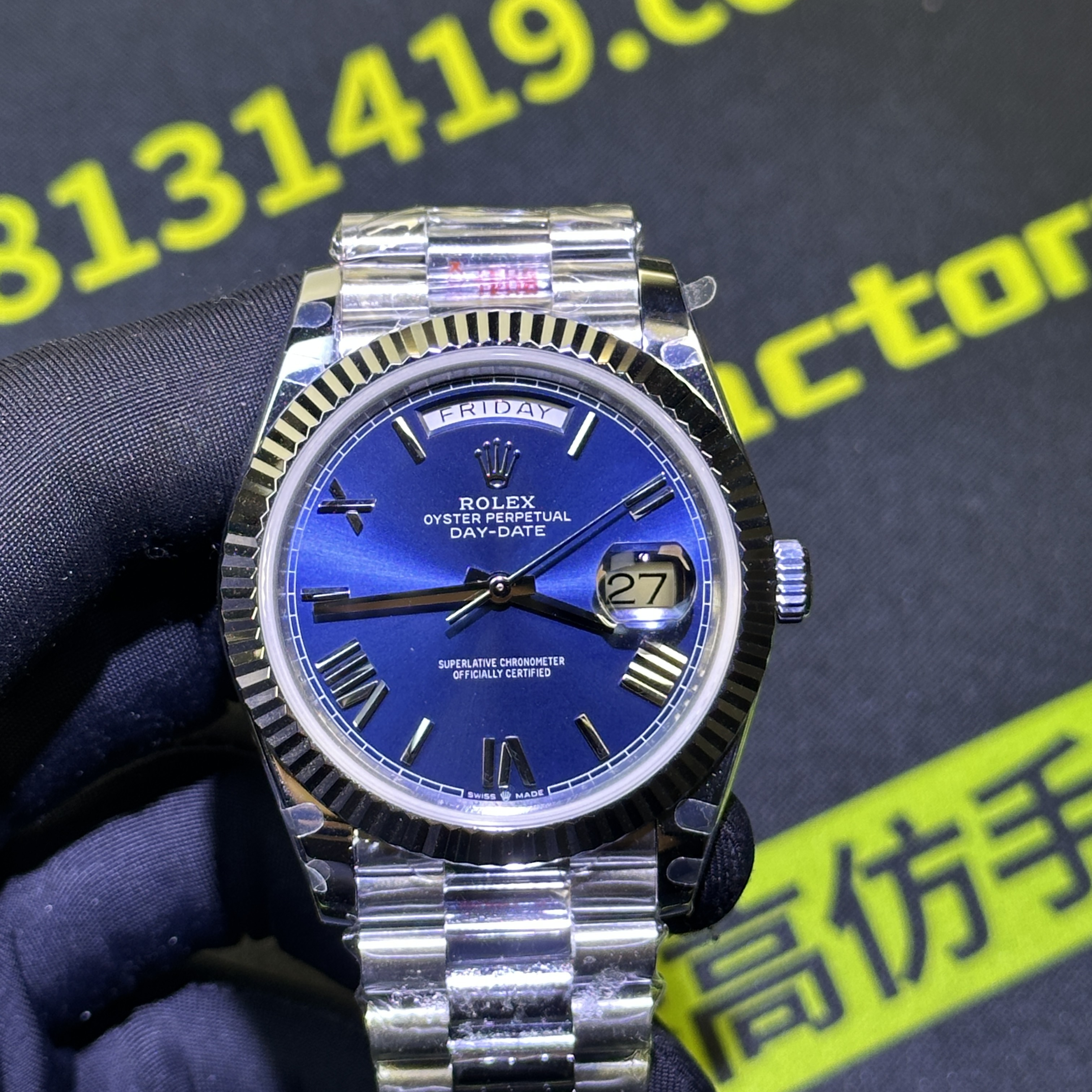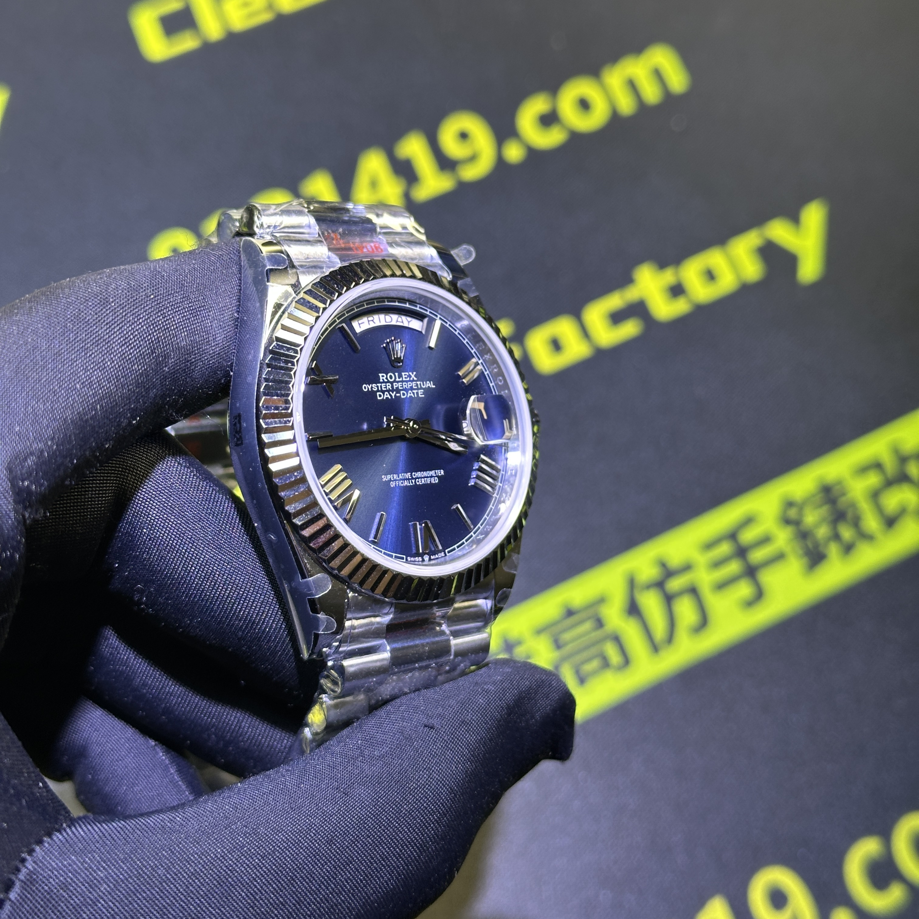 高仿DayDate系列228239藍盤對比原裝正品是否存在色差?通過實拍圖片可以實際性了解到私人訂製出品的DayDate V2版本盤面的放射紋理非常清晰,且在不同角度,不同環境,不同自然光呈現的色澤很難去區別到是否存在色差.包括印刷字面有明顯的立體感,而星期顯示功能以及日曆功能都是100%還原,而做到功能還原的需求自然是搭載了3255一體機芯.