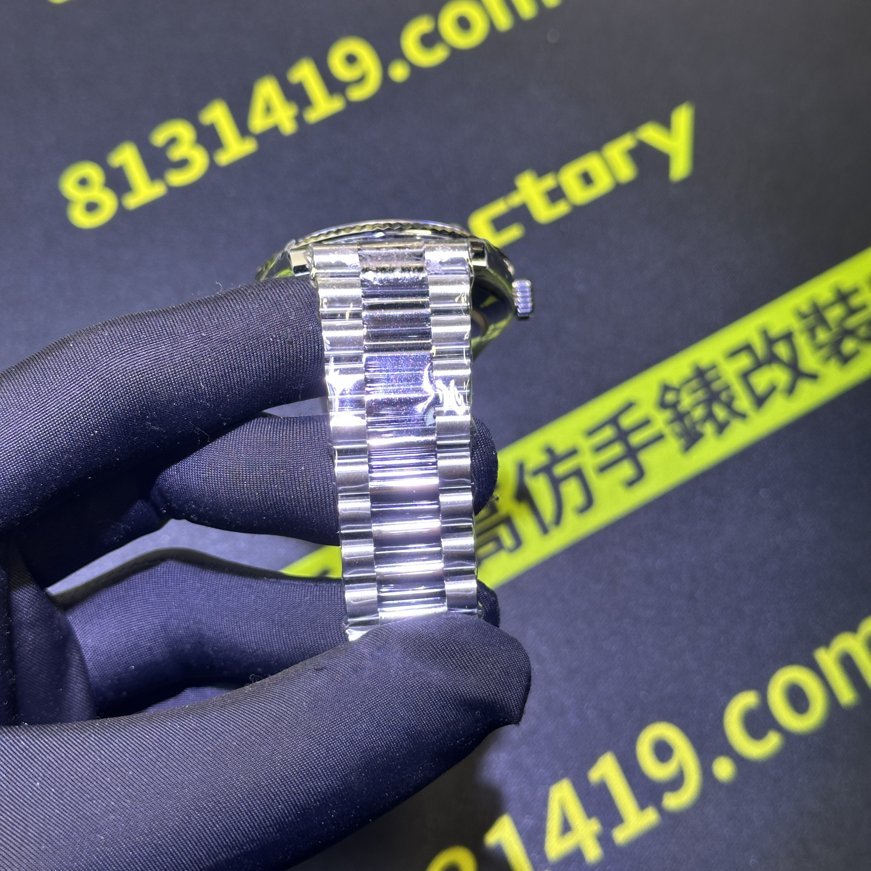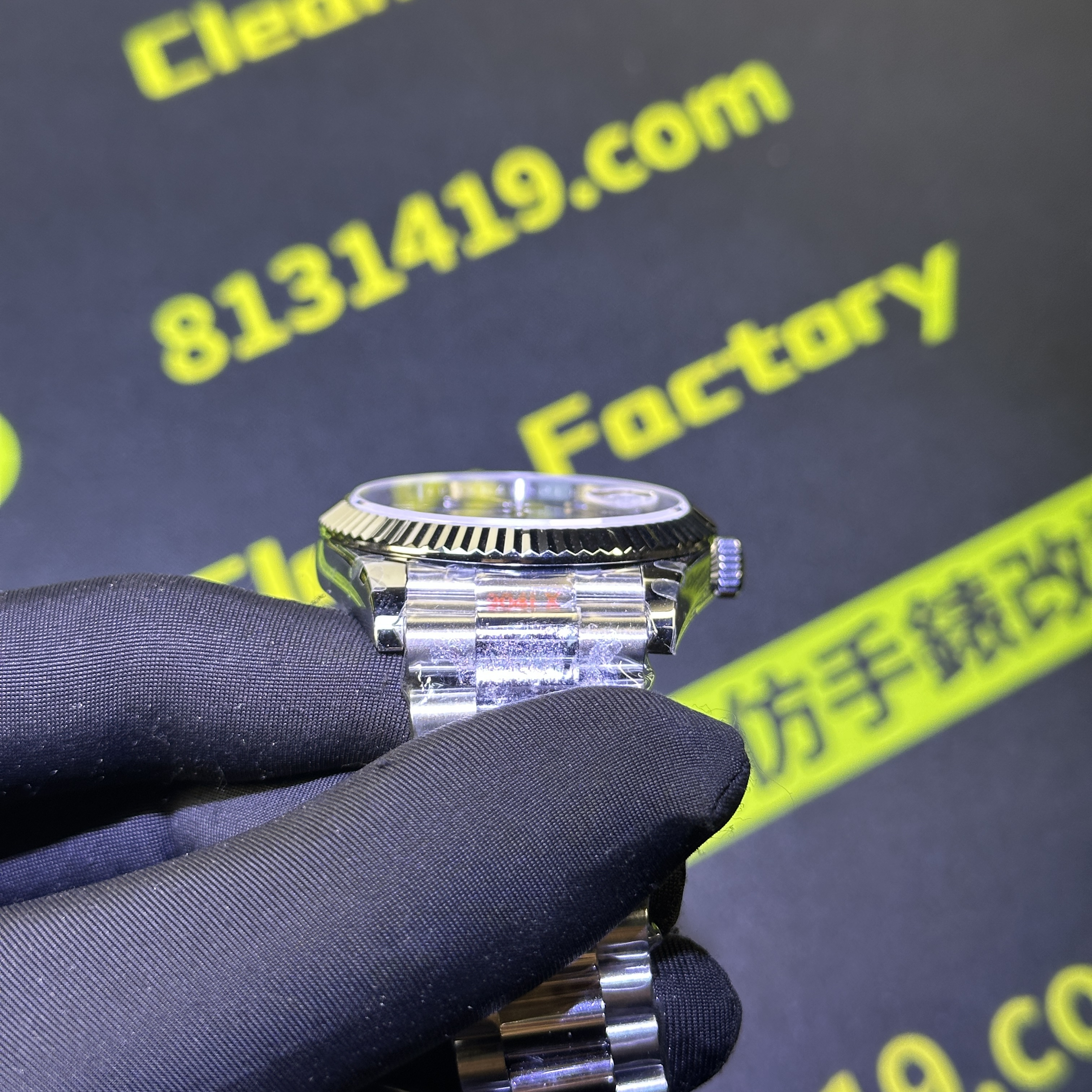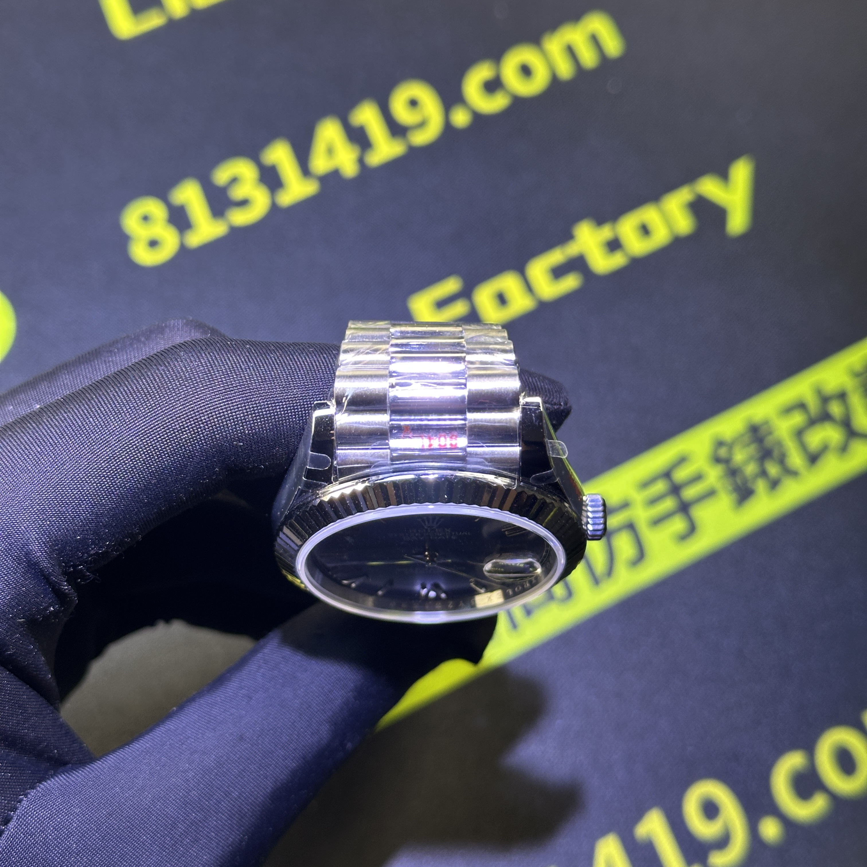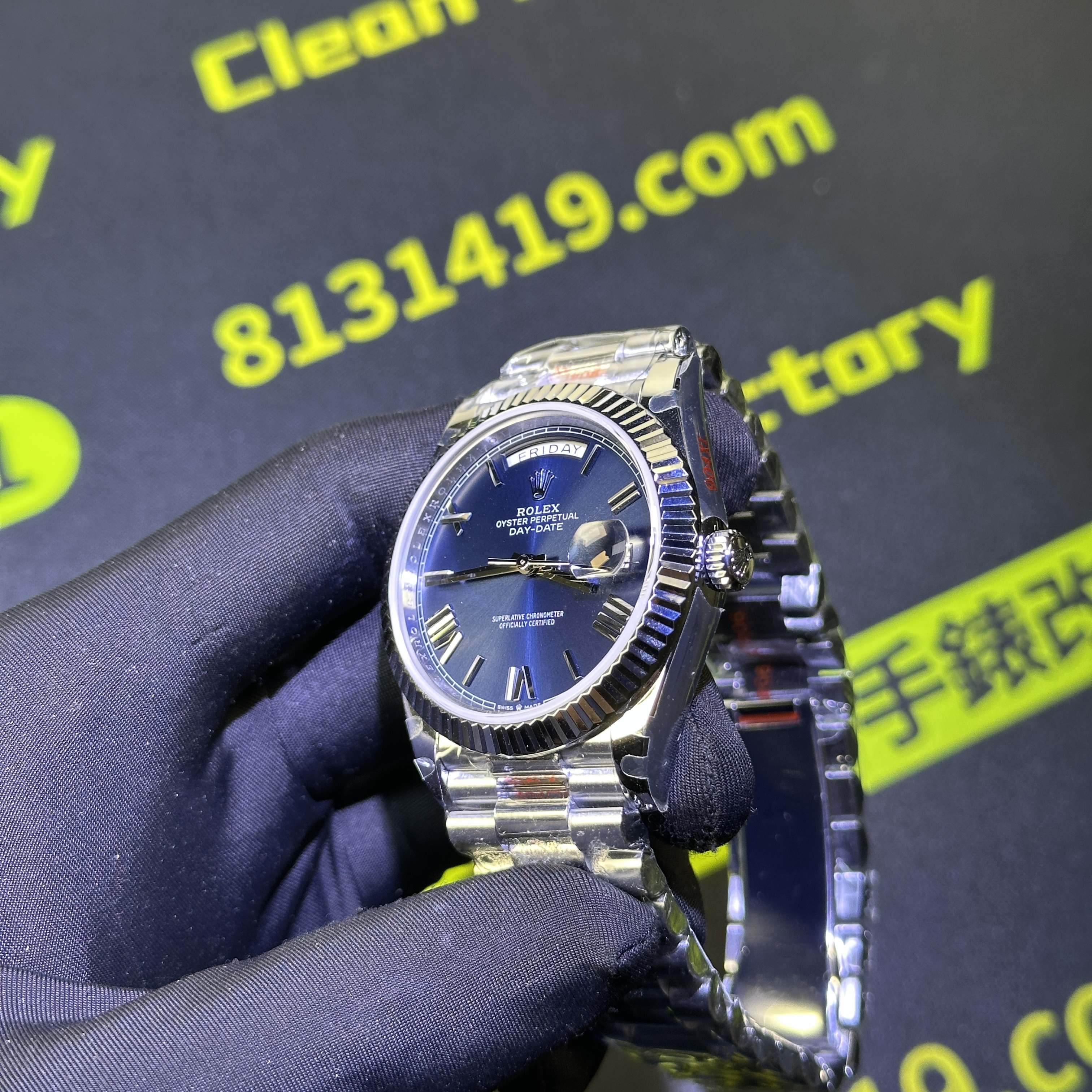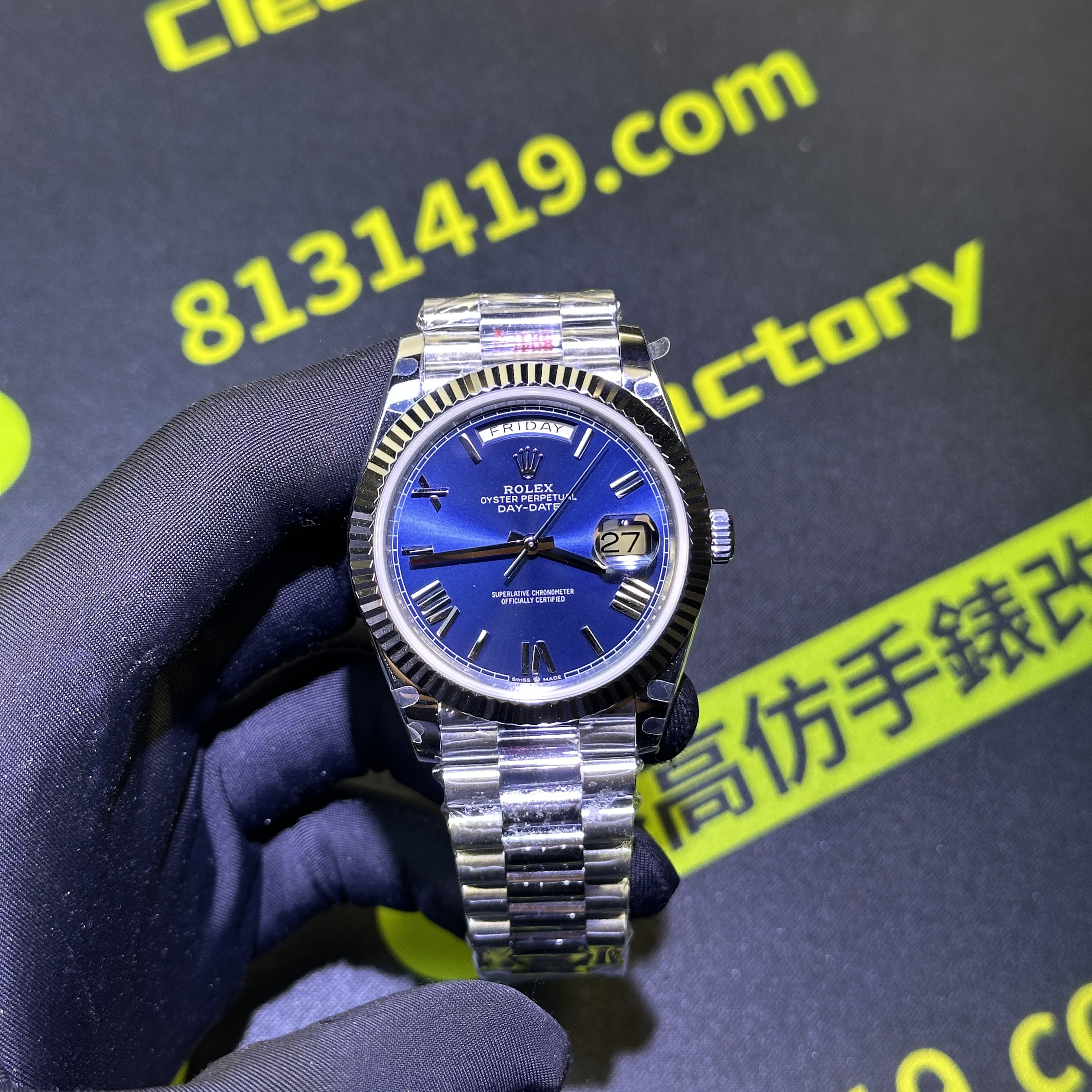 高仿DayDate系列228239藍盤對比原裝正品是否存在色差?通過實拍圖片可以實際性了解到私人訂製出品的DayDate V2版本盤面的放射紋理非常清晰,且在不同角度,不同環境,不同自然光呈現的色澤很難去區別到是否存在色差.包括印刷字面有明顯的立體感,而星期顯示功能以及日曆功能都是100%還原,而做到功能還原的需求自然是搭載了3255一體機芯.