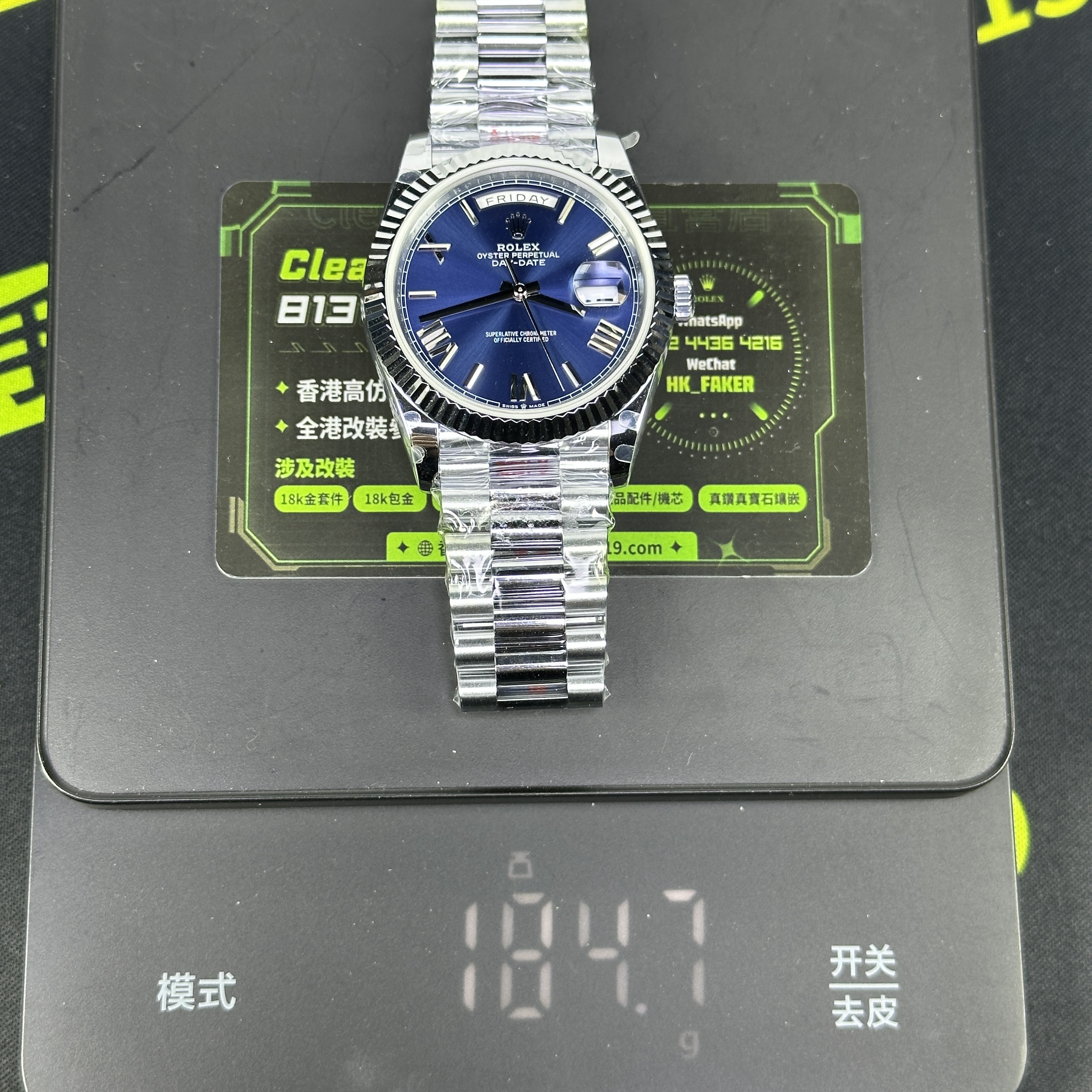 私人訂製高仿勞力士DayDate系列m228239-0007配重184克,現階段高仿市面上眾多廠家以及私人訂製針對K金高仿手錶都是做到配重,在重量方面接近或者是100%還原正品的克重比例.雖然184克對比原版200克以上還是存在一定的差異,但配重版本的高仿DD錶款相對於足重版本價錢會更加便宜,如果預算足夠可以選擇210~220克左右的足重版本高仿勞力士DayDate.