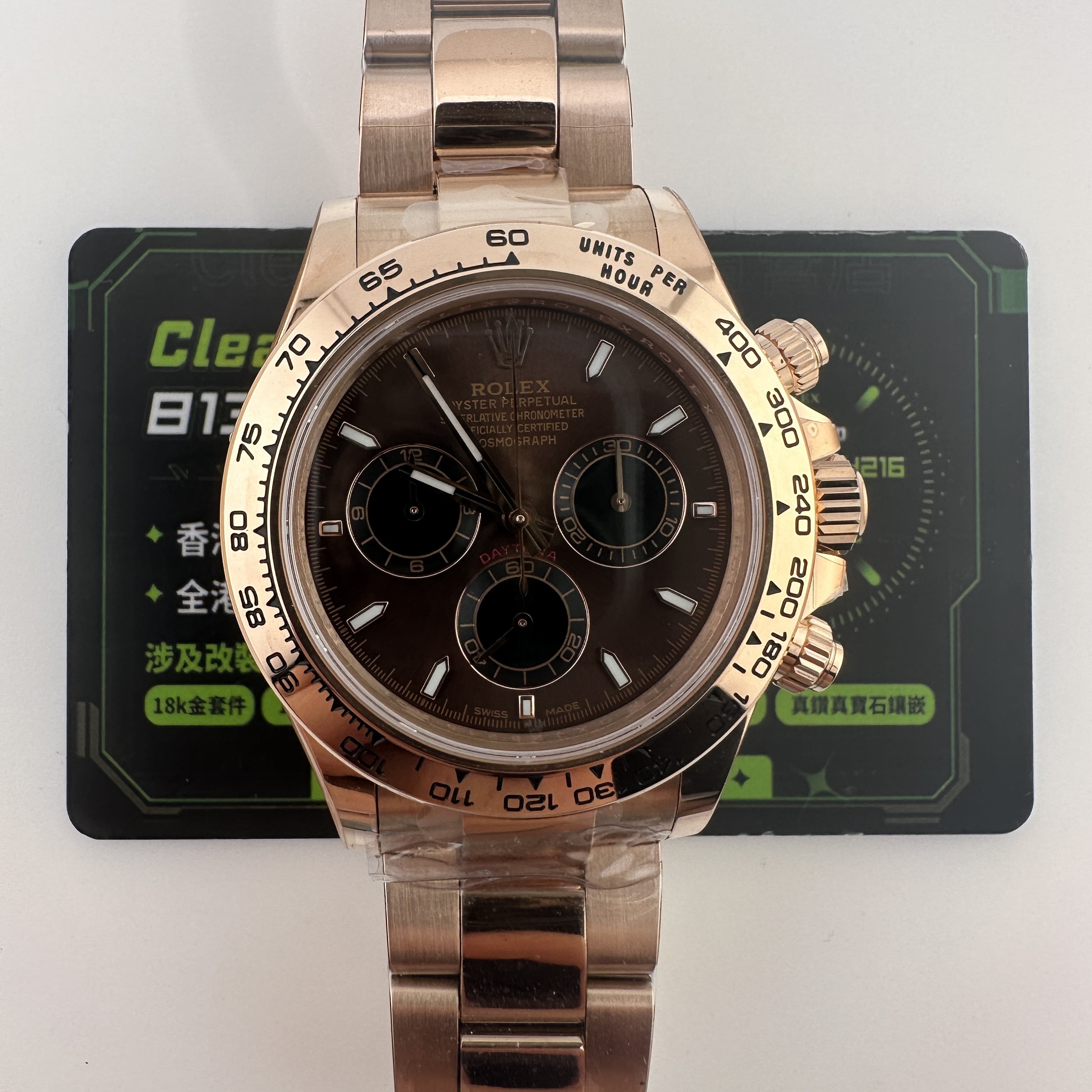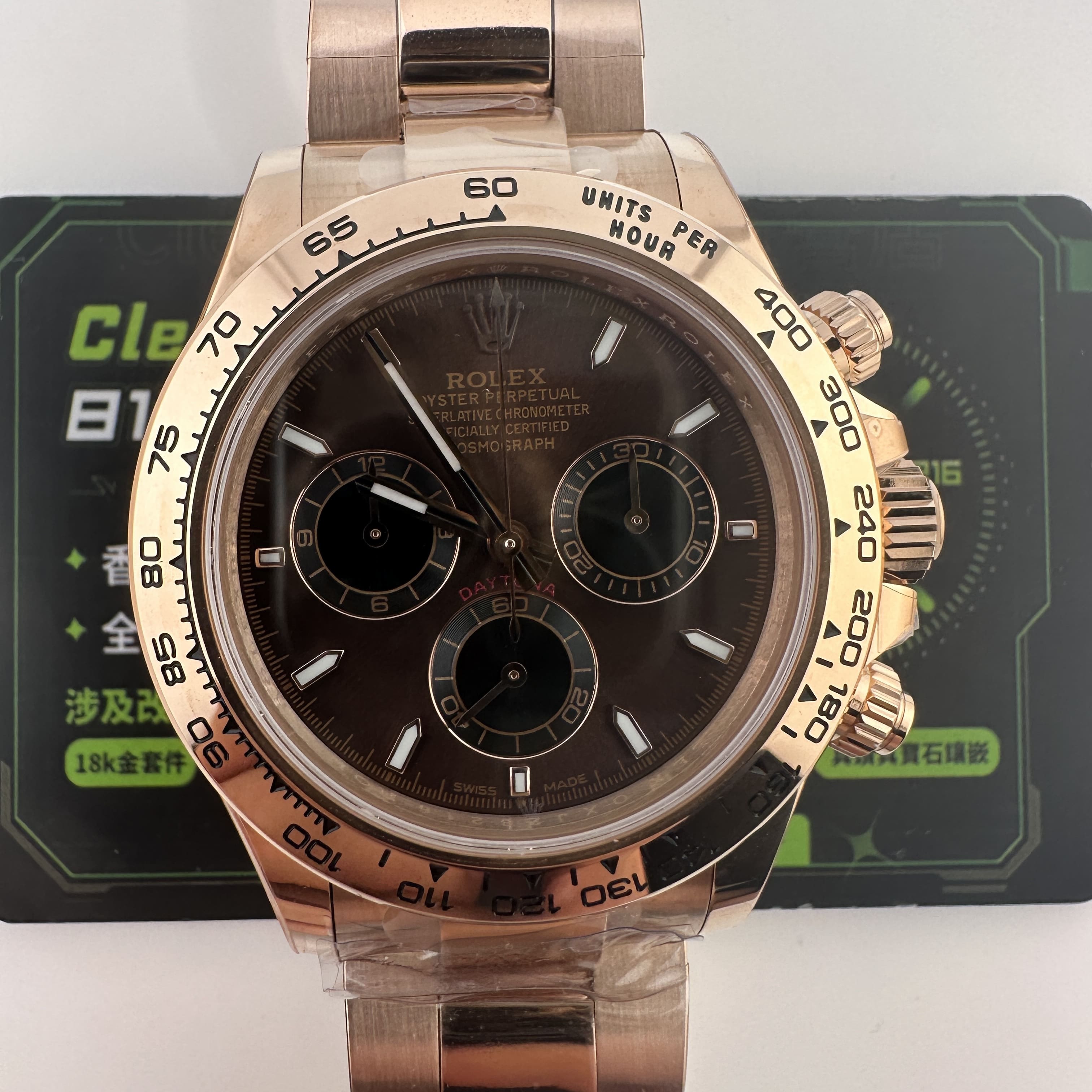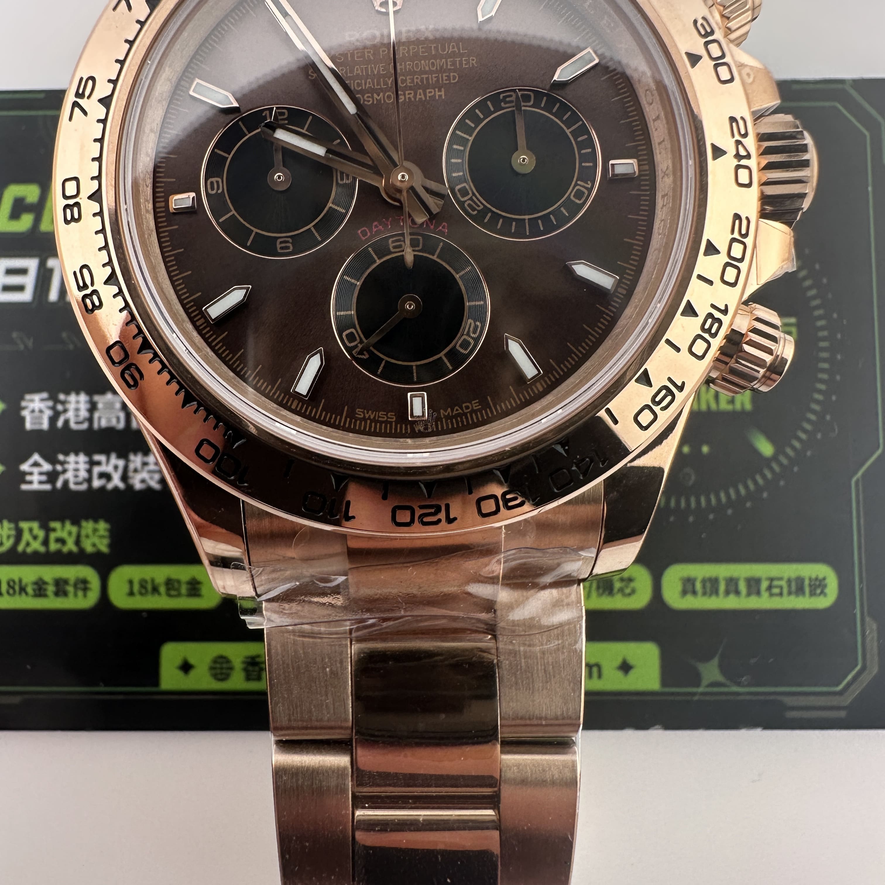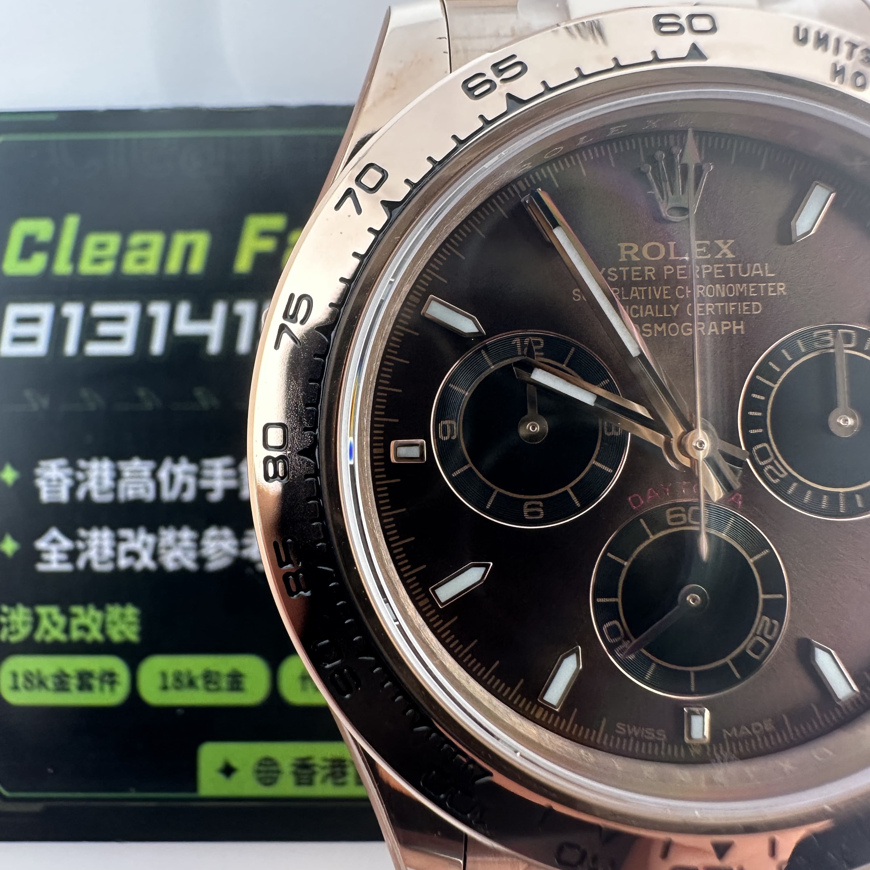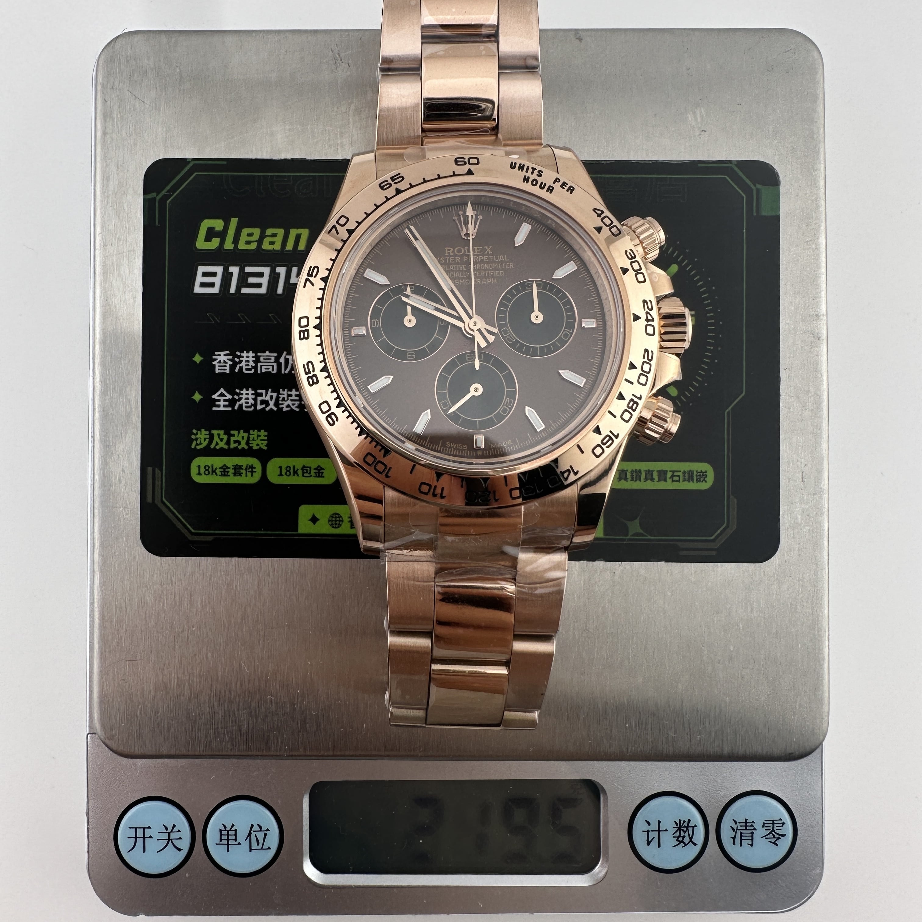 私人訂製高仿勞力士地通拿m126505-0013玫瑰金啡面足重219克,所謂的足重地通拿是針對K金版本對比中涉及到重量誤差,並且還是比較嚴重的狀態.以這一隻高仿地通拿126505金帶啡面為例,如果採用904L精鋼材質打造重量僅有145克左右,原裝正品重量是200克左右,已知足重版本地通拿已經做到了219克,已經是達到原版重量需求.整錶尺寸40mm,擁有重量是基礎,而針對錶盤內部涉及的細節處理,指針中軸構造,玻璃高度,機芯配置都能夠滿足改裝升級條件.