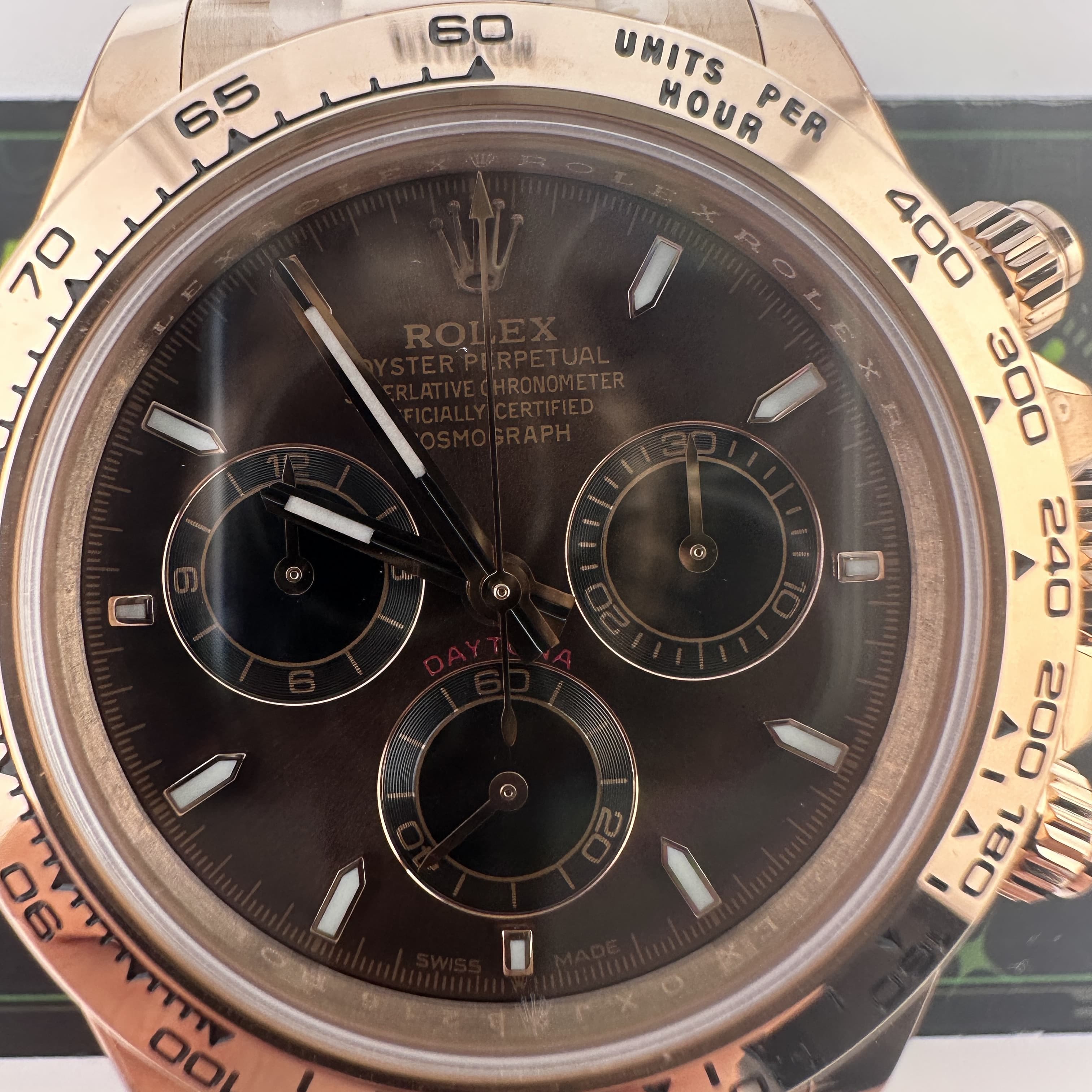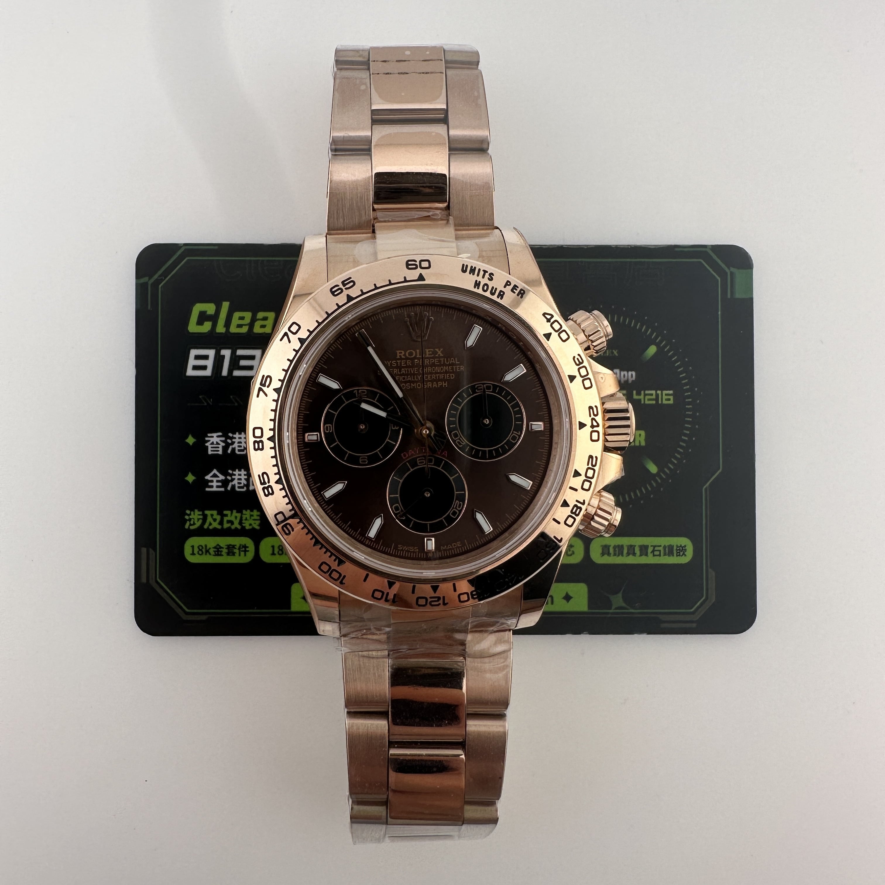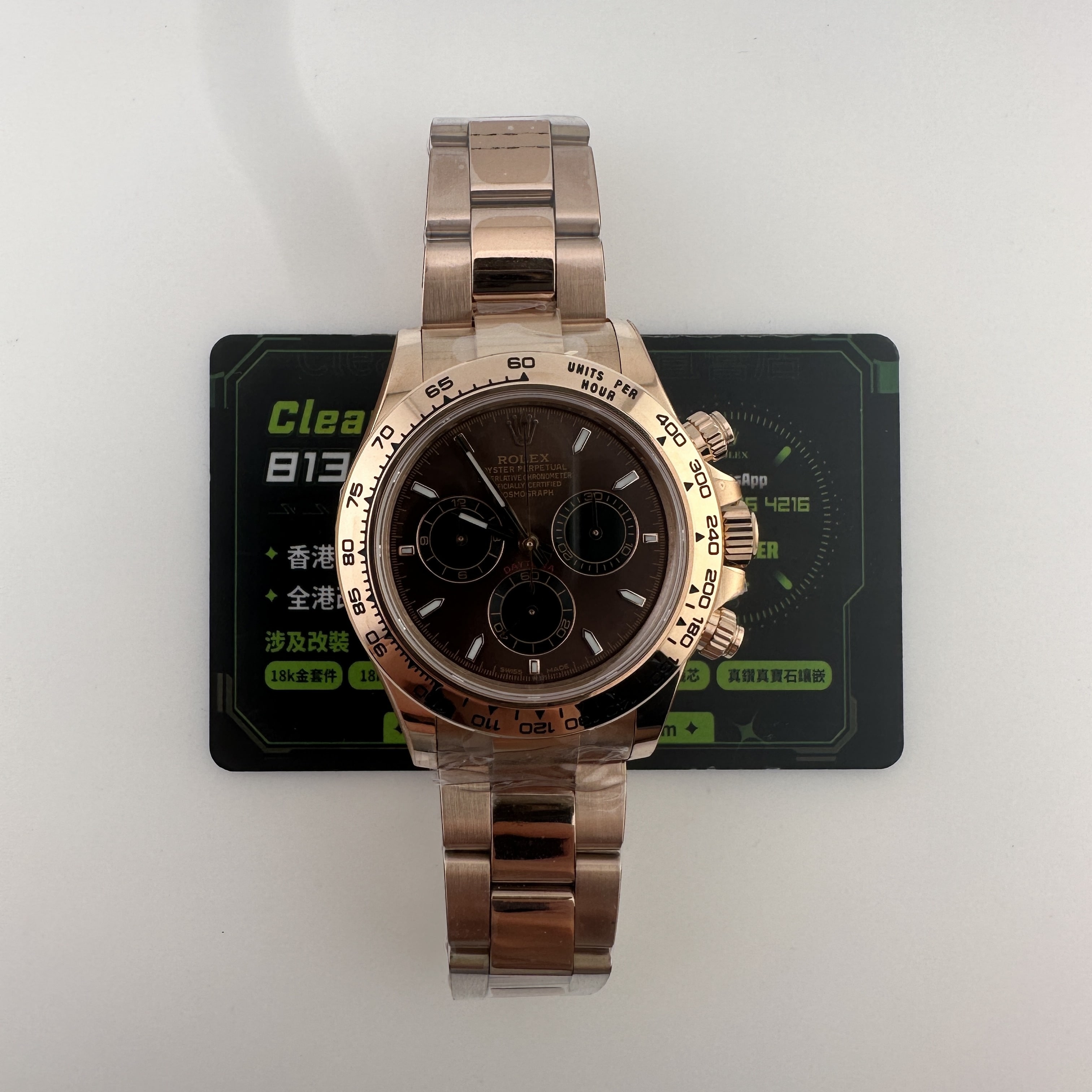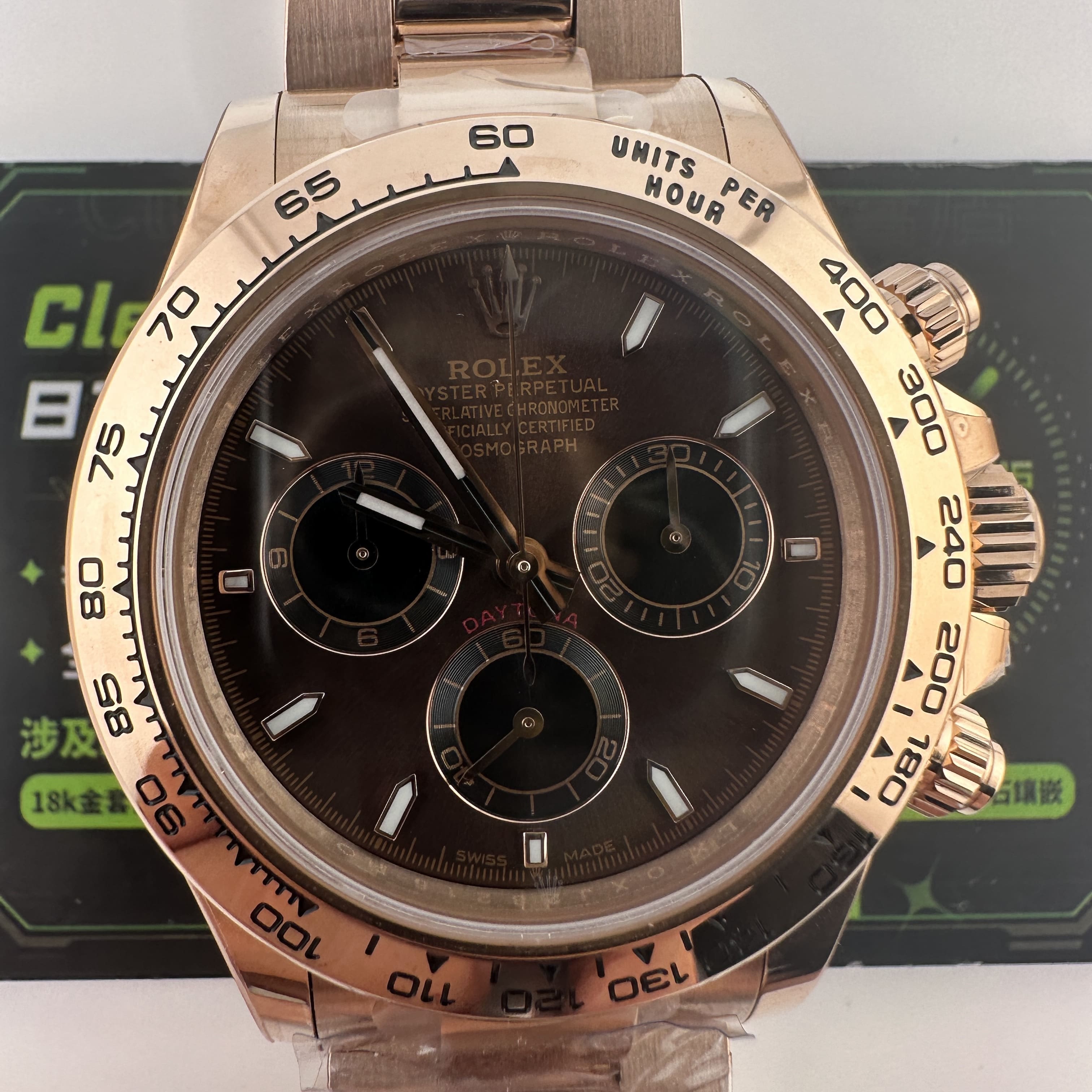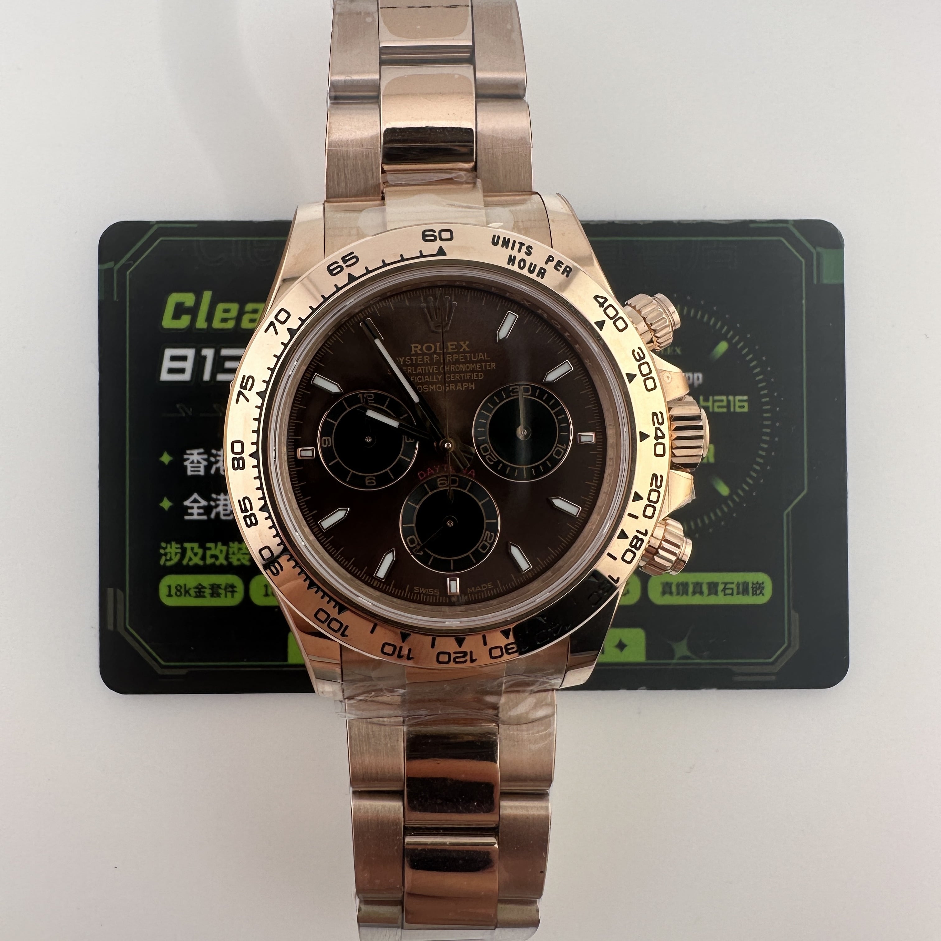 私人訂製高仿勞力士地通拿m126505-0013玫瑰金啡面足重219克,所謂的足重地通拿是針對K金版本對比中涉及到重量誤差,並且還是比較嚴重的狀態.以這一隻高仿地通拿126505金帶啡面為例,如果採用904L精鋼材質打造重量僅有145克左右,原裝正品重量是200克左右,已知足重版本地通拿已經做到了219克,已經是達到原版重量需求.整錶尺寸40mm,擁有重量是基礎,而針對錶盤內部涉及的細節處理,指針中軸構造,玻璃高度,機芯配置都能夠滿足改裝升級條件.