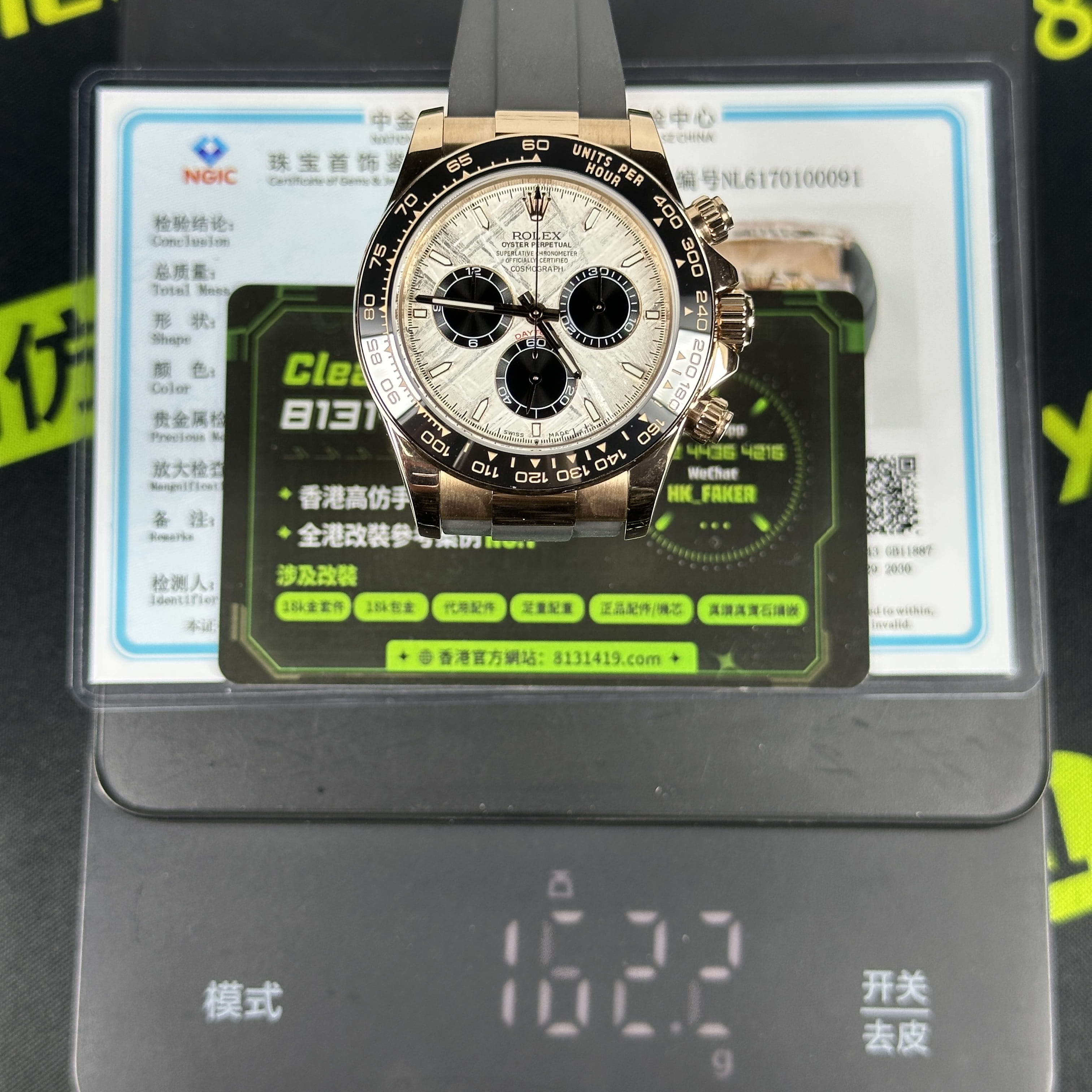 高仿地通拿126515玫瑰金隕石版本我們私人訂製使用了足重款式,材質部分是使用混合重金屬打造而成,整體的重量主要集中在錶殼部分.克重達到了162克左右,對比原裝正品的重量幾乎是99%還原,原版的重量也是在160克左右針對高仿地通拿隕石4131機芯版本我們所選用的盤面是以真隕石材質打造,通過實拍圖片可以了解到這張隕石盤面的構造,紋理紋路比較複雜交錯,沒有經過後期人工強行干預