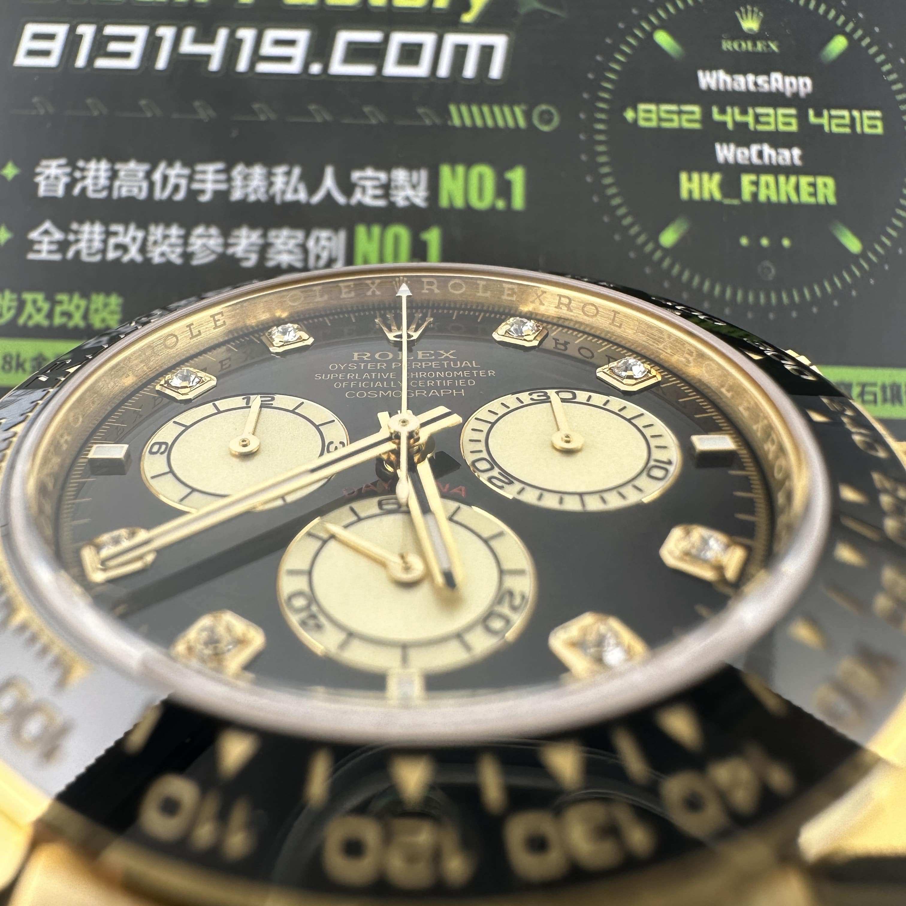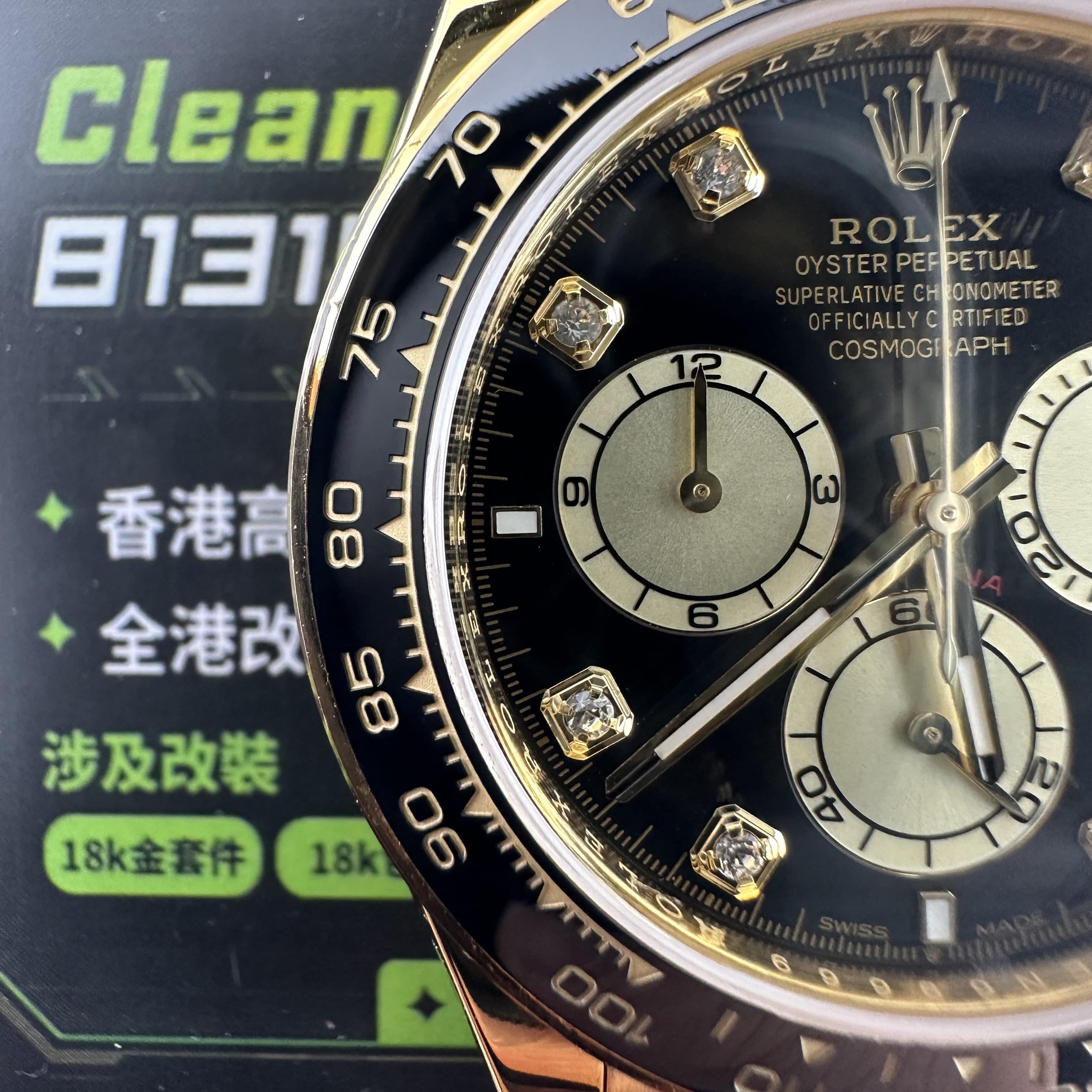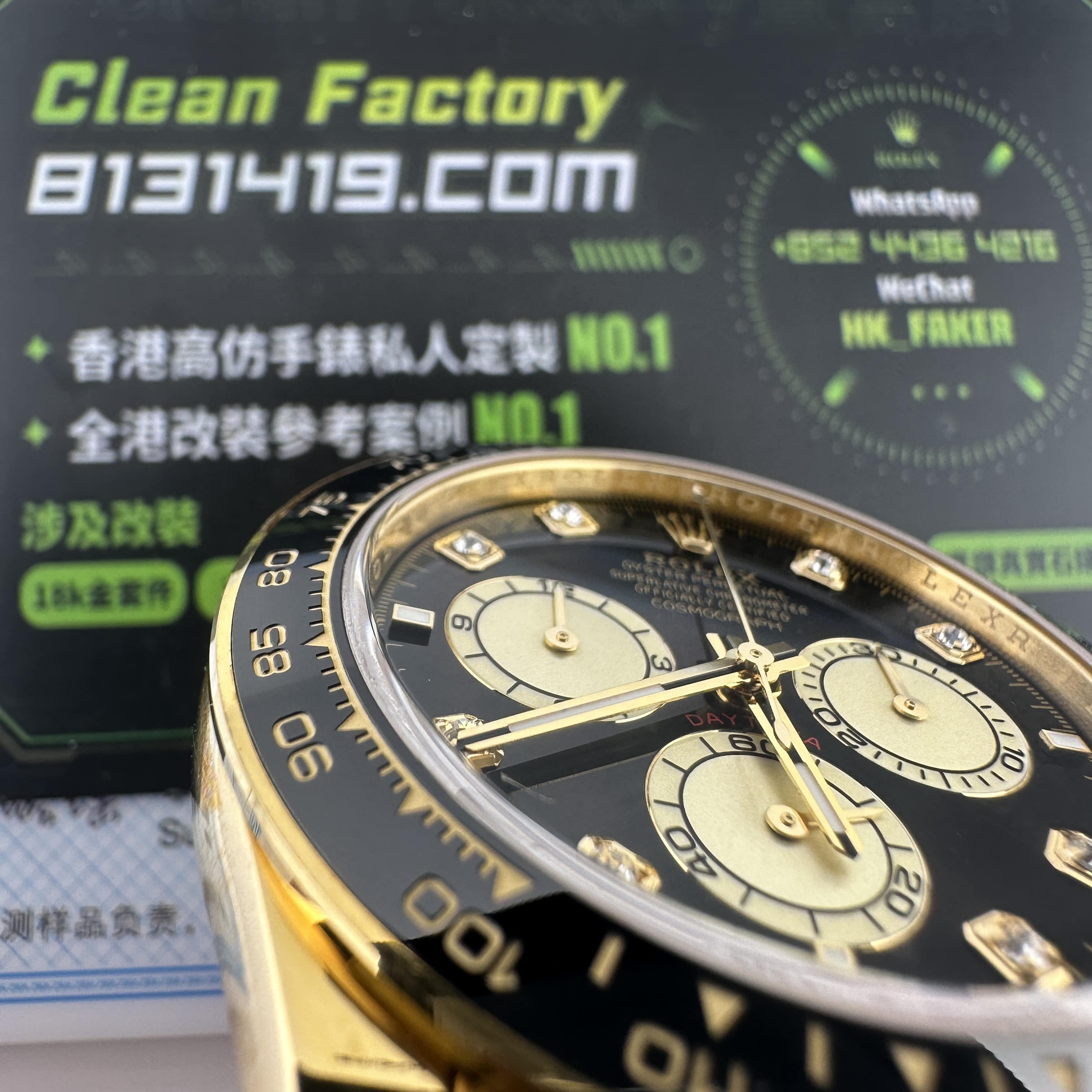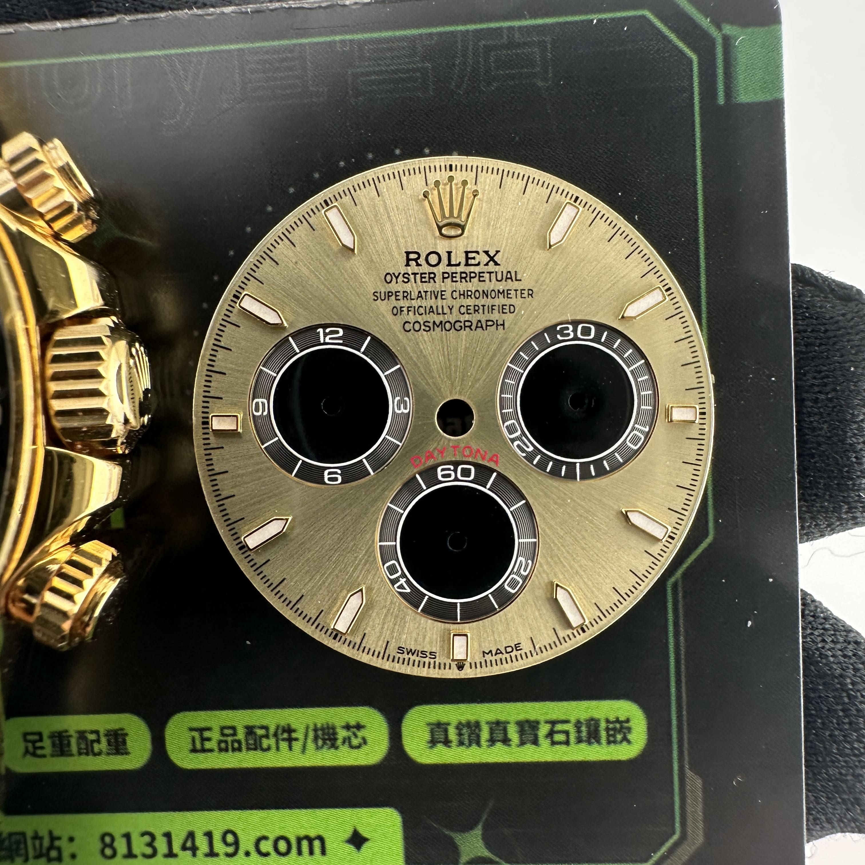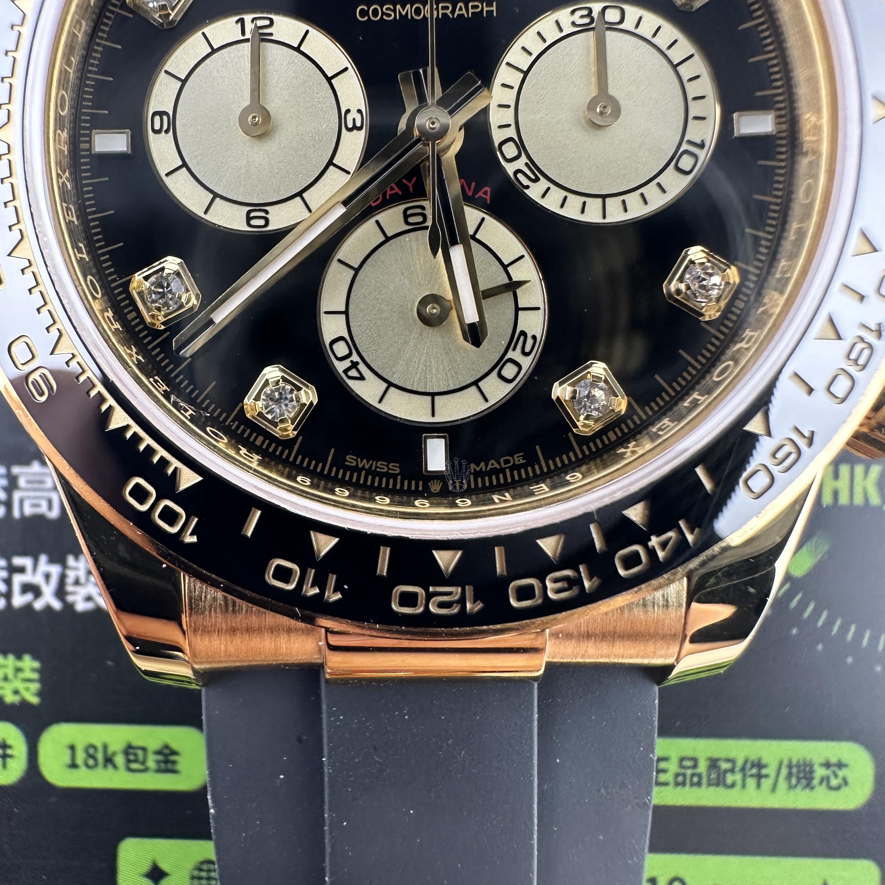 此次根據客戶的需求做到最接近原版品質,因此我們訂購了一張正版代用級別盤面,(並非正版錶盤)!對比專櫃版本幾乎是可以做到"無色差"狀態.包括時間刻度鑽丁材質都是後期使用到"人工培育鑽"材質,雖然造價成本比較貴,但實物的表現肯定是"一分價一分貨".由於拍攝環境以及燈光為問題,導致盤面無"放射紋"效果,但實際性我們通過聚焦的方式放大了錶盤內部細節處理,讓錶友們更加清楚了解到印刷字面,以及三個小圈的配色.