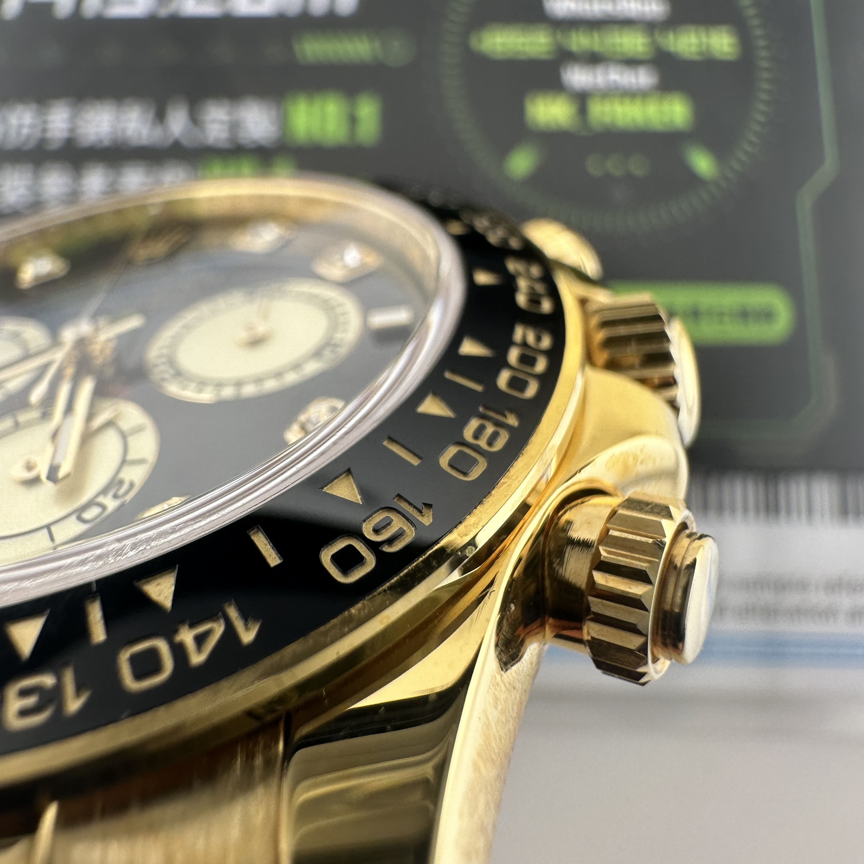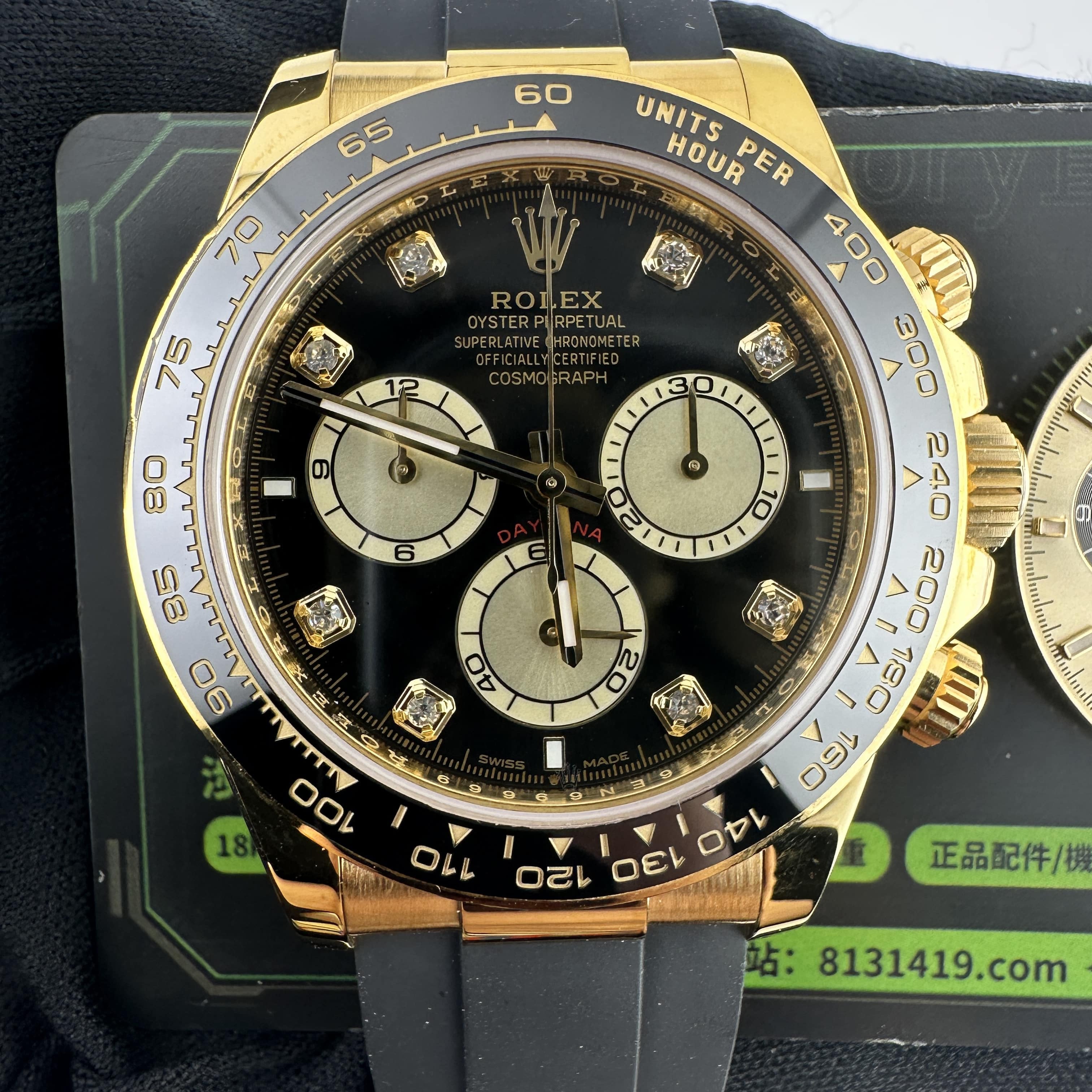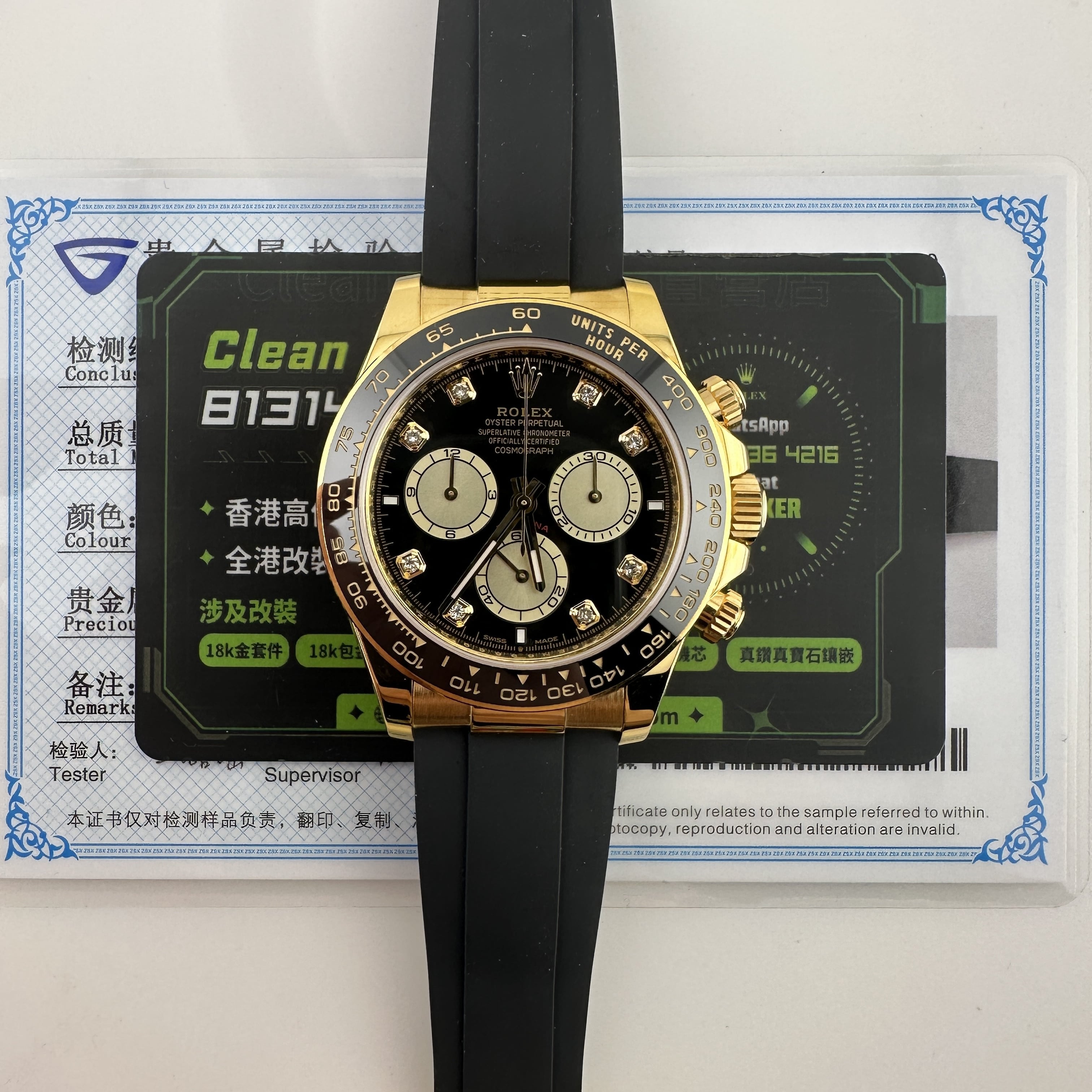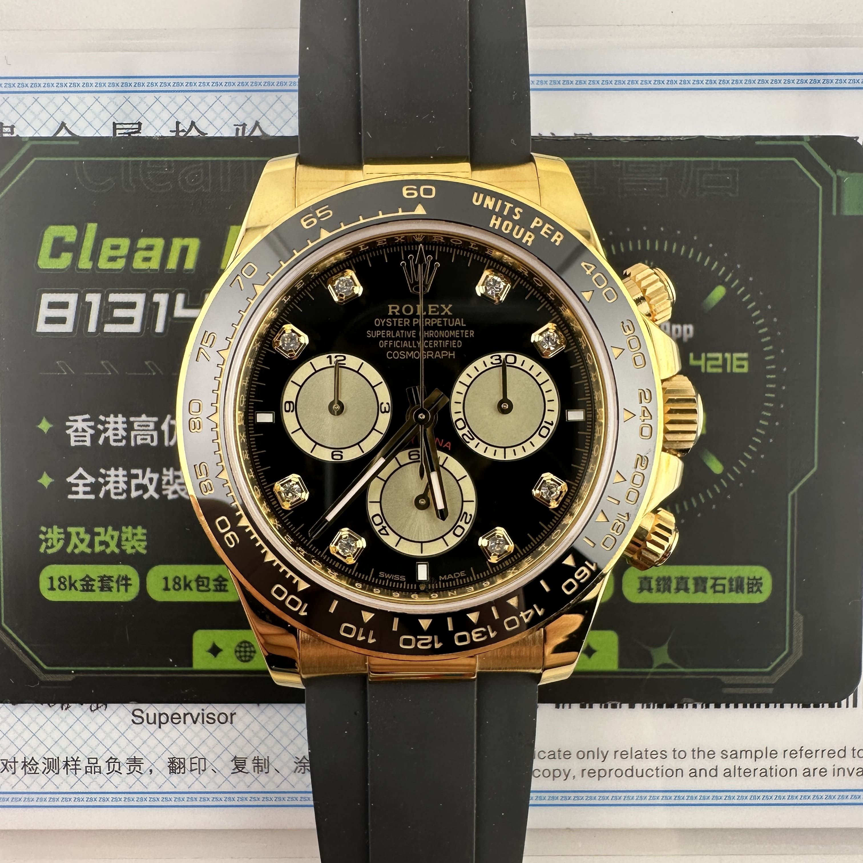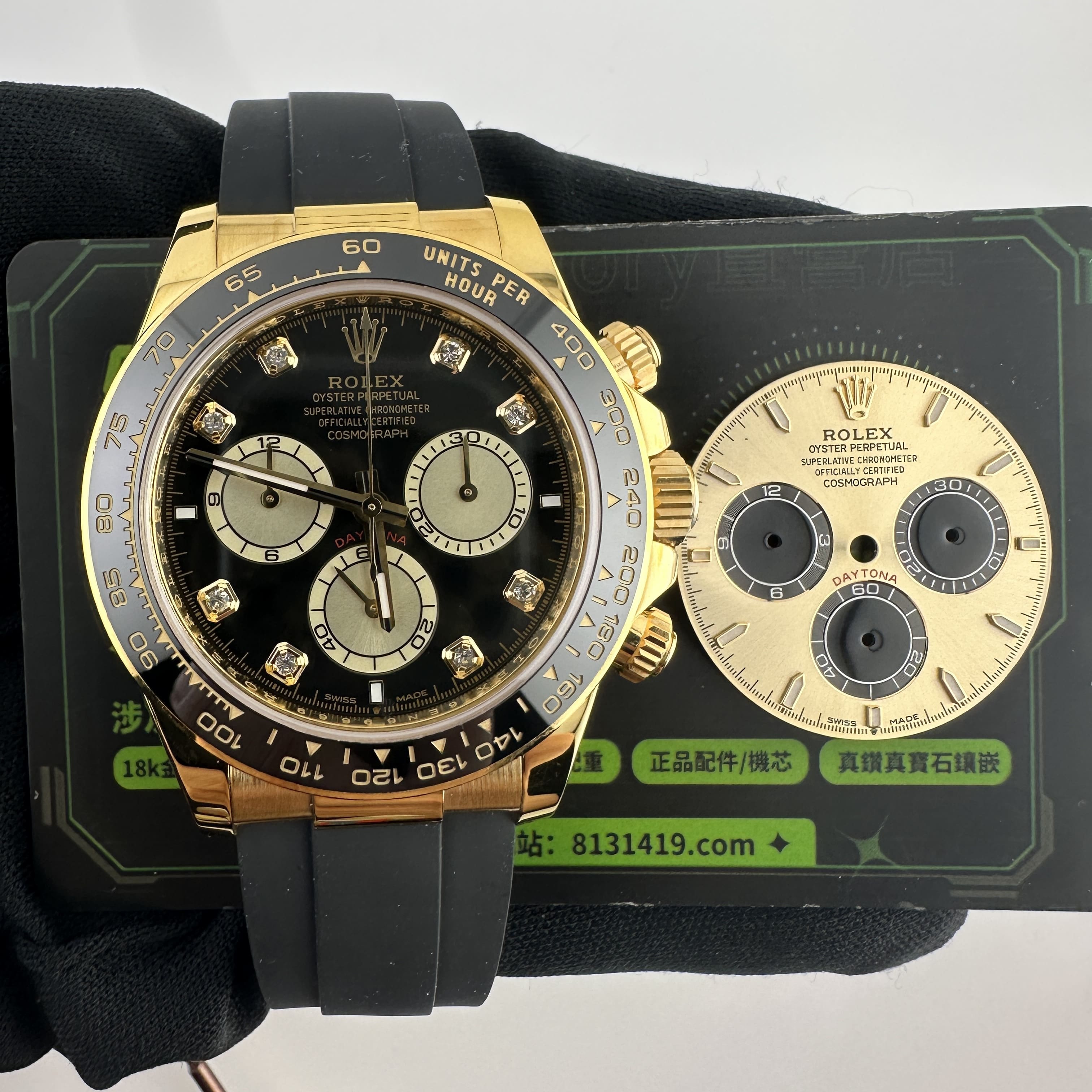 此次根據客戶的需求做到最接近原版品質,因此我們訂購了一張正版代用級別盤面,(並非正版錶盤)!對比專櫃版本幾乎是可以做到"無色差"狀態.包括時間刻度鑽丁材質都是後期使用到"人工培育鑽"材質,雖然造價成本比較貴,但實物的表現肯定是"一分價一分貨".由於拍攝環境以及燈光為問題,導致盤面無"放射紋"效果,但實際性我們通過聚焦的方式放大了錶盤內部細節處理,讓錶友們更加清楚了解到印刷字面,以及三個小圈的配色.
