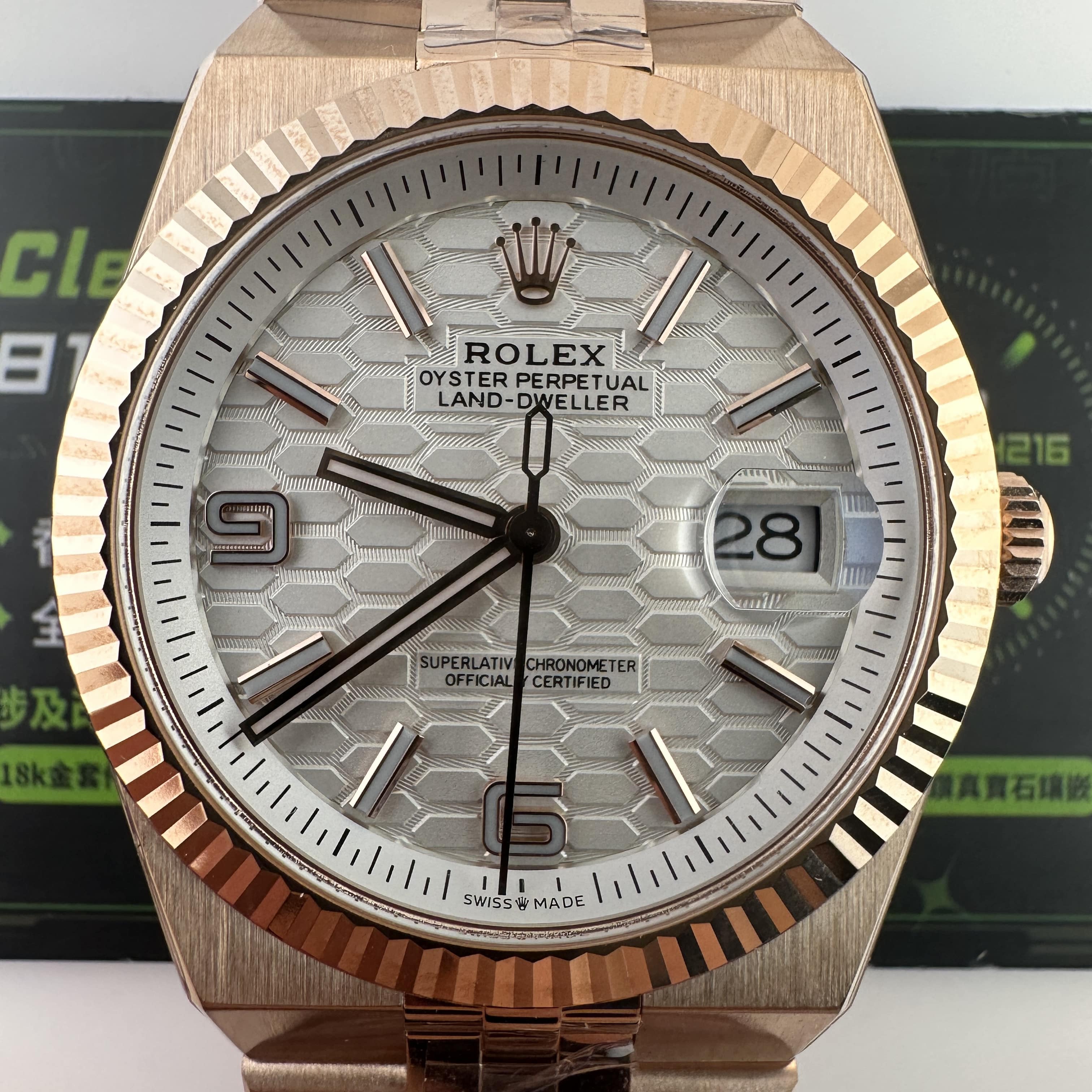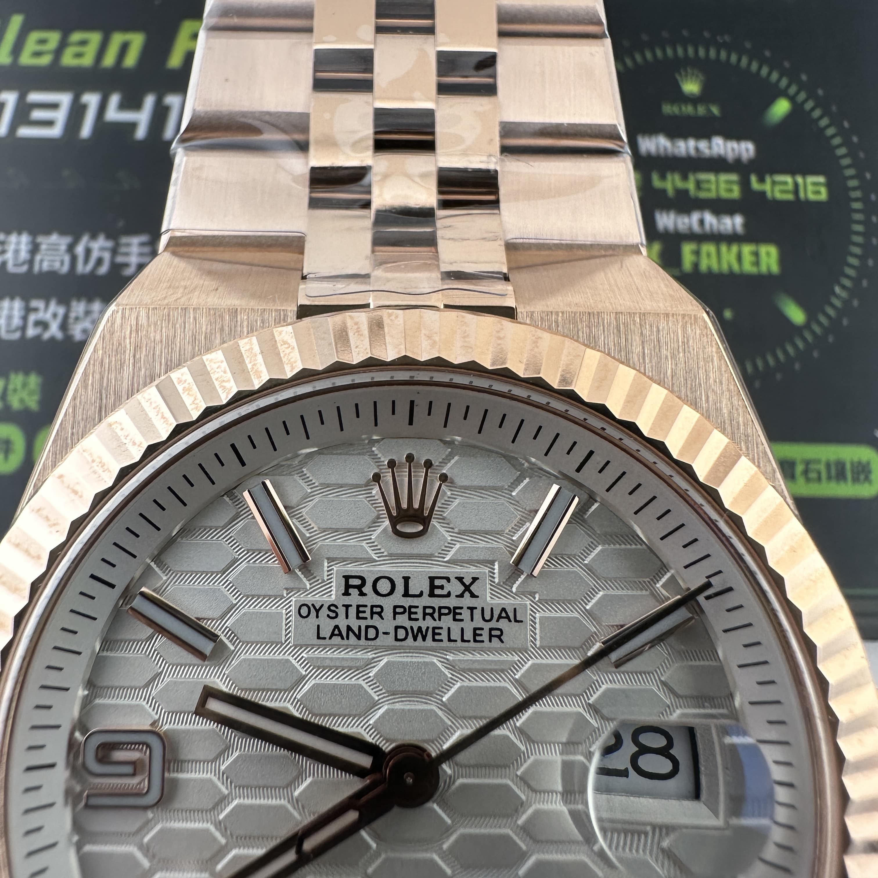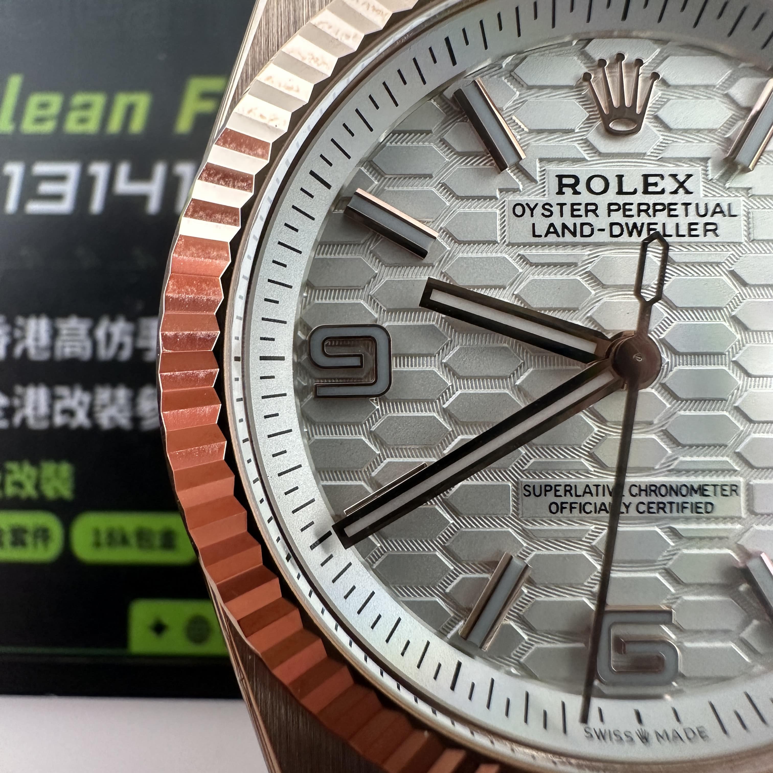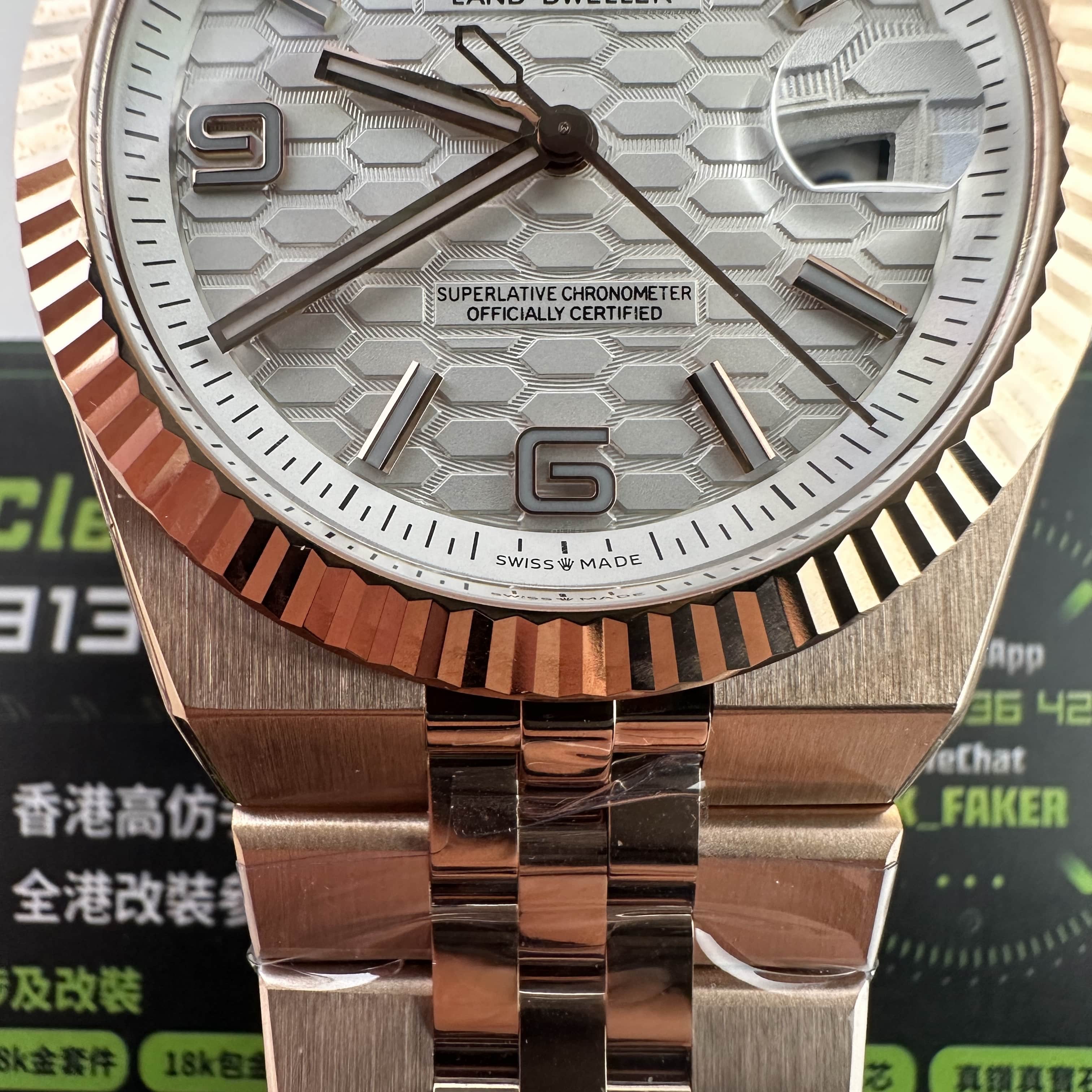 高仿勞力士2025年最新款陸使型/LAND-DWELLER系列腕錶m127335-0001玫瑰金白面,整錶尺寸40mm.高仿勞力士127335使用的材質是904L精鋼,外觀部分採用了PVD電鍍金工藝製作接近原版一致的玫瑰金色澤.關於高仿勞力士陸使型127335白面錶盤對比原版是否存在色差?基本上是杜絕色差,白色黑色作為純色系而言在高仿市場中是最"吃香"的錶盤,並且此次私人訂製版本的127335錶款不屬於任何廠家出品,針對品質和細節處理部分會比其他廠家做得更好,特別是目前新推出的ES廠和8+廠,細節處理不完善,存在明顯缺陷.