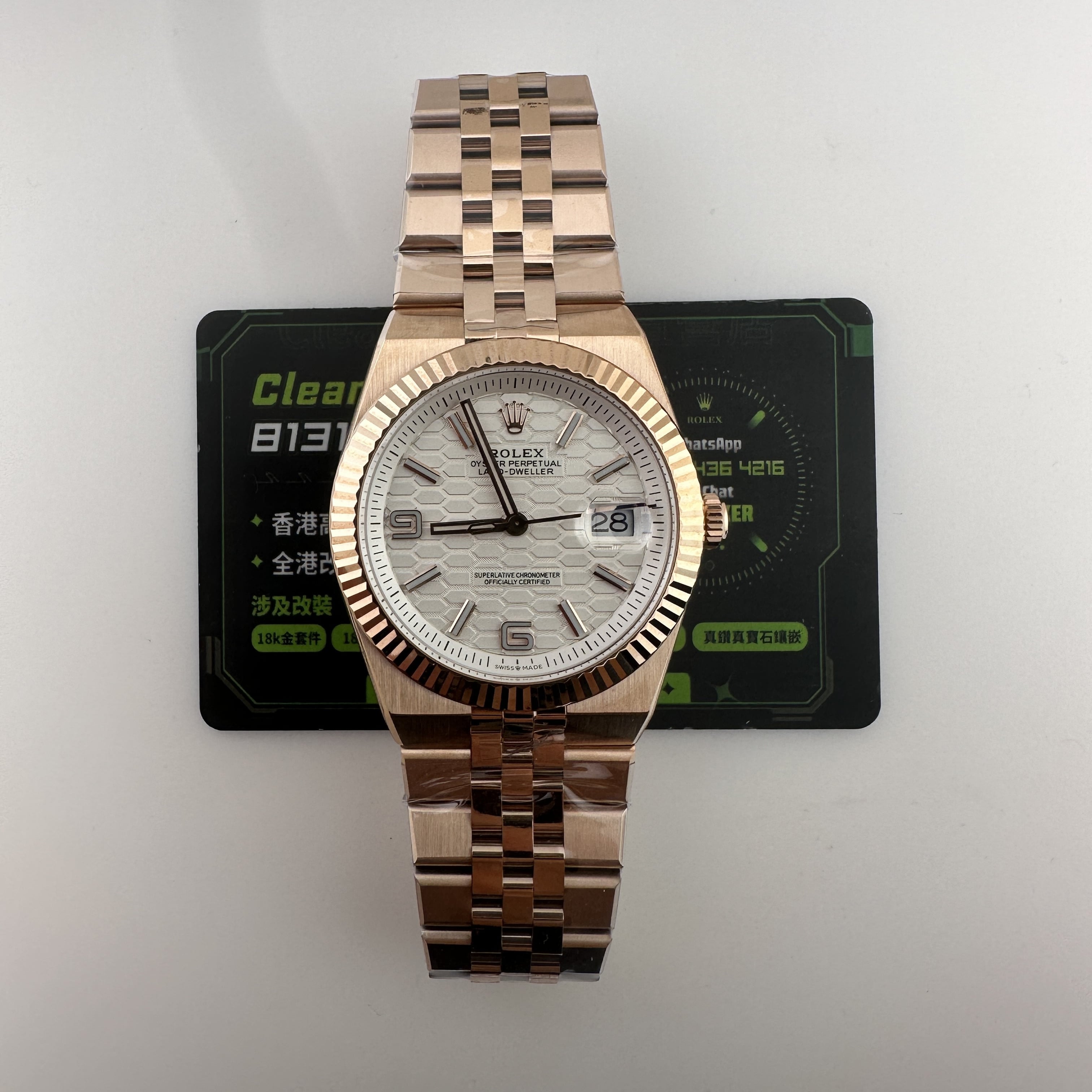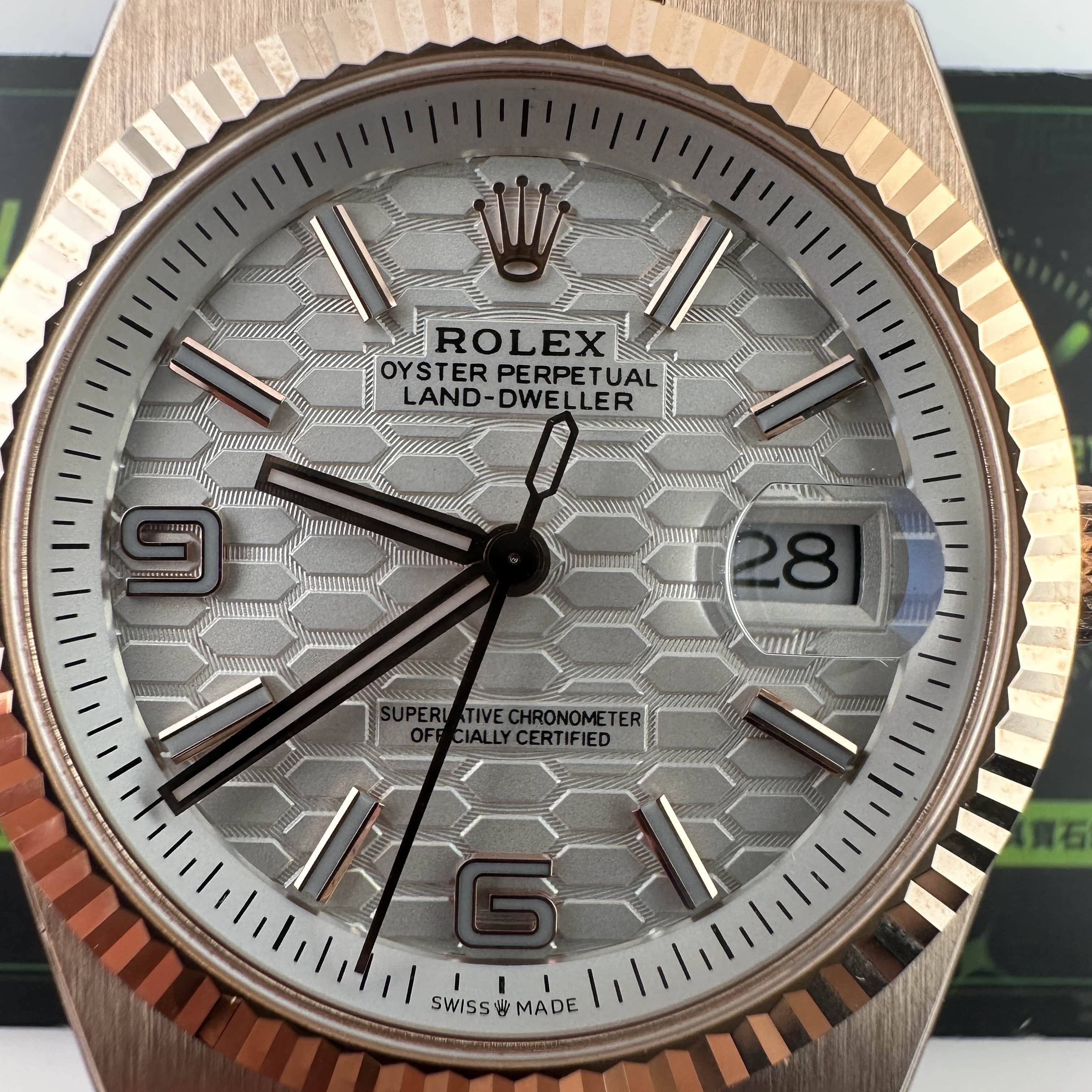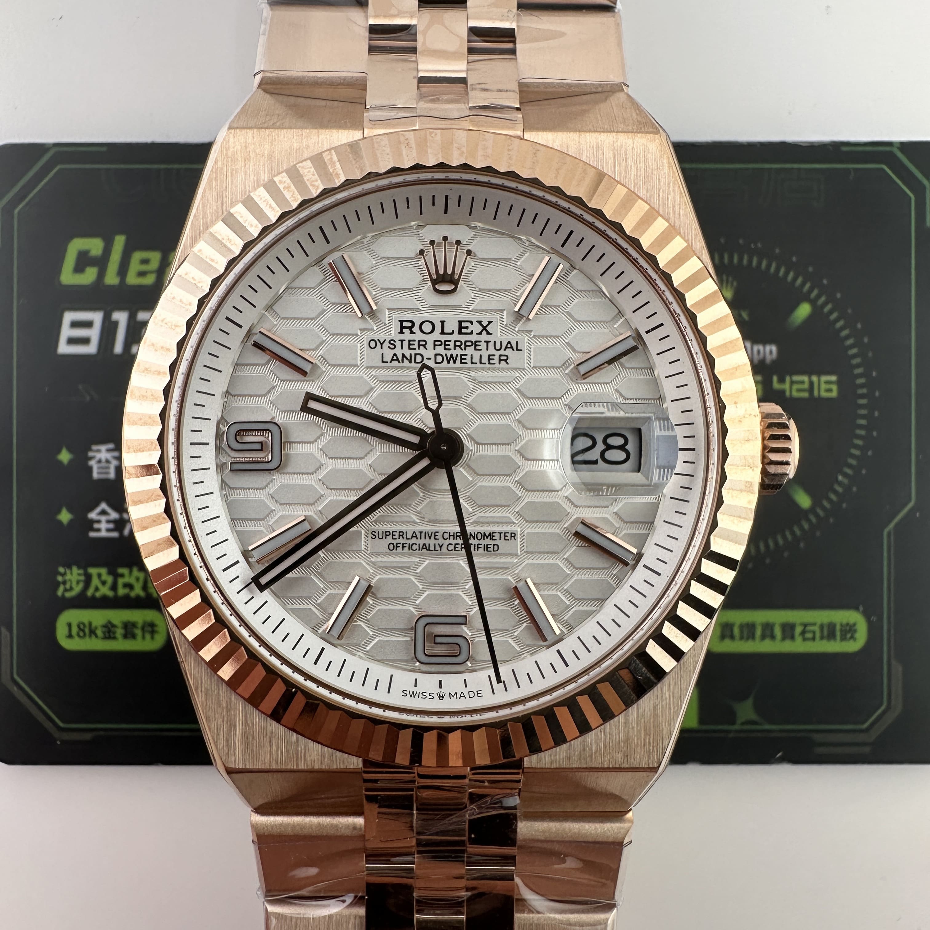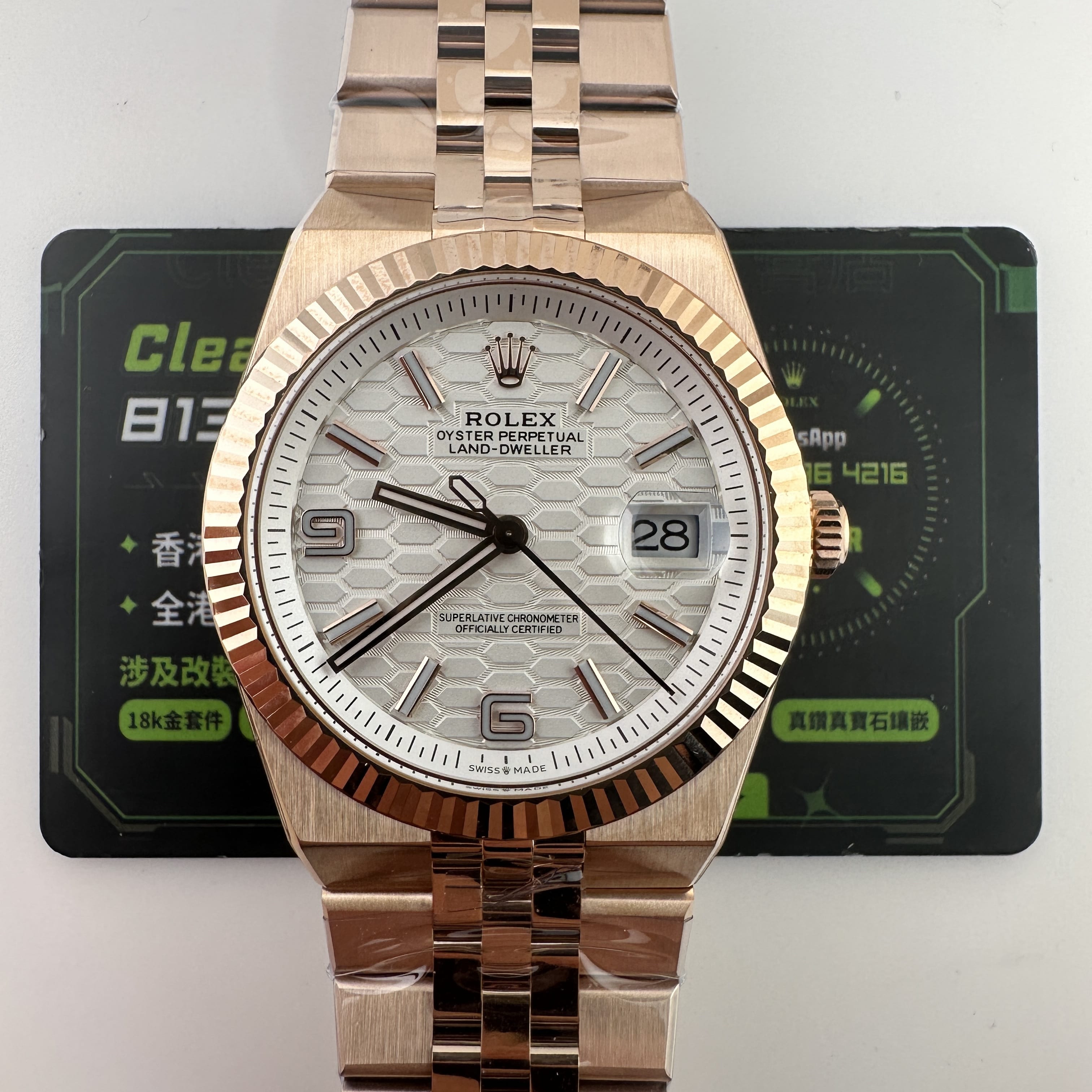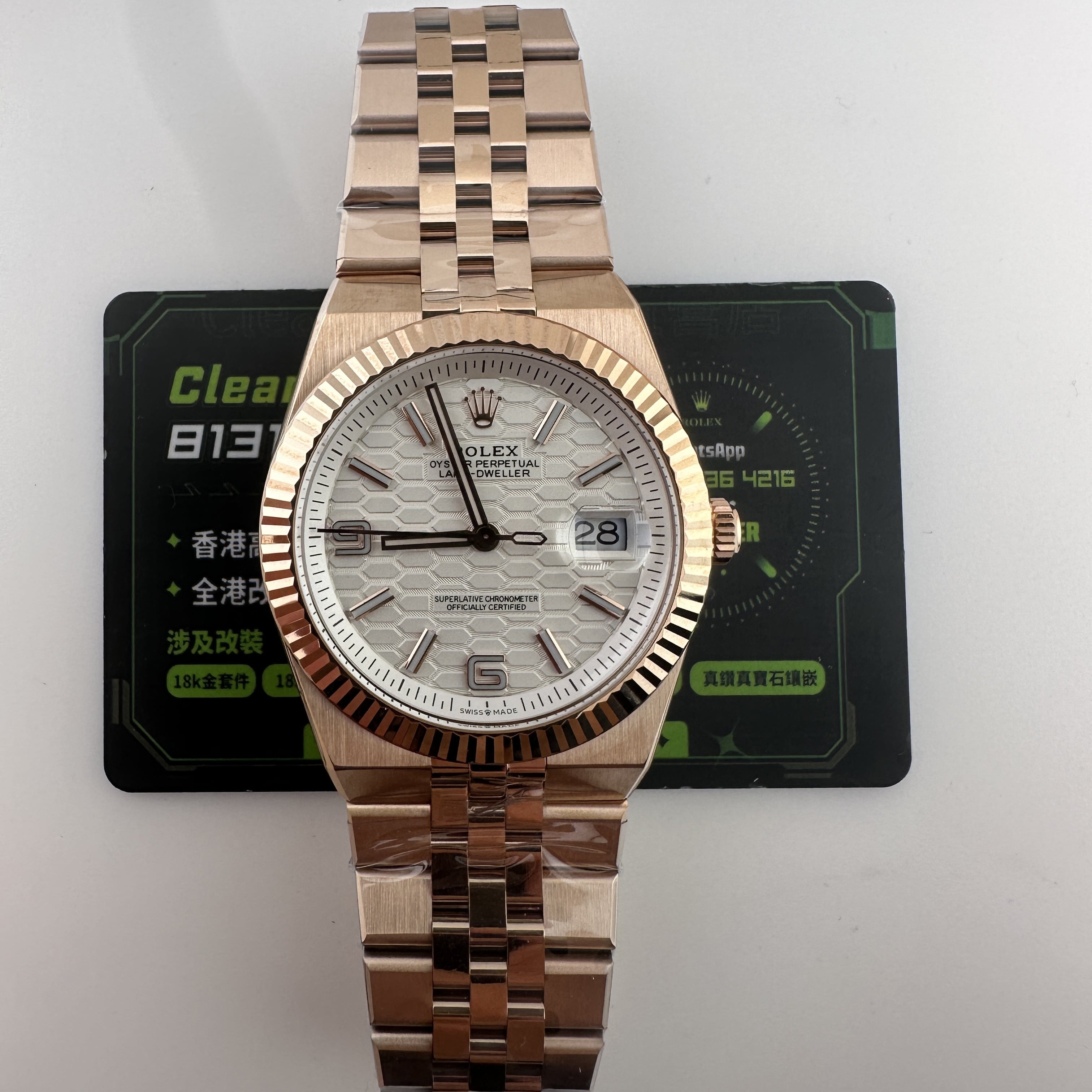 高仿勞力士2025年最新款陸使型/LAND-DWELLER系列腕錶m127335-0001玫瑰金白面,整錶尺寸40mm.高仿勞力士127335使用的材質是904L精鋼,外觀部分採用了PVD電鍍金工藝製作接近原版一致的玫瑰金色澤.關於高仿勞力士陸使型127335白面錶盤對比原版是否存在色差?基本上是杜絕色差,白色黑色作為純色系而言在高仿市場中是最"吃香"的錶盤,並且此次私人訂製版本的127335錶款不屬於任何廠家出品,針對品質和細節處理部分會比其他廠家做得更好,特別是目前新推出的ES廠和8+廠,細節處理不完善,存在明顯缺陷.