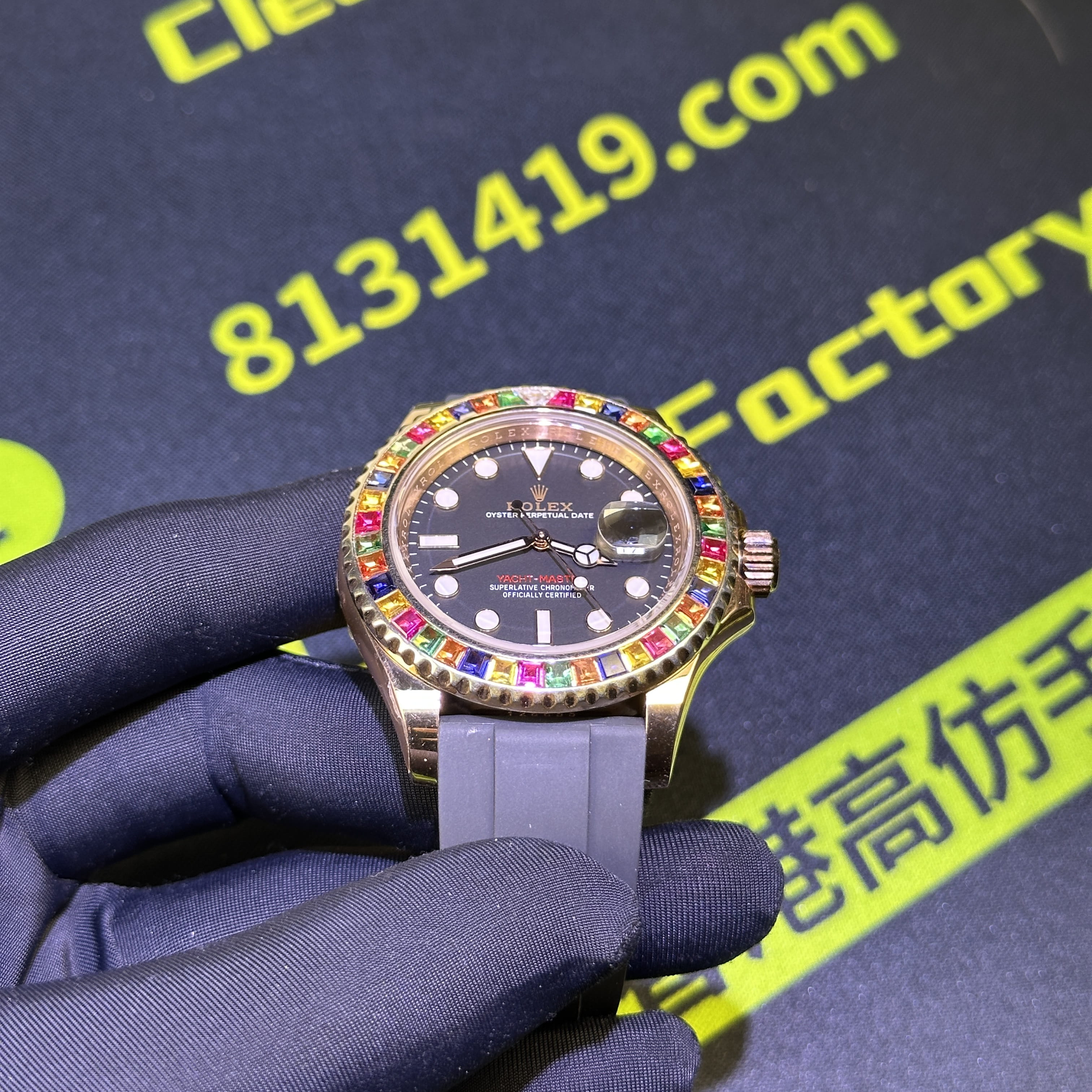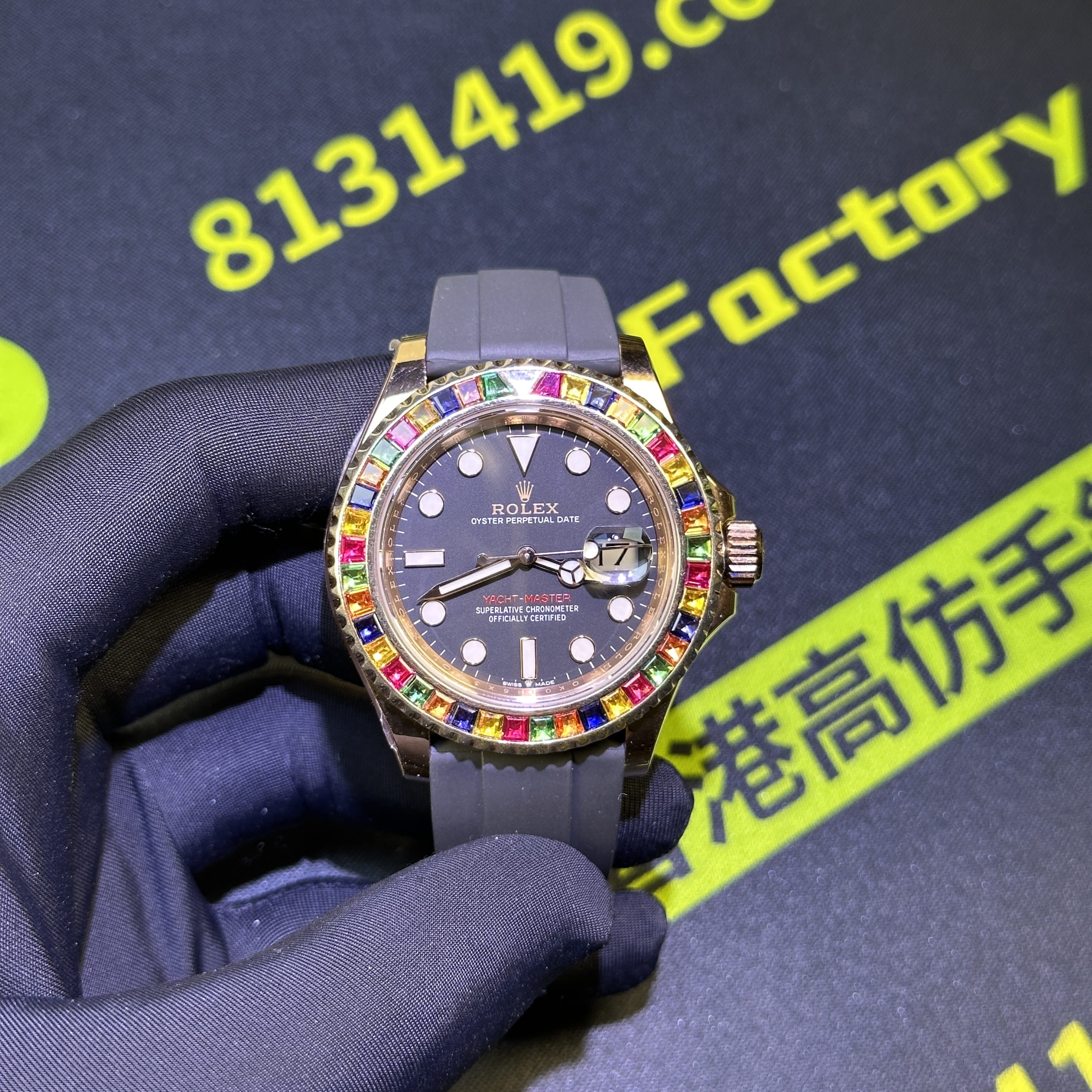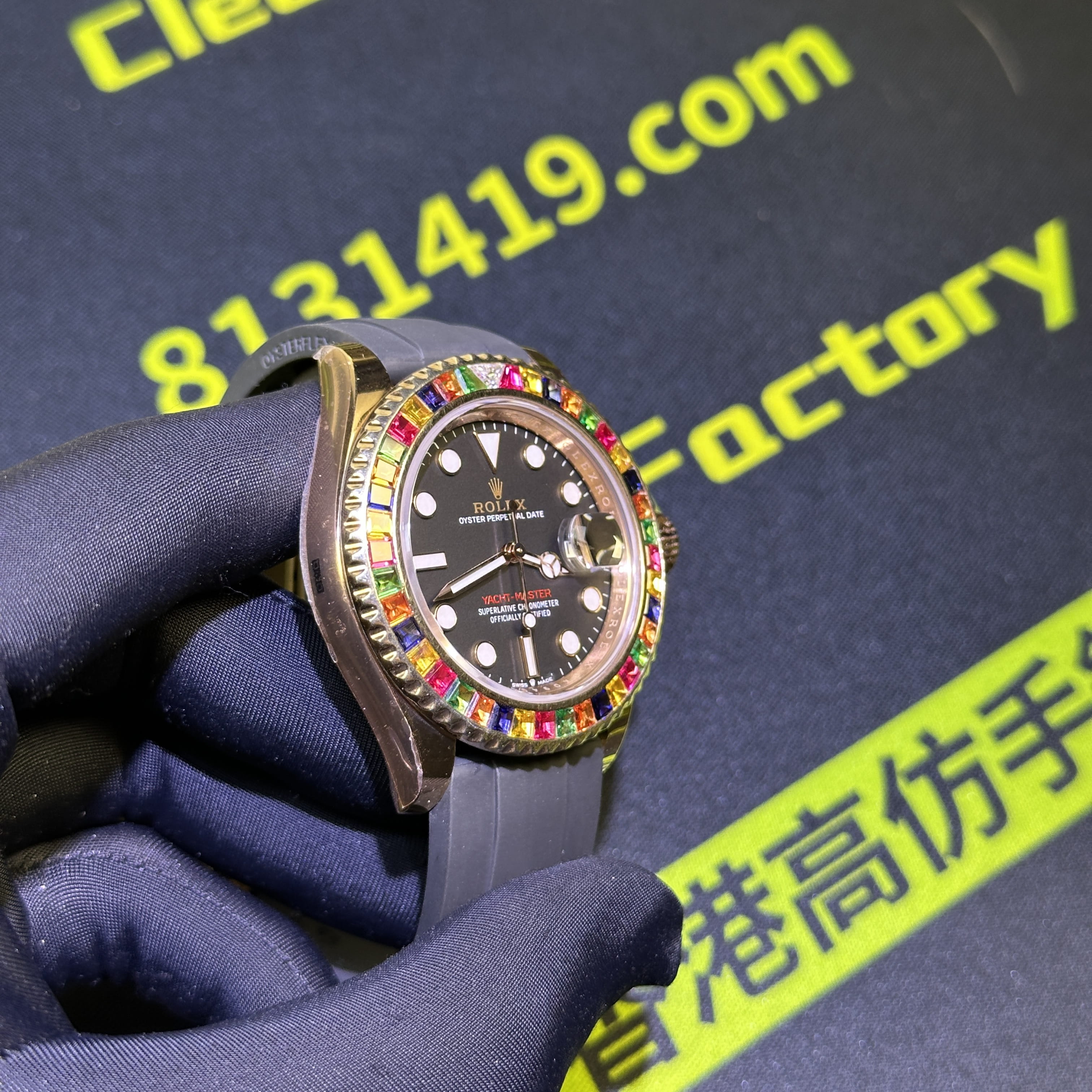 這一隻高仿勞力士配重Yacht Master圈口部分的彩寶糖豆,目前選擇的是莫桑鑽材質,可以使用真鑽寶石進行鑲嵌.雖然莫桑鑽材質已經是最接近原裝正品的材質,但是追求高仿手錶真鑽改裝的案例也不少,畢竟是外觀部分的重要真假辨識度,如果升級高仿手錶真鑽改裝後整體的質感會提升很多,只不過面對高仿勞力士116695SATS彩寶的顆粒數量屬實是有點多,升級的費用也比較大,這一點也是錶友們考慮的問題之一
