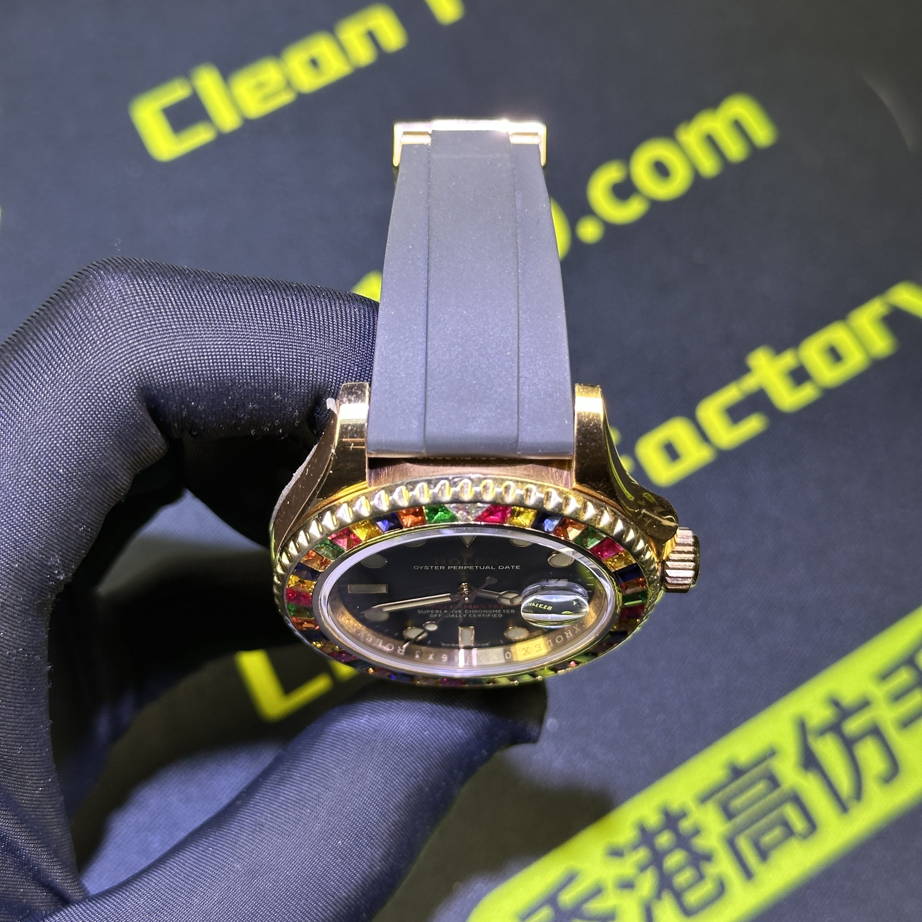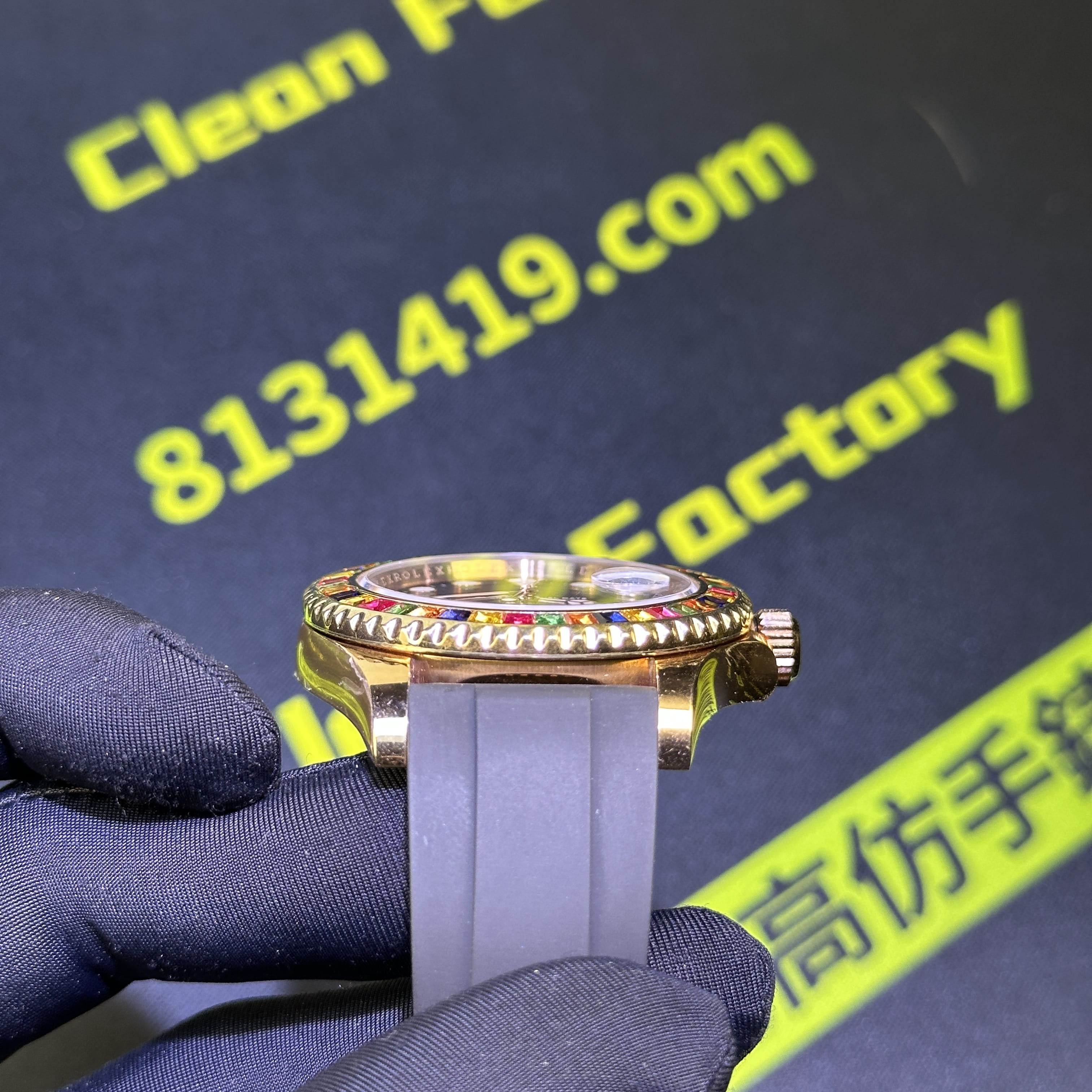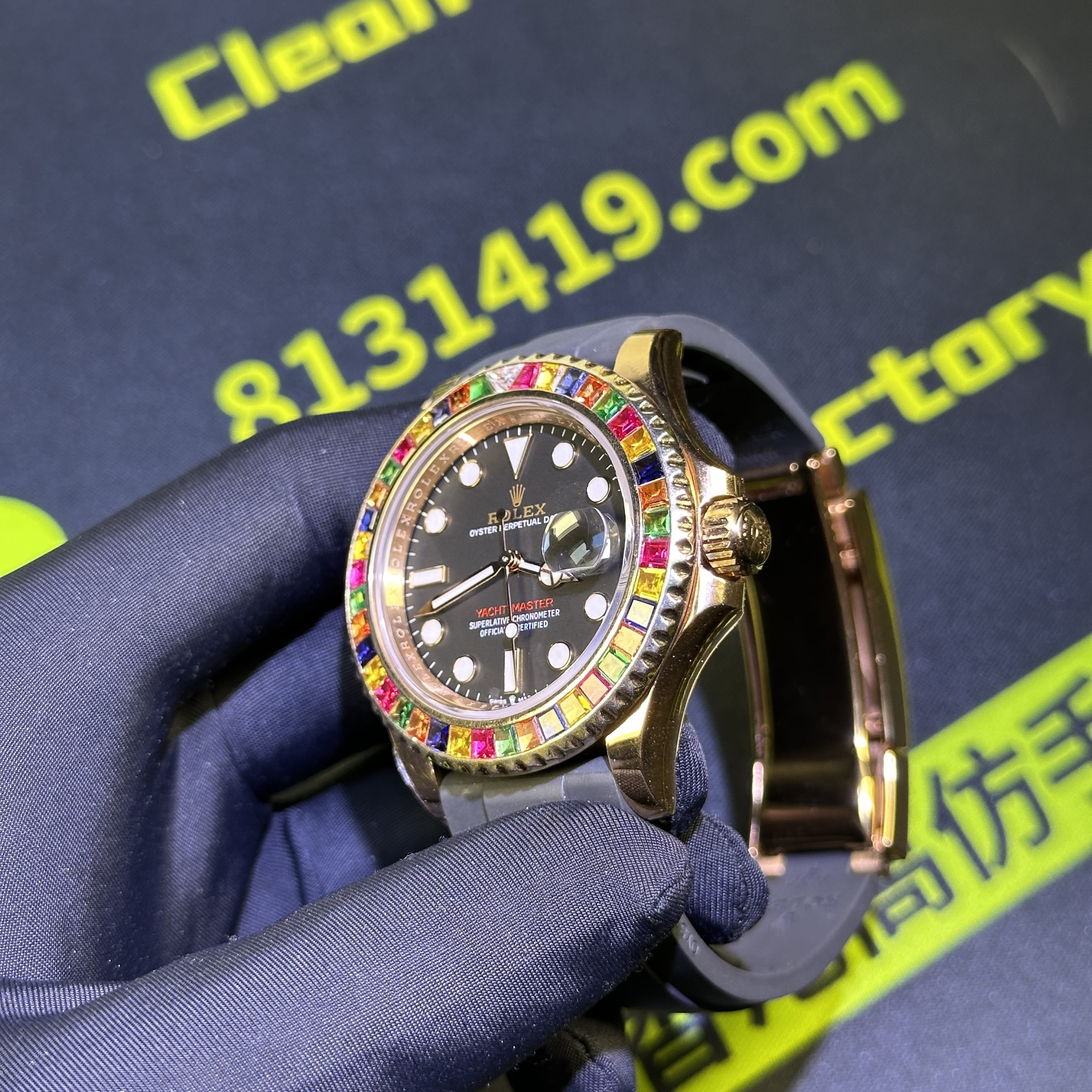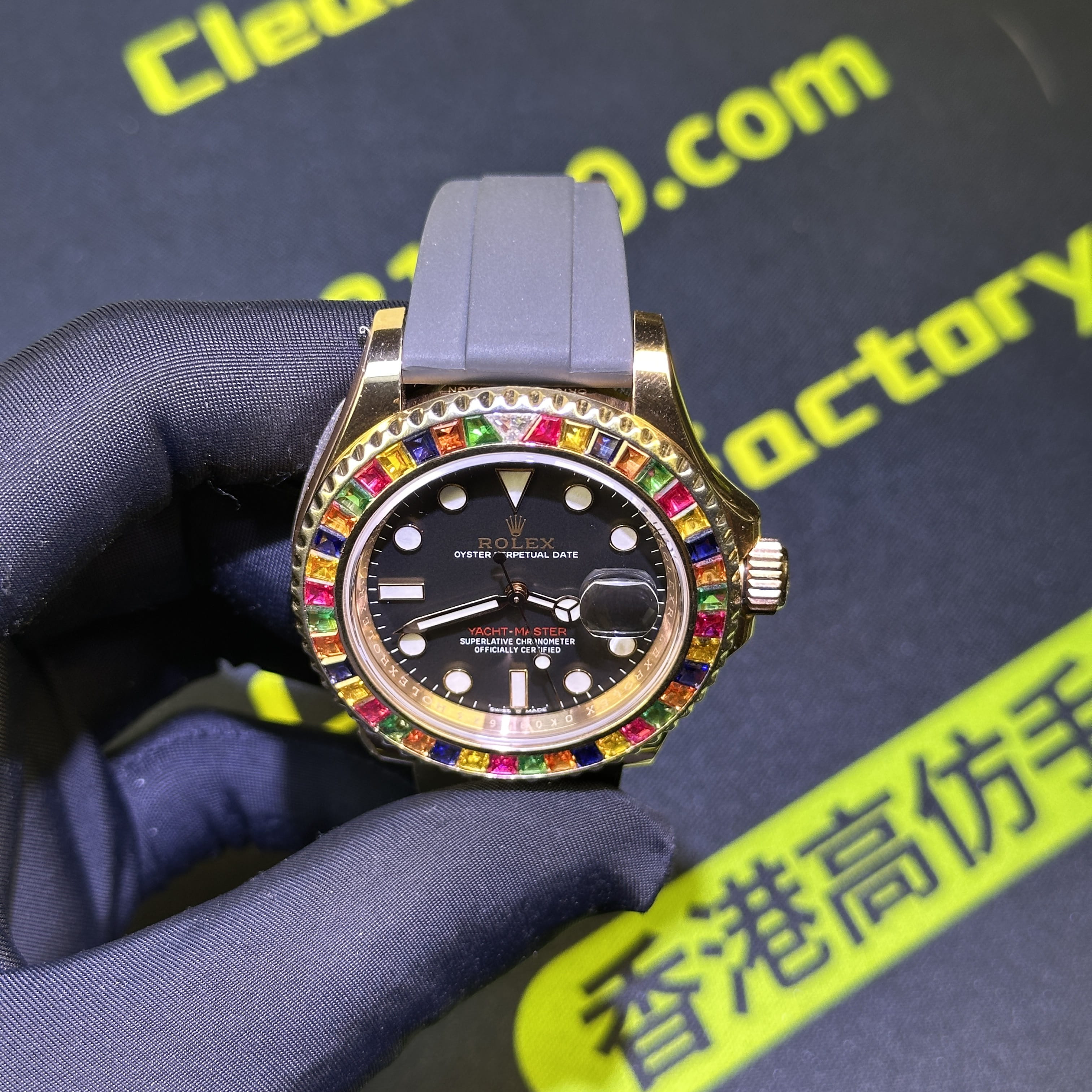 這一隻高仿勞力士配重Yacht Master圈口部分的彩寶糖豆,目前選擇的是莫桑鑽材質,可以使用真鑽寶石進行鑲嵌.雖然莫桑鑽材質已經是最接近原裝正品的材質,但是追求高仿手錶真鑽改裝的案例也不少,畢竟是外觀部分的重要真假辨識度,如果升級高仿手錶真鑽改裝後整體的質感會提升很多,只不過面對高仿勞力士116695SATS彩寶的顆粒數量屬實是有點多,升級的費用也比較大,這一點也是錶友們考慮的問題之一