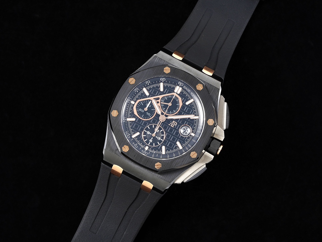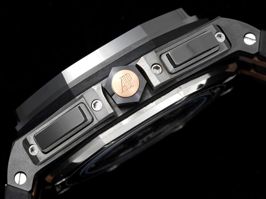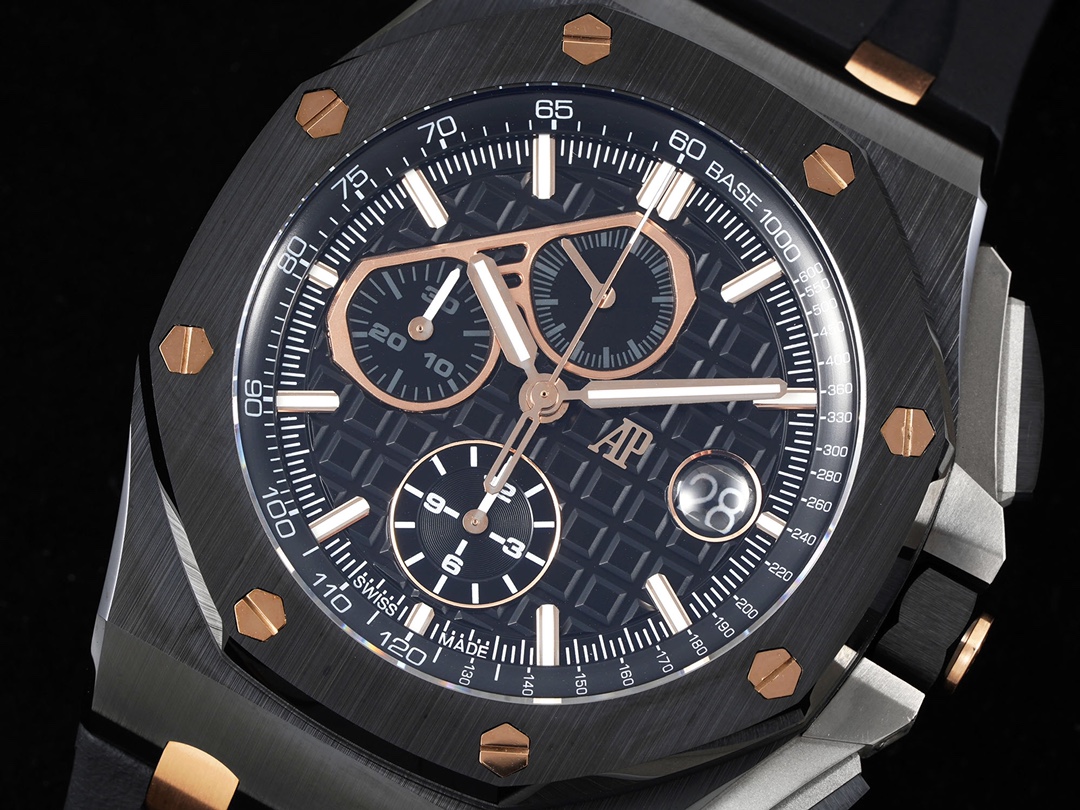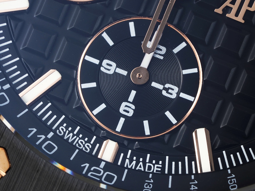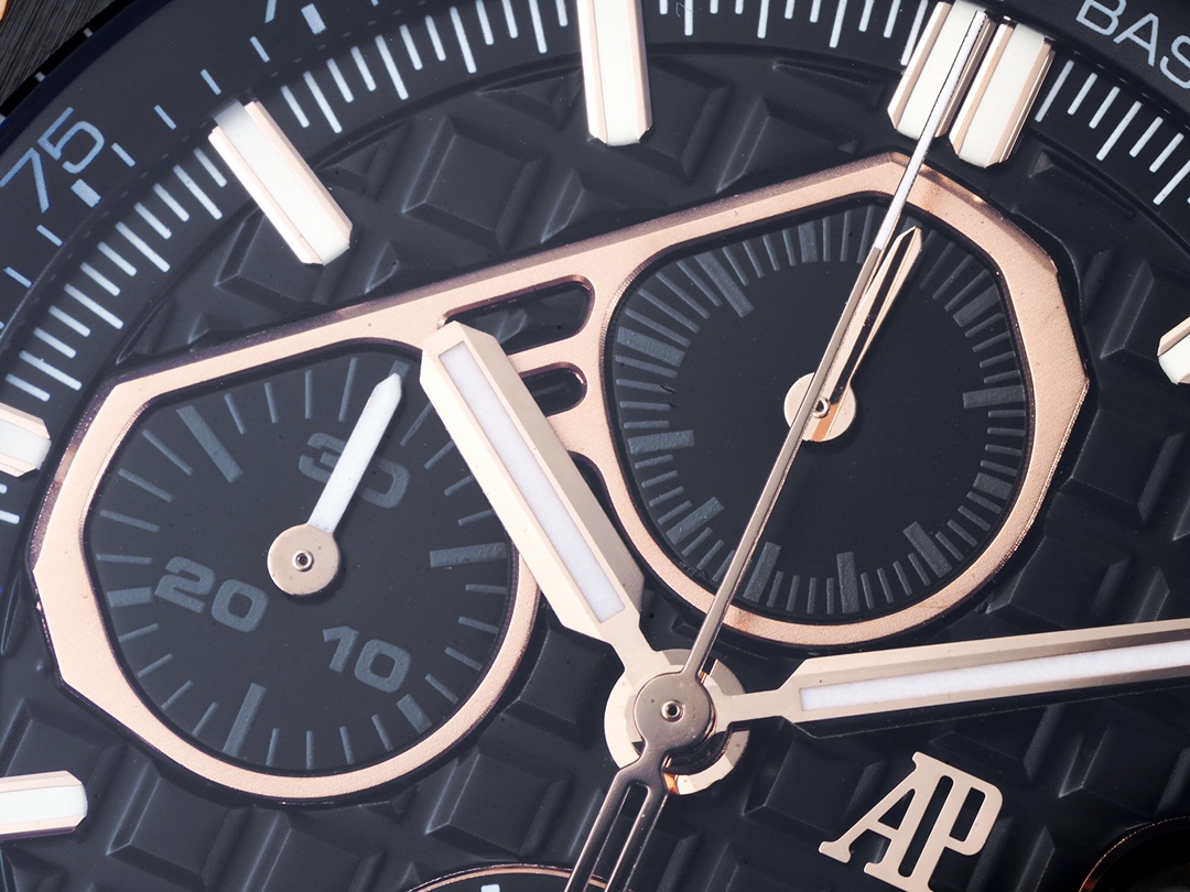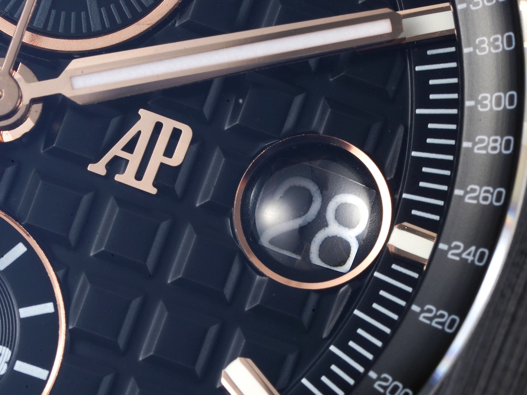 黑色錶盤鐫刻“Méga Tapisserie”超大格紋裝潢,黑色煙熏藍寶石副錶盤搭配玫瑰金色太陽鏡裝潢,黑色外區,玫瑰金螢光立體時標和皇家橡樹指針,黑色內影與錶盤的拼凑幾乎無縫銜接。 3點位置行事曆窗裏的白色數位尤為突出(行事曆盤對版,市場其他版本都不對版),猶如黑暗中的一盞明燈!