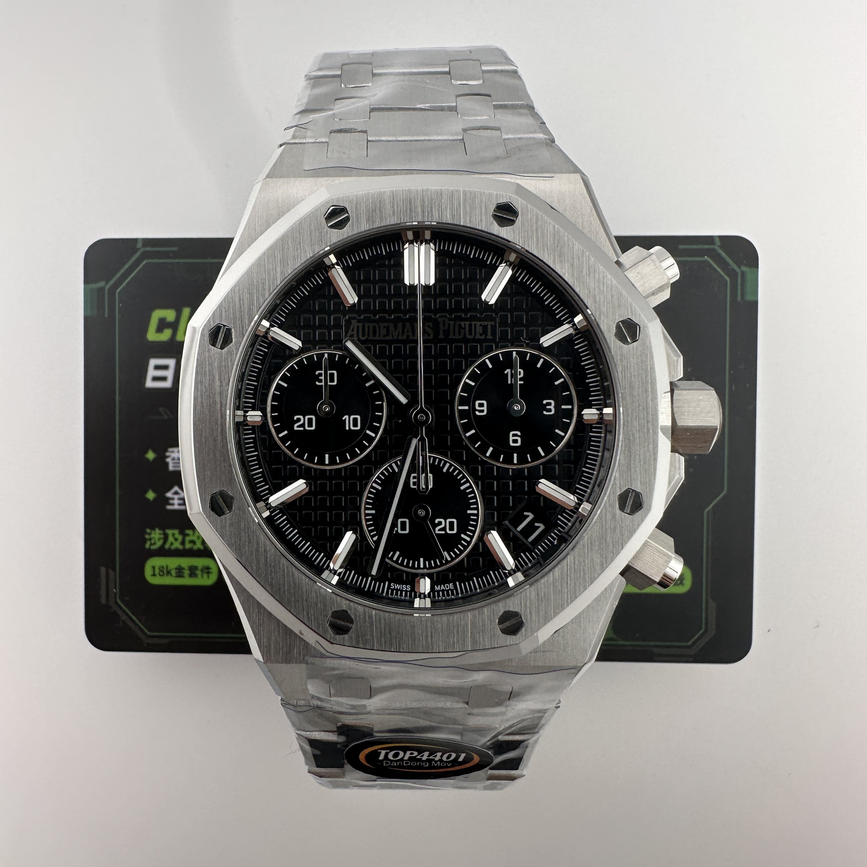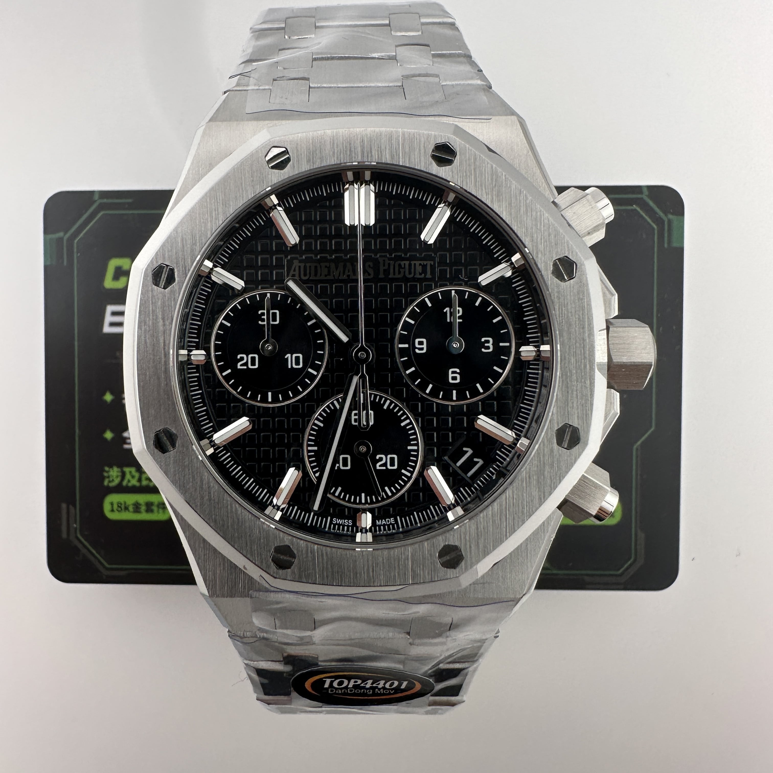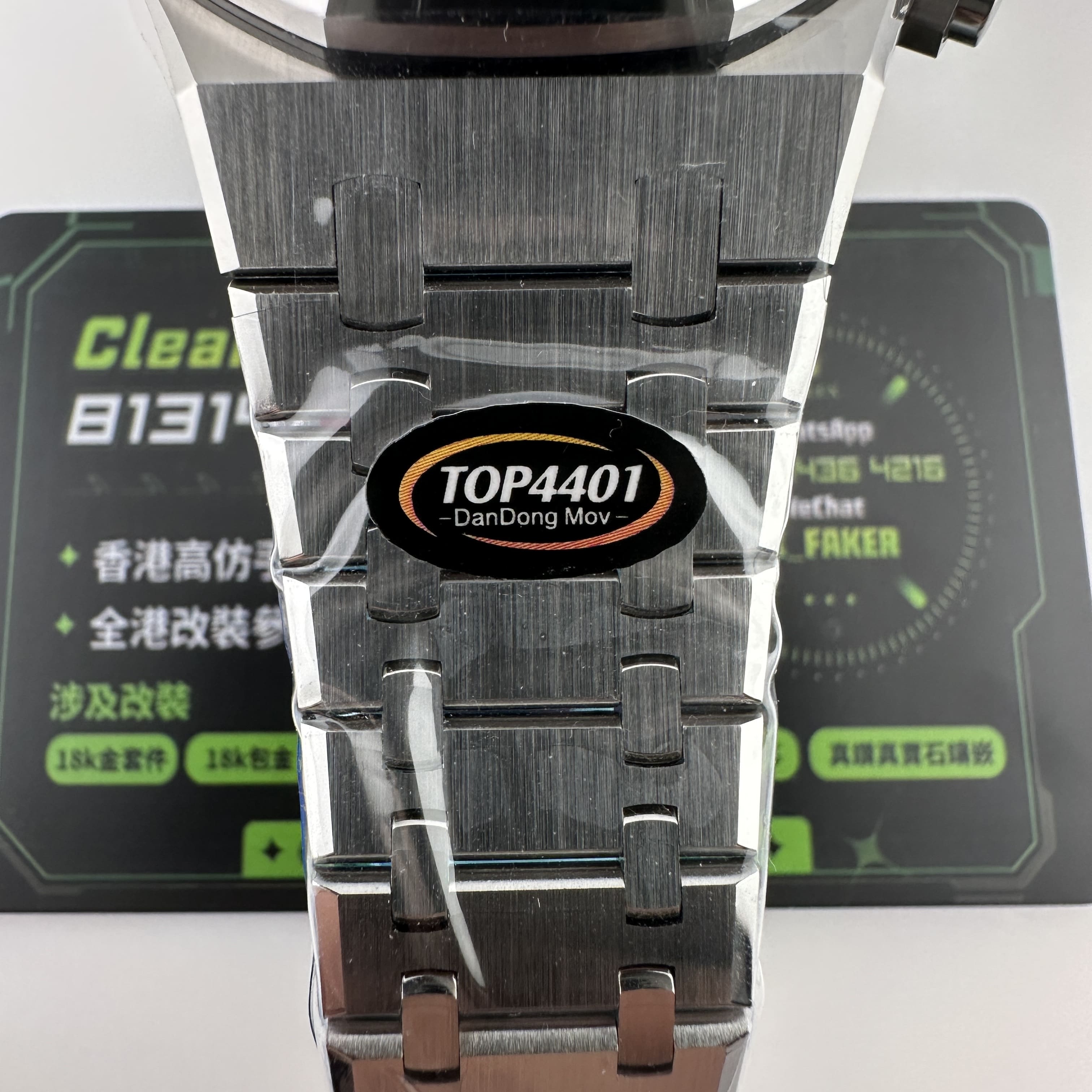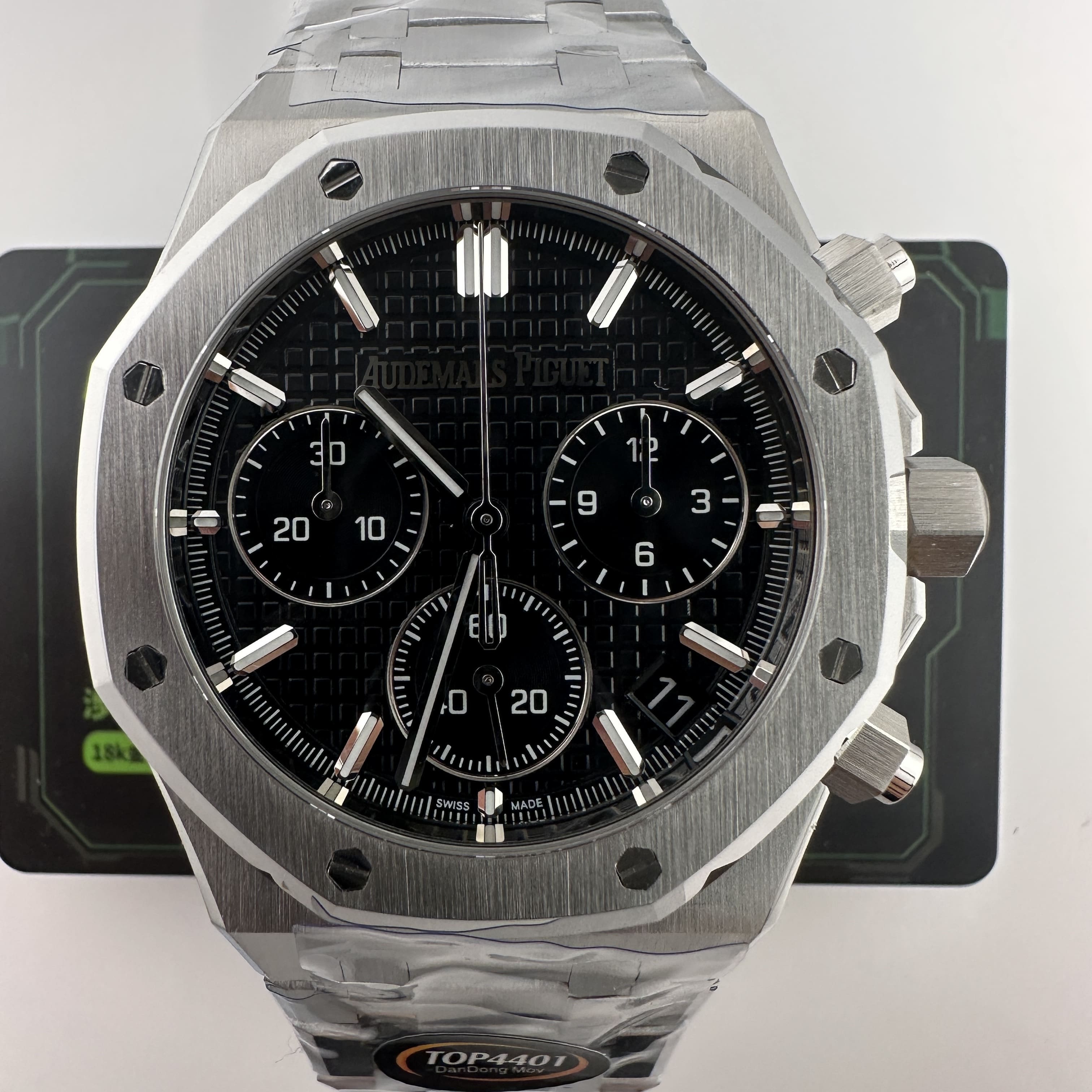 其中TOP廠愛彼黑色盤面對比原版黑色幾乎是無色差的狀態,加上錶盤內部細節處理完善,餅乾紋錶盤大小,間隔距離,以及三個小圈擺位都是根據專櫃版本同步復刻.TOP廠26240純手工打磨的指針,細膩,無毛邊毛刺,實心中軸,無需後期改裝升級.包括日曆組成部分的位置對比正版是同一個位置處置,可隨意比對原版日曆窗口位置.機芯是搭載了丹東4401機芯,穩定性極佳,無卡度裝置.