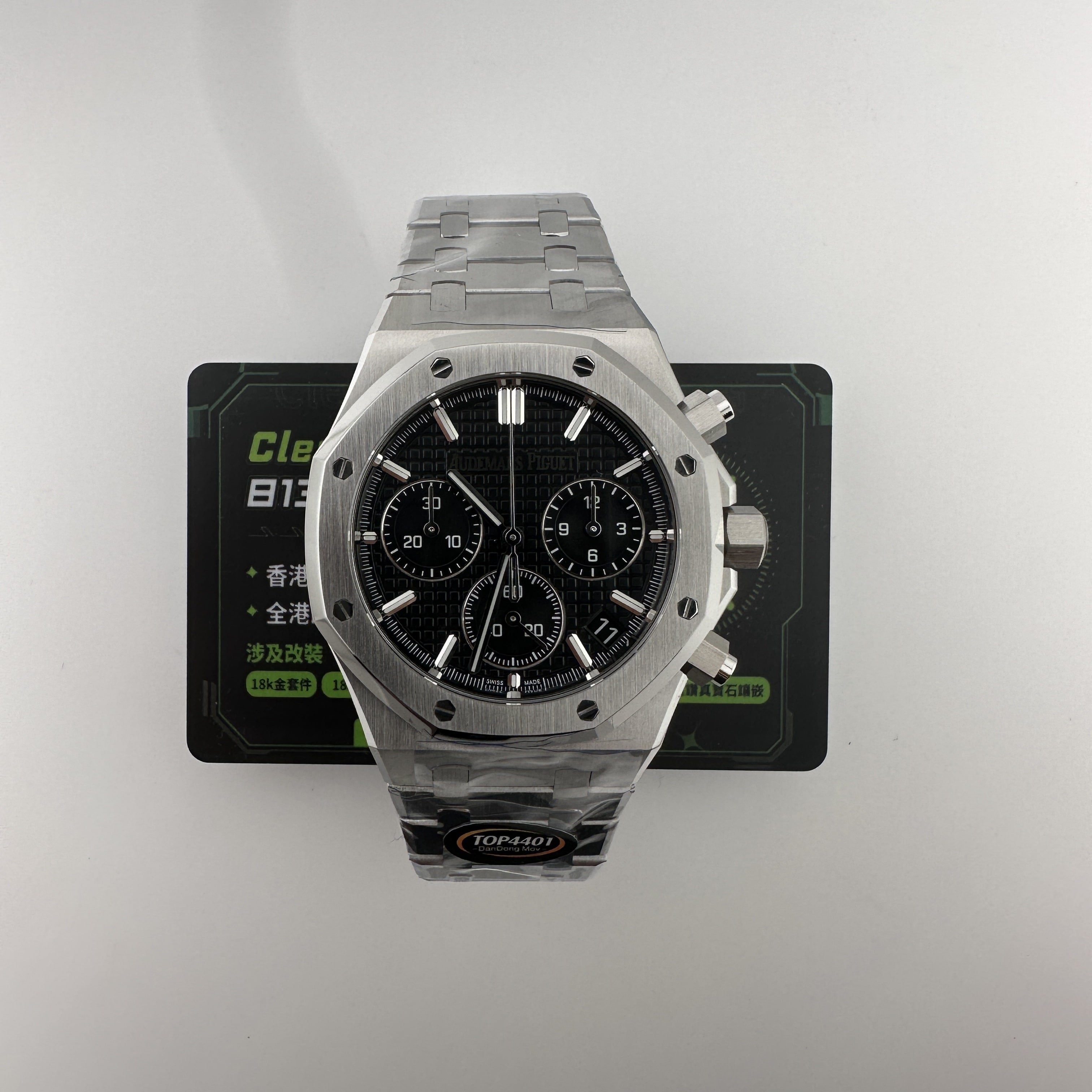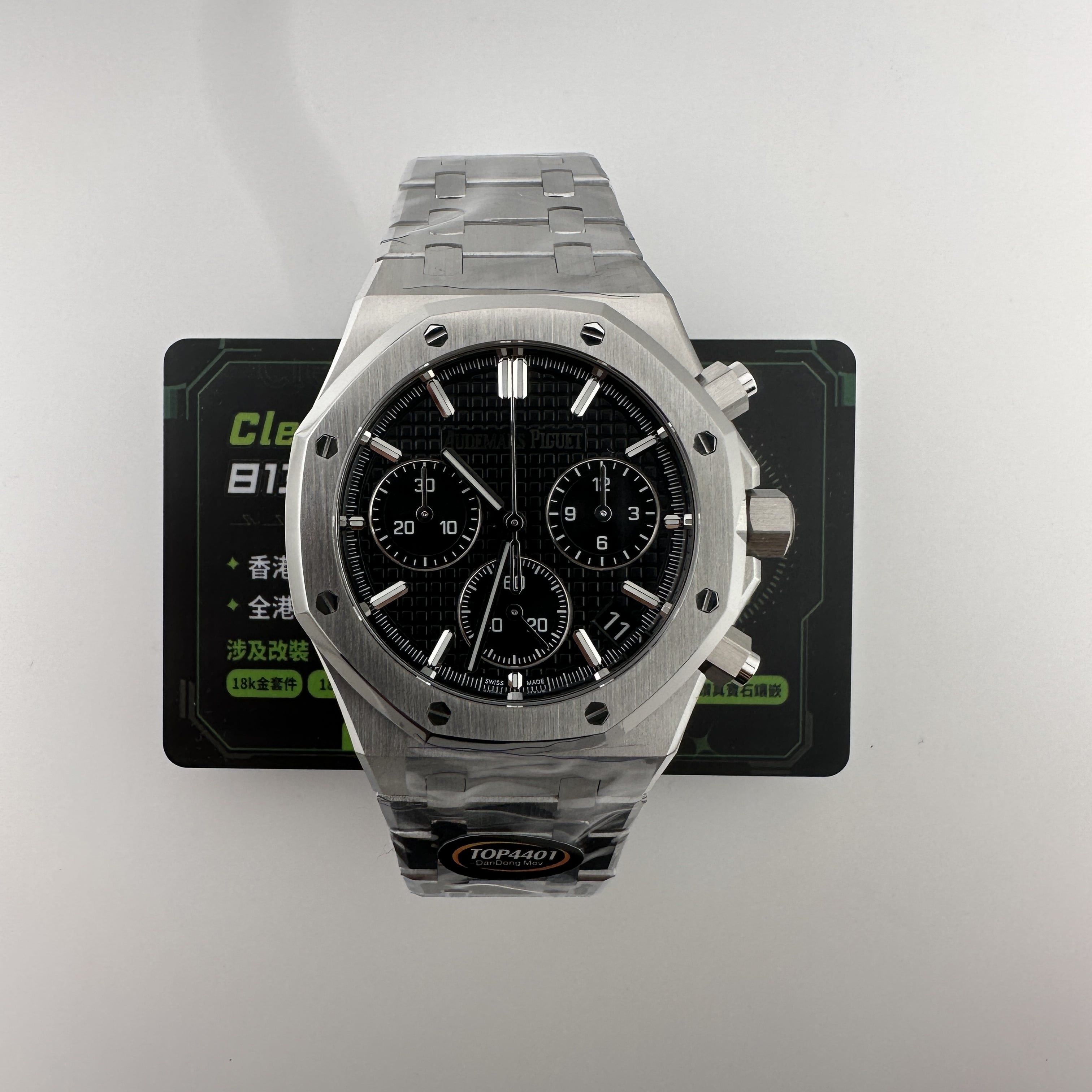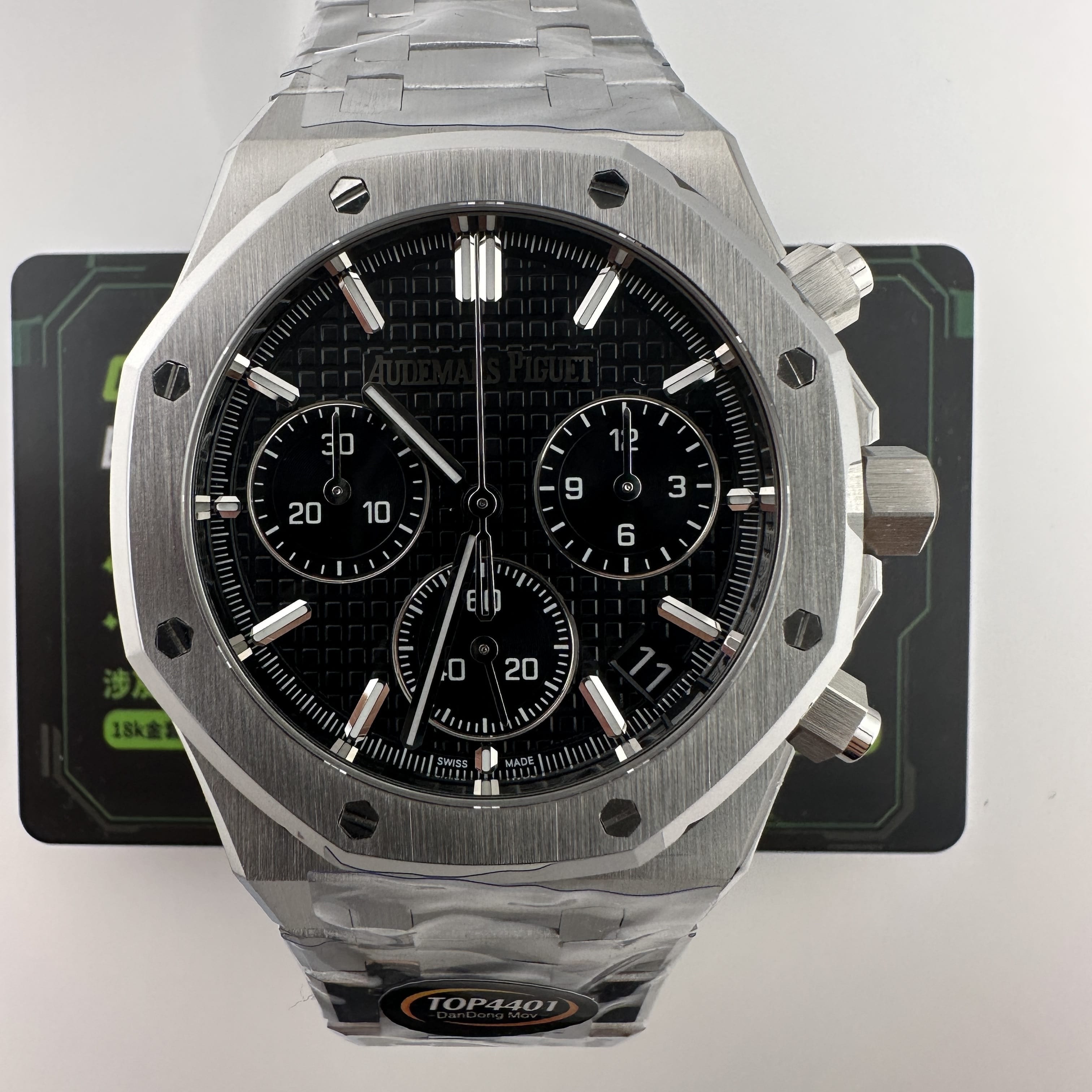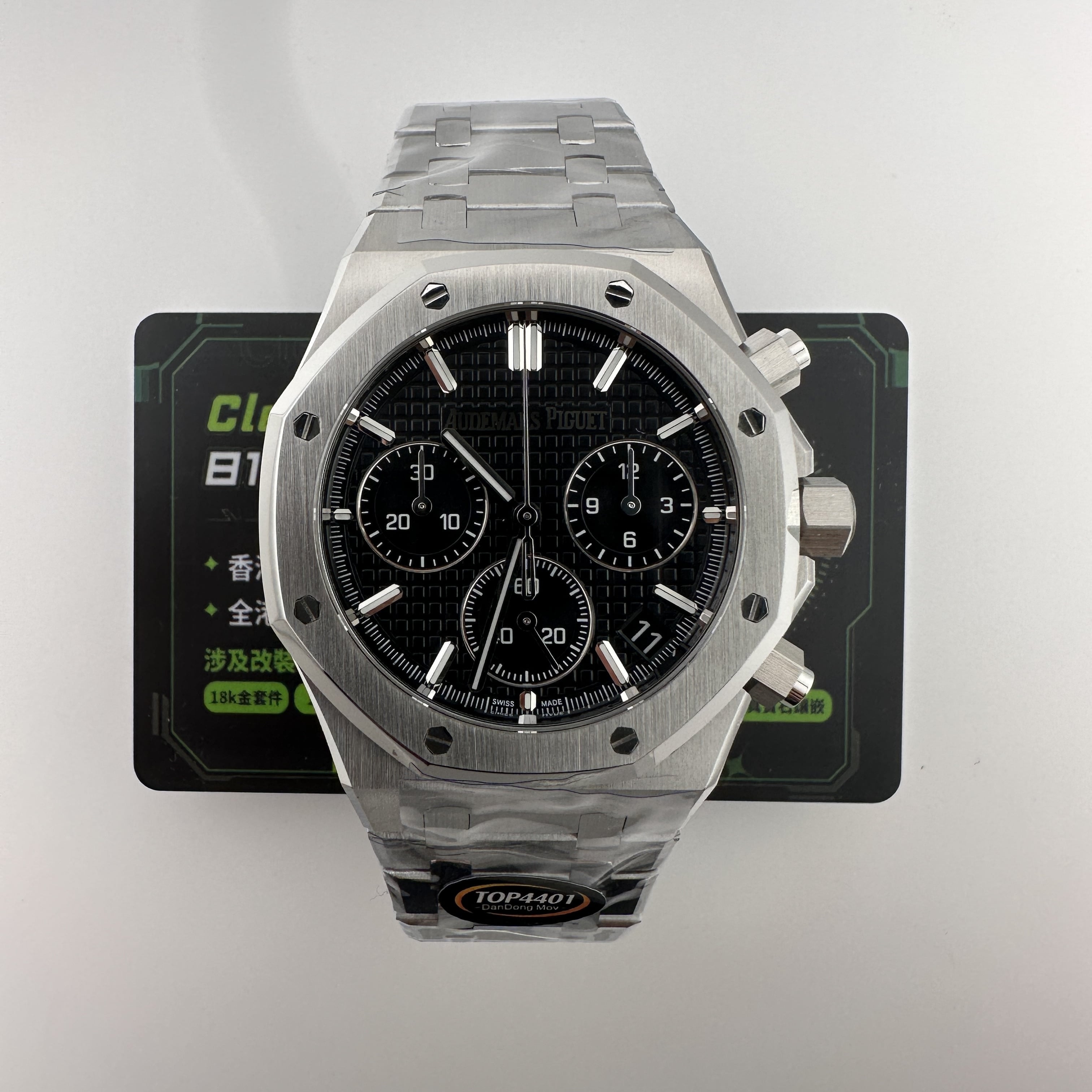 其中TOP廠愛彼黑色盤面對比原版黑色幾乎是無色差的狀態,加上錶盤內部細節處理完善,餅乾紋錶盤大小,間隔距離,以及三個小圈擺位都是根據專櫃版本同步復刻.TOP廠26240純手工打磨的指針,細膩,無毛邊毛刺,實心中軸,無需後期改裝升級.包括日曆組成部分的位置對比正版是同一個位置處置,可隨意比對原版日曆窗口位置.機芯是搭載了丹東4401機芯,穩定性極佳,無卡度裝置.