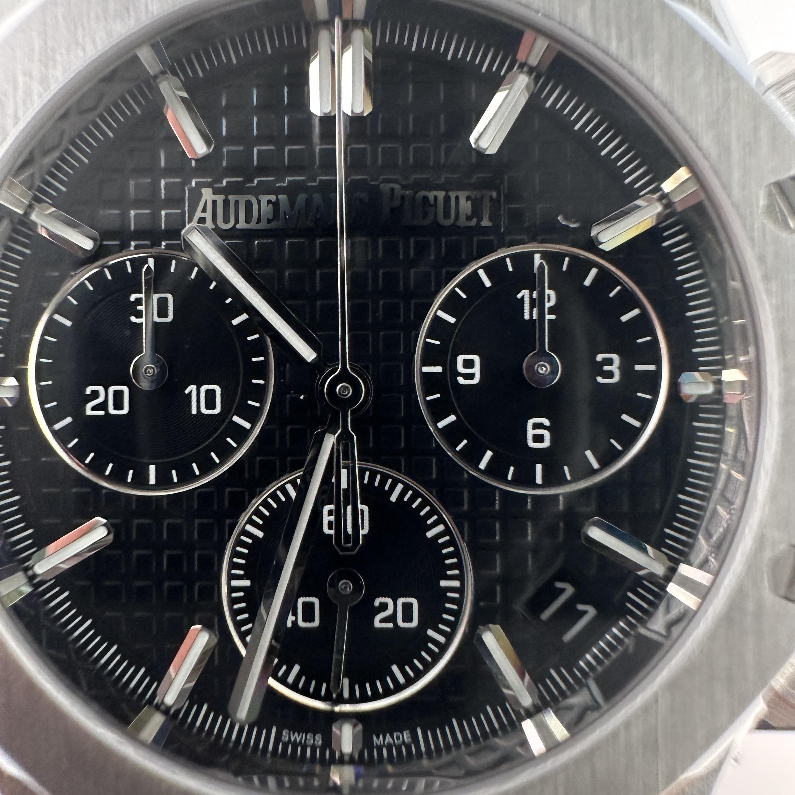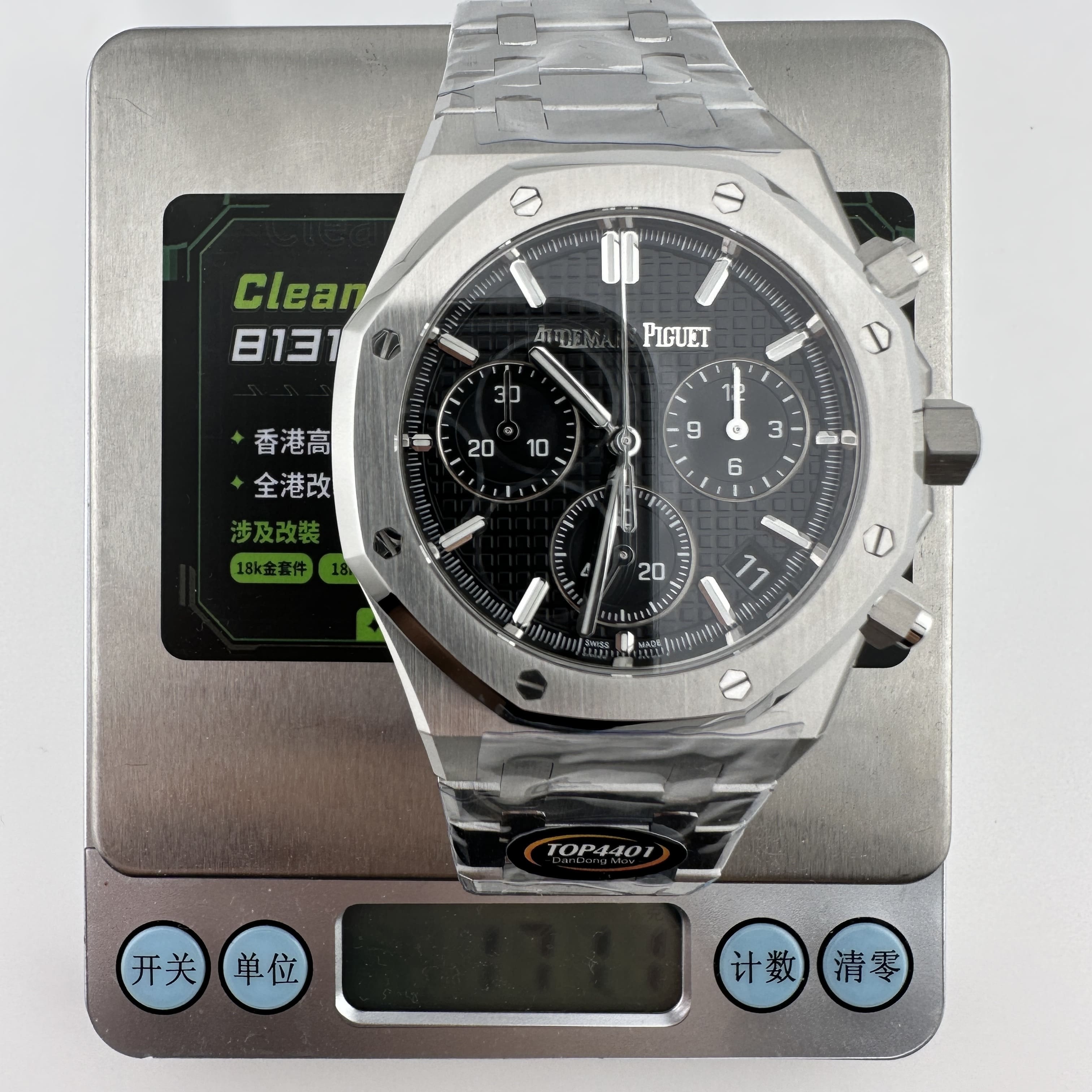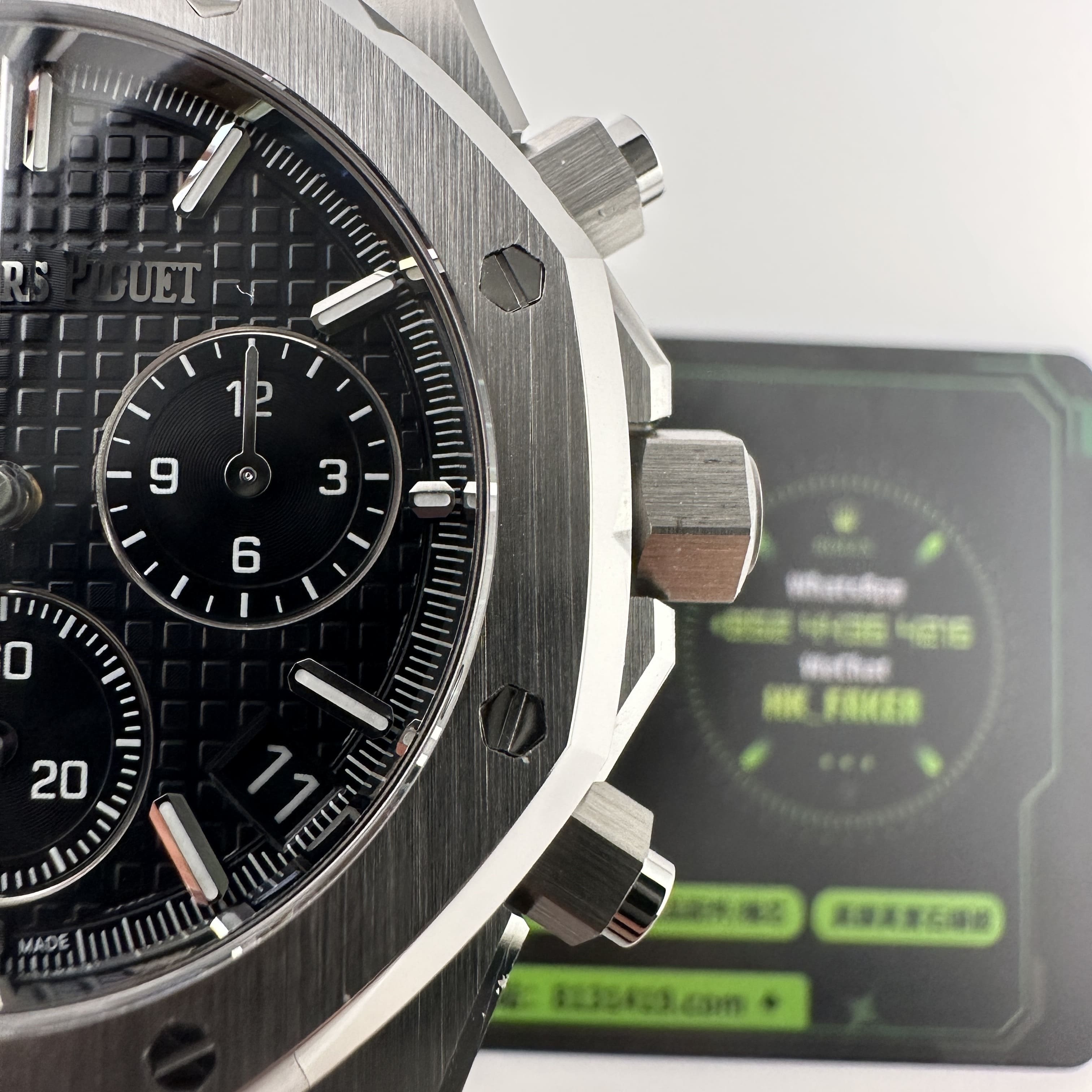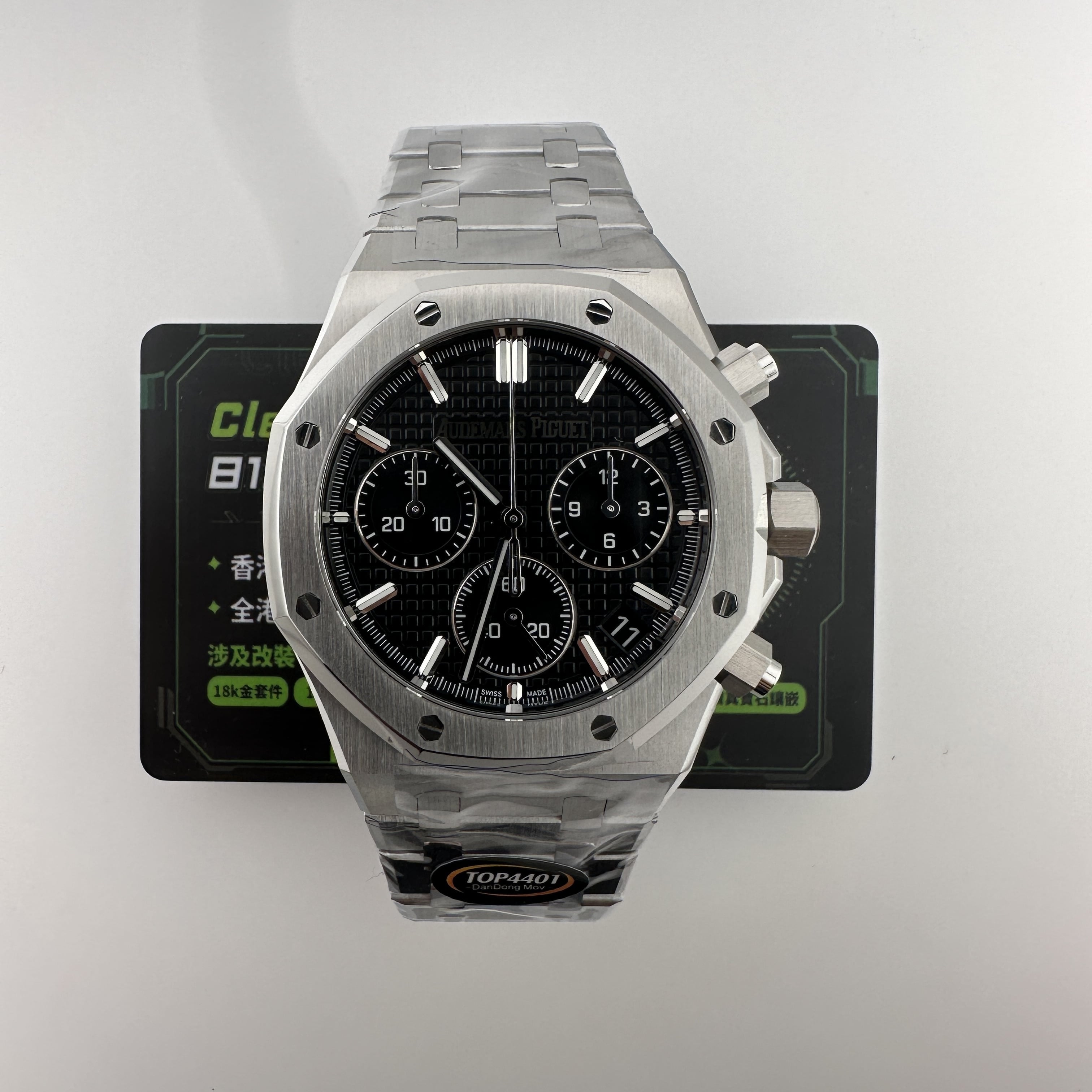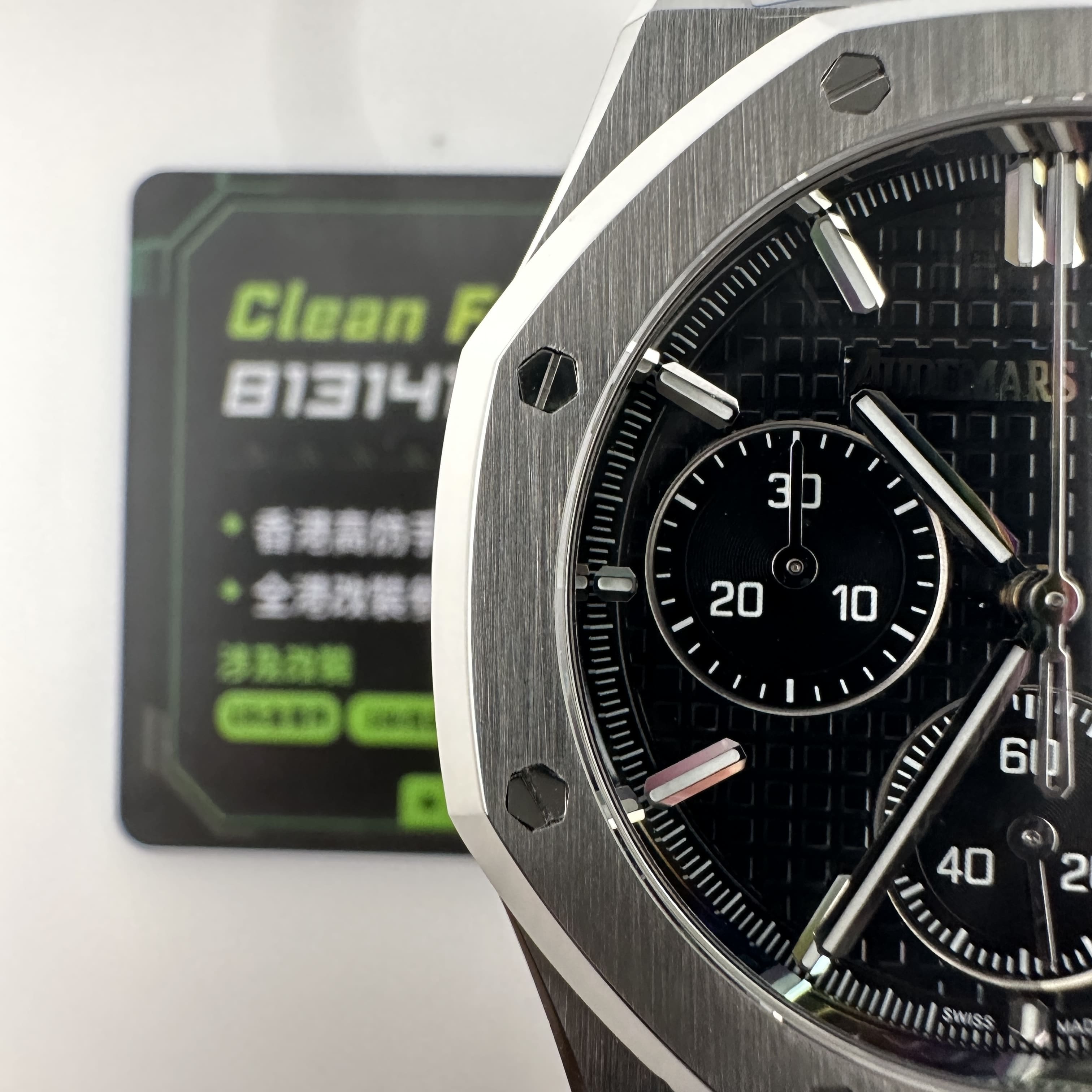 其中TOP廠愛彼黑色盤面對比原版黑色幾乎是無色差的狀態,加上錶盤內部細節處理完善,餅乾紋錶盤大小,間隔距離,以及三個小圈擺位都是根據專櫃版本同步復刻.TOP廠26240純手工打磨的指針,細膩,無毛邊毛刺,實心中軸,無需後期改裝升級.包括日曆組成部分的位置對比正版是同一個位置處置,可隨意比對原版日曆窗口位置.機芯是搭載了丹東4401機芯,穩定性極佳,無卡度裝置.