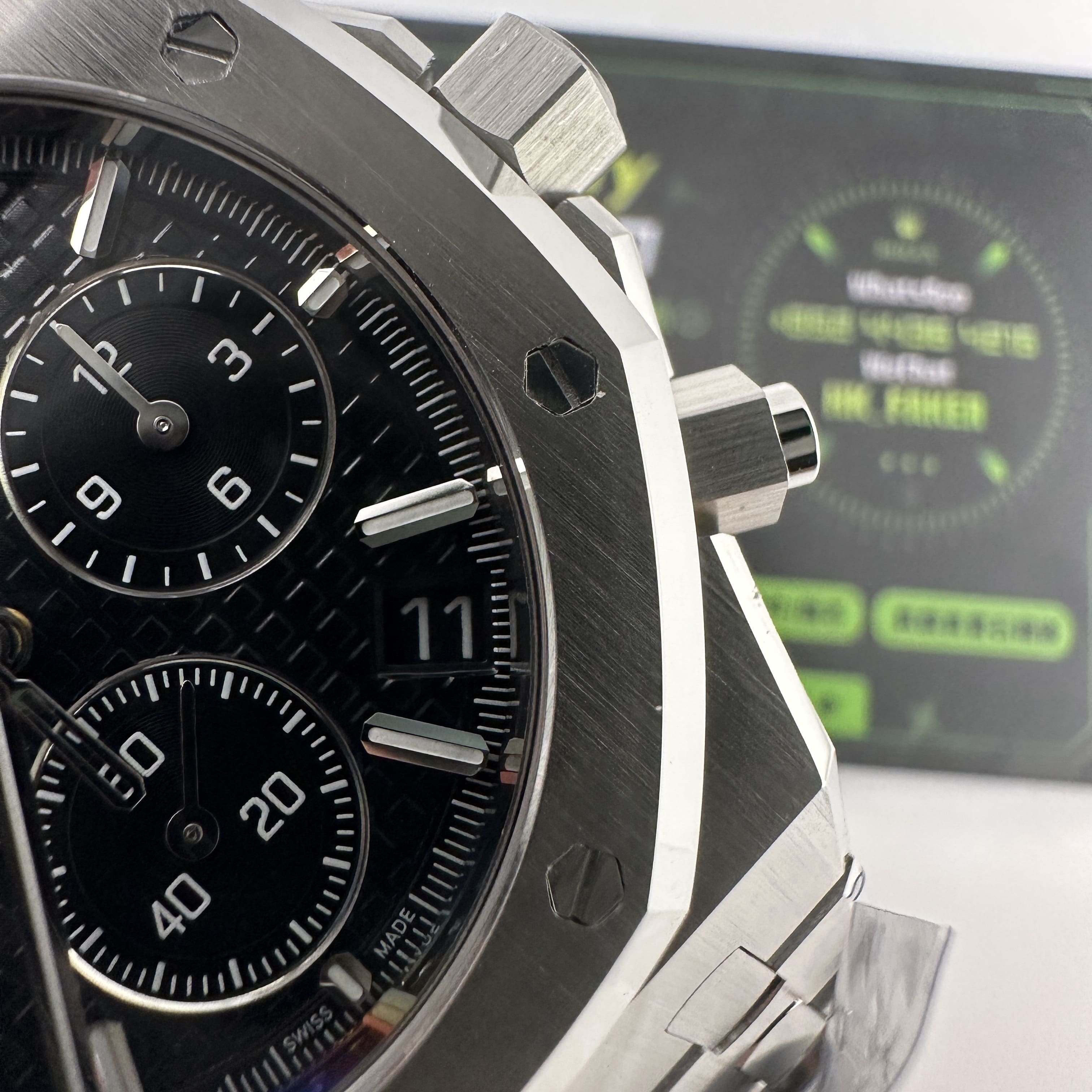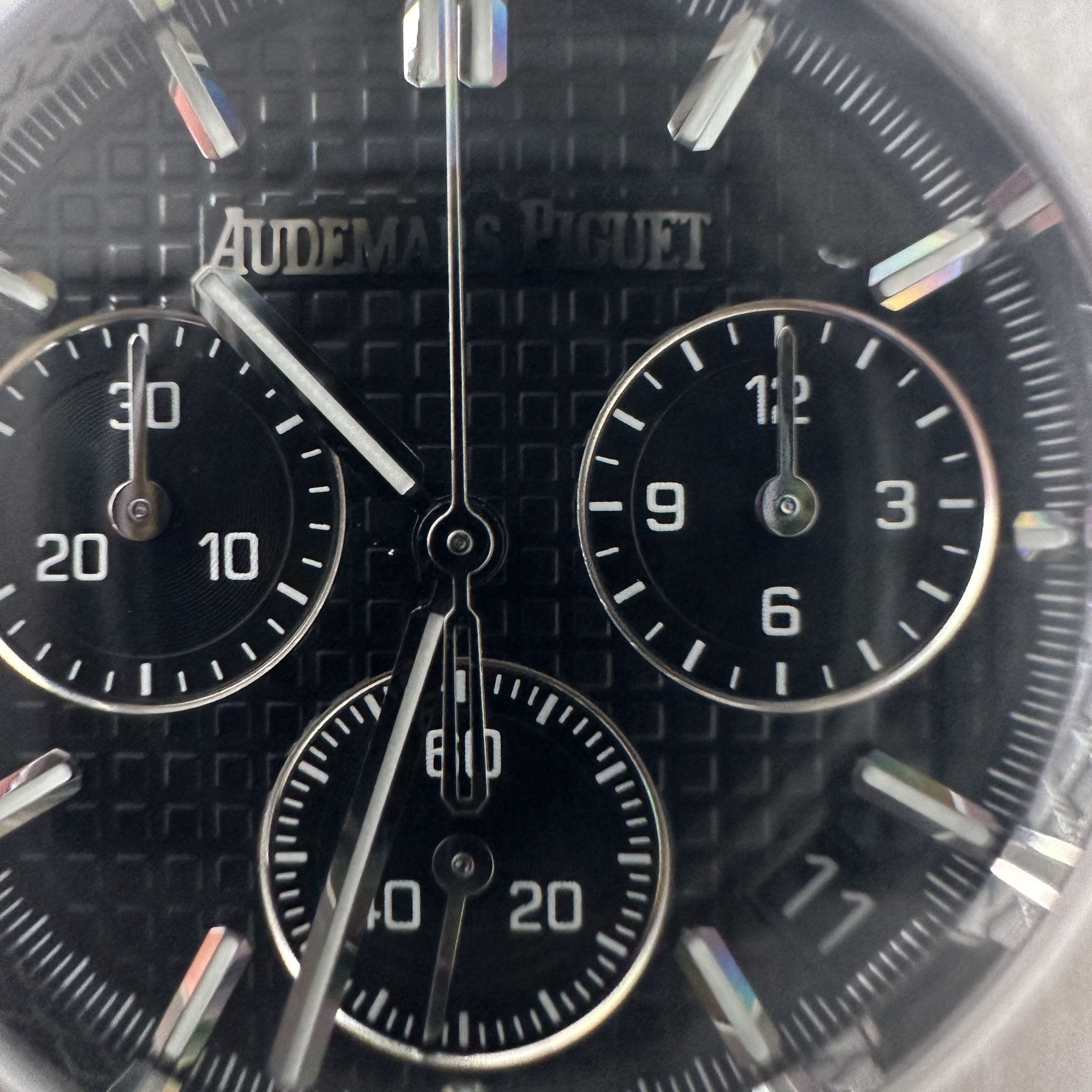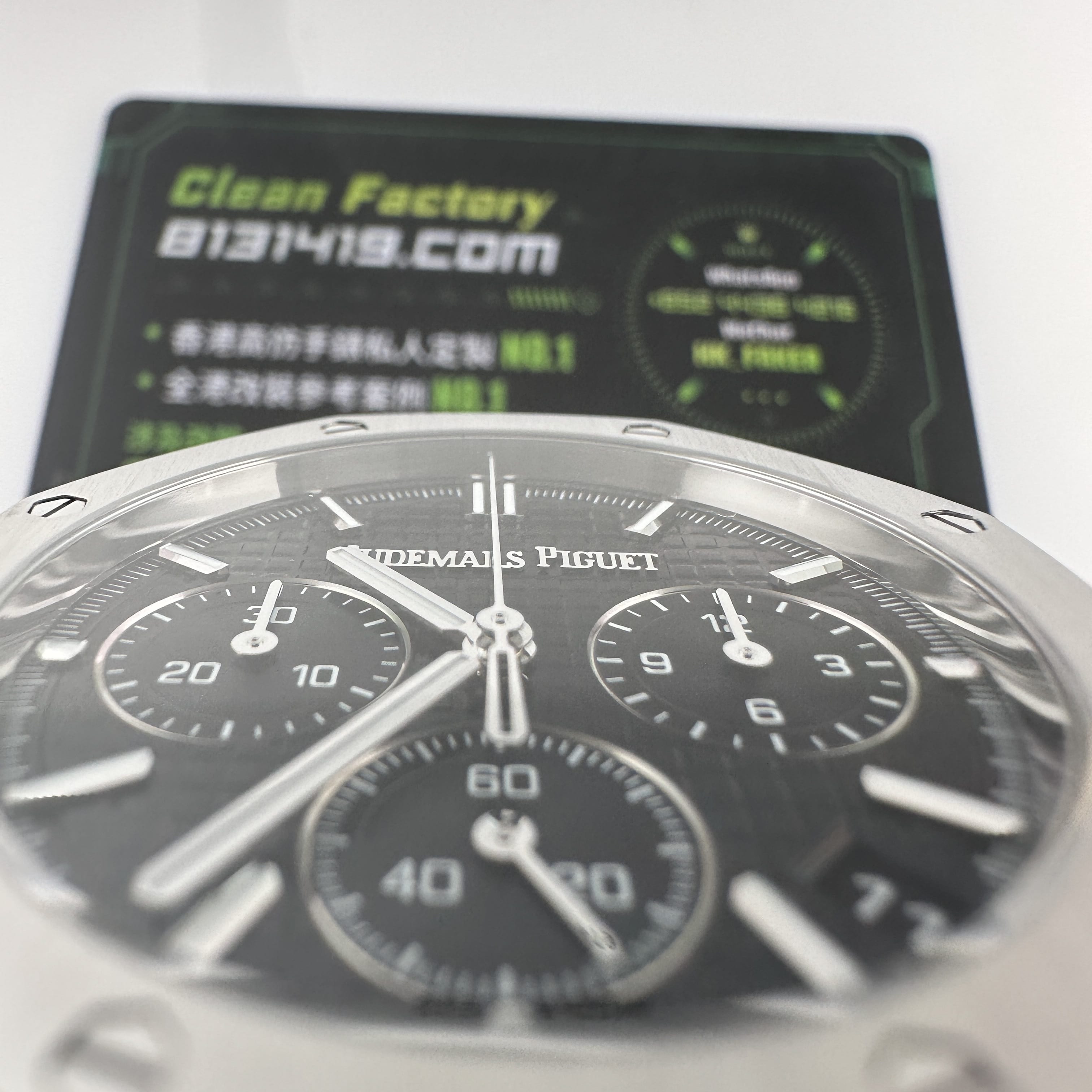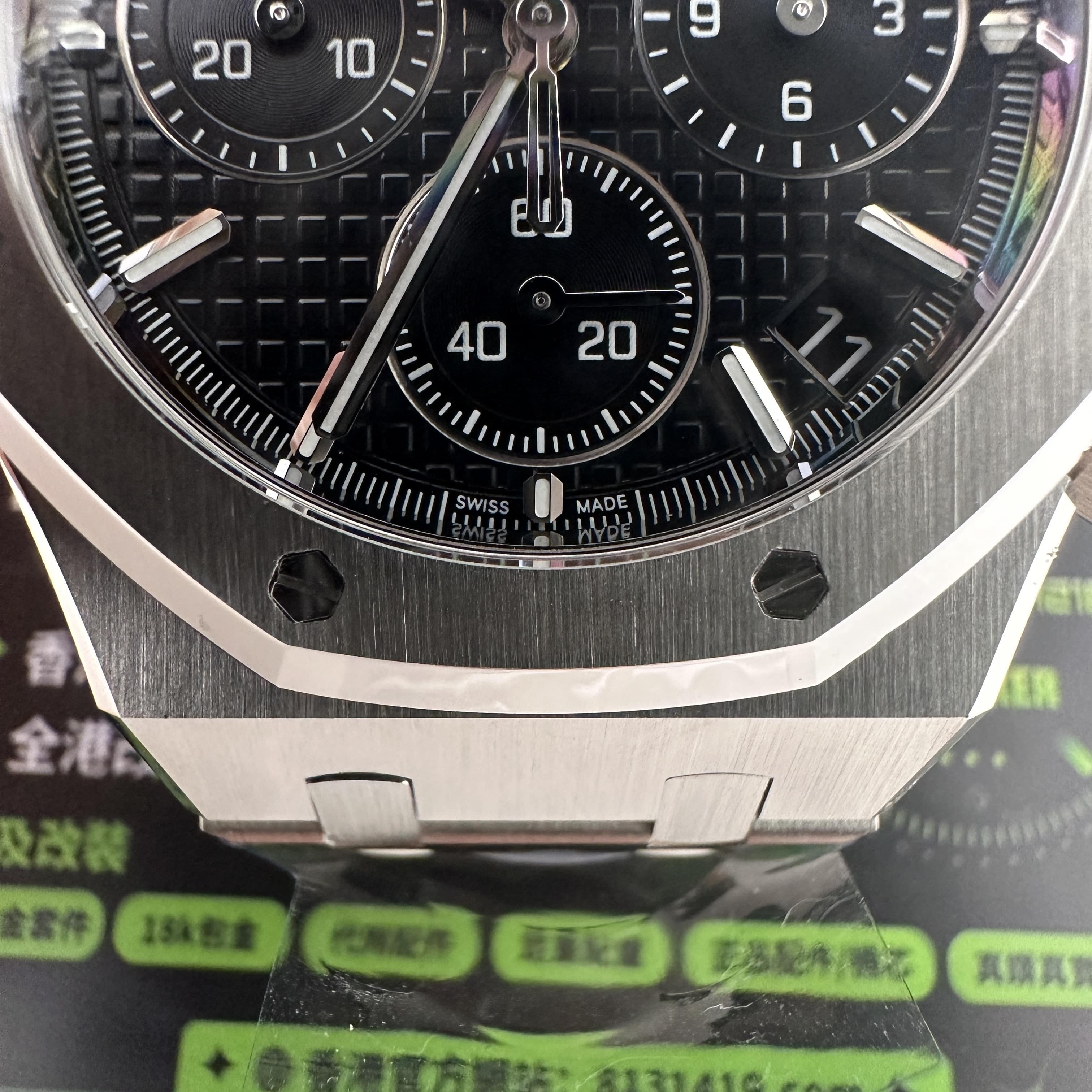 其中TOP廠愛彼黑色盤面對比原版黑色幾乎是無色差的狀態,加上錶盤內部細節處理完善,餅乾紋錶盤大小,間隔距離,以及三個小圈擺位都是根據專櫃版本同步復刻.TOP廠26240純手工打磨的指針,細膩,無毛邊毛刺,實心中軸,無需後期改裝升級.包括日曆組成部分的位置對比正版是同一個位置處置,可隨意比對原版日曆窗口位置.機芯是搭載了丹東4401機芯,穩定性極佳,無卡度裝置.