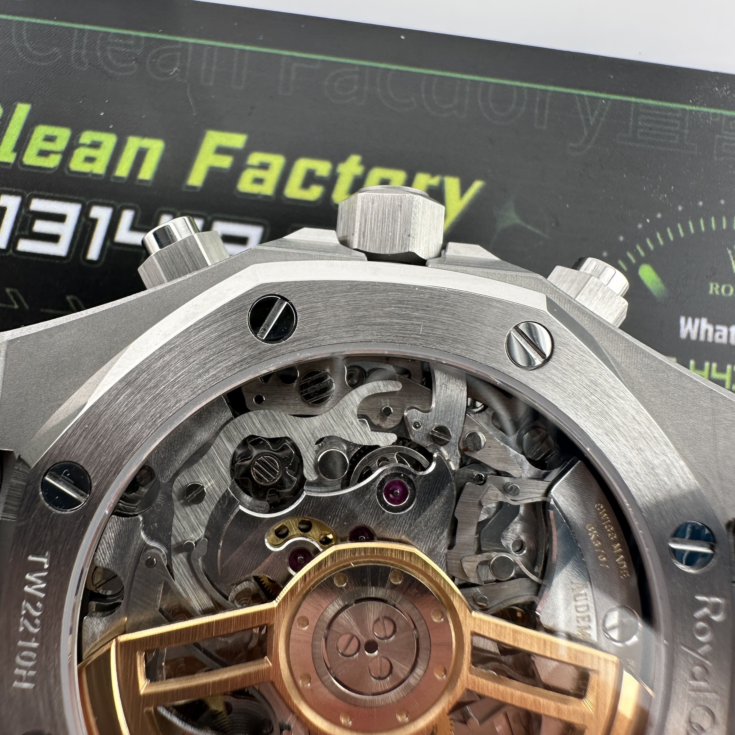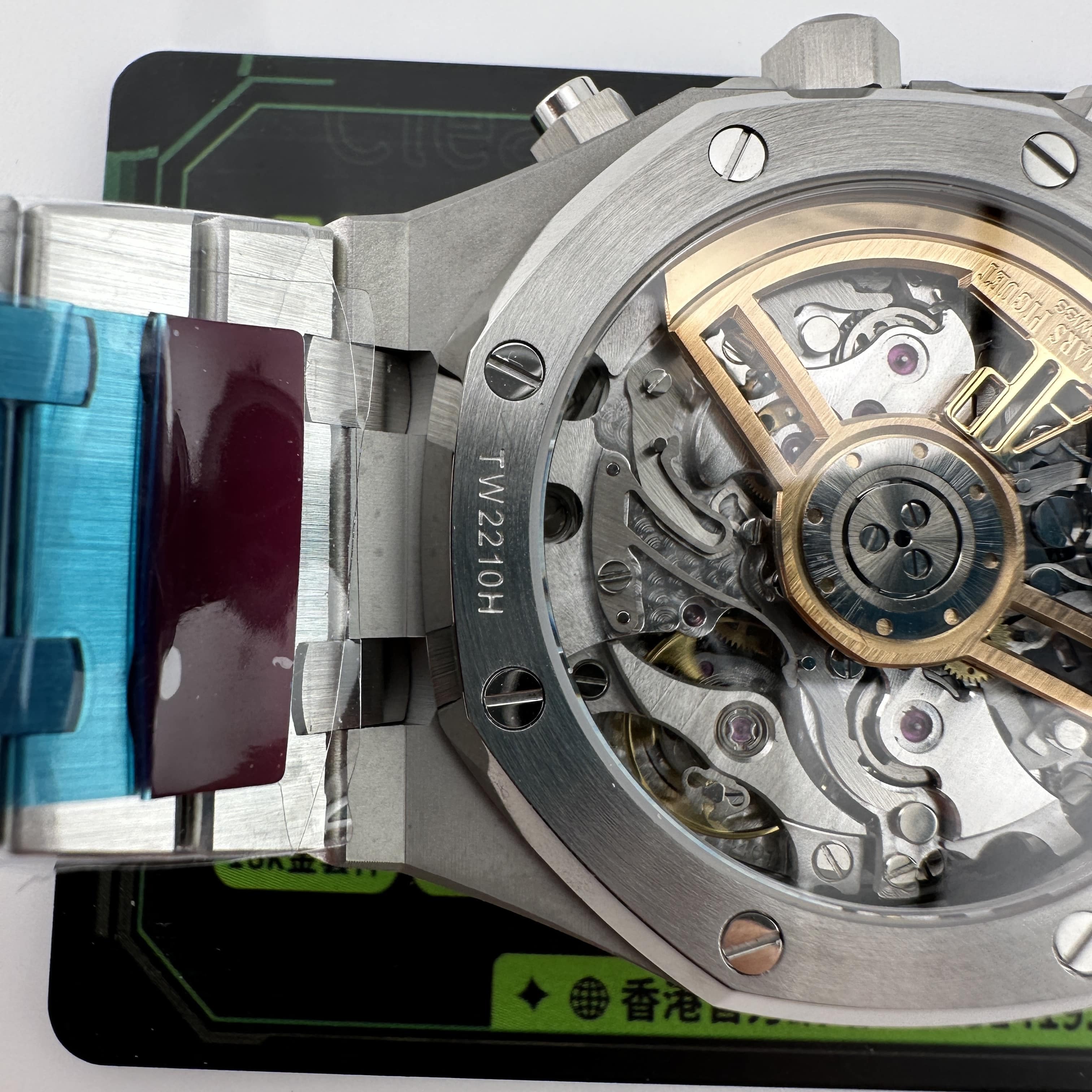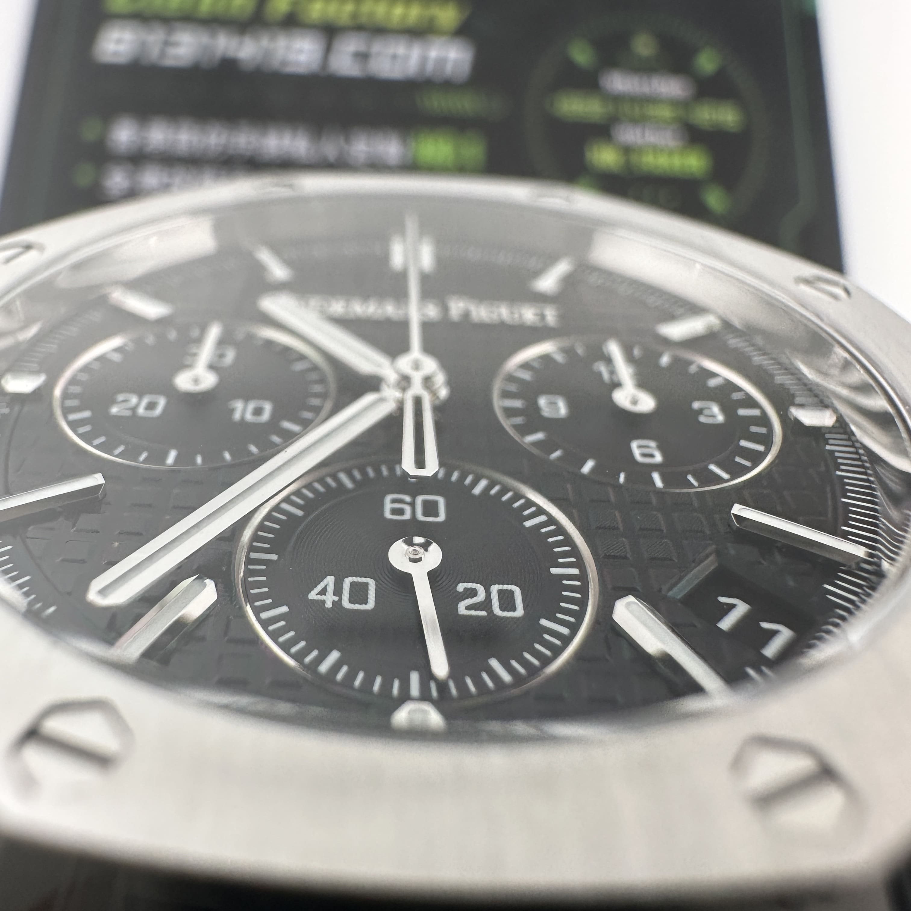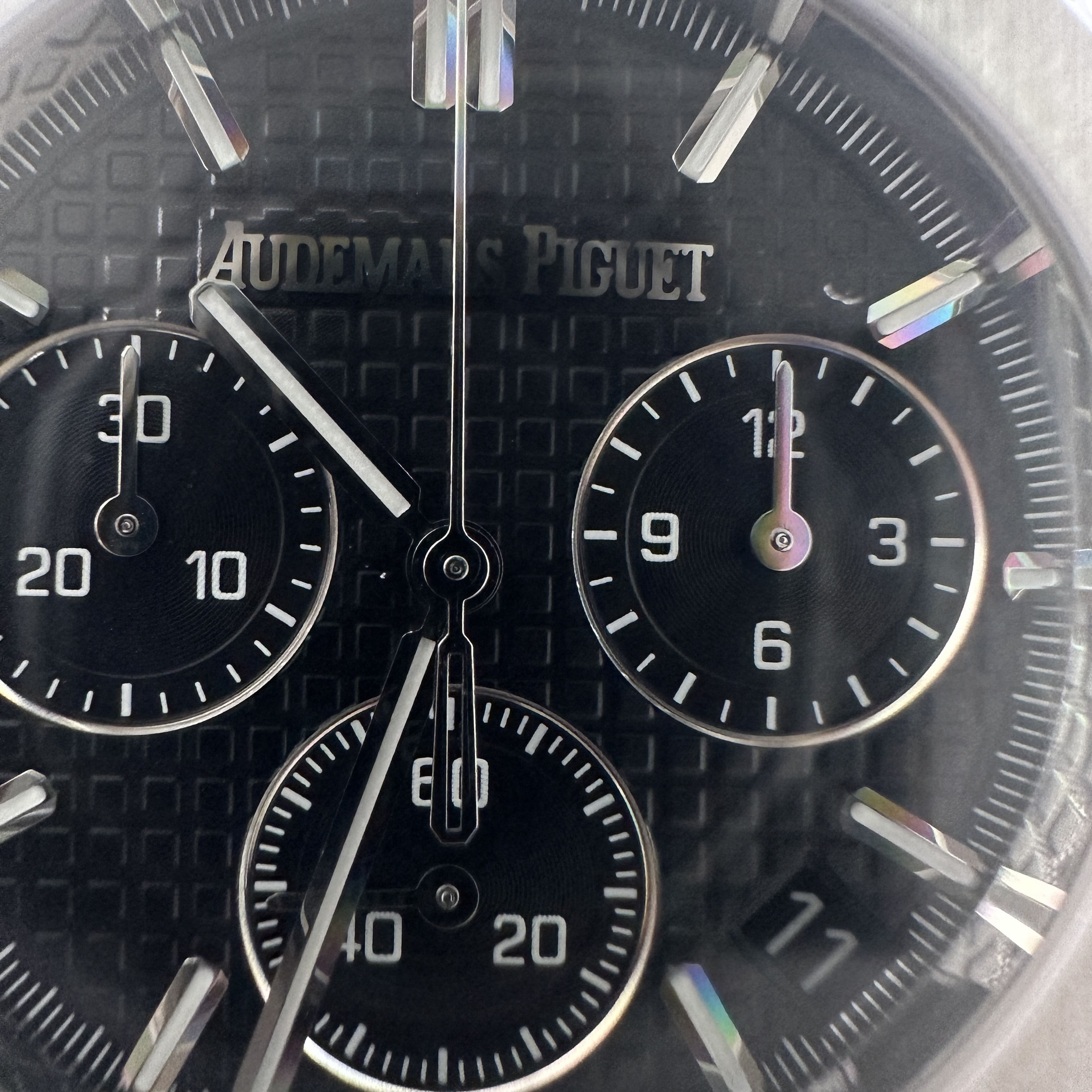 其中TOP廠愛彼黑色盤面對比原版黑色幾乎是無色差的狀態,加上錶盤內部細節處理完善,餅乾紋錶盤大小,間隔距離,以及三個小圈擺位都是根據專櫃版本同步復刻.TOP廠26240純手工打磨的指針,細膩,無毛邊毛刺,實心中軸,無需後期改裝升級.包括日曆組成部分的位置對比正版是同一個位置處置,可隨意比對原版日曆窗口位置.機芯是搭載了丹東4401機芯,穩定性極佳,無卡度裝置.