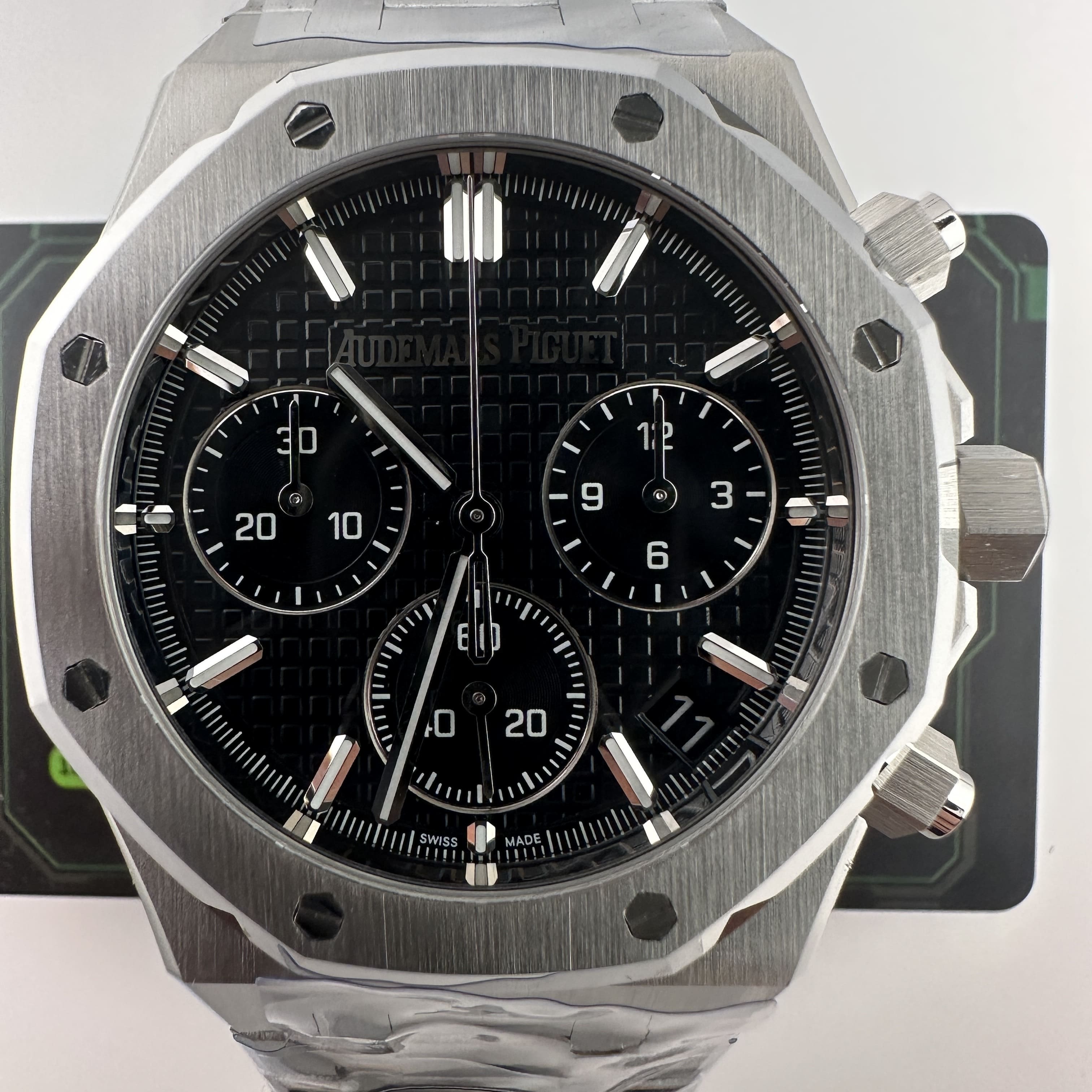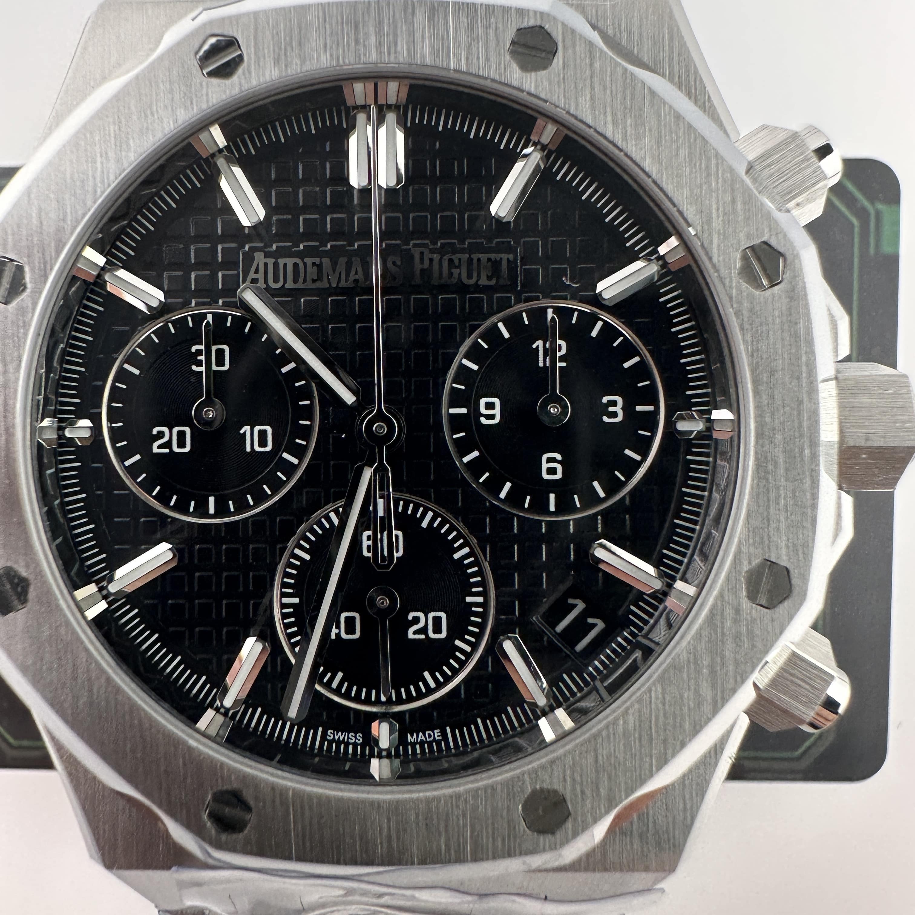 TOP廠官網全新推出高仿AP愛彼皇家橡樹系列26240ST黑色盤,整錶尺寸41mm,材質構造選用316L精鋼材質打造而成,通過原版1:1復刻而成.外觀架構是常規AP腕錶的形狀,經典的八邊形圈口搭配計時按鈕,一款尺寸不大且功能豐富的精鋼錶款全面呈現.TOP廠作為新廠級別,首次推出高仿AP26240就成為了高仿市面上的焦點之作,而工藝層面也是以頂級復刻技術打造.