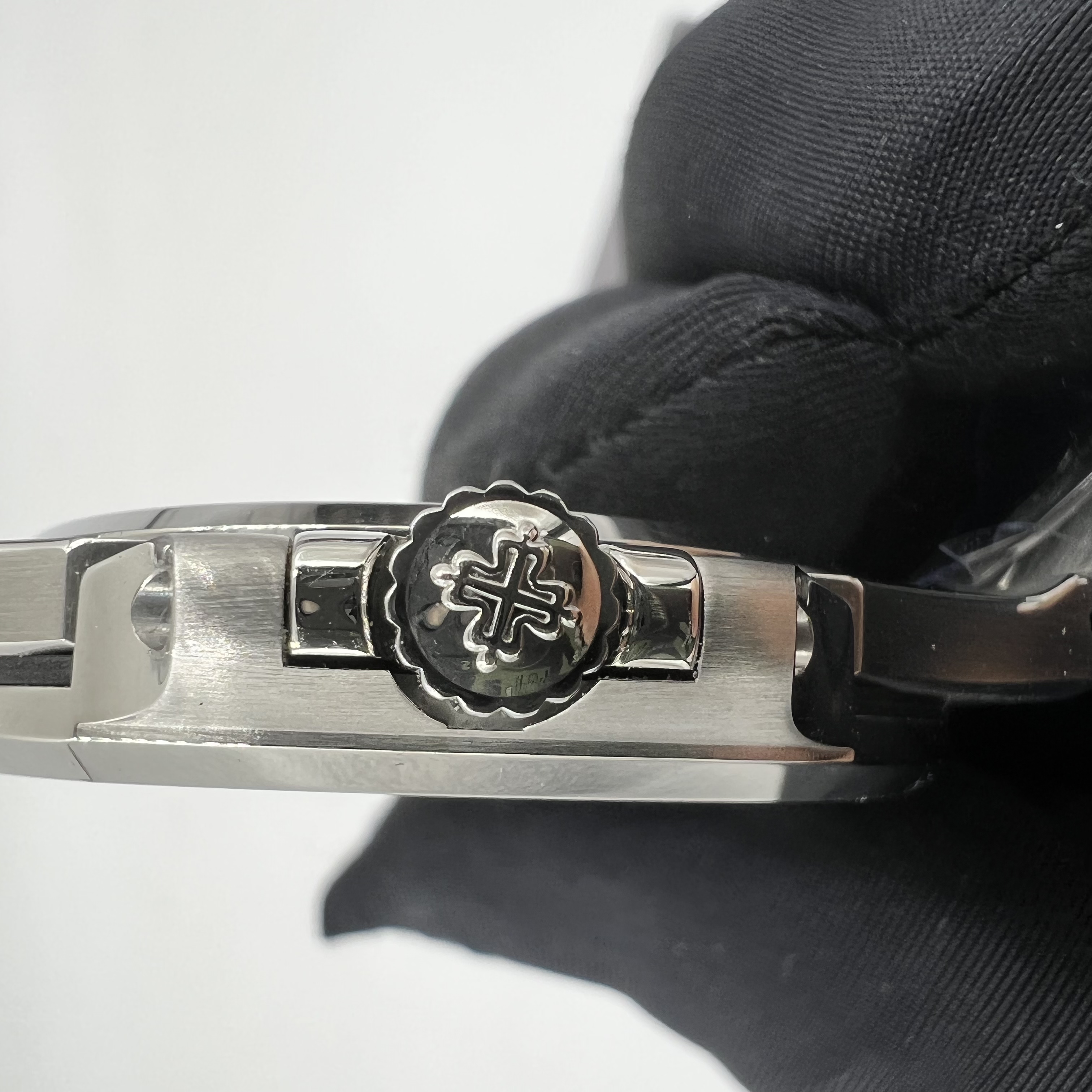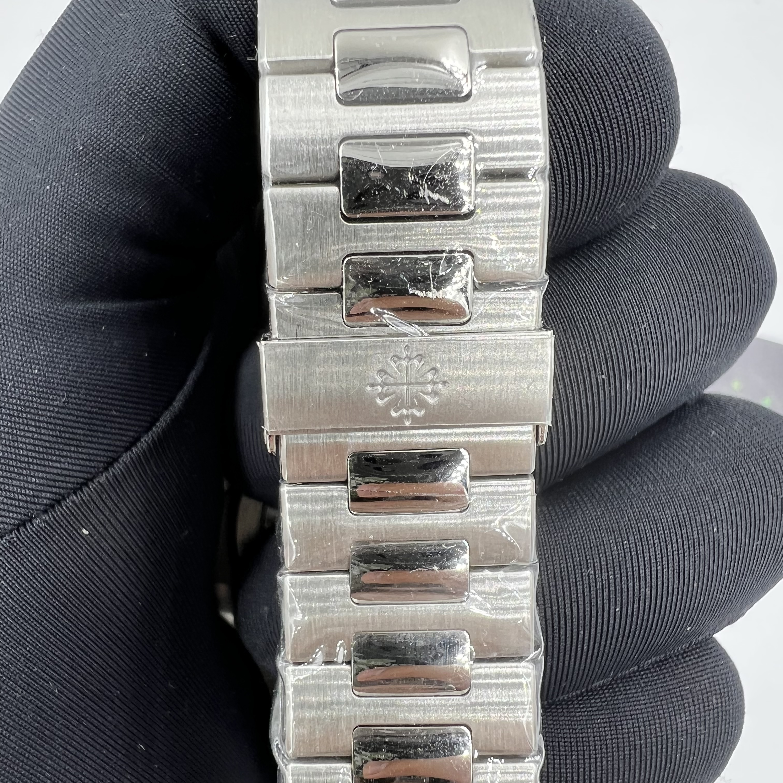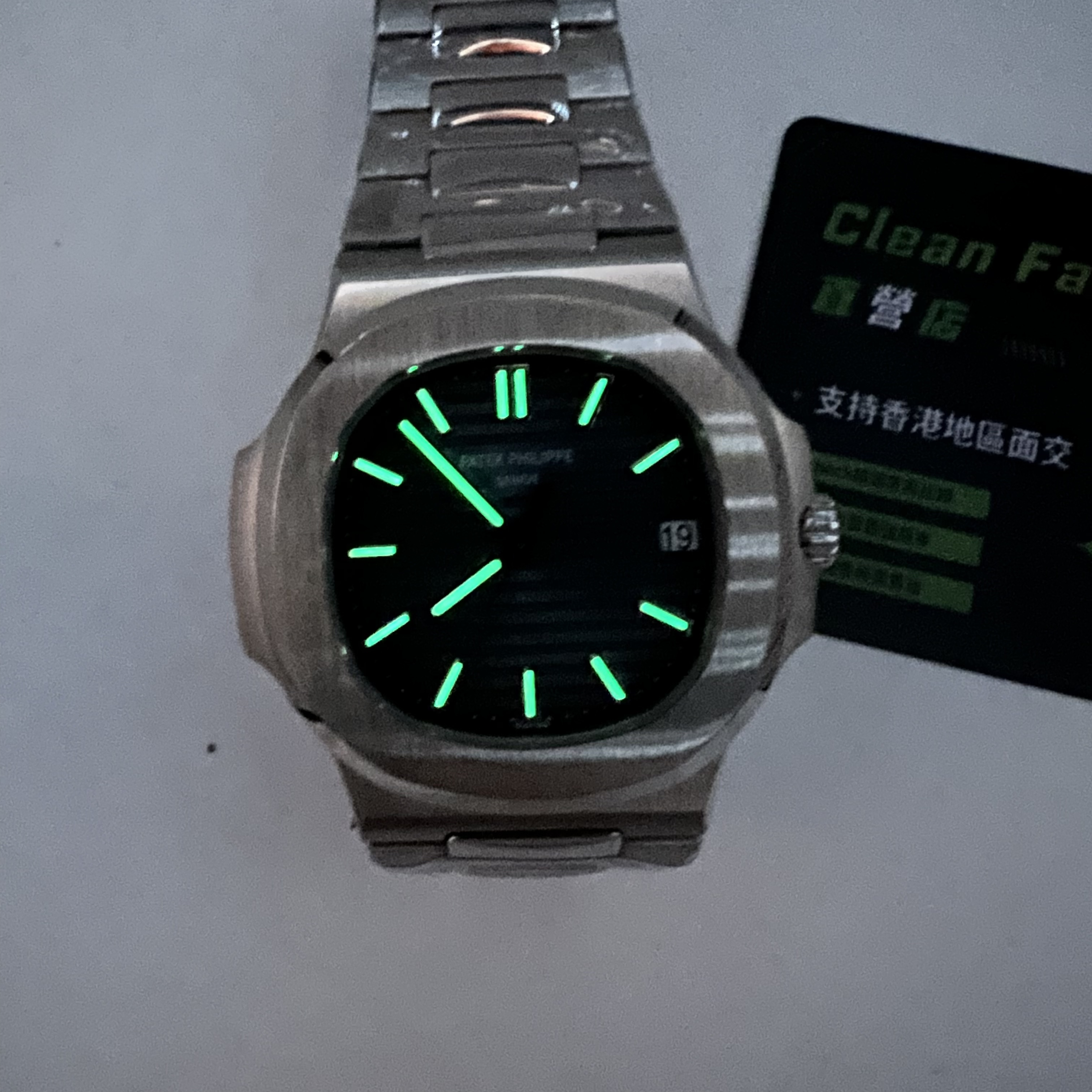 時間顯示的刻度條,3K廠PP做了包邊處理,而且12點鐘位置的雙刻度條丁,是對準的,沒有錯位,也沒有偏移,這一點做得非常好! 指針方面採用實心指針,秒針做得打磨非常細膩, 整錶的刻度條丁和指針都有做夜光填充,填充的非常飽滿! 在3點鐘的日曆顯示,每一個阿拉伯數字都沒有毛刺,字面也足夠清晰.錶帶方面,該拋光的做了拋光,打磨的地方也做了,錶帶的中間扣,是呈現反光效果,質感非常好, 錶扣的內部刻度是深的,只有深的刻度才是對版正品的刻度字面. 當我們一上手佩戴完全不會感覺到這是一隻來自復刻錶的工藝製造.這也是3K5711V2版本的魅力!