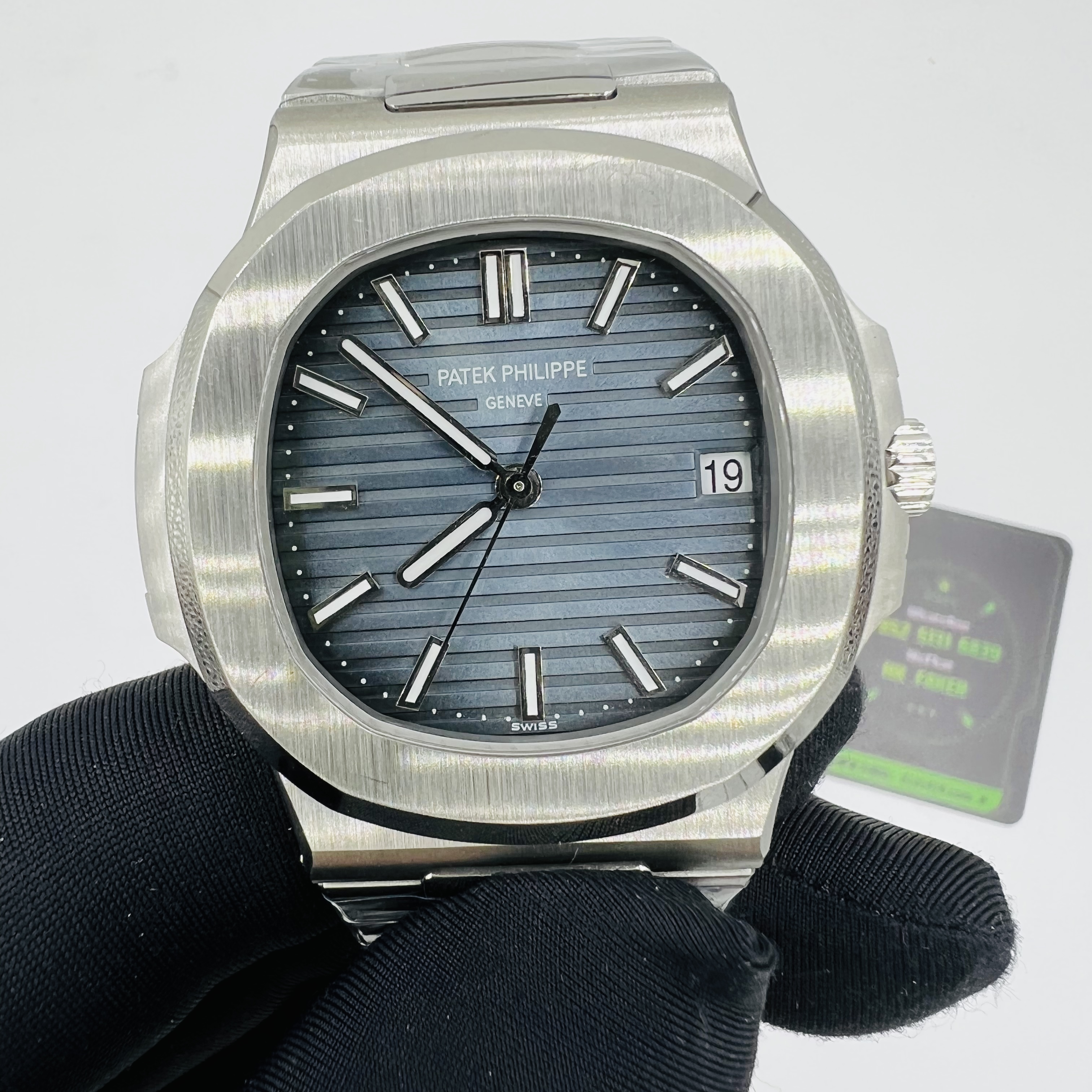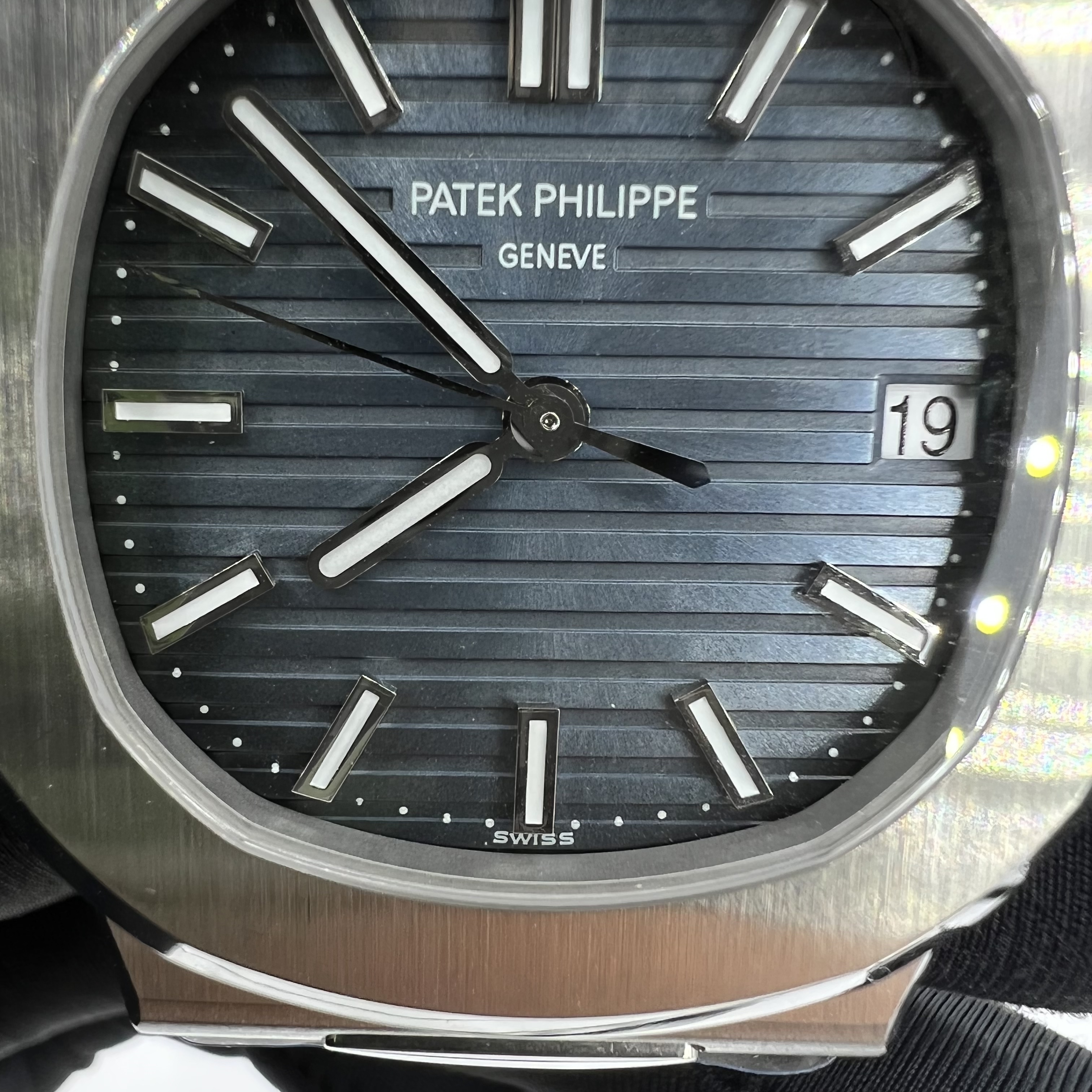 底蓋是背透機芯,升級後的機芯刻度字面,和型號刻度都能更好的展現背透底蓋的自信.如果還是甲板機芯並且使用背透底蓋,完全就不能佩戴出街,基本上真假的情況就很容易顯露出來,所以全新一代的3K廠5711在背透底蓋和機芯方面,一連貫的做了升級,成為高仿手錶市面上銷量最高的PP鸚鵡螺5711.整錶尺寸40MM錶徑,採用904L精鋼材質,打磨後的效果看上去質感完全符合原裝正品,拉絲的跡象也非常的明顯,特別是錶殼與表圈的銜接拉絲,大家可以看到放大拍攝的效果. 因為百達翡麗最講究外觀的打磨,一隻鸚鵡螺5711的打磨細節就很好的體現出頂級和劣質版本的對比. 然後是錶盤部分,由於燈光下拍攝的角度不一樣,看上去有一點淺藍色的色覺,但其實是深藍色的,就是3K廠做的PP5711錶盤呈現漸變色一樣,反射的紋路也是與原裝錶盤一致的效果表現,如果是單一藍色,沒有其他反射紋路的對照下,反而顯得更加一眼假! 錶盤內部的刻度字面,也就是百達翡麗的英文LOGO, 3K廠5711它是做的連貫性的,並非間隔的距離有差別,如果中間的刻度字面沒有連貫性,看錶盤就很容易看的出真假5711了.