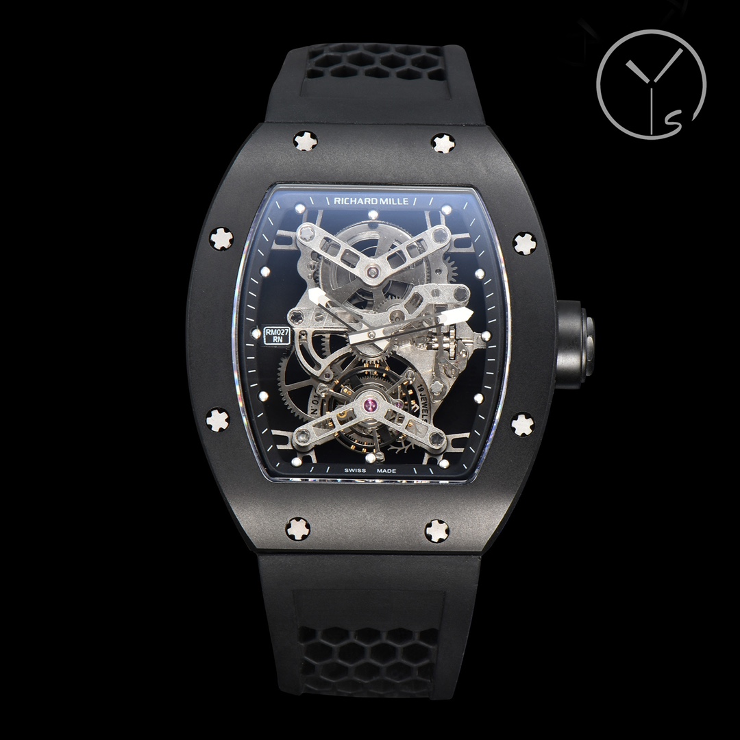 YS永時超神複刻RM027,一款根據單一錶款理查德米勒RM 027訂制研發的陀飛輪機芯,高度還原RICHARD MILLE Rm027的設計質感,寬43mm長50mm,5級鈦金屬材質錶殼,鍍無氫石墨膜,重量減輕30%,硬度增强40%,梻橡膠材質錶帶,吸取蜂窩靈感設計帶身讓佩戴更舒適透氣, YS現時市面上最高版本還原度高達95%以上的RM027,從飛輪邊微小食字就能看得出YS factory做事態度! 你相信光嗎